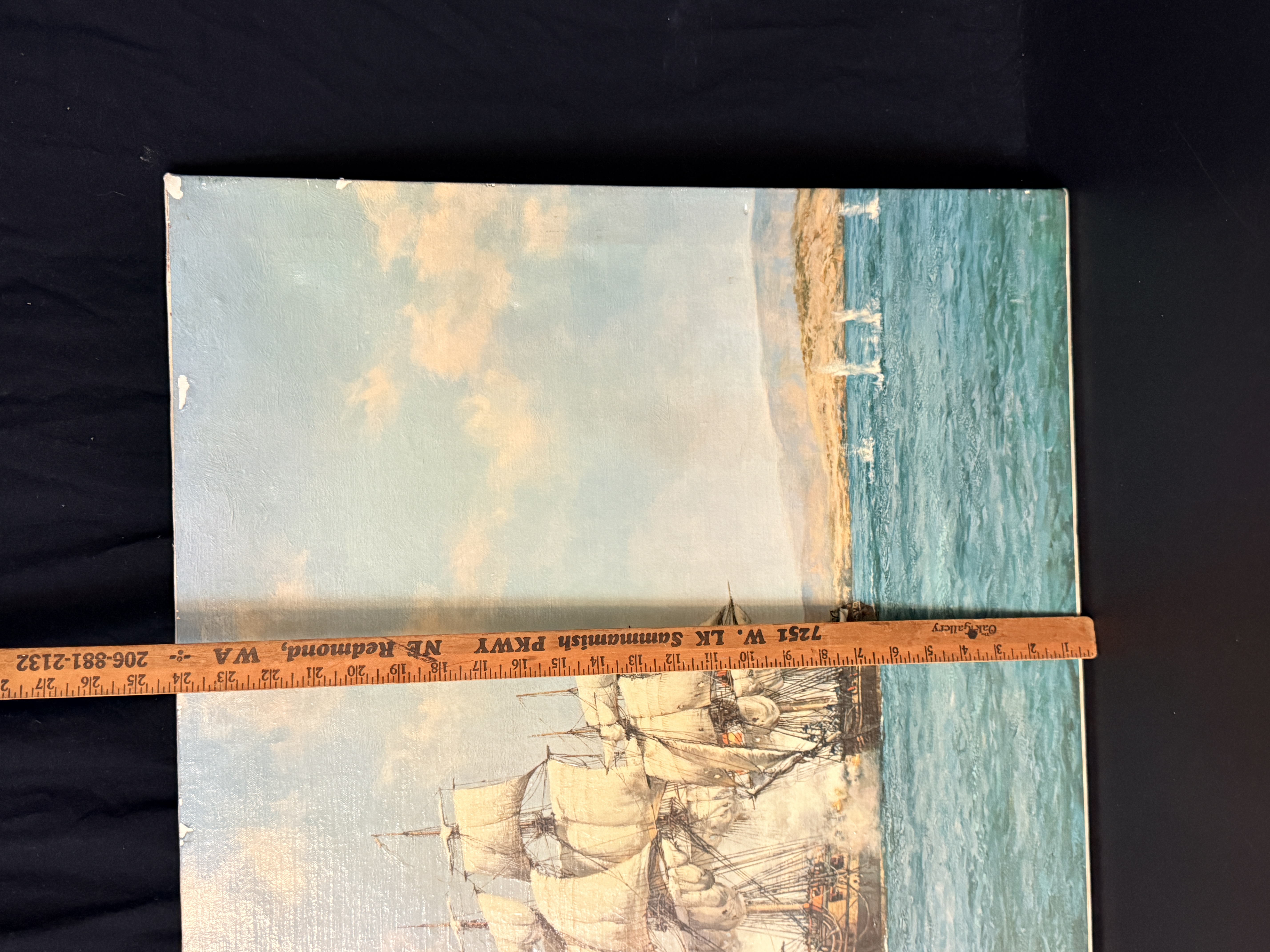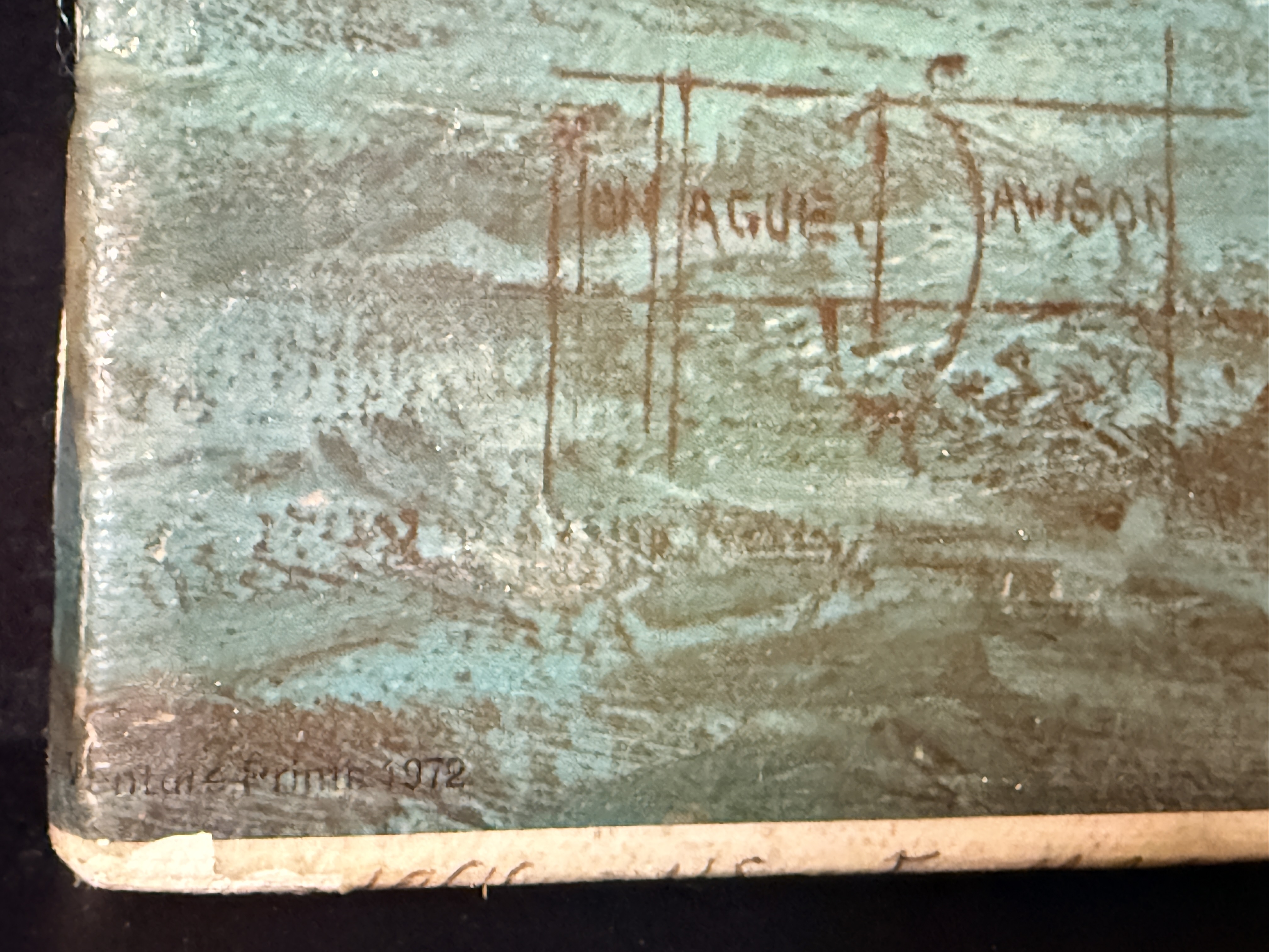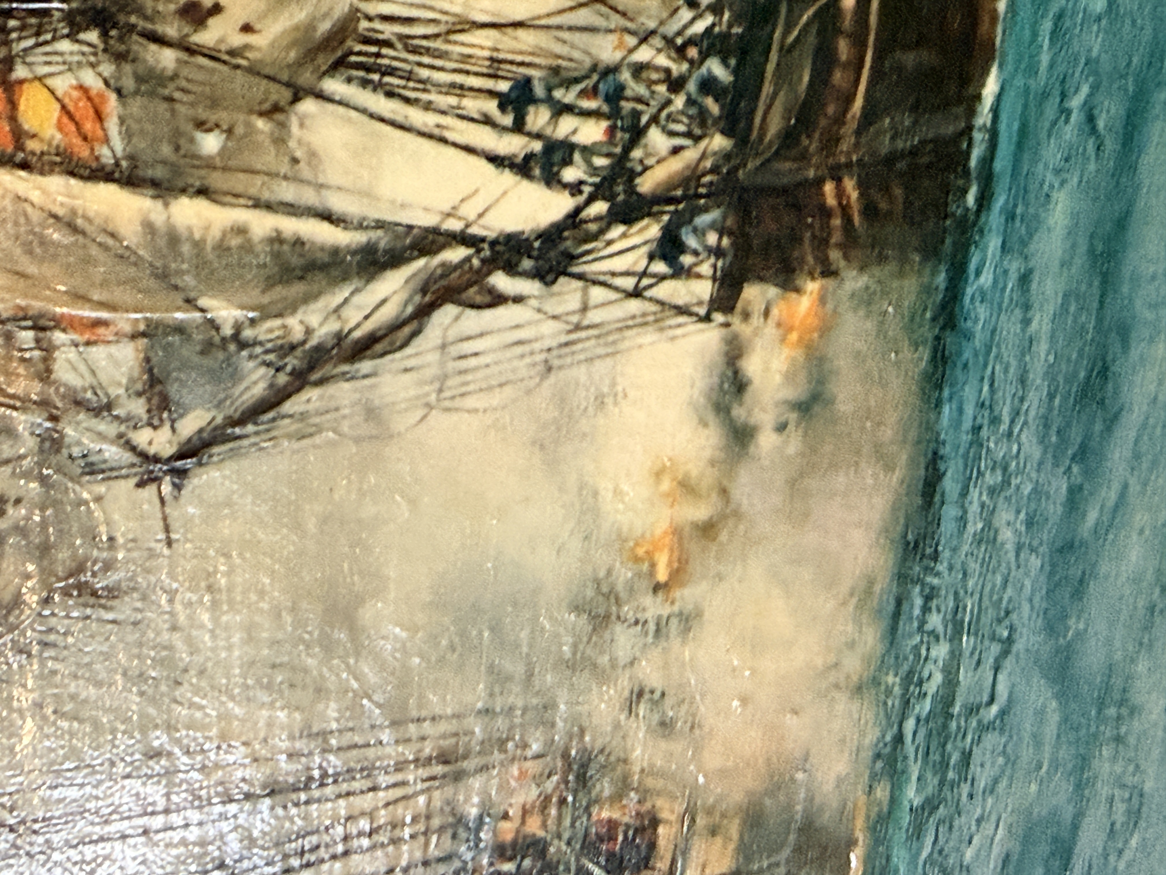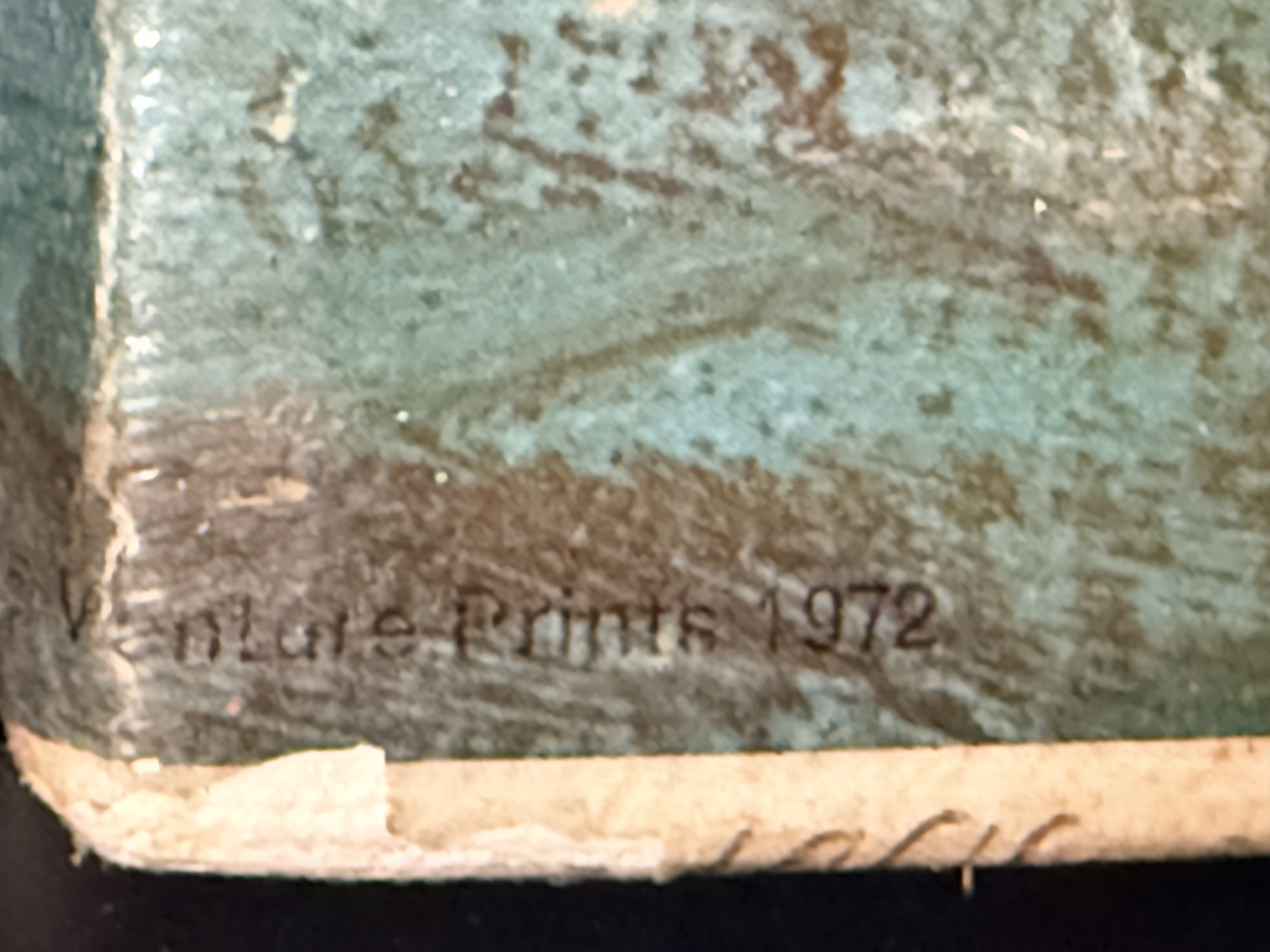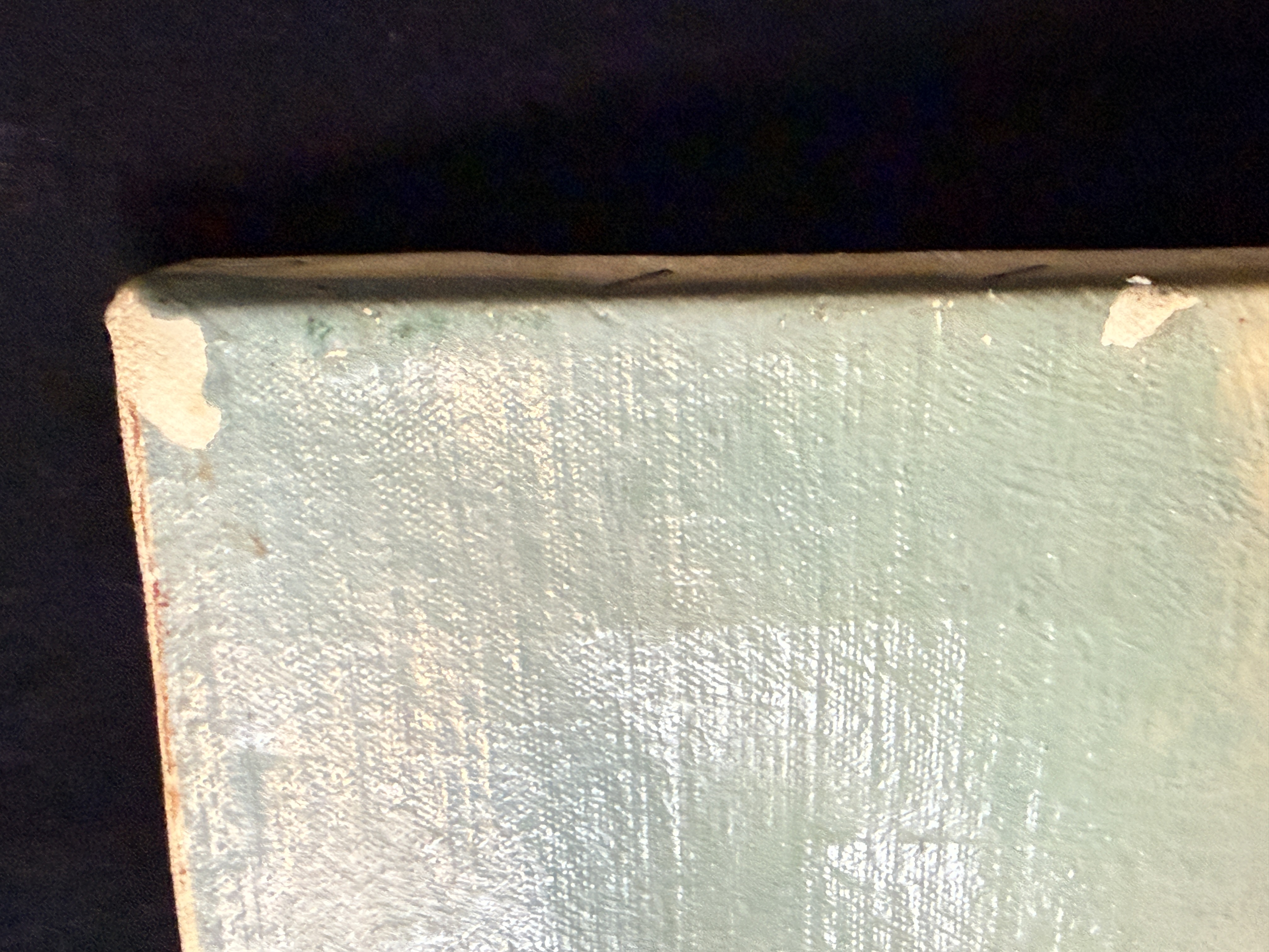 The item exhibits notable signs of age and wear. There are several areas of surface loss and chipping along the top and left edges. Minor scuffing is present on the image surface. Art is from a clean smoke free home.