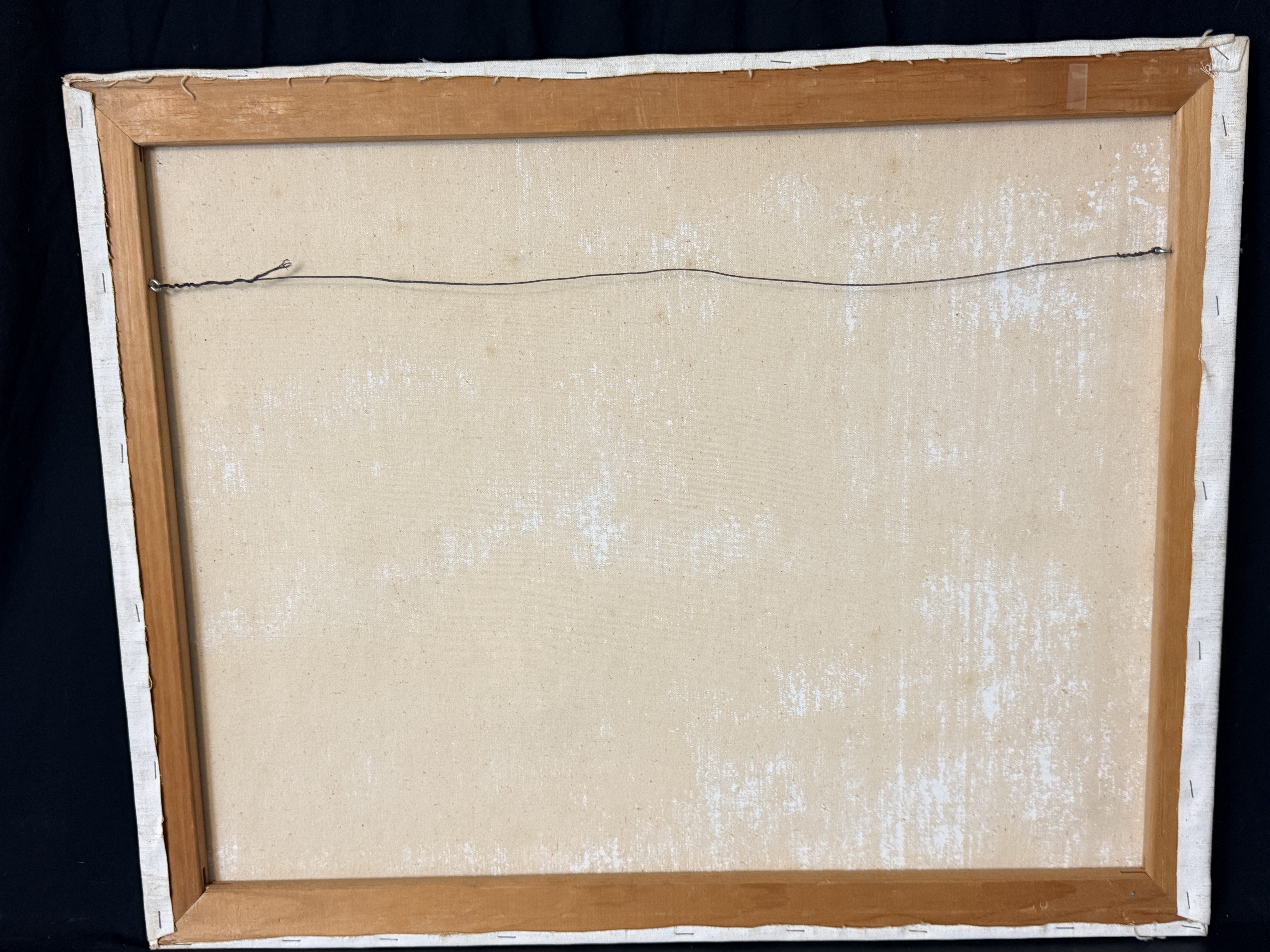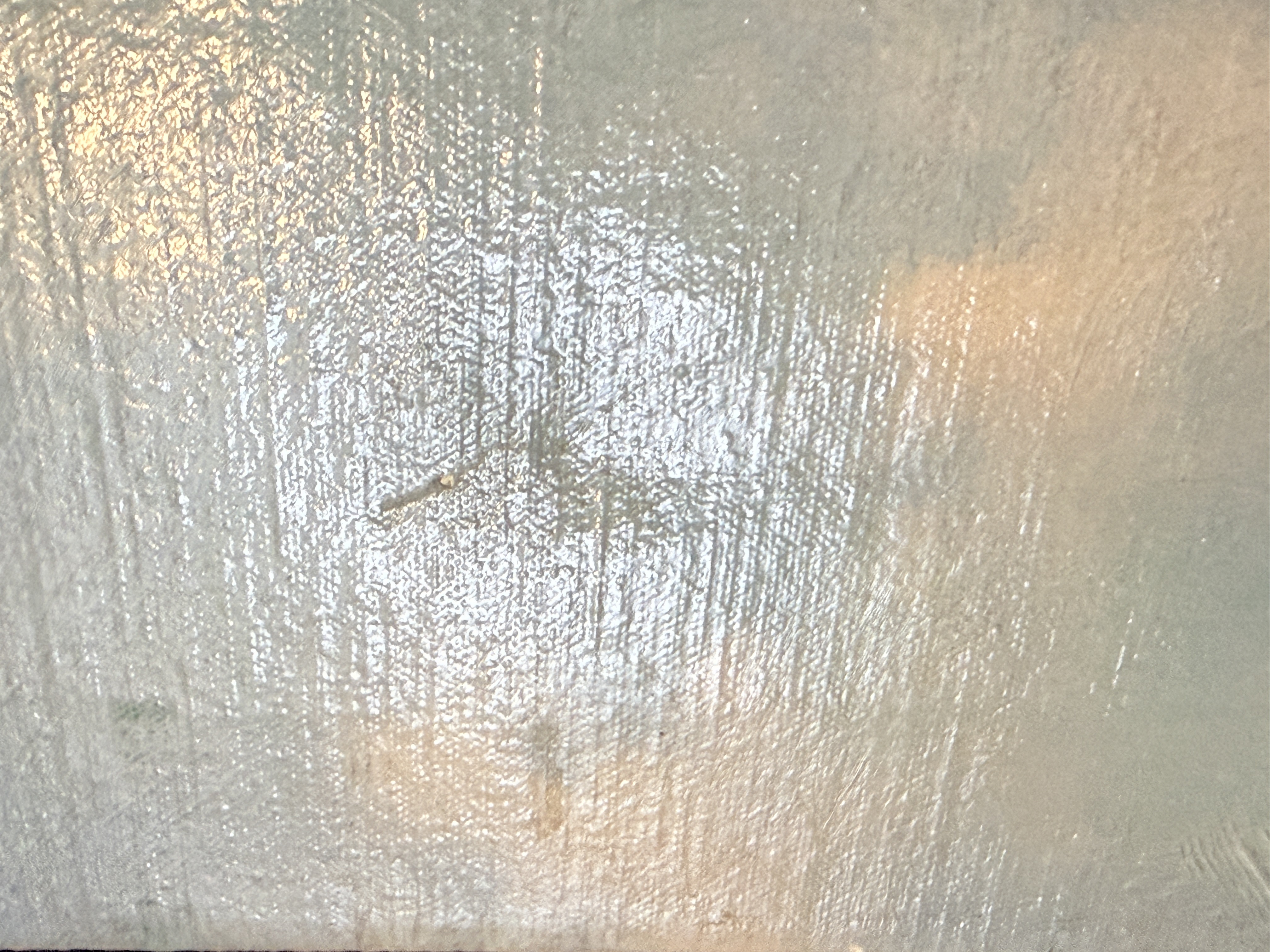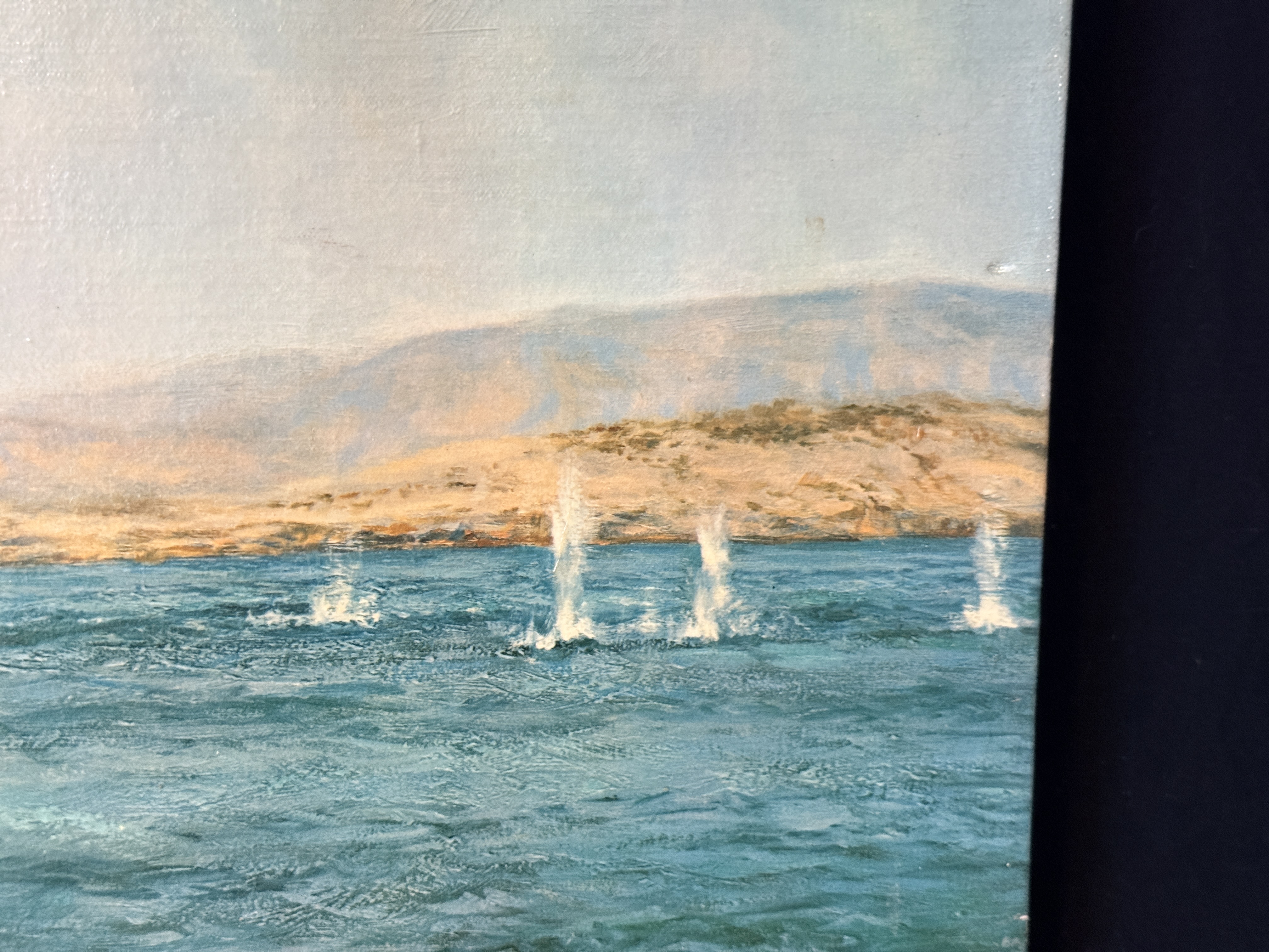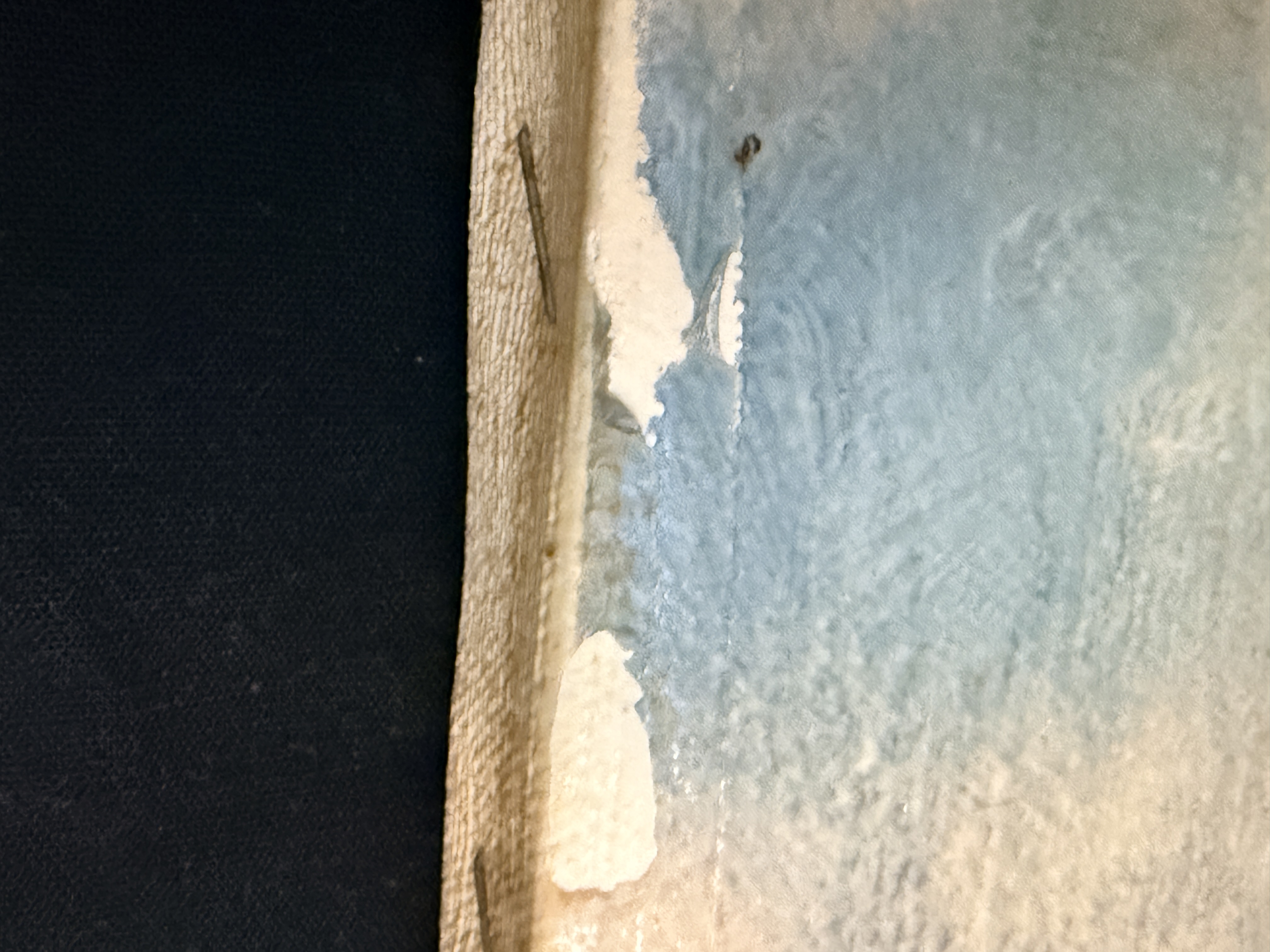 The item exhibits notable signs of age and wear. There are several areas of surface loss and chipping along the top and left edges. Minor scuffing is present on the image surface. Art is from a clean smoke free home.