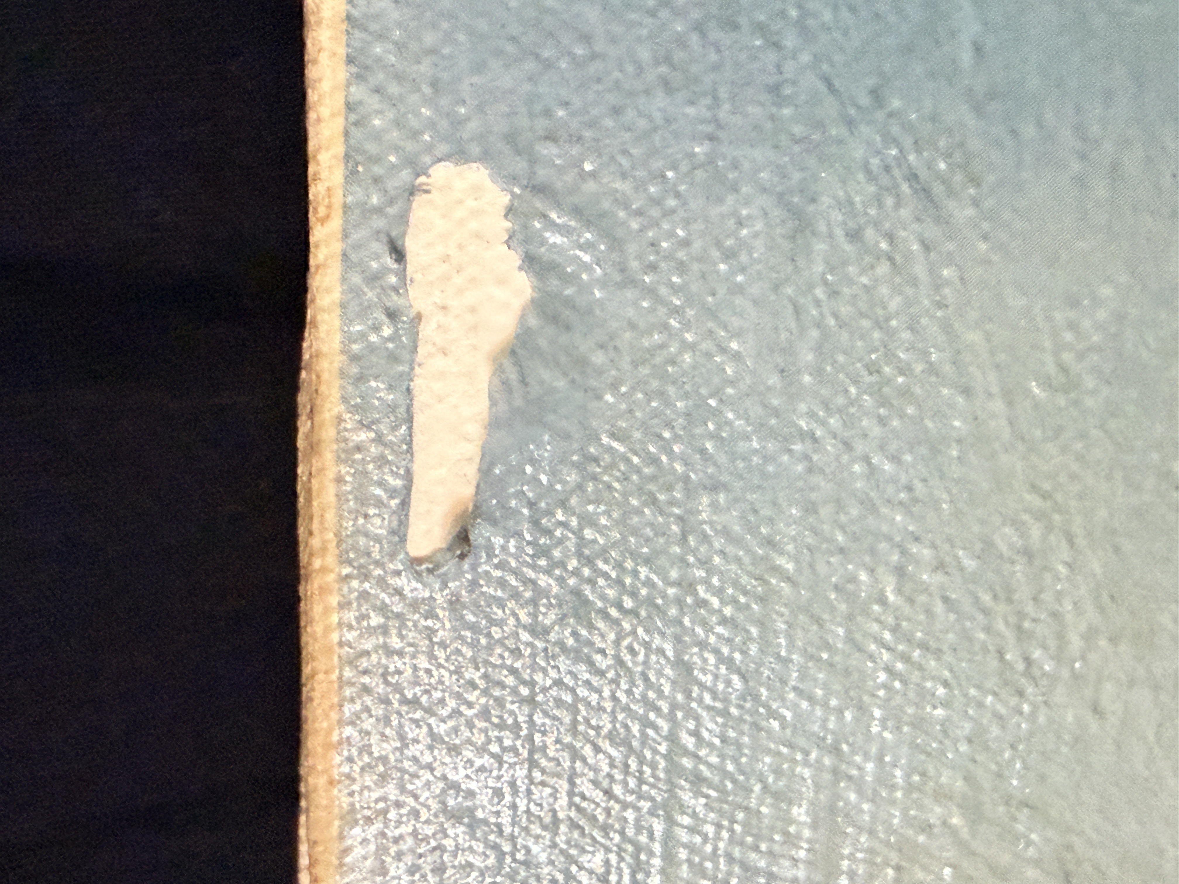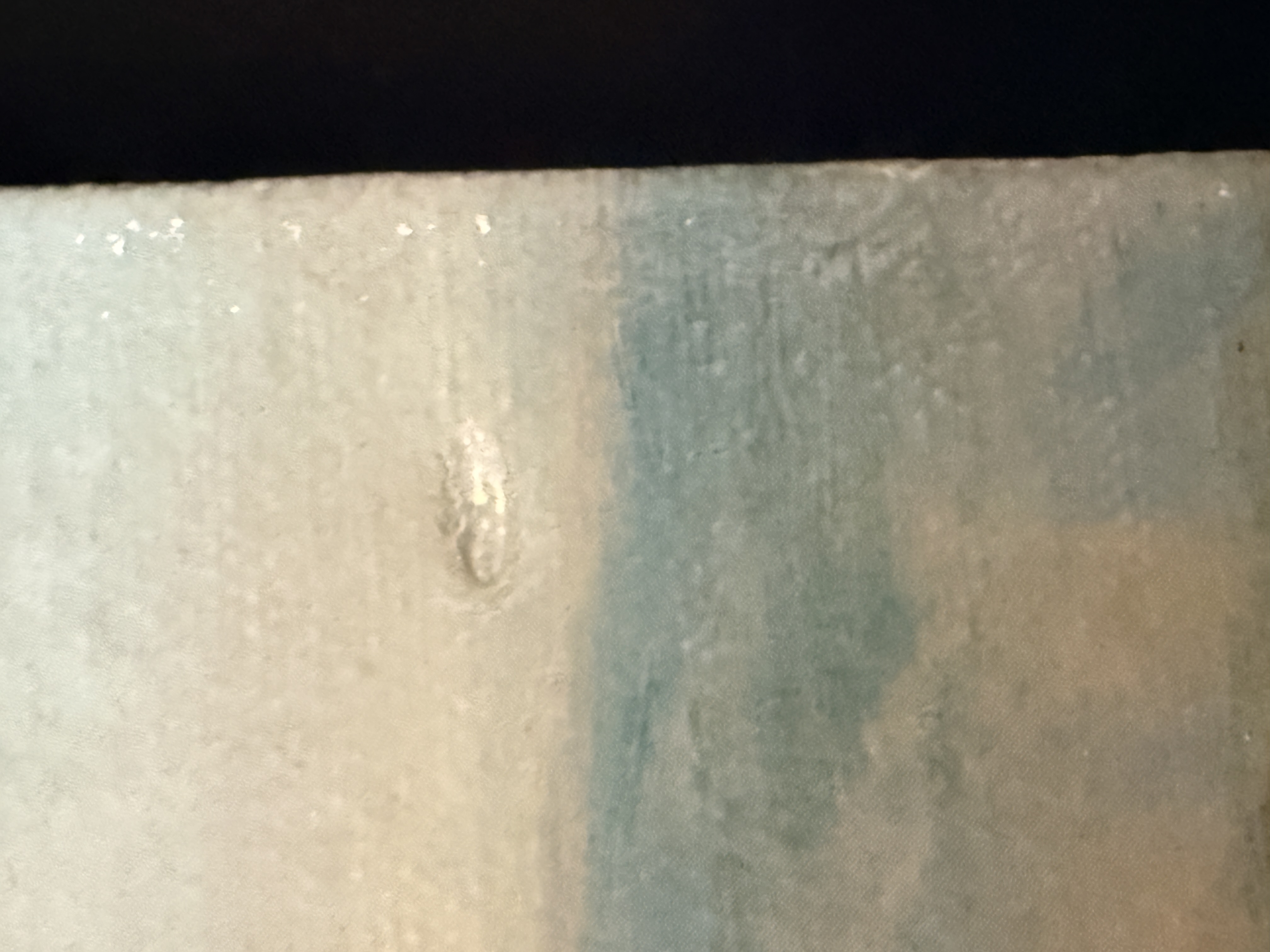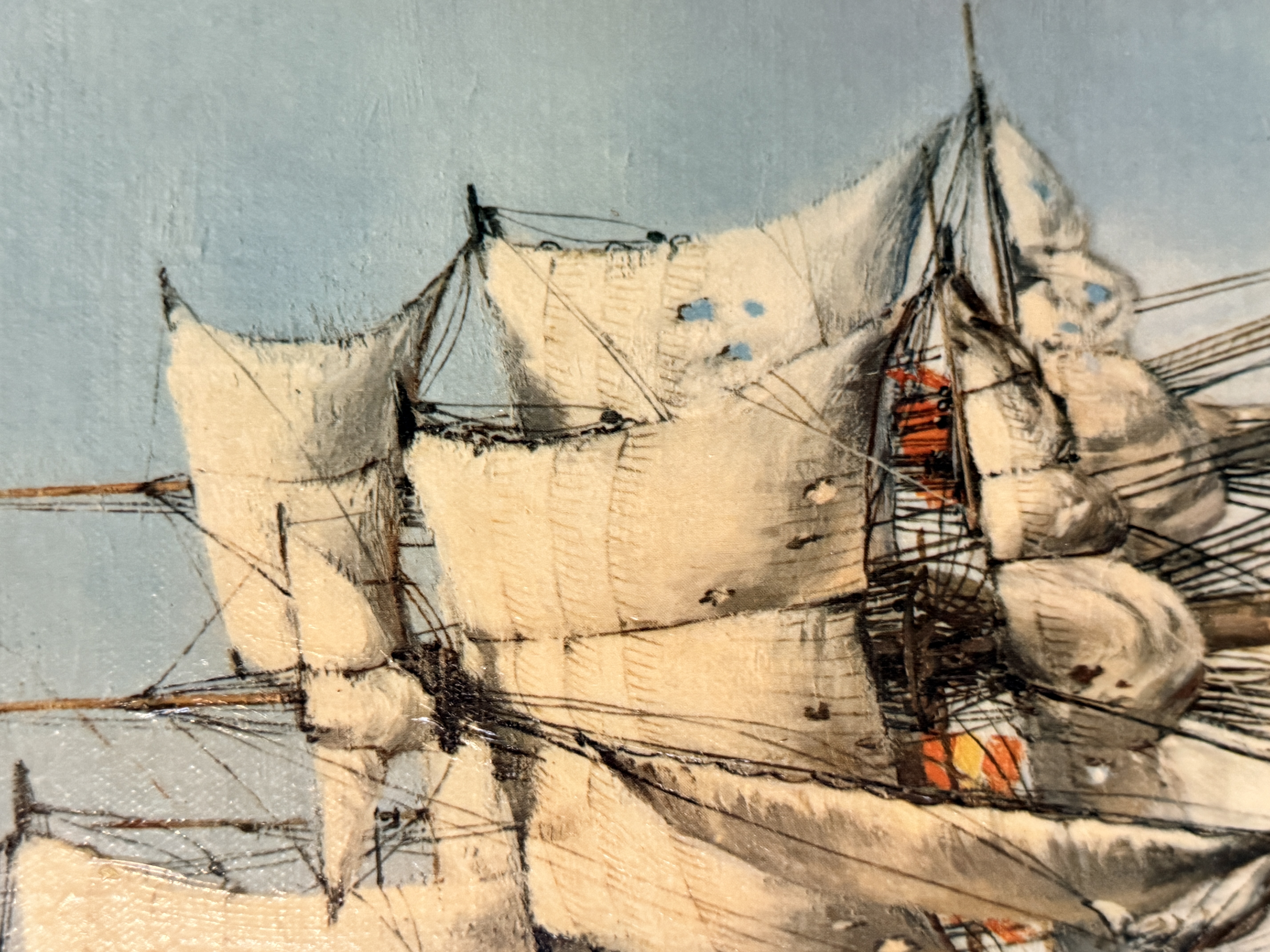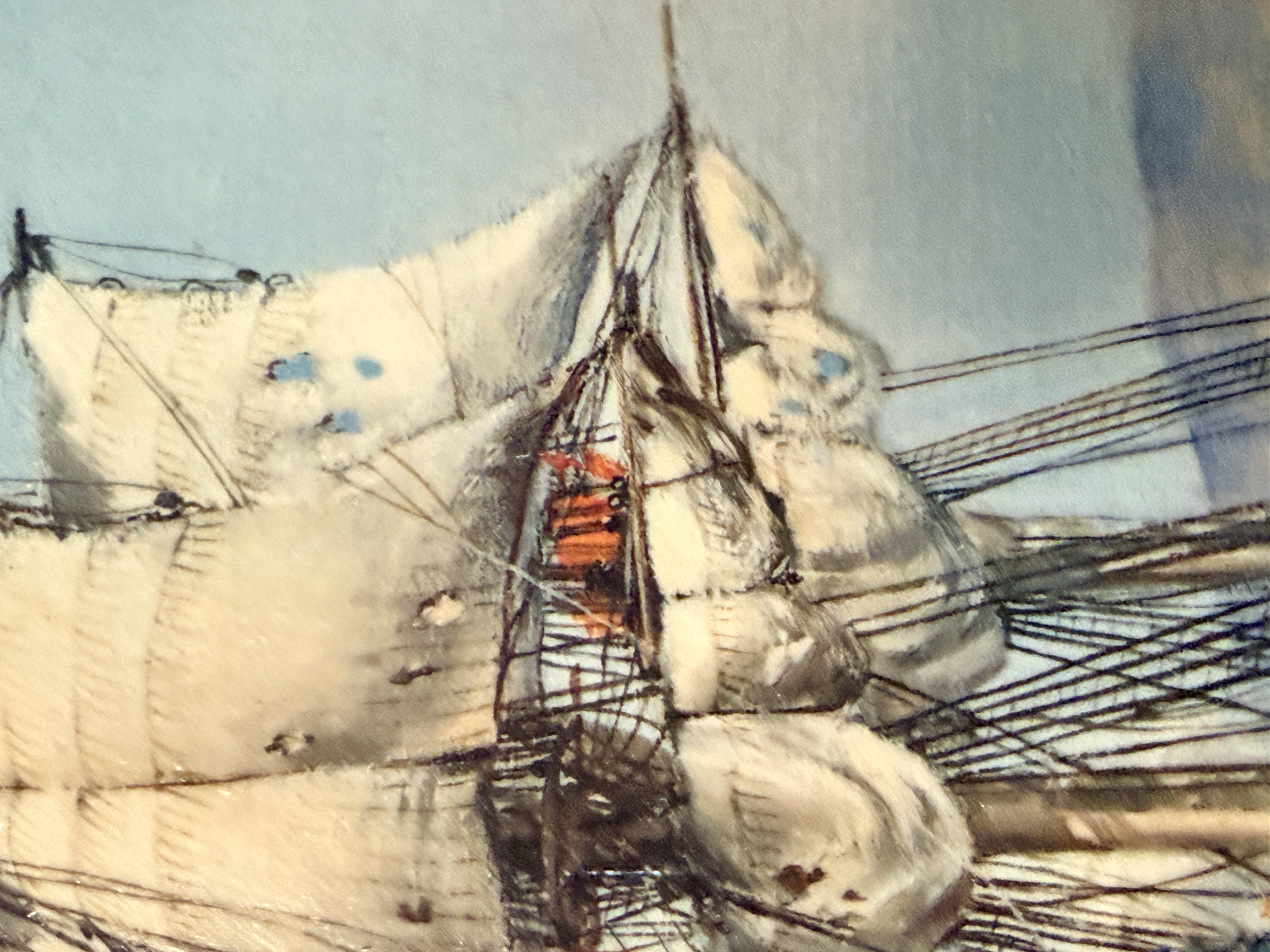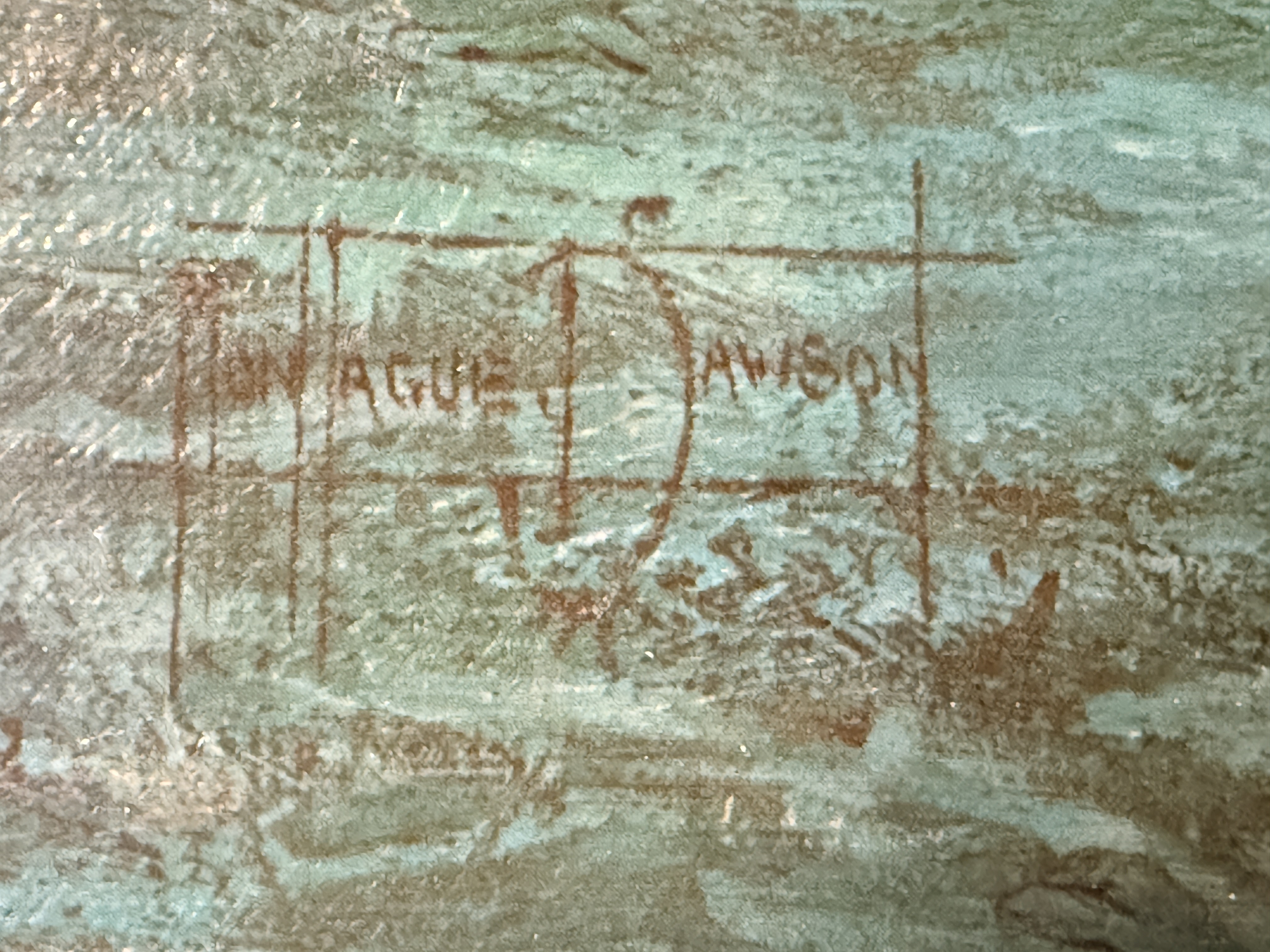 The item exhibits notable signs of age and wear. There are several areas of surface loss and chipping along the top and left edges. Minor scuffing is present on the image surface. Art is from a clean smoke free home.