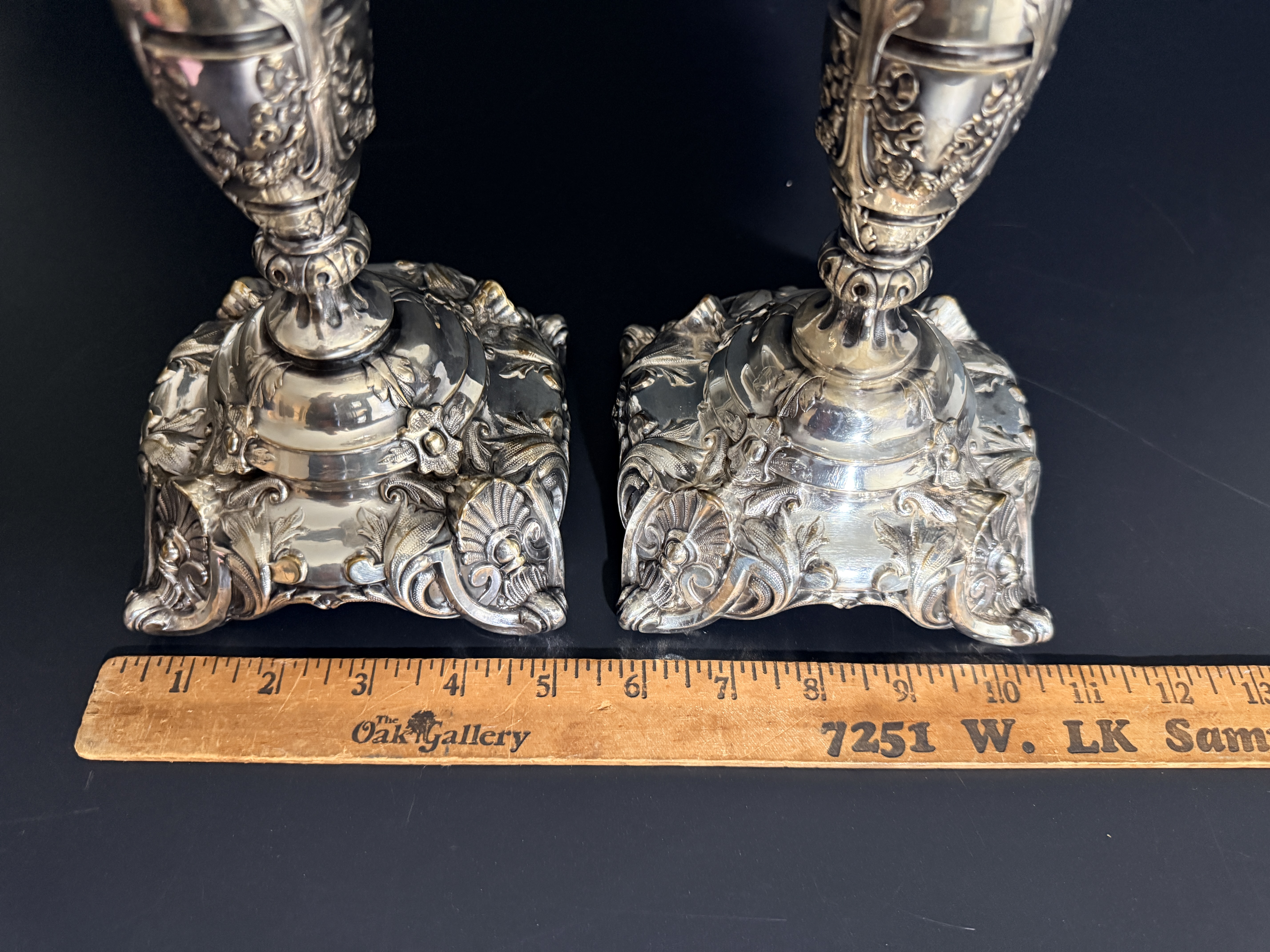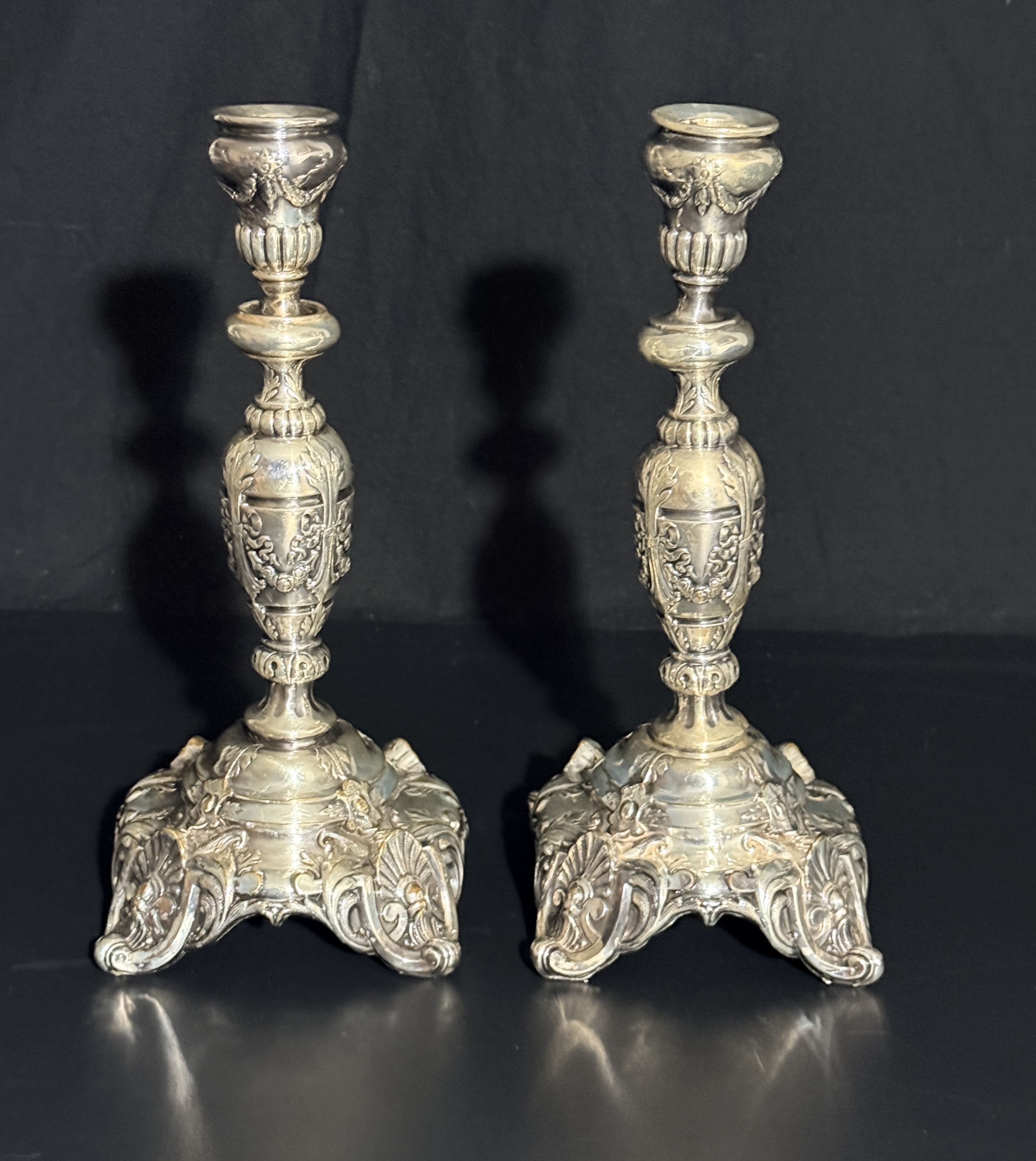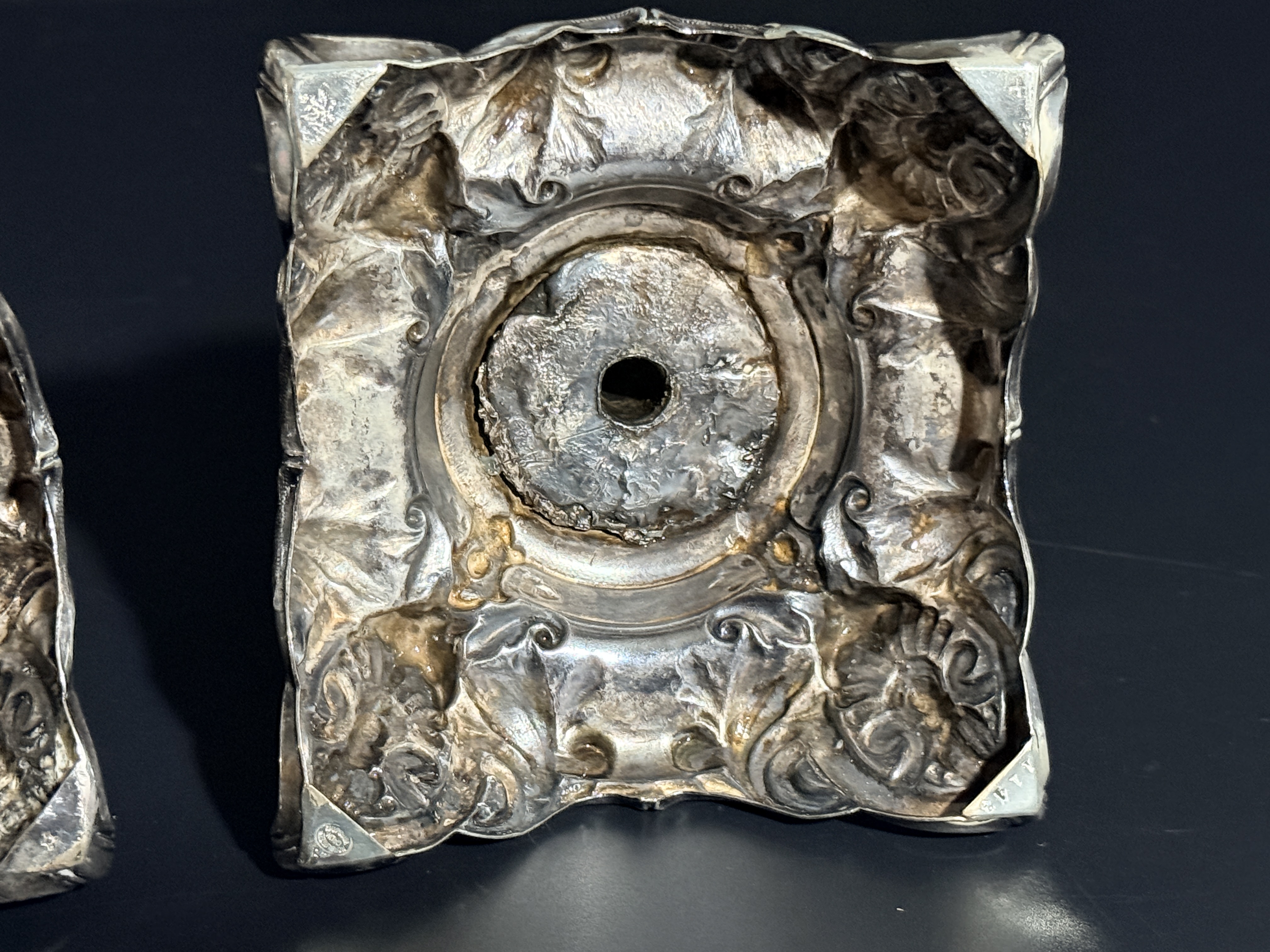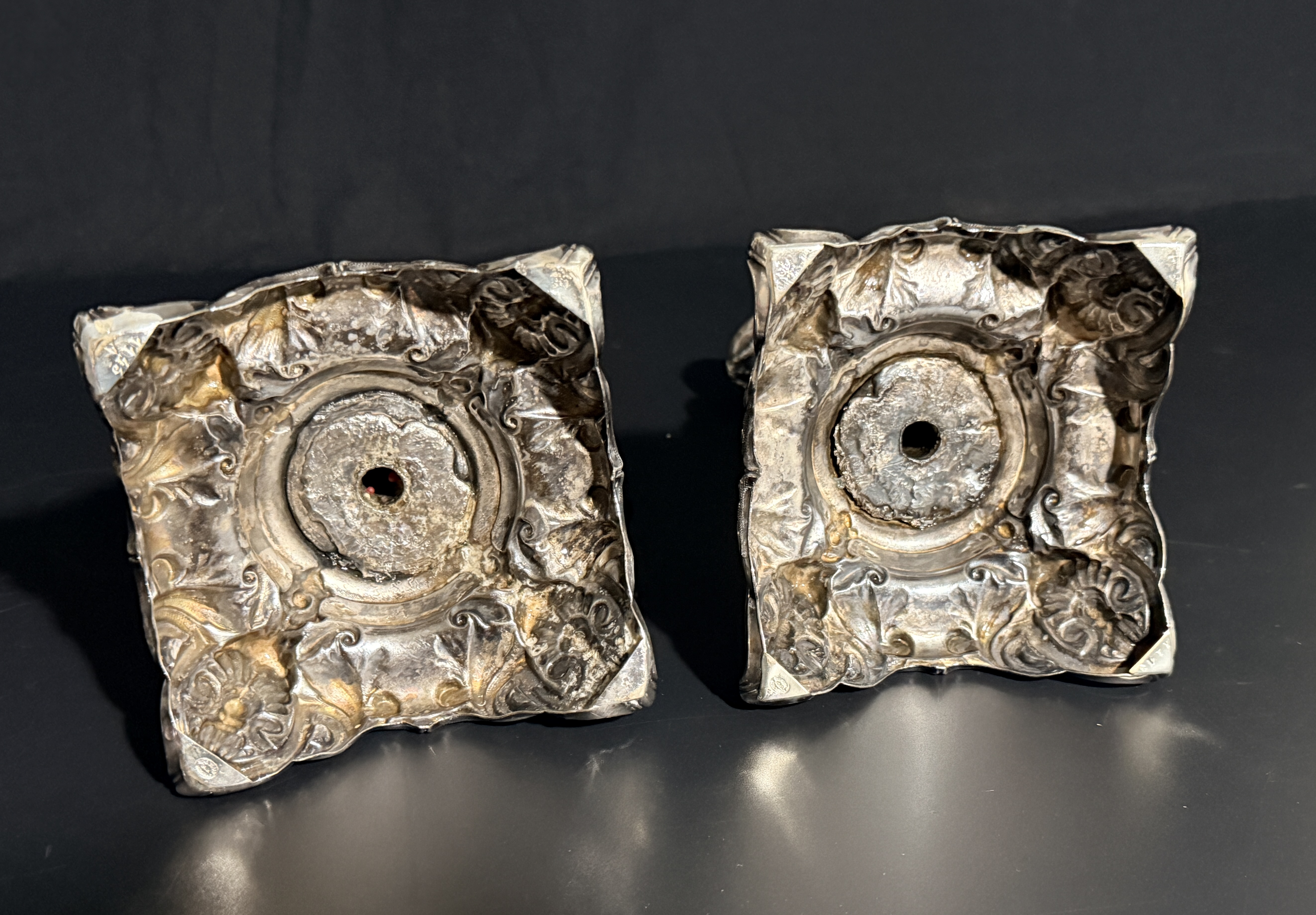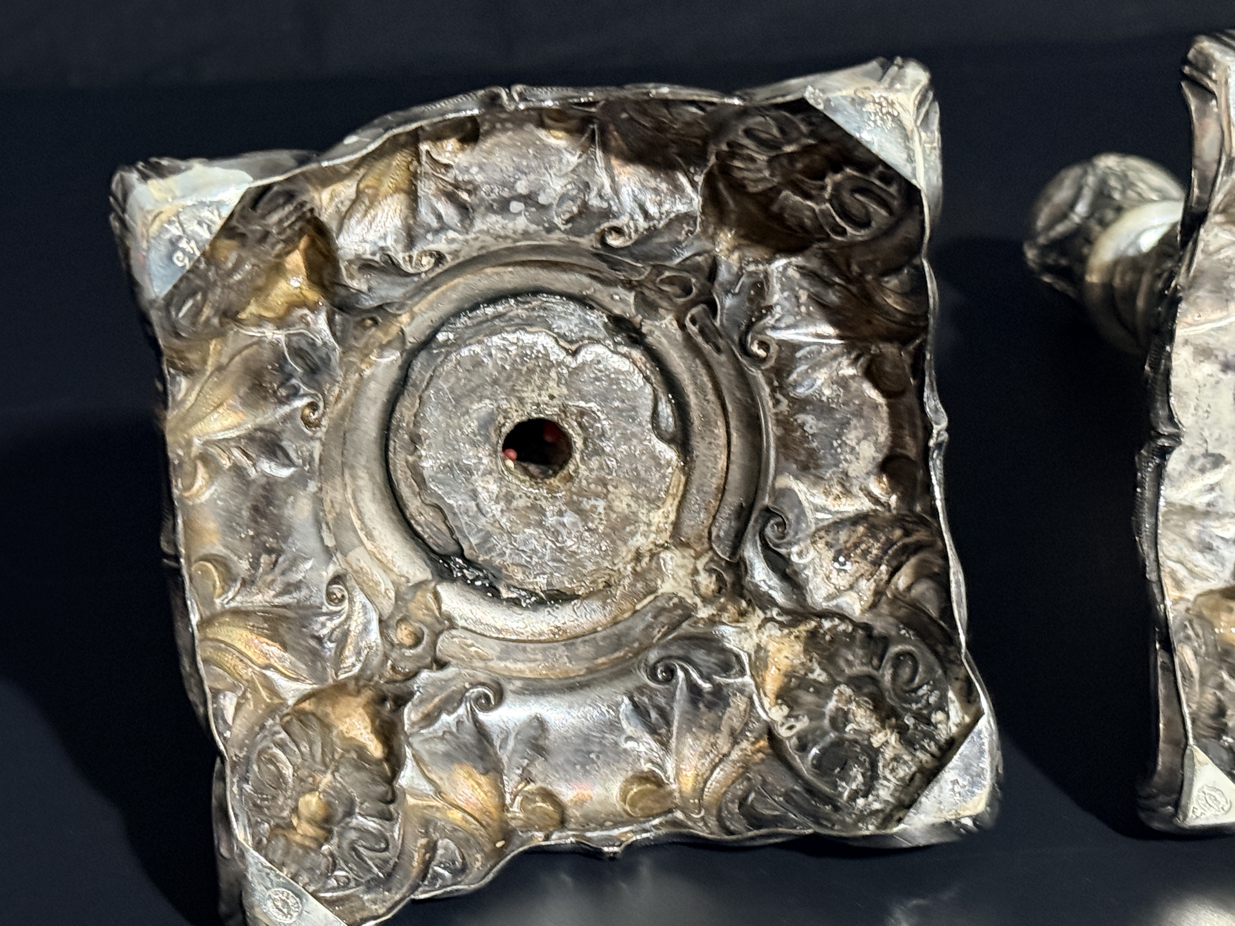 The candlesticks exhibit visible surface tarnish and patina. There is minor wear to the silver plating on high points and edges consistent with age and use.