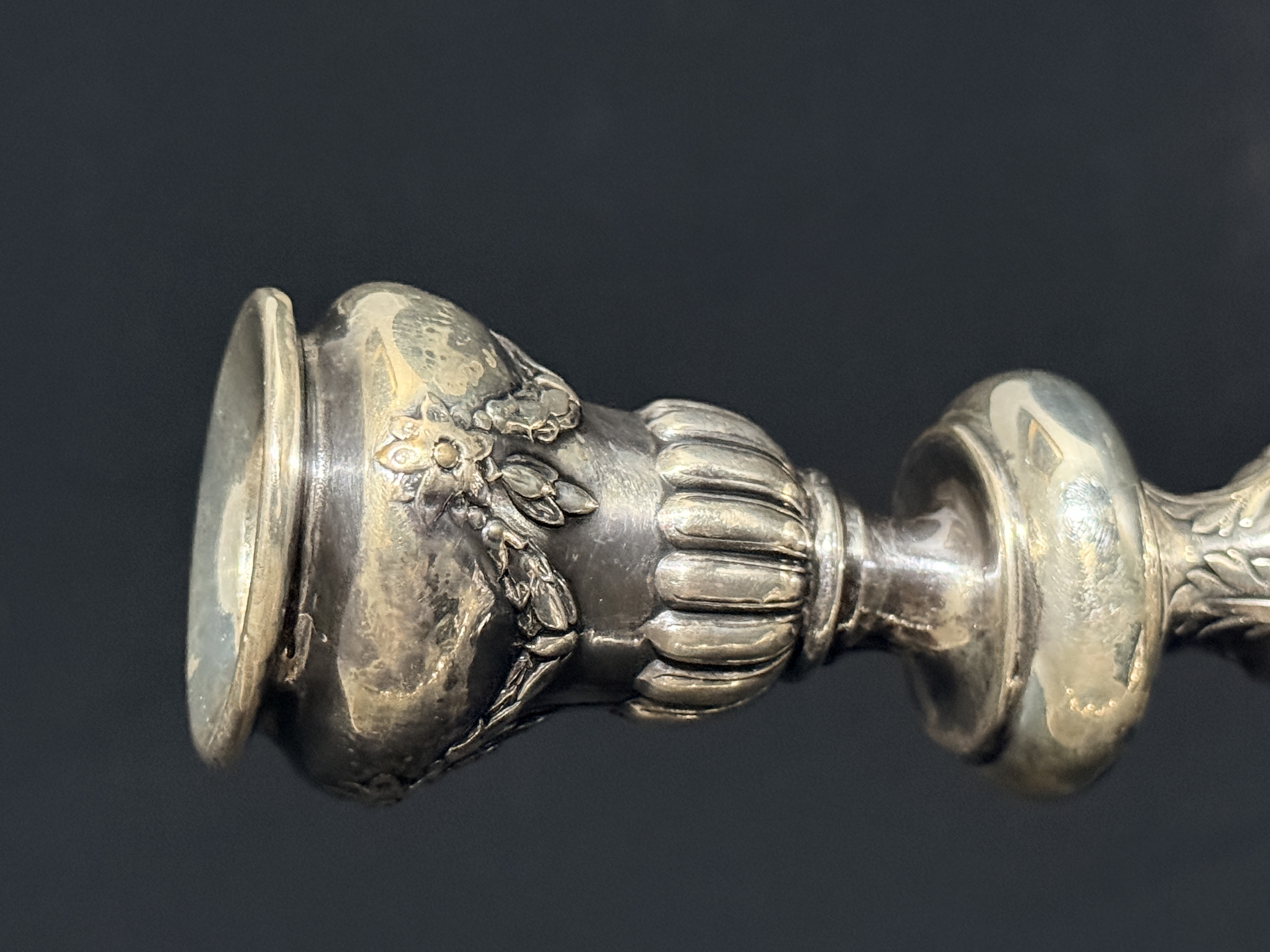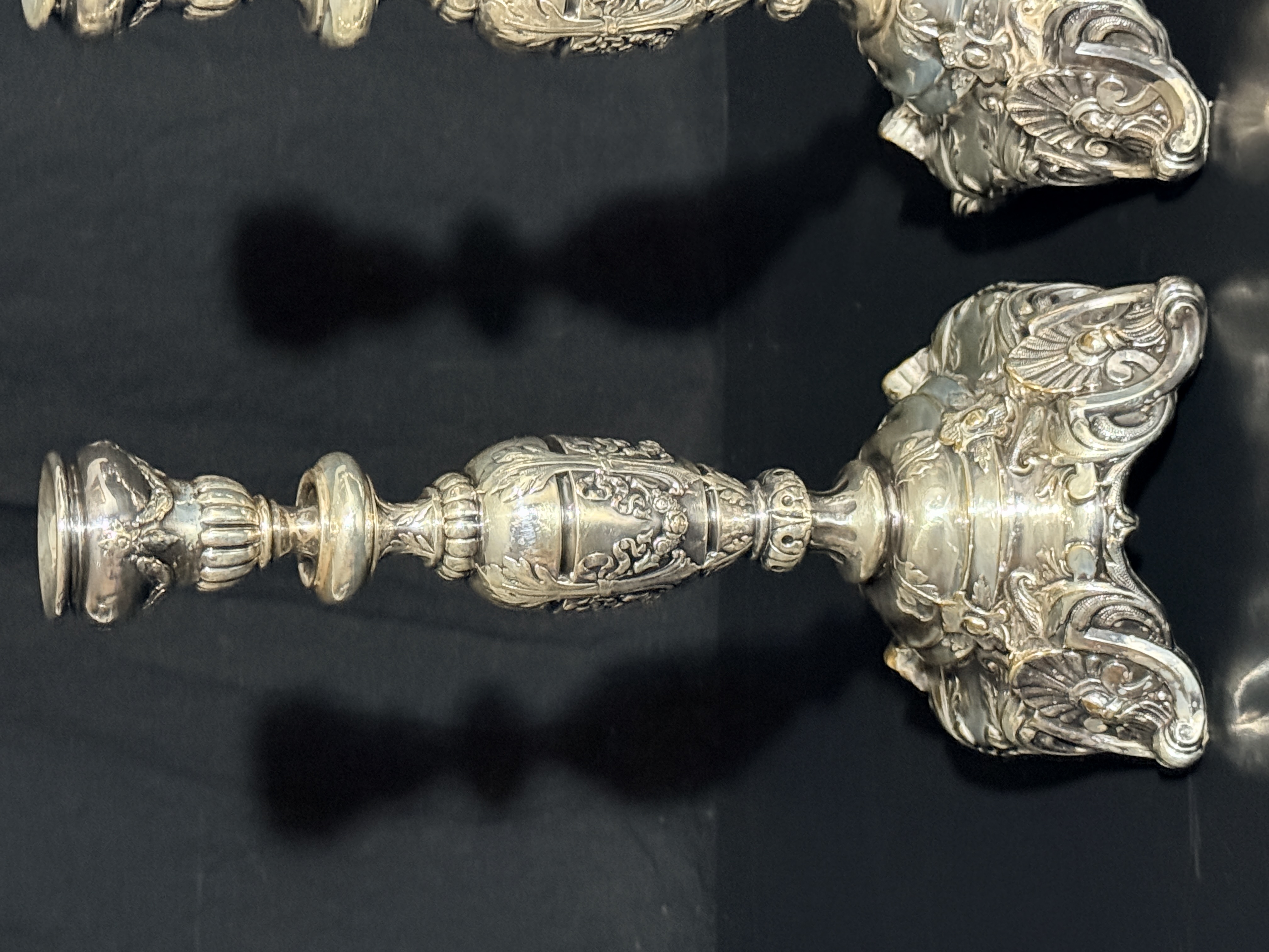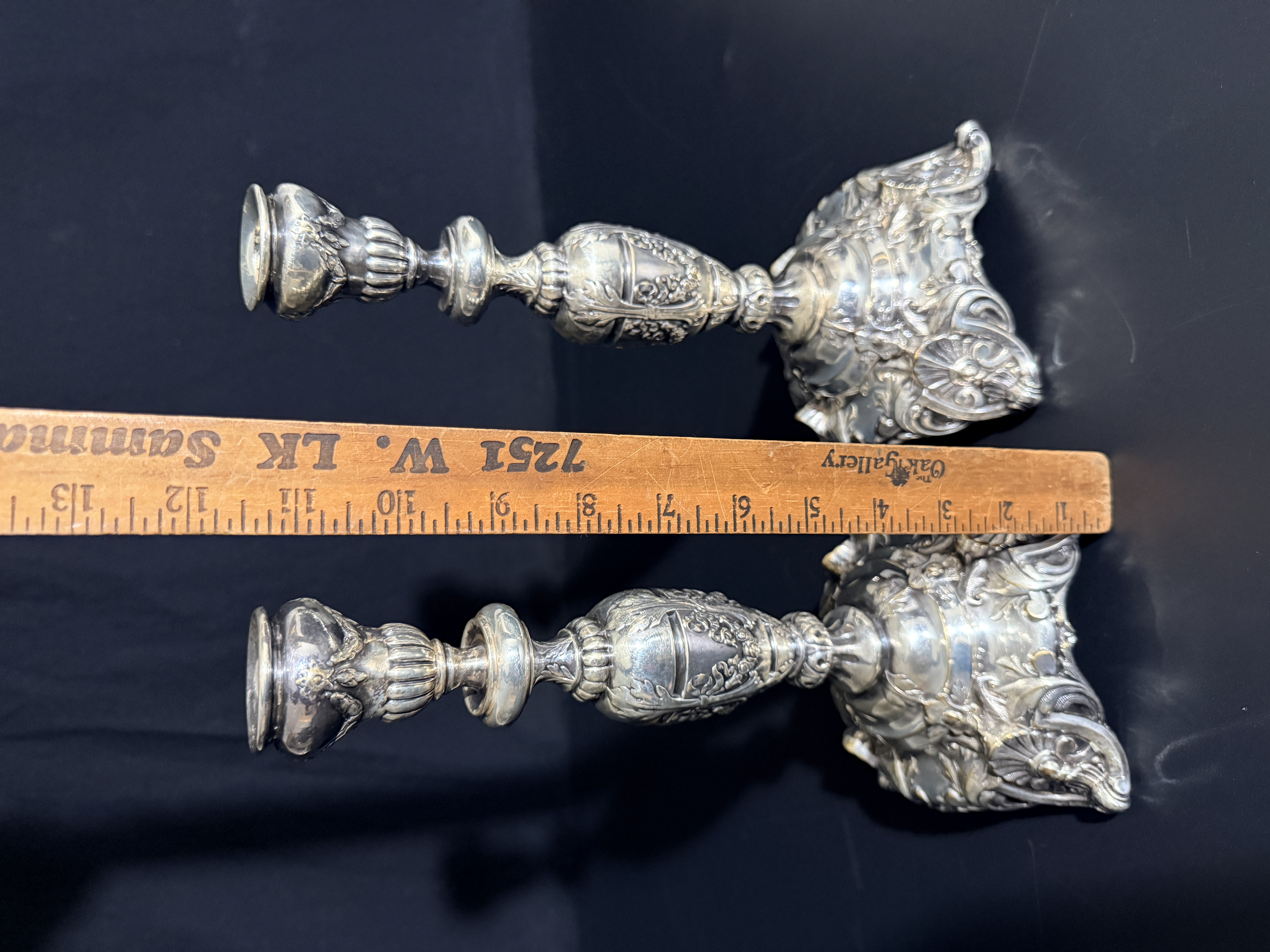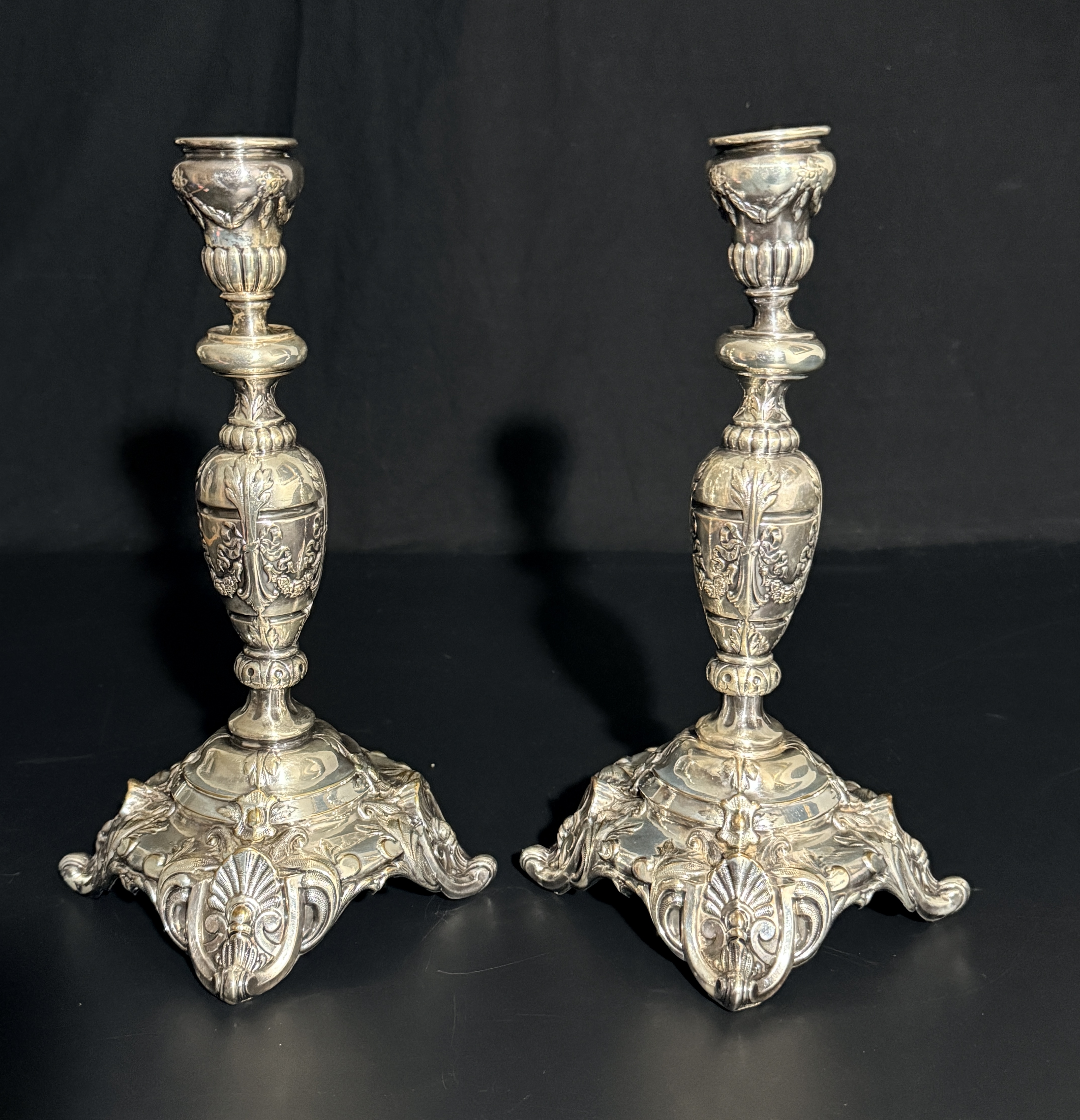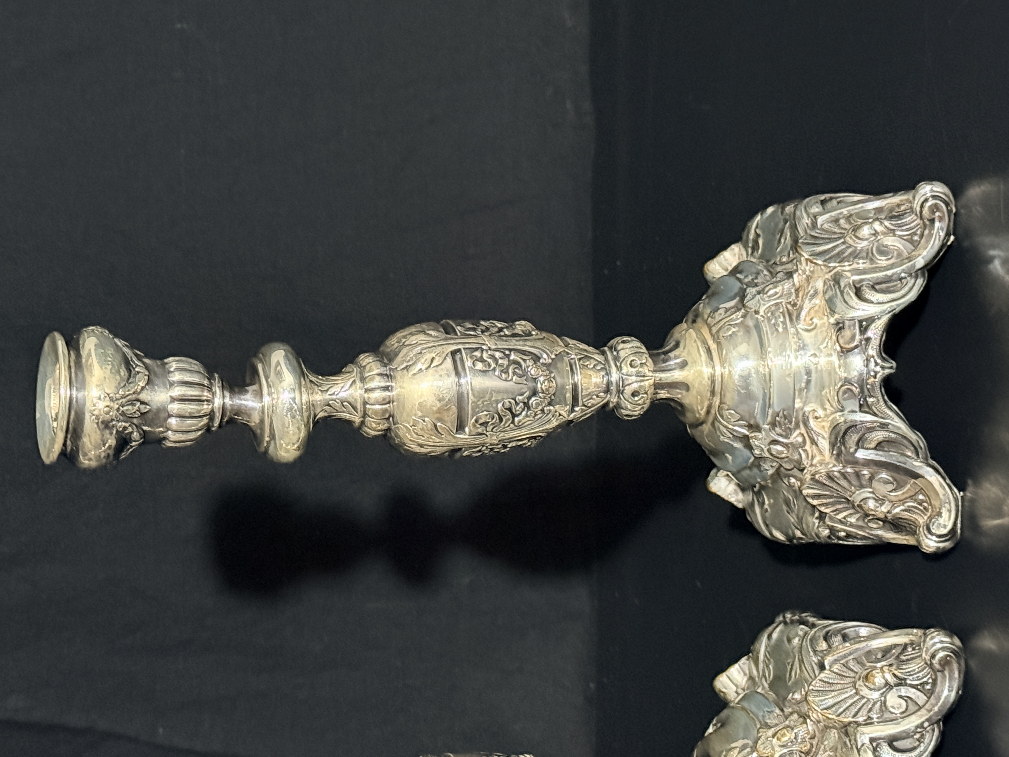 The candlesticks exhibit visible surface tarnish and patina. There is minor wear to the silver plating on high points and edges consistent with age and use.