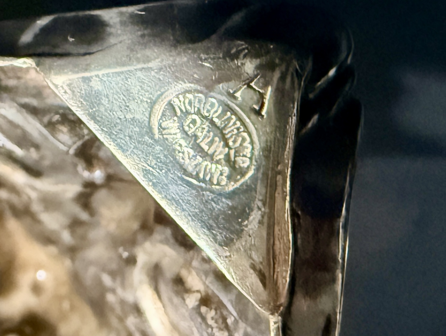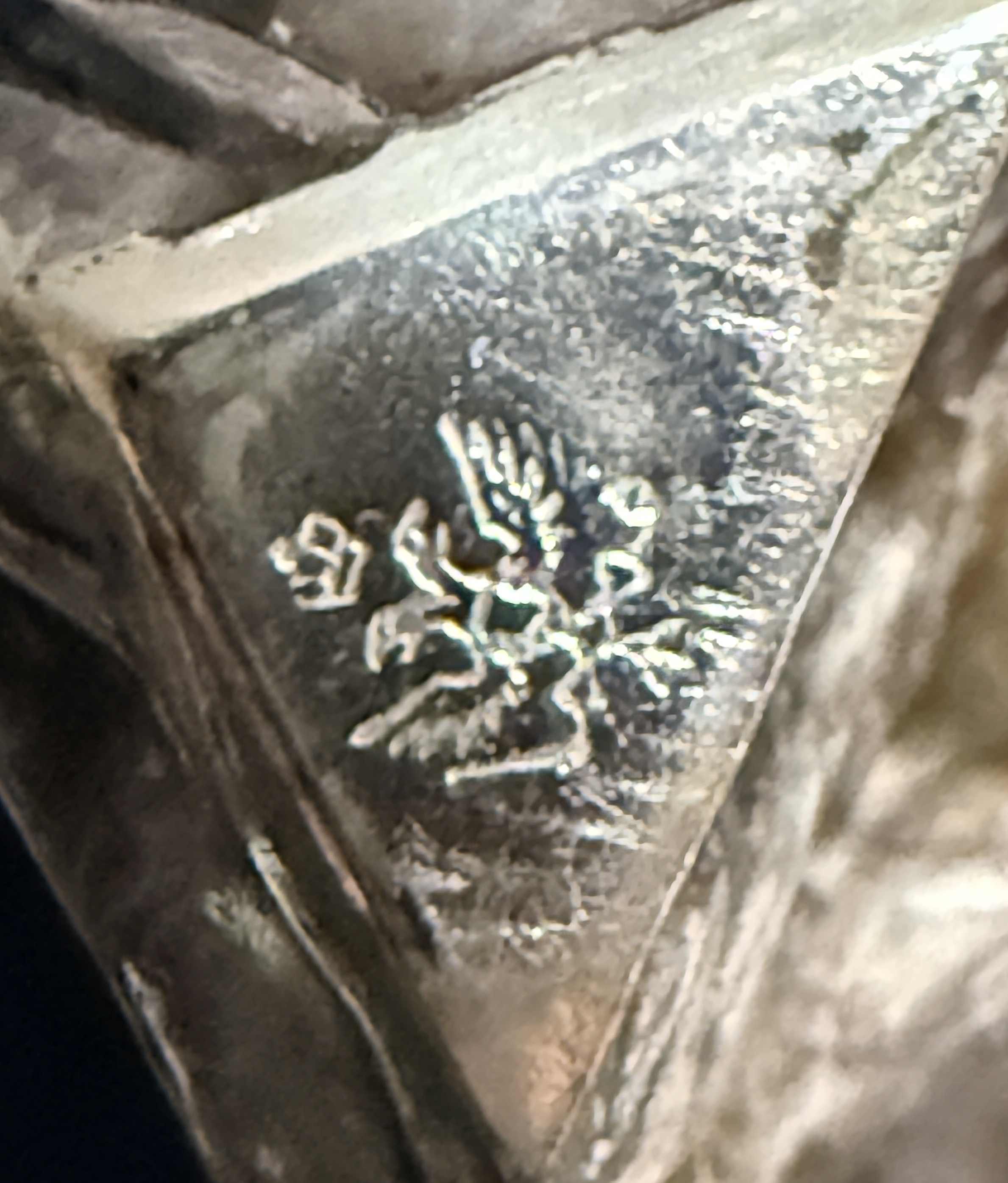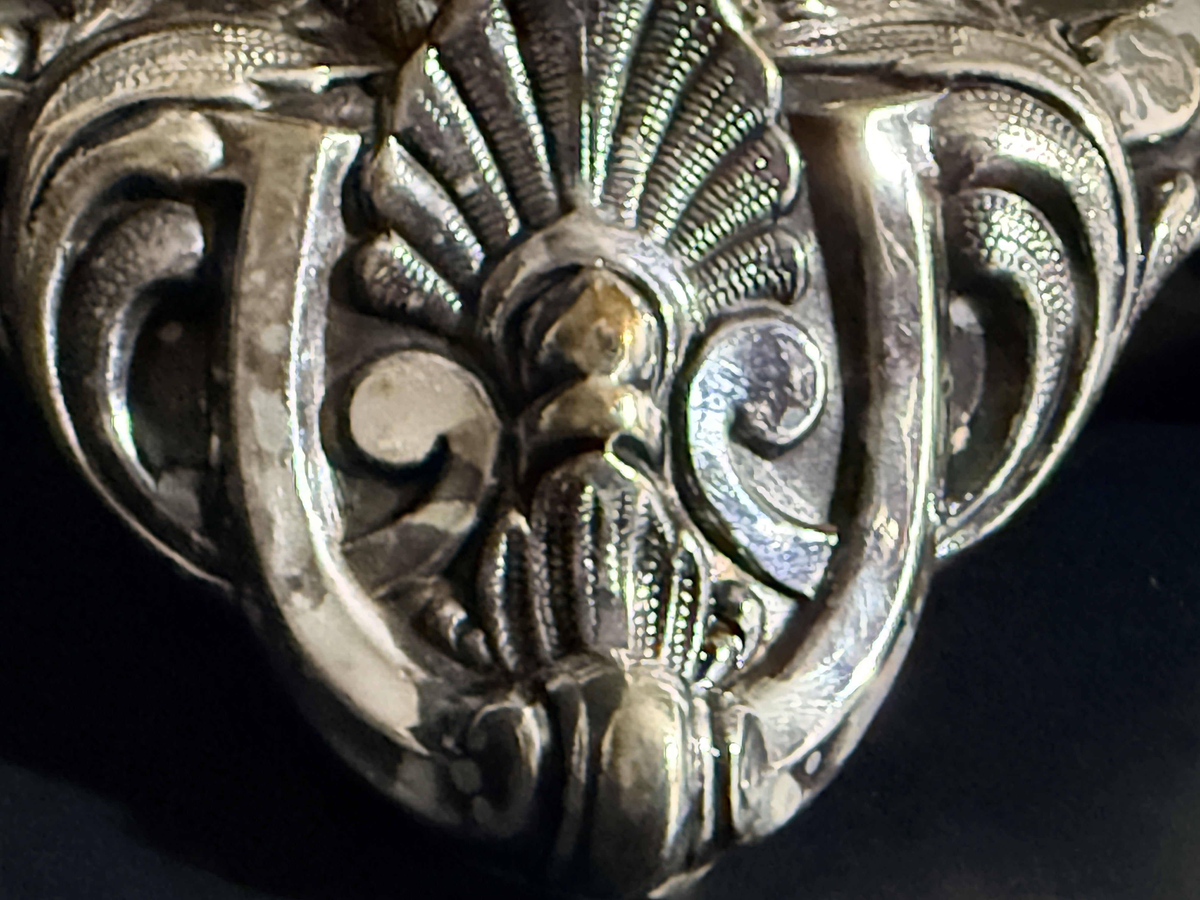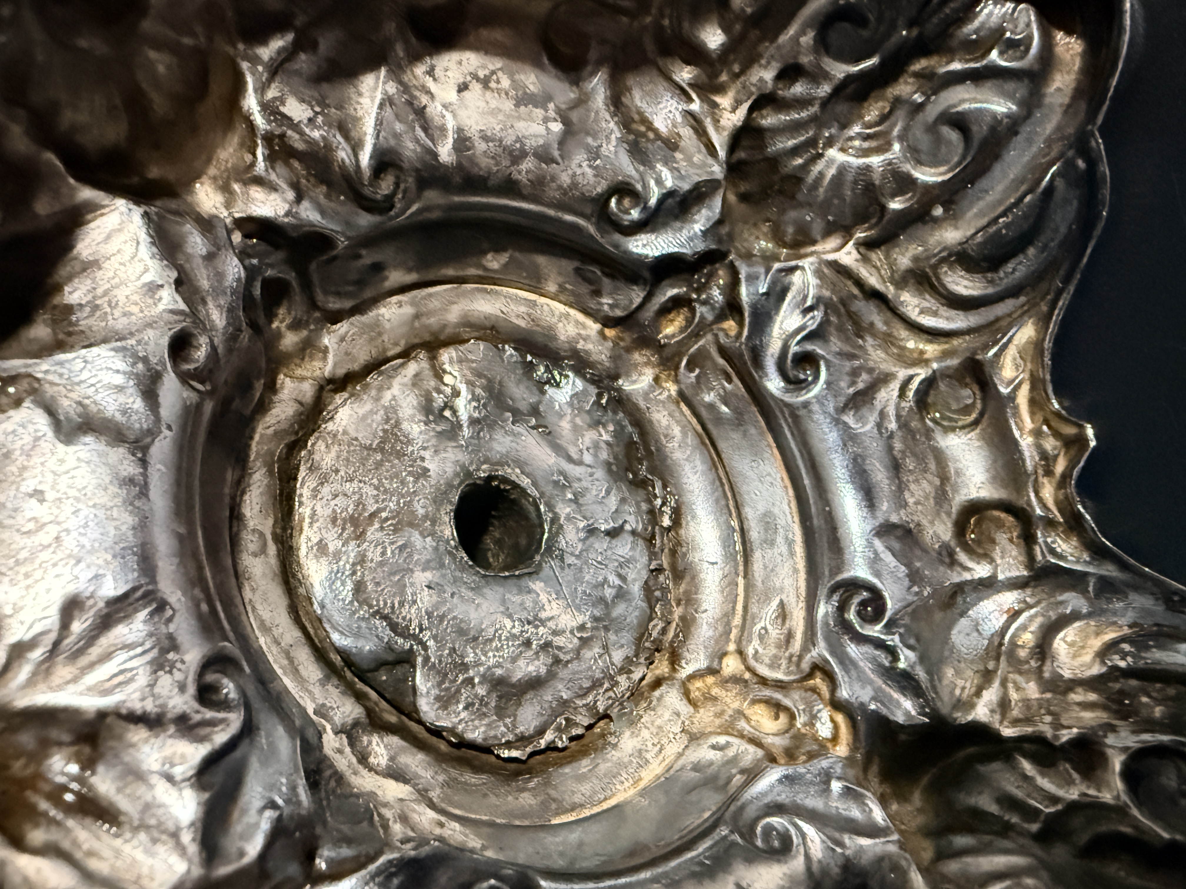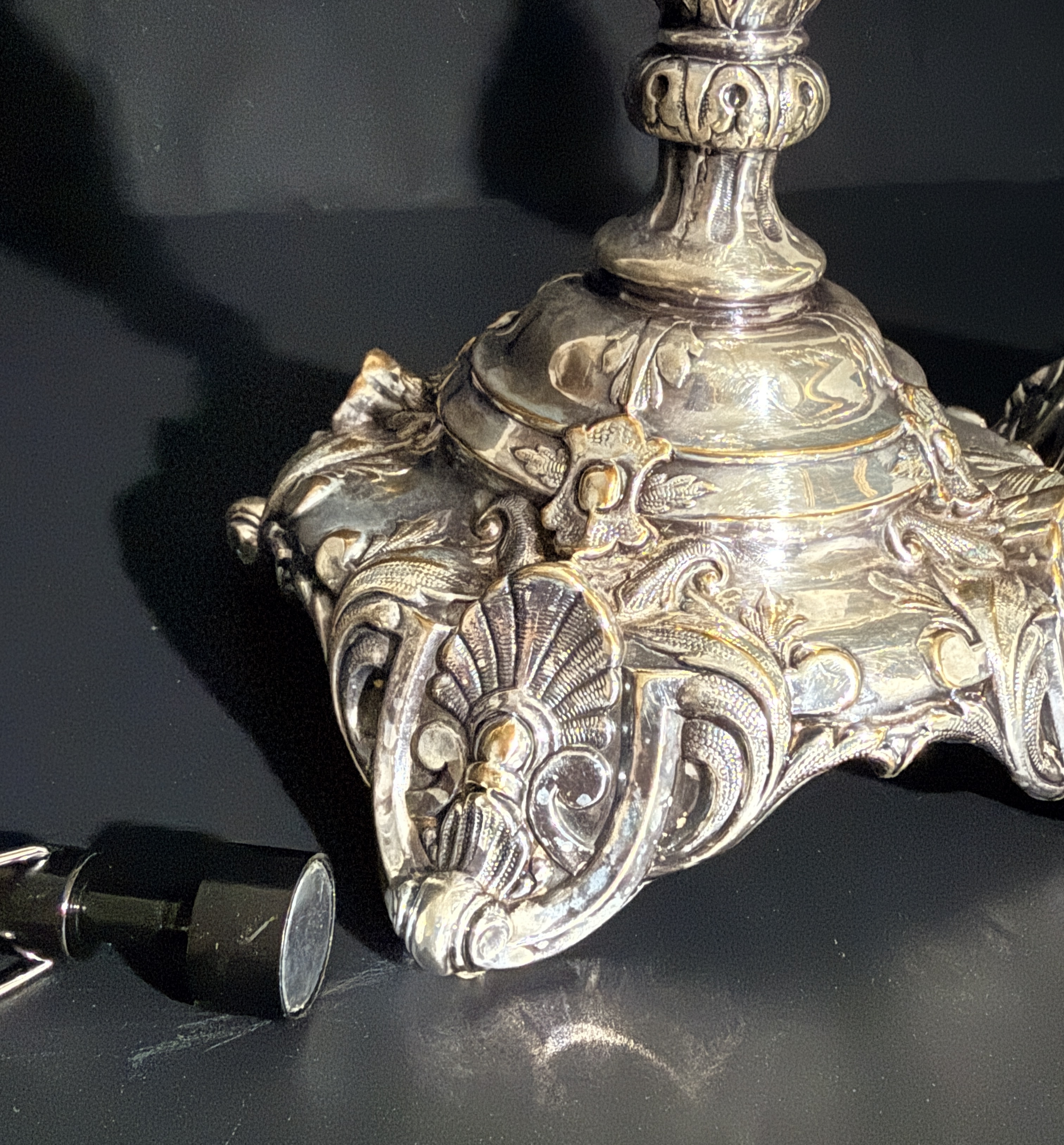 The candlesticks exhibit visible surface tarnish and patina. There is minor wear to the silver plating on high points and edges consistent with age and use.
