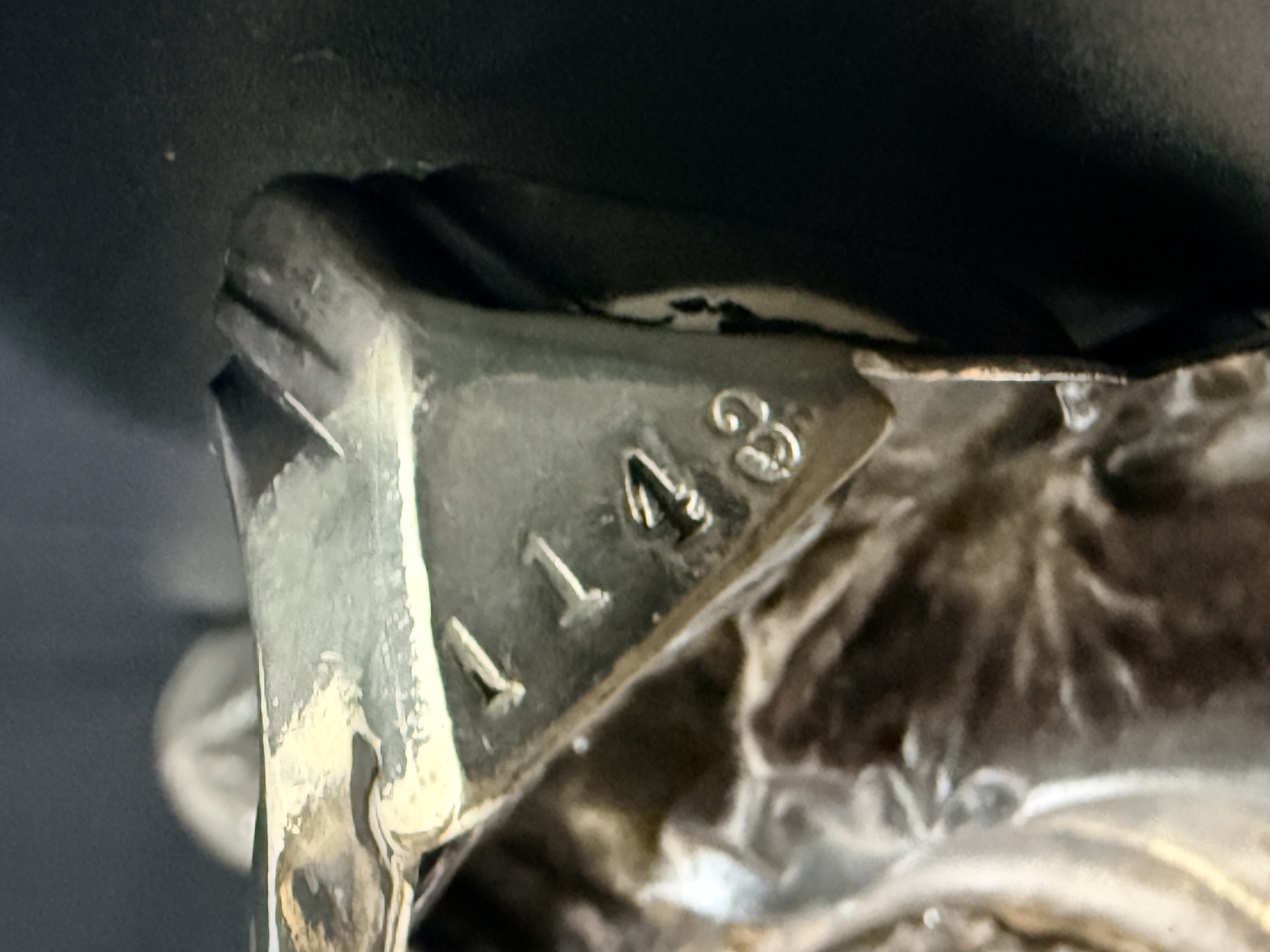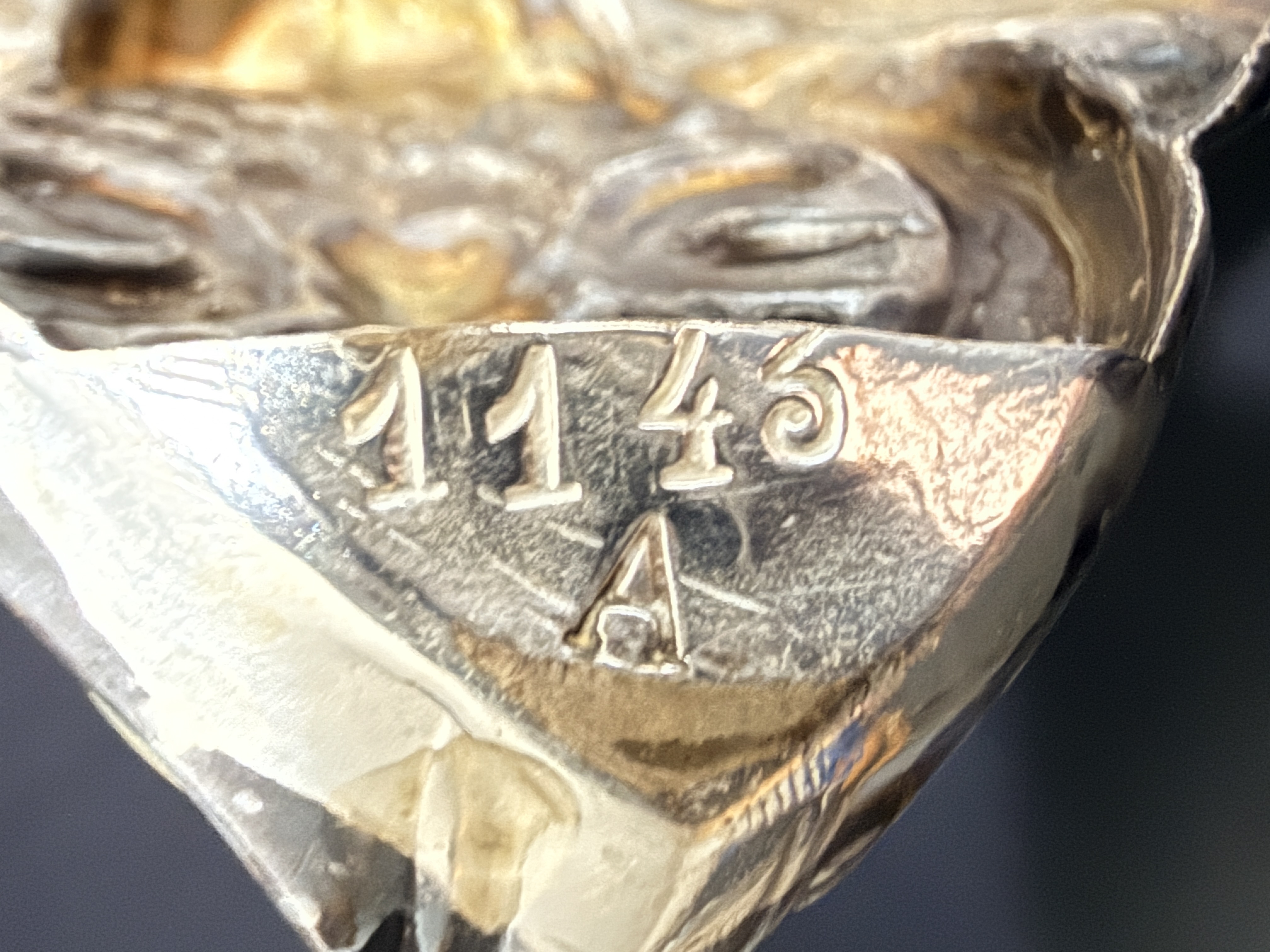 A pair of 19th-century silver-plated candlesticks manufactured by Norblin and Co. in Warsaw, Poland. These items are designed in the Rococo Revival style, featuring tiered bases with elaborate shell motifs, floral swags, and scrollwork. The baluster-form stems are decorated with corresponding foliate and floral ornamentation. The undersides of the bases are stamped with several hallmarks, including an oval mark for NORBLIN and Co / GALW / WARSZAWA, indicating they are electroplated. Additional marks include the number 1145, the letter A, and a crest mark. The hollow interiors appear to contain original weighting material.