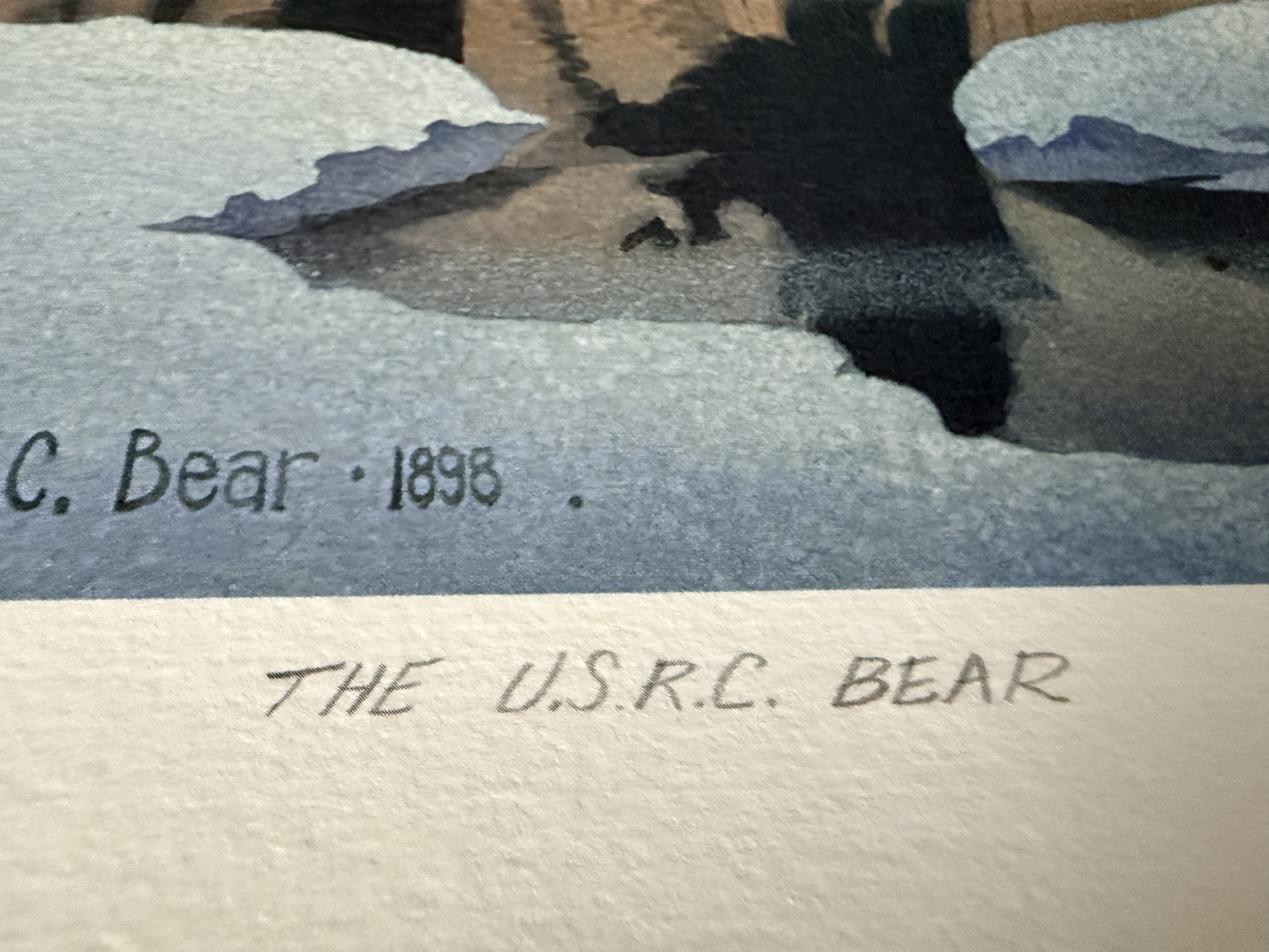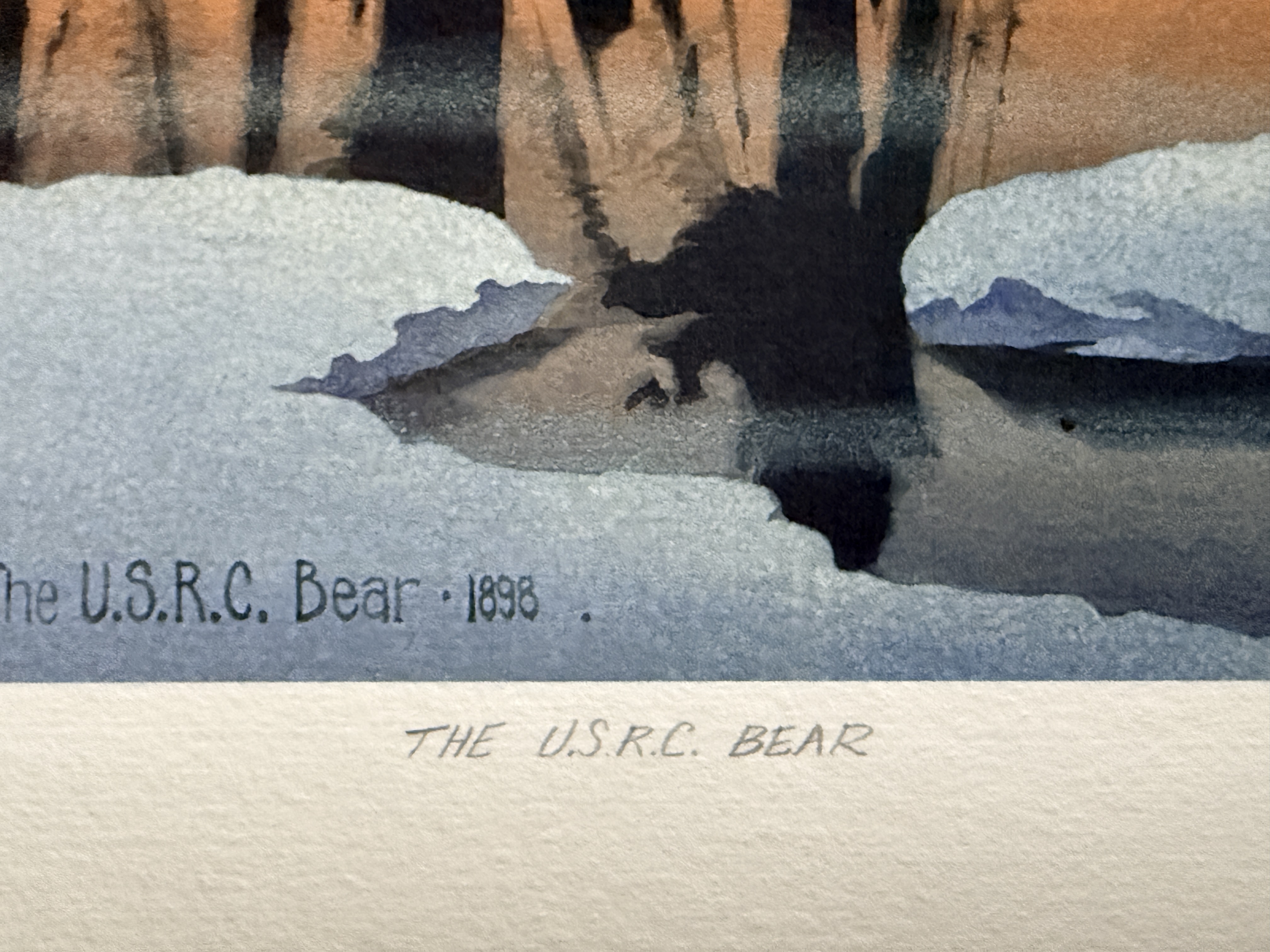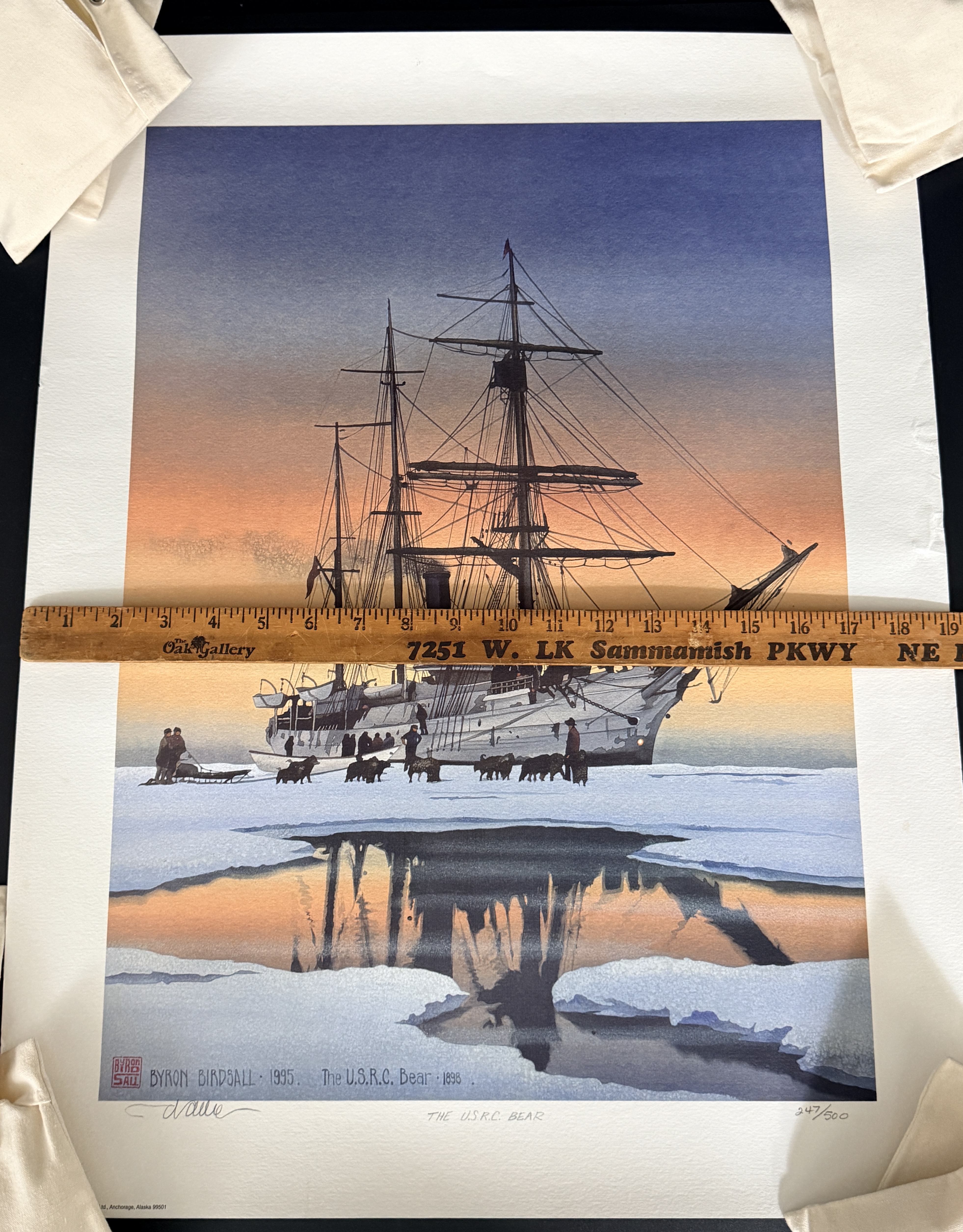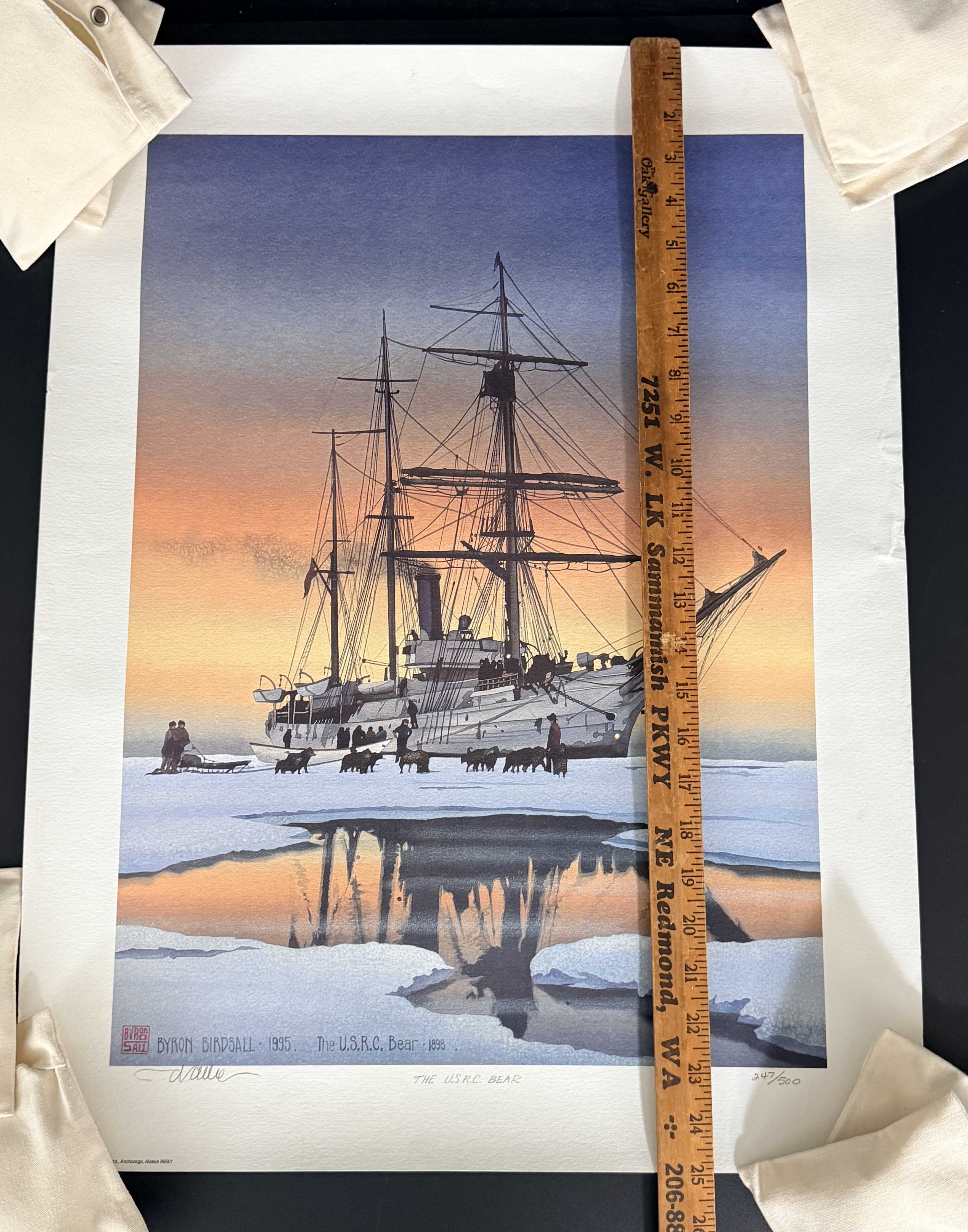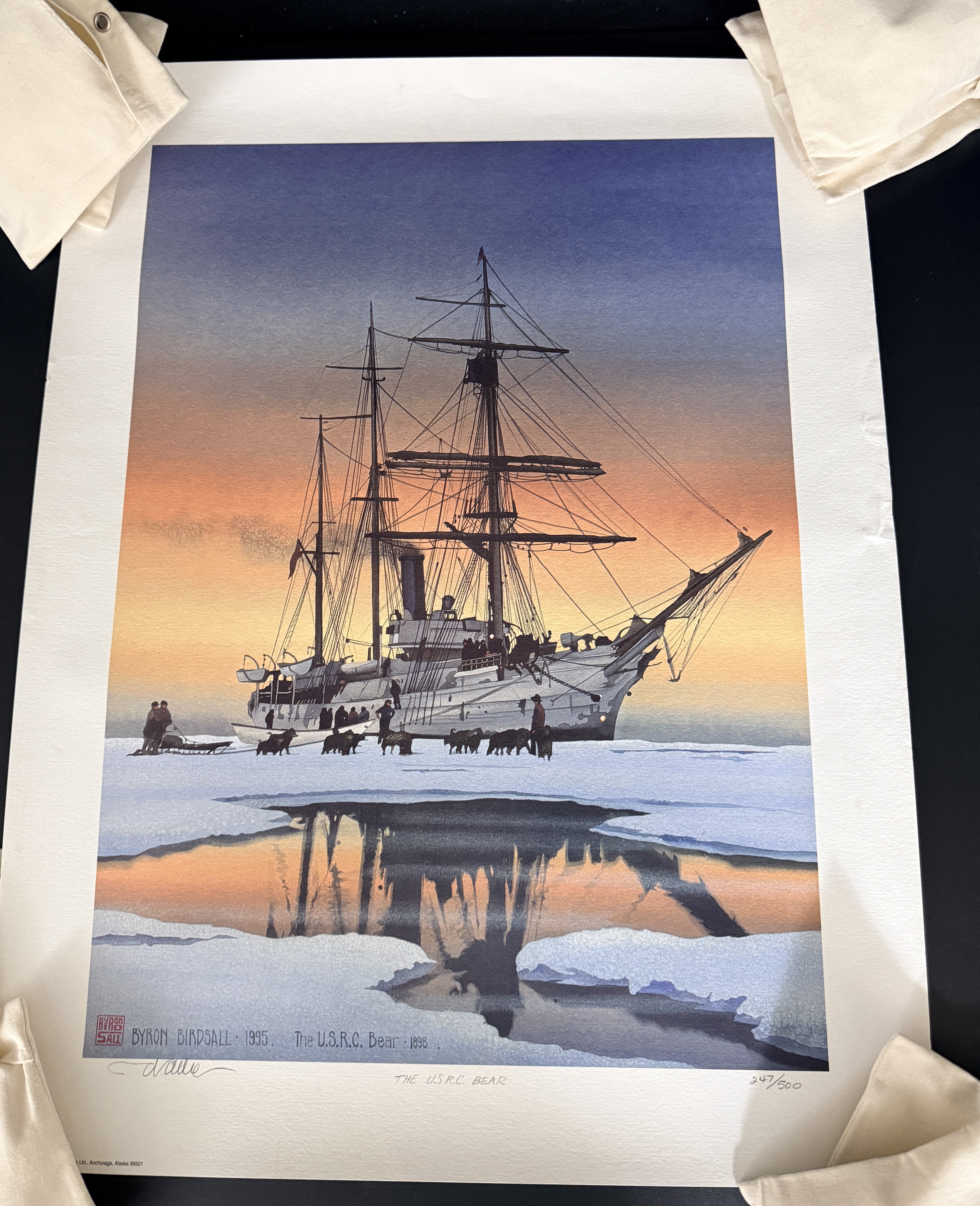 A limited edition fine art print by Alaskan artist Byron Birdsall (1937-2016) titled The U.S.R.C. Bear. The composition depicts the historic United States Revenue Cutter Bear amidst an Arctic ice field at sunset, with dog sled teams and figures in the foreground. The work is executed on heavy textured paper and was published in 1995 by Artique Ltd. of Anchorage, Alaska. The lower margin features the artist hand-signature in pencil, the title, and the edition number 247/500. A red artist chop mark is located in the lower left corner of the image. Printed text within the image area identifies the artist, the publication year of 1995, and the historical subject date of 1898. Copyright and publisher information are printed along the bottom edge of the sheet.