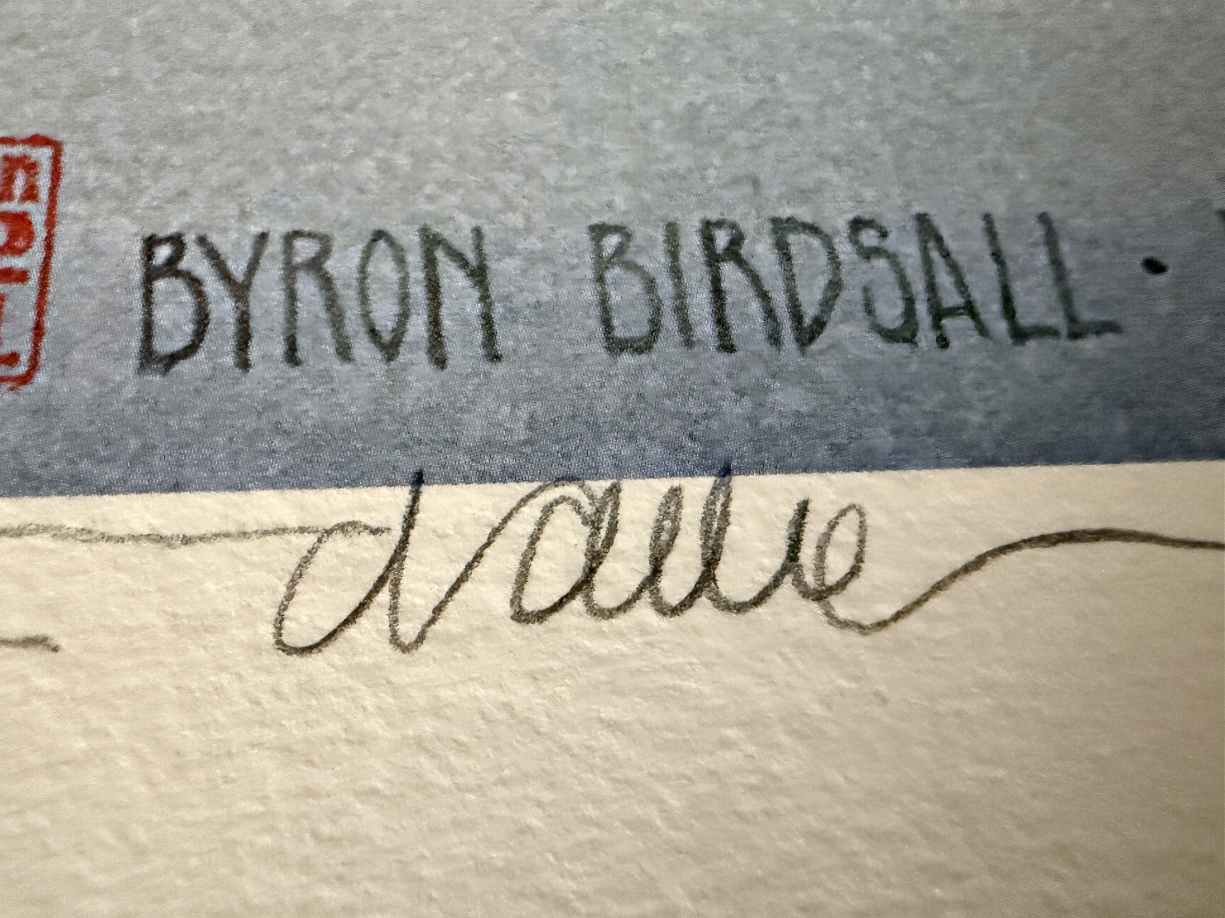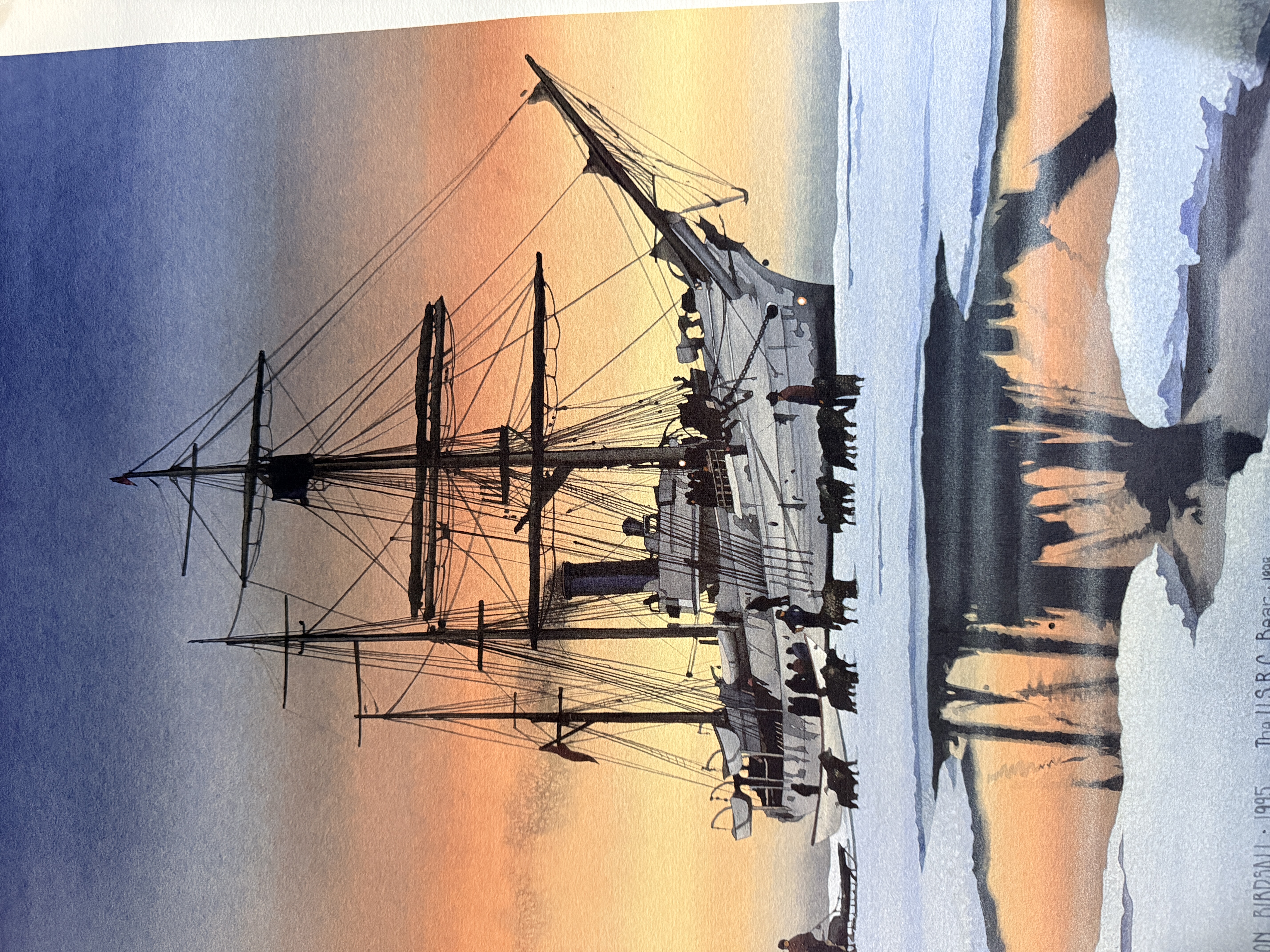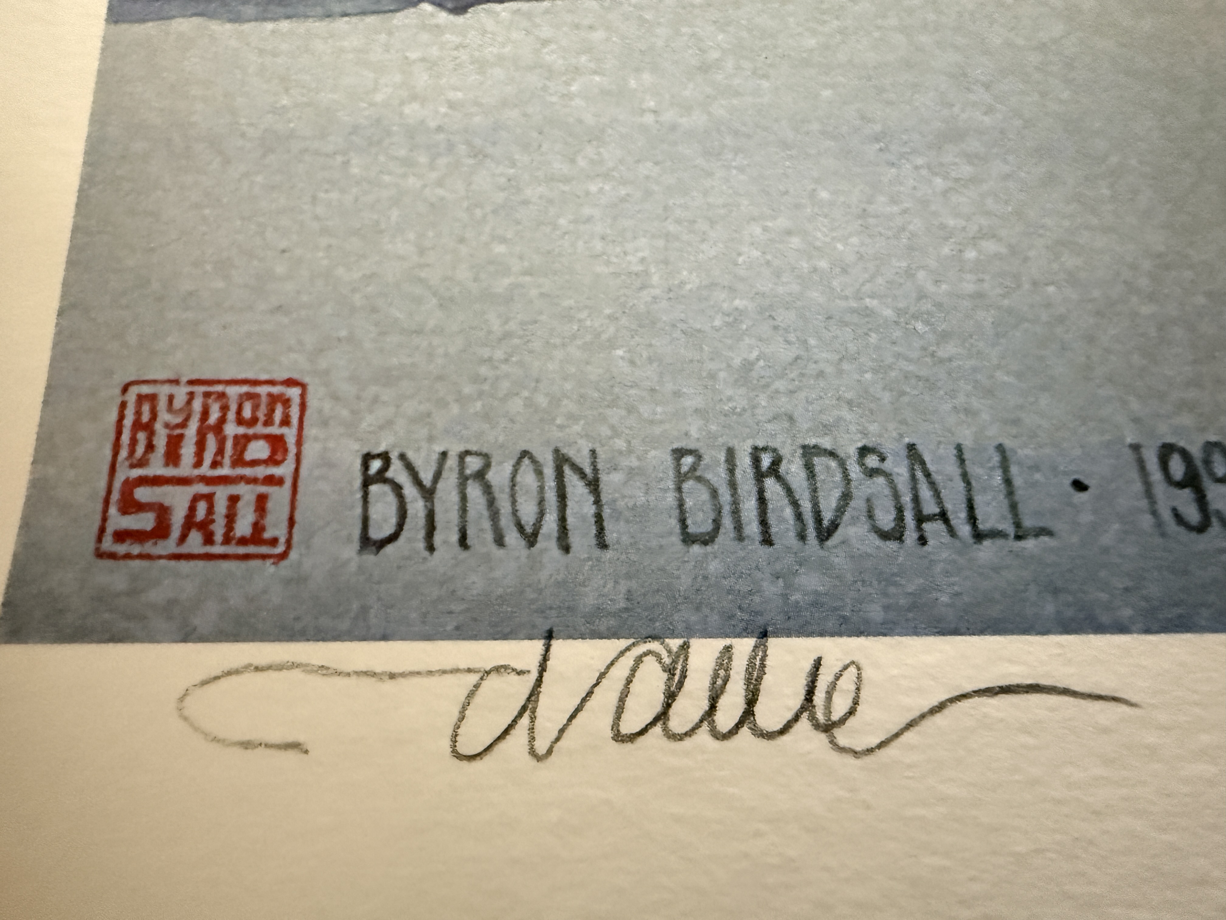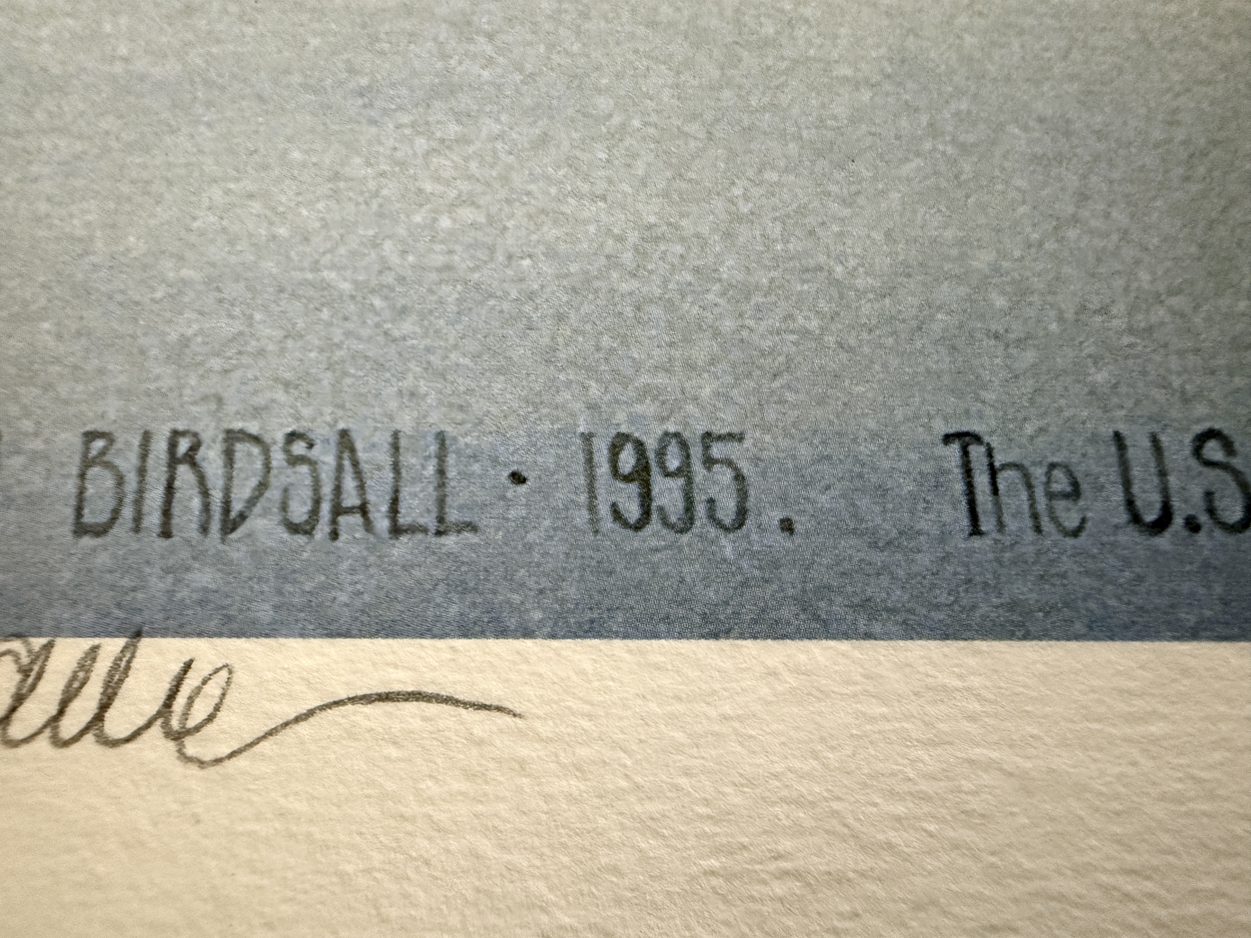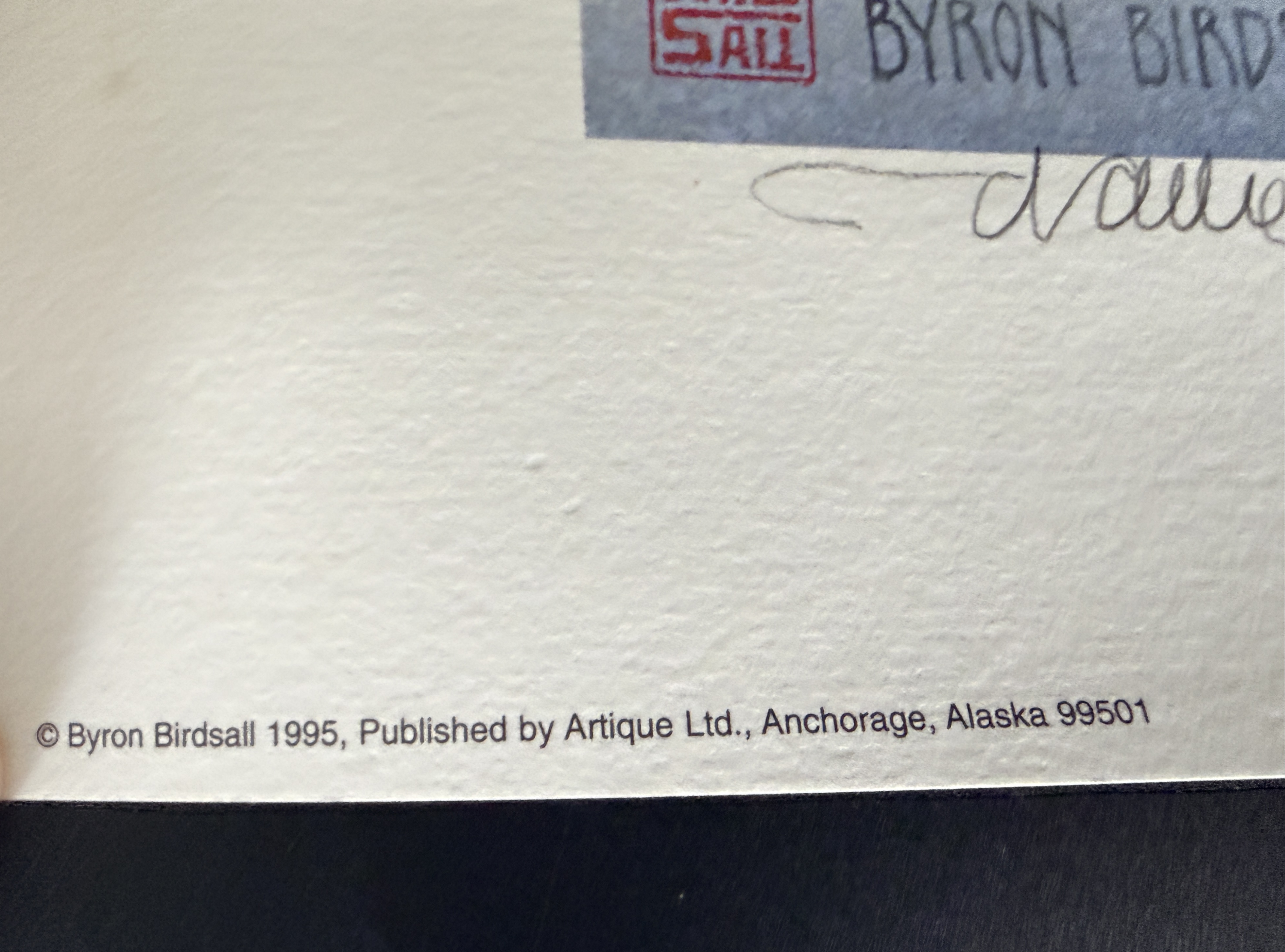 A limited edition fine art print by Alaskan artist Byron Birdsall (1937-2016) titled The U.S.R.C. Bear. The composition depicts the historic United States Revenue Cutter Bear amidst an Arctic ice field at sunset, with dog sled teams and figures in the foreground. The work is executed on heavy textured paper and was published in 1995 by Artique Ltd. of Anchorage, Alaska. The lower margin features the artist hand-signature in pencil, the title, and the edition number 247/500. A red artist chop mark is located in the lower left corner of the image. Printed text within the image area identifies the artist, the publication year of 1995, and the historical subject date of 1898. Copyright and publisher information are printed along the bottom edge of the sheet.