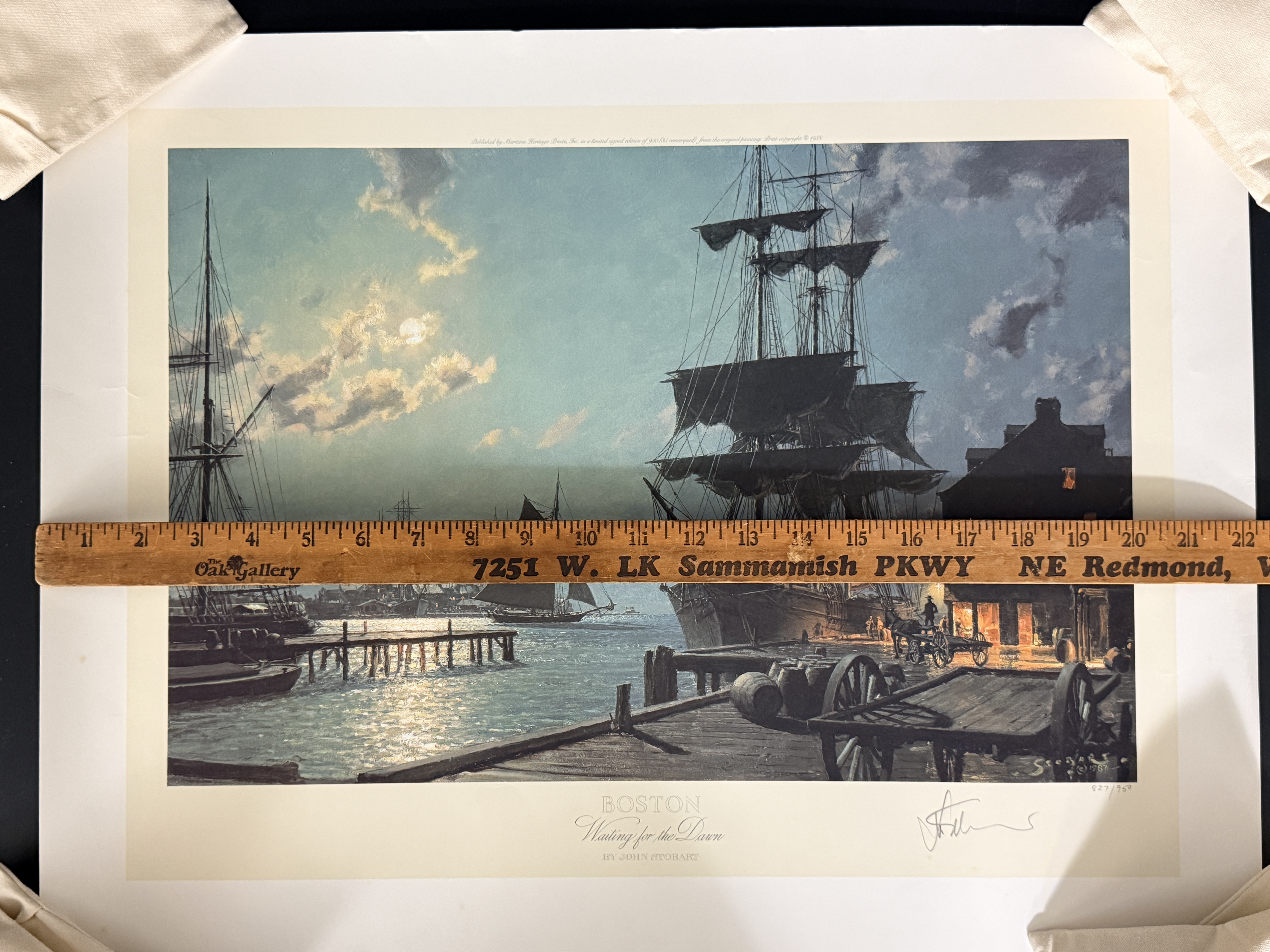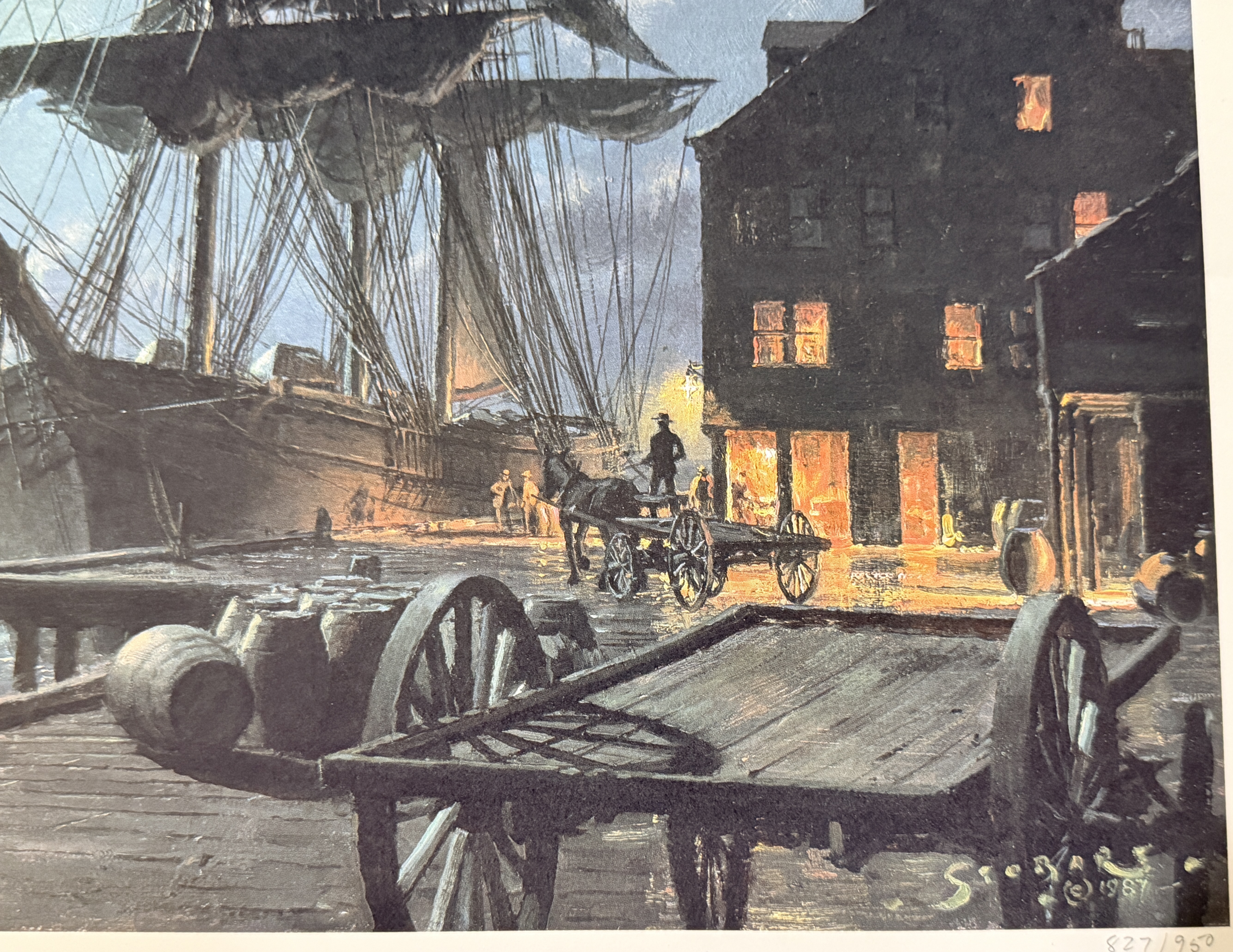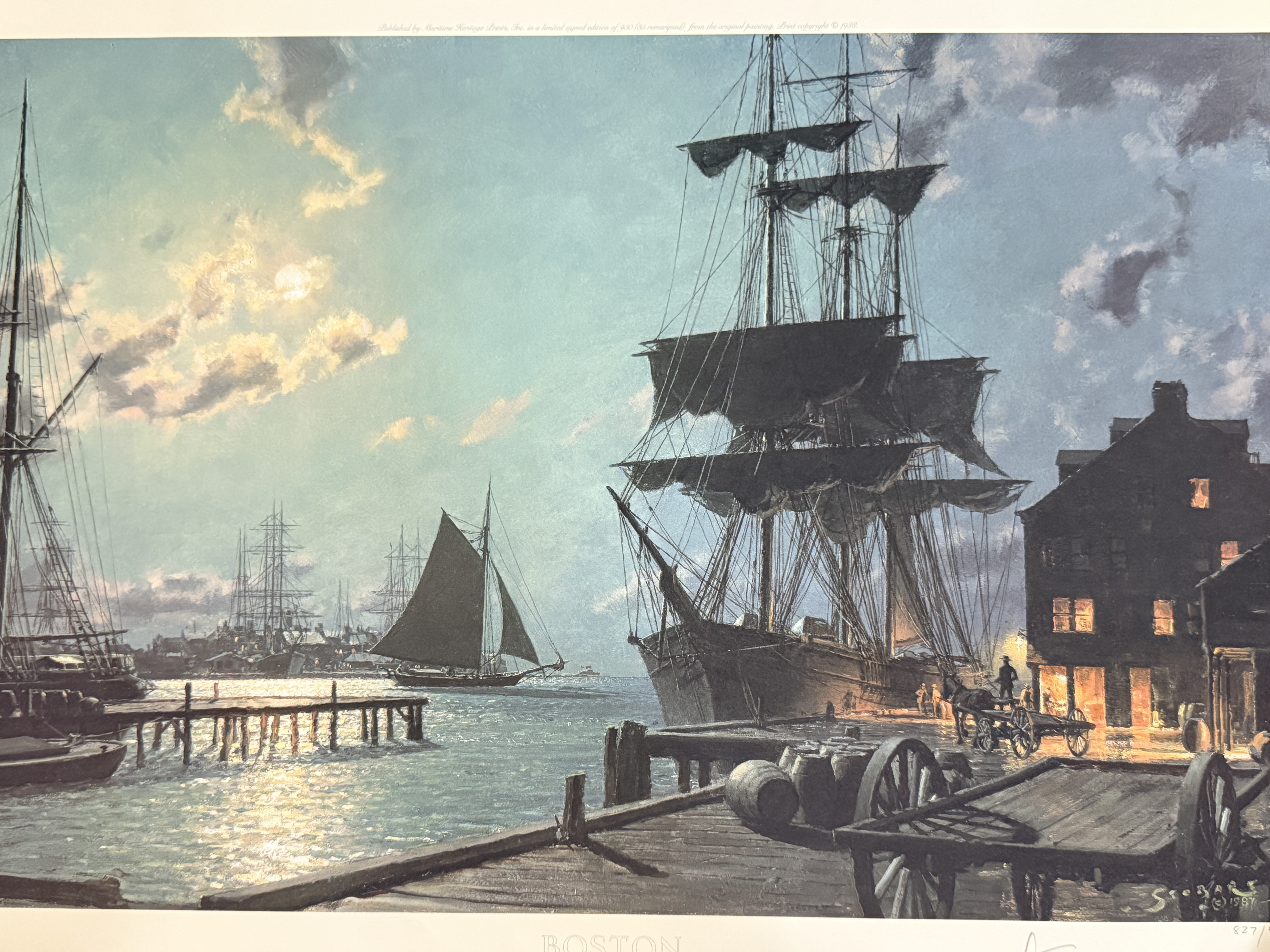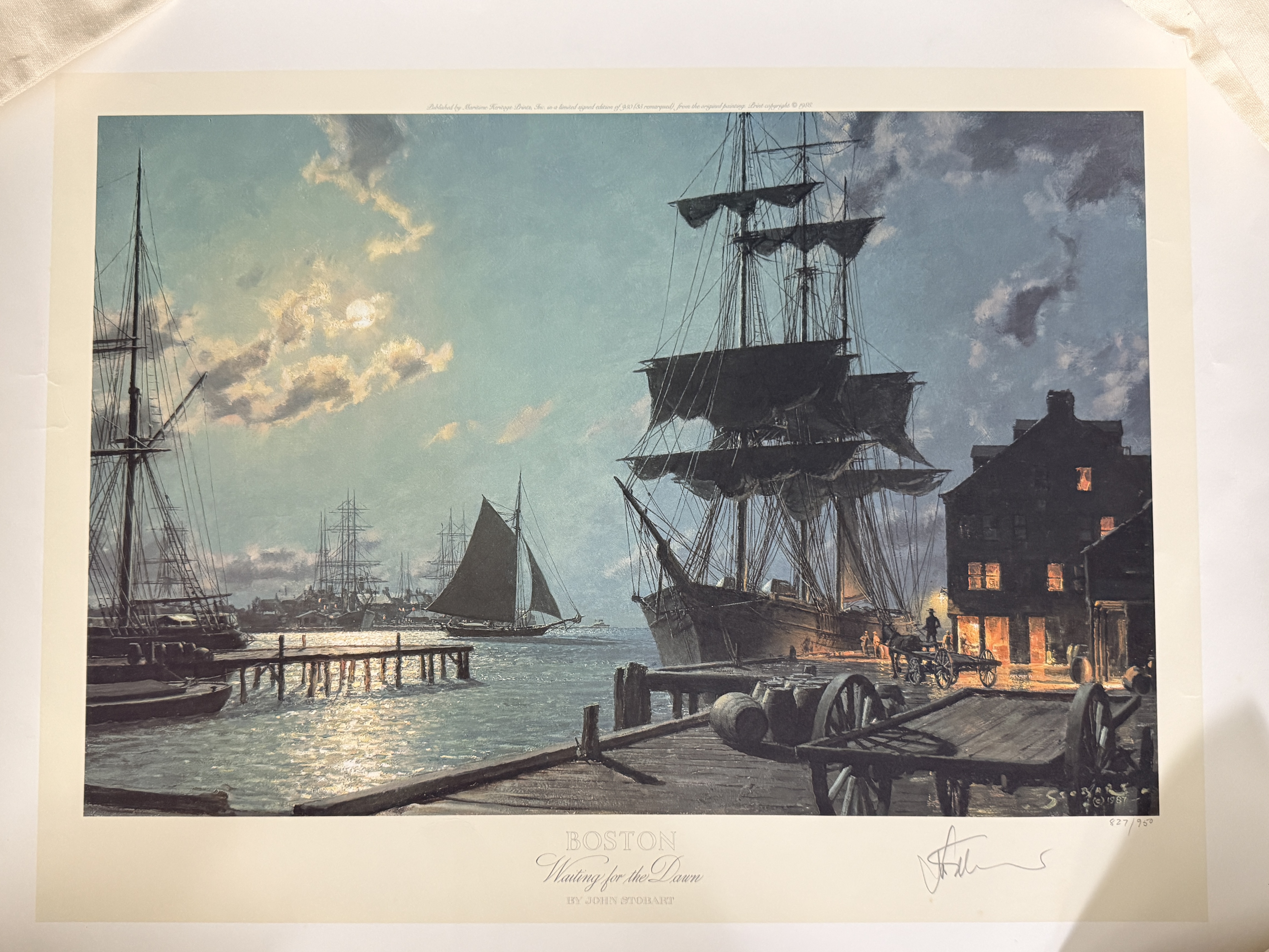 This limited edition maritime lithograph is titled Boston Waiting for the Dawn by artist John Stobart. The work depicts a historical harbor scene at dawn featuring square-rigged sailing vessels, a horse-drawn wagon, and cargo barrels on a wooden pier. It is a signed and numbered print from an edition of 950, with the number 827/950 inscribed in pencil in the lower right margin. The artist signature is hand-signed in pencil adjacent to the edition number. The image also contains a printed signature and date of 1987 within the plate. Published by Maritime Heritage Prints, Inc., the print includes a copyright date of 1988 and printed text along the top edge detailing its provenance from the original 1987 painting. The piece is unframed on heavy paper stock.