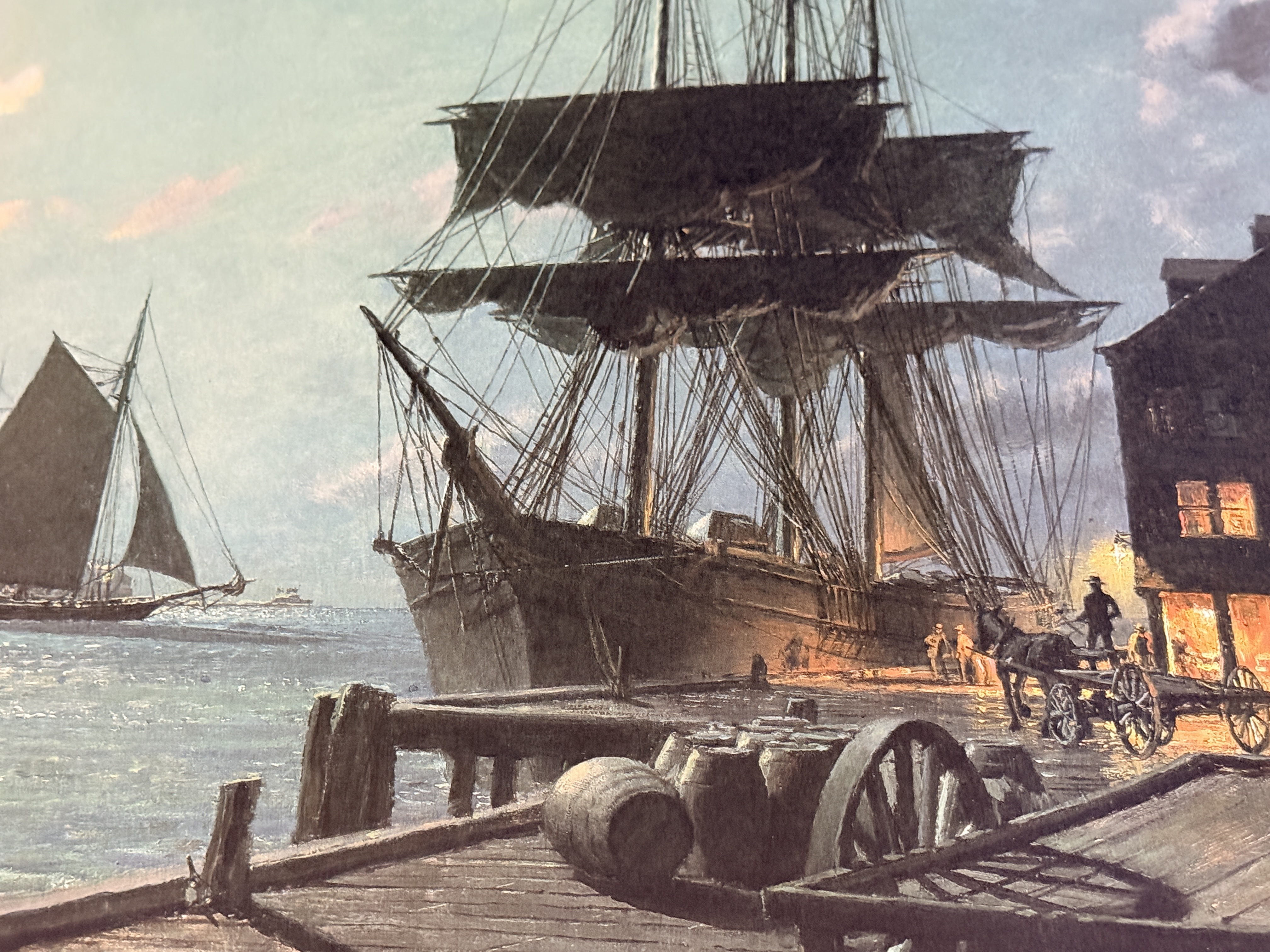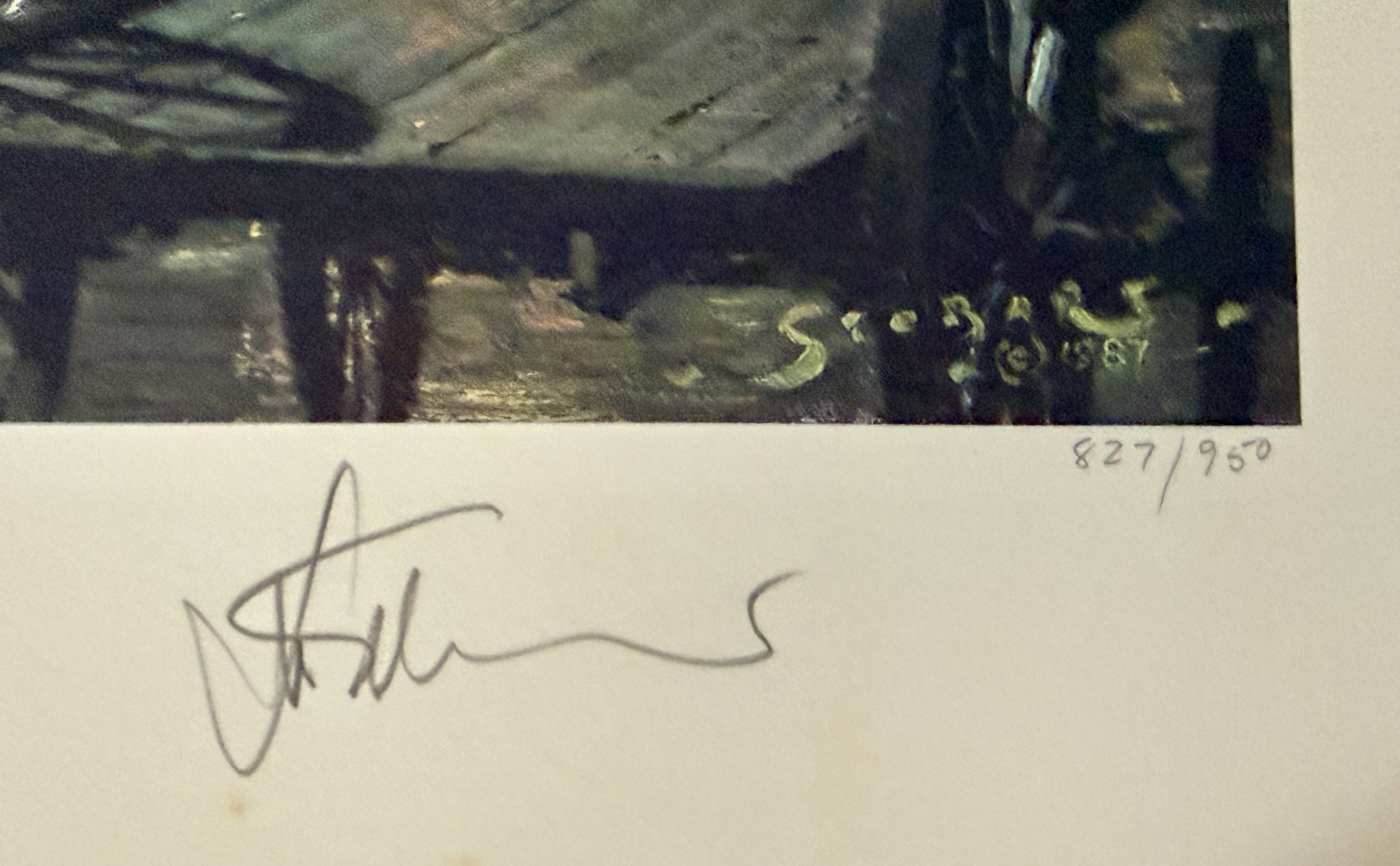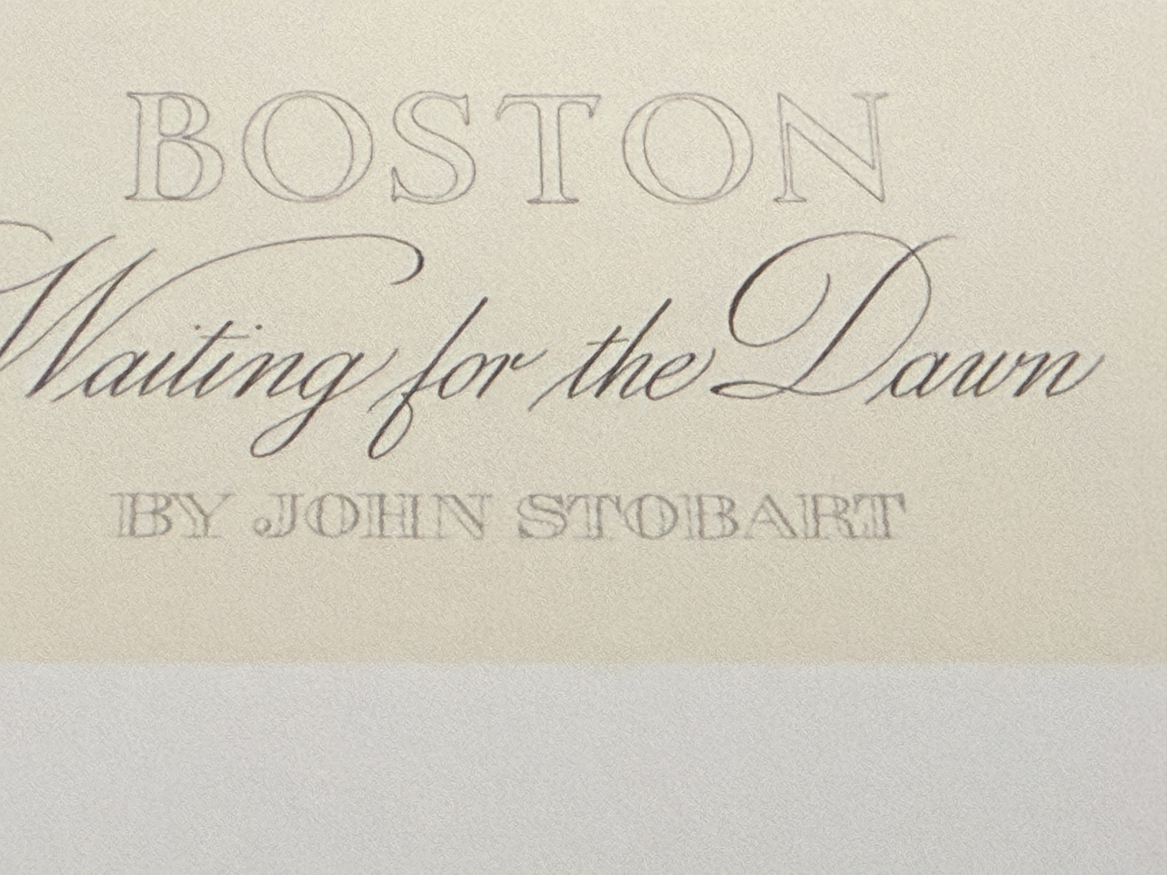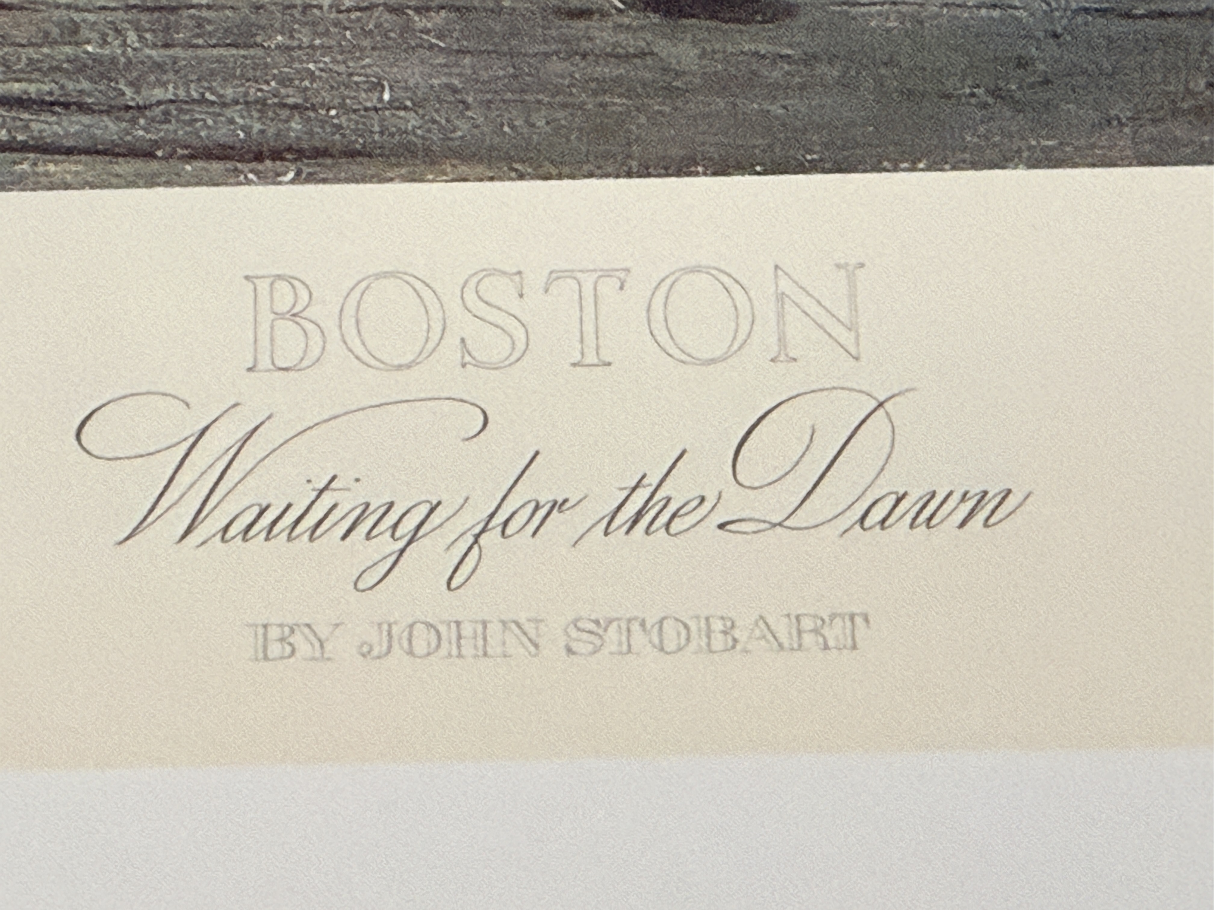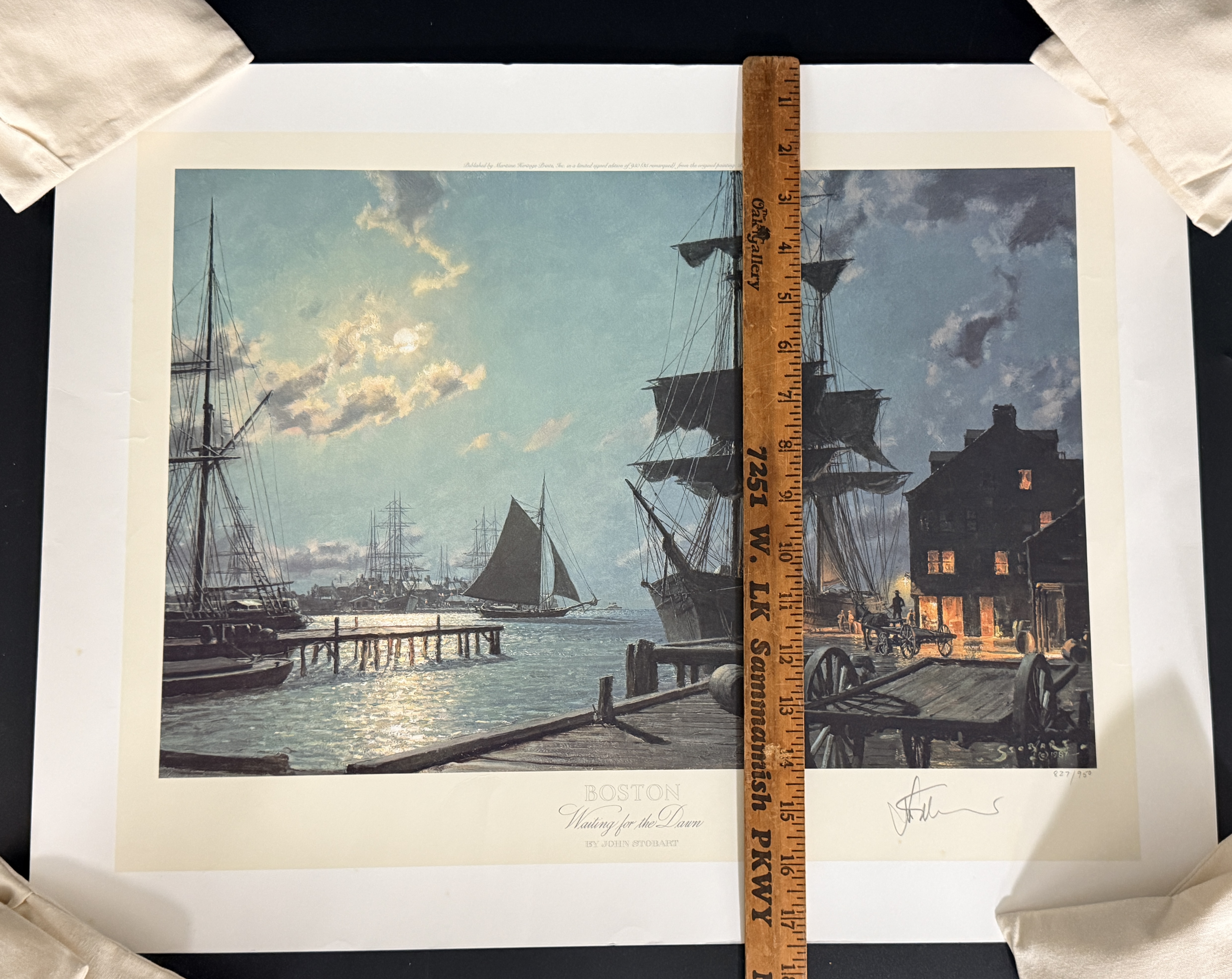 This limited edition maritime lithograph is titled Boston Waiting for the Dawn by artist John Stobart. The work depicts a historical harbor scene at dawn featuring square-rigged sailing vessels, a horse-drawn wagon, and cargo barrels on a wooden pier. It is a signed and numbered print from an edition of 950, with the number 827/950 inscribed in pencil in the lower right margin. The artist signature is hand-signed in pencil adjacent to the edition number. The image also contains a printed signature and date of 1987 within the plate. Published by Maritime Heritage Prints, Inc., the print includes a copyright date of 1988 and printed text along the top edge detailing its provenance from the original 1987 painting. The piece is unframed on heavy paper stock.