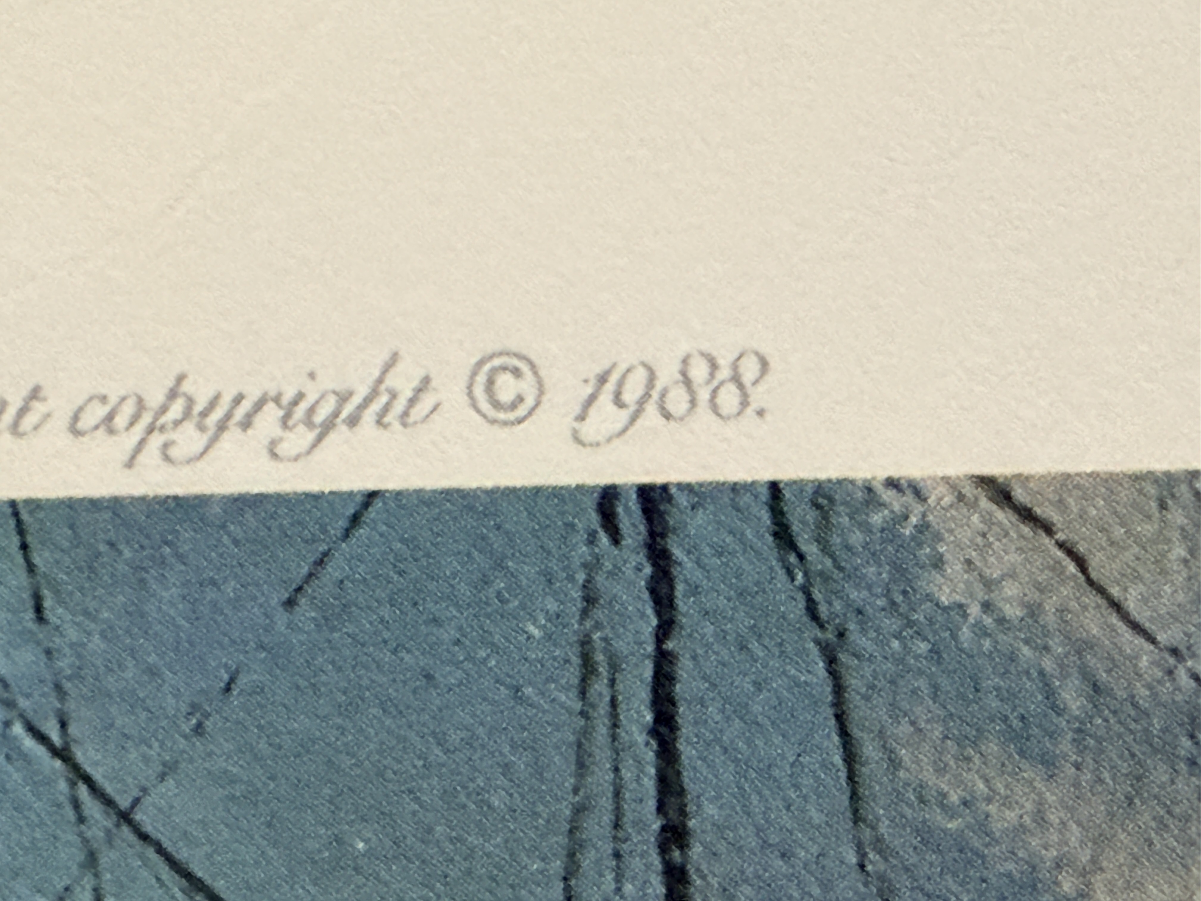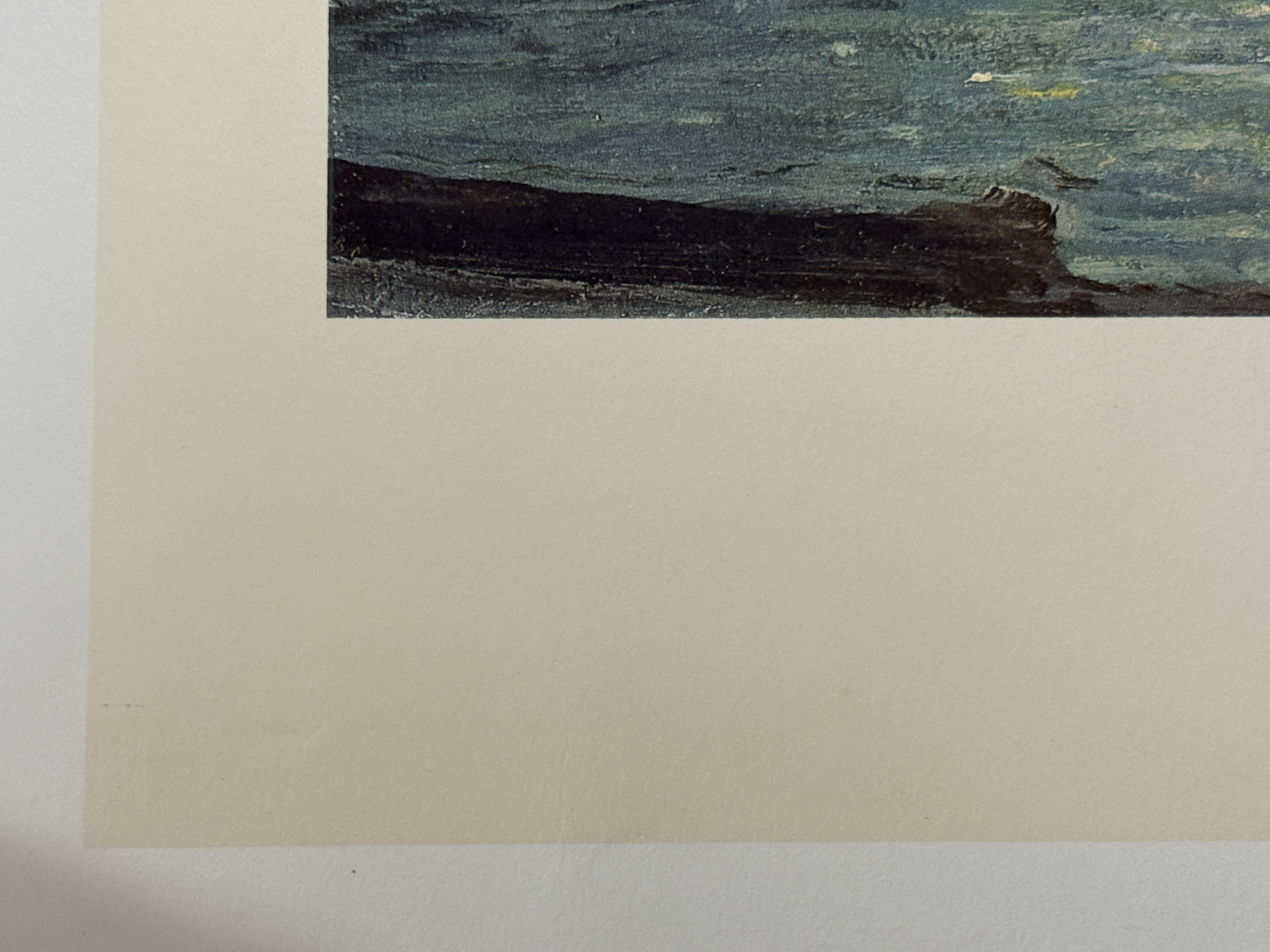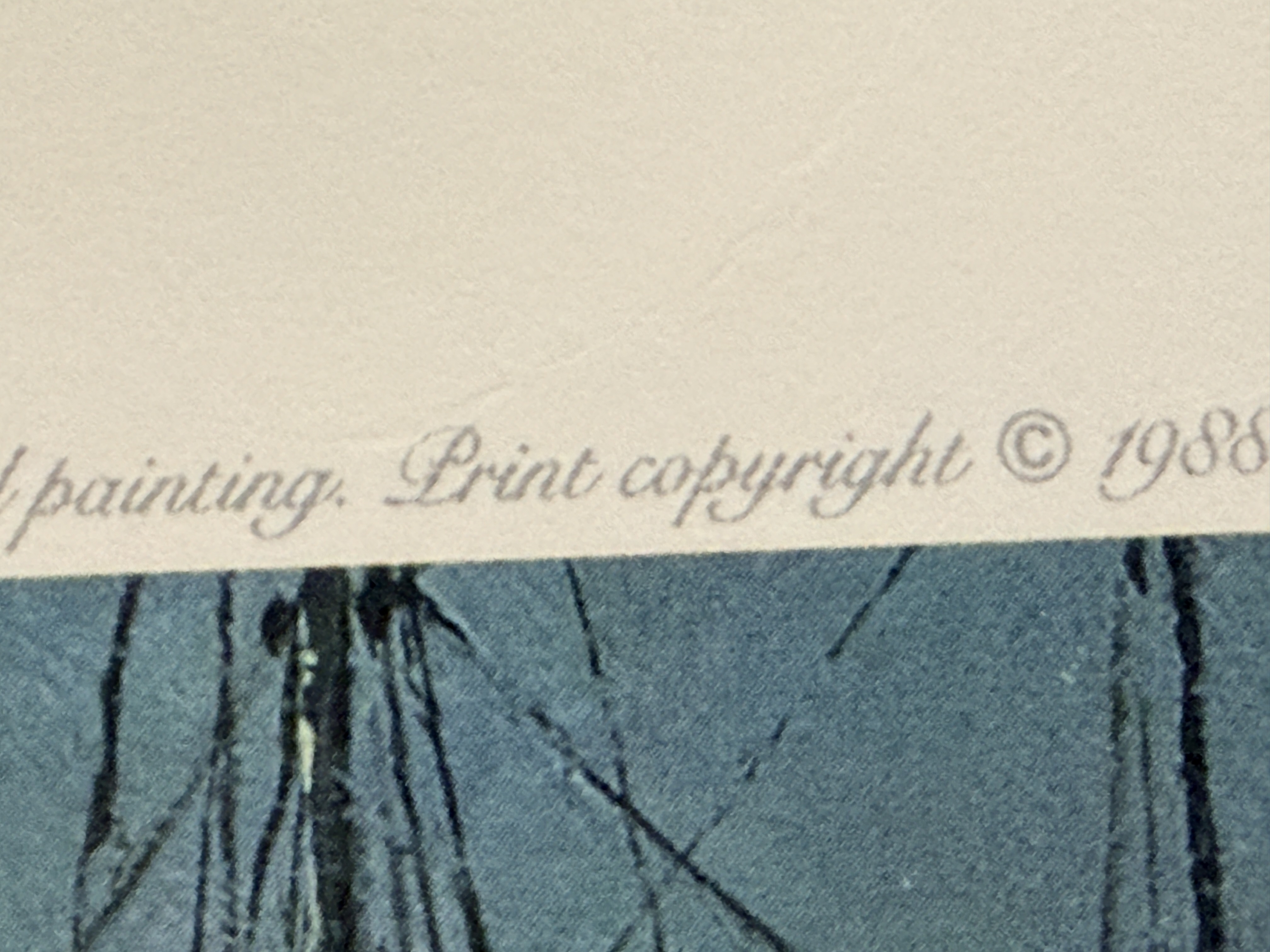 The print is in overall good condition. There are minor instances of foxing and small brownish stains visible in the white margins, primarily near the bottom edge. The paper shows light handling wear and minor rippling. The image area remains clear and well-preserved. Art is from a clean smoke free home.