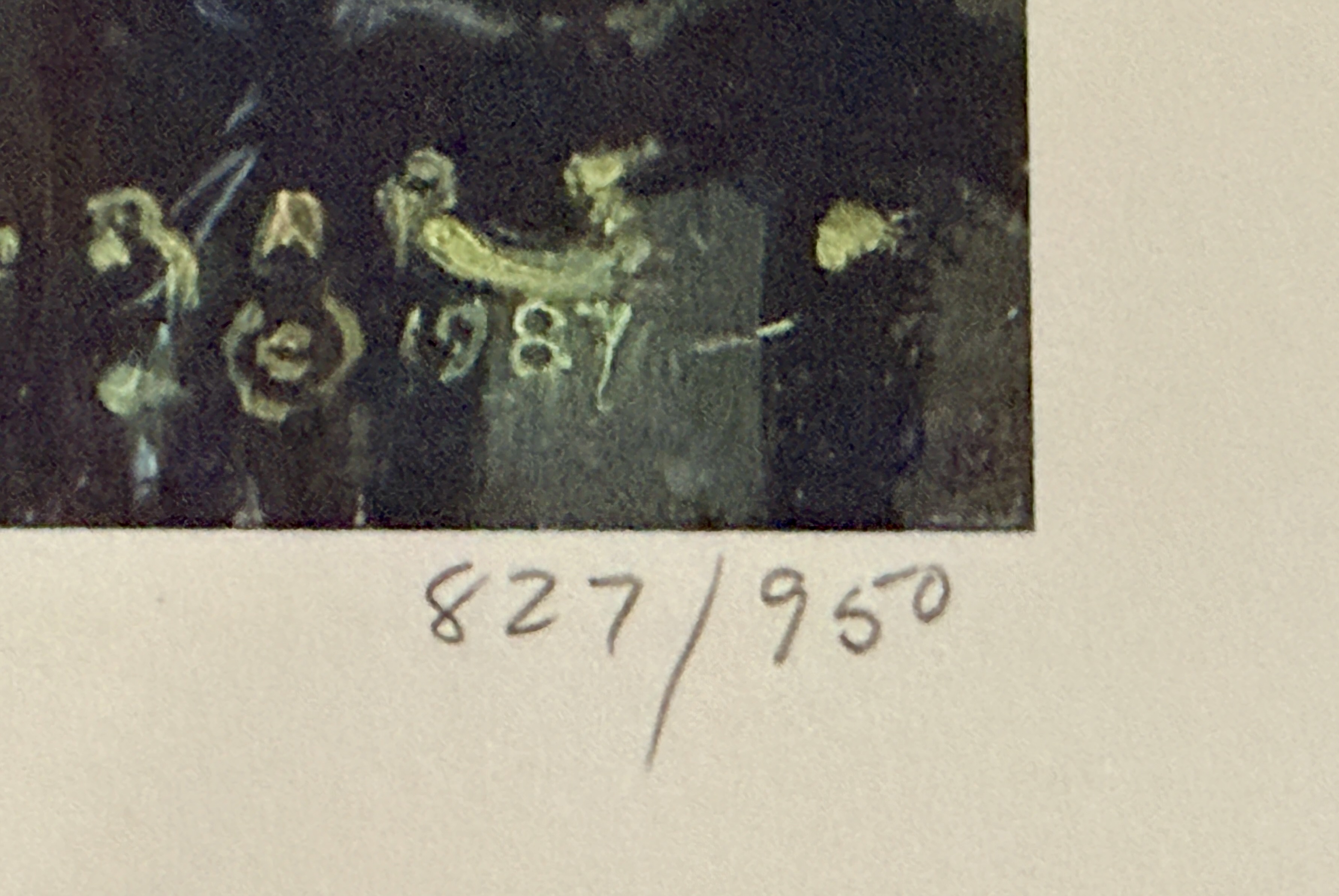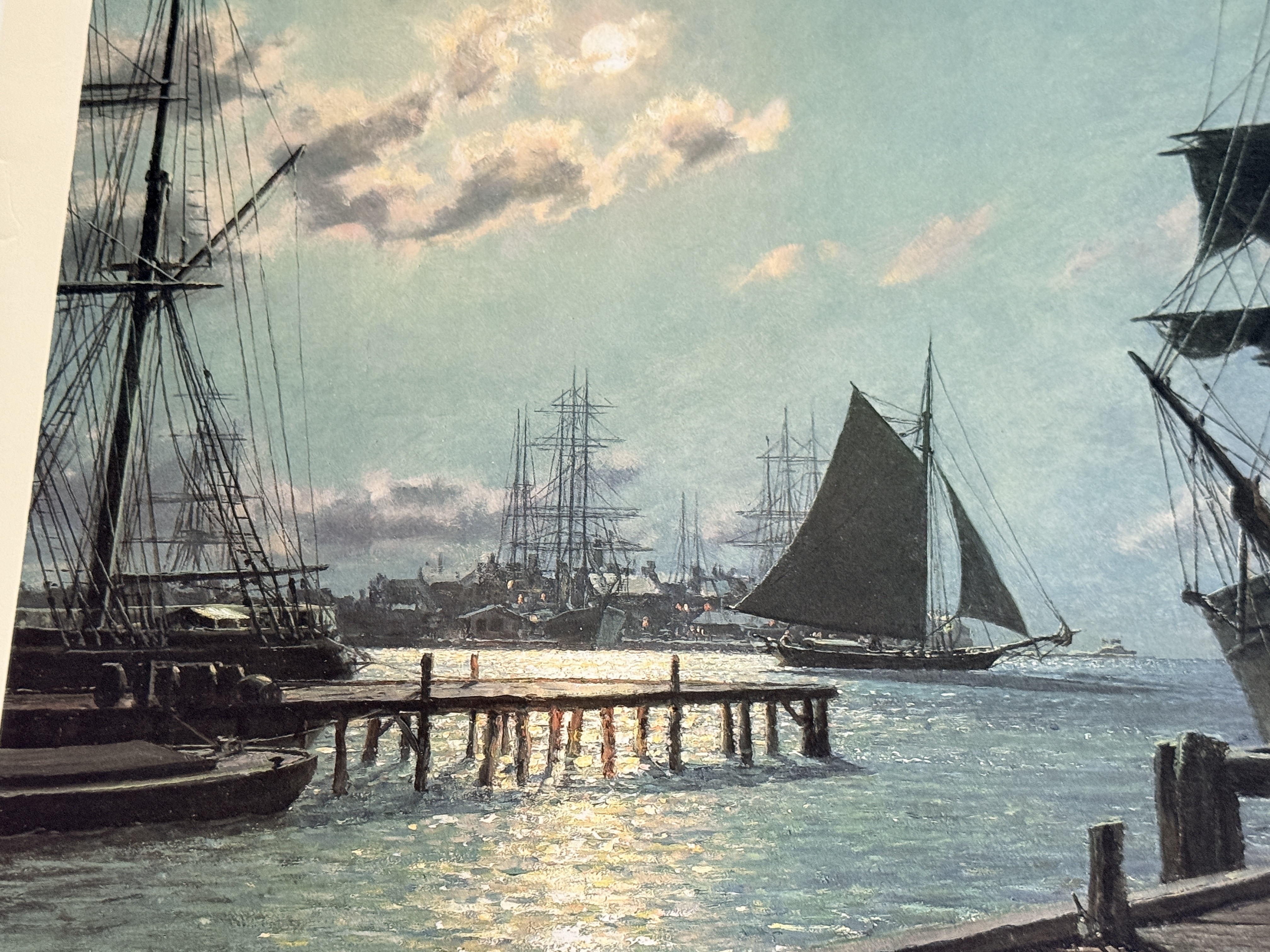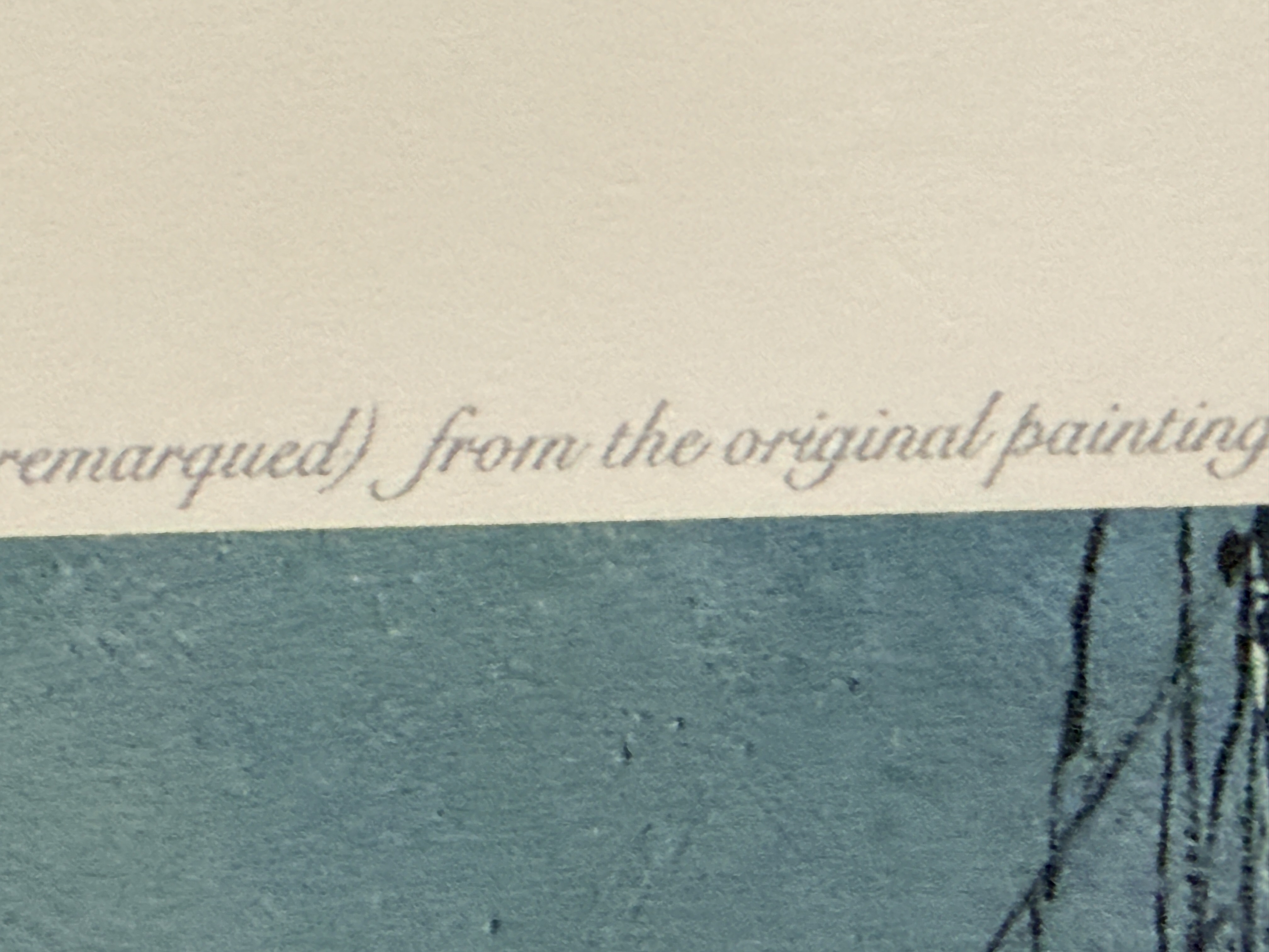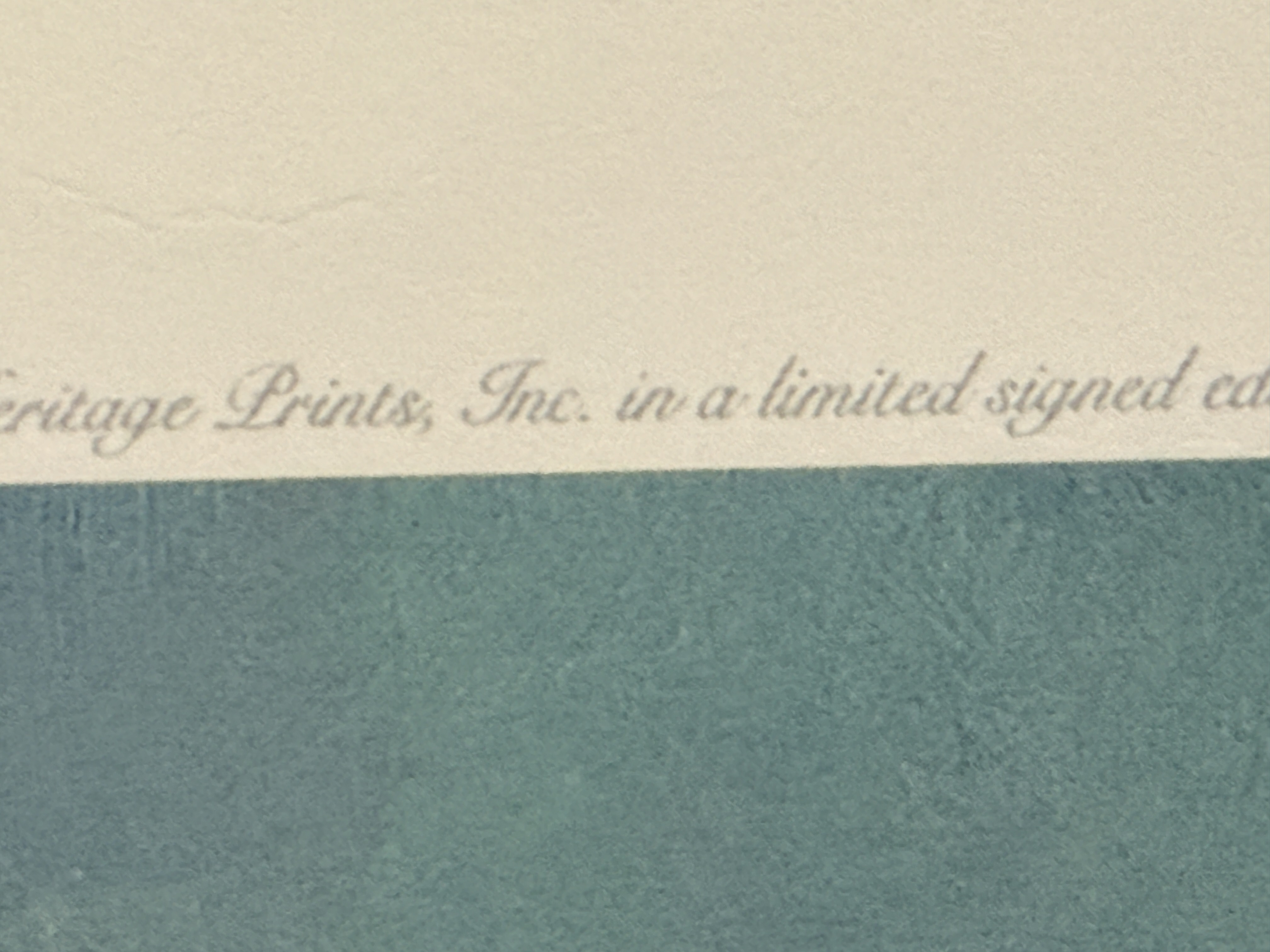The print is in overall good condition. There are minor instances of foxing and small brownish stains visible in the white margins, primarily near the bottom edge. The paper shows light handling wear and minor rippling. The image area remains clear and well-preserved. Art is from a clean smoke free home.