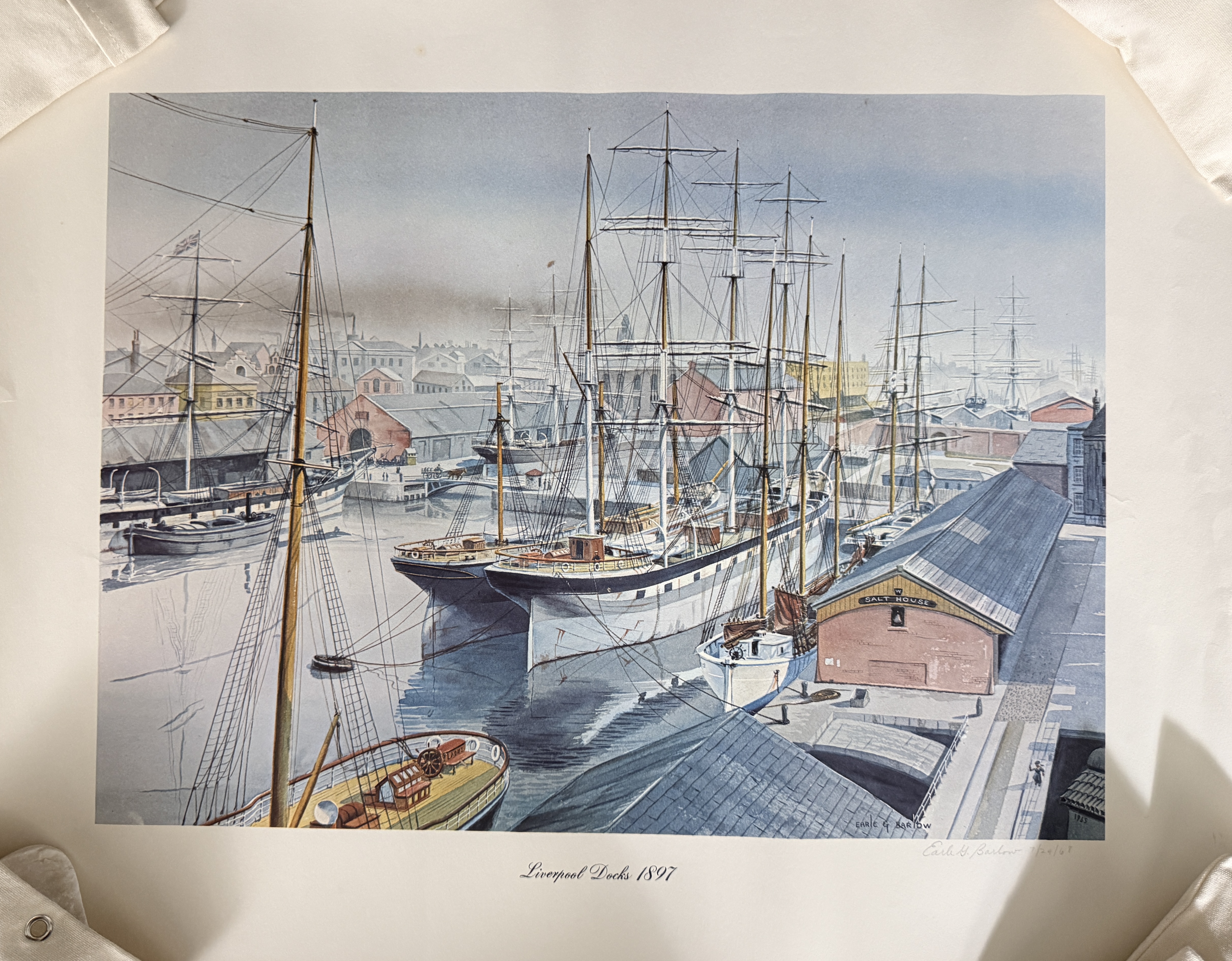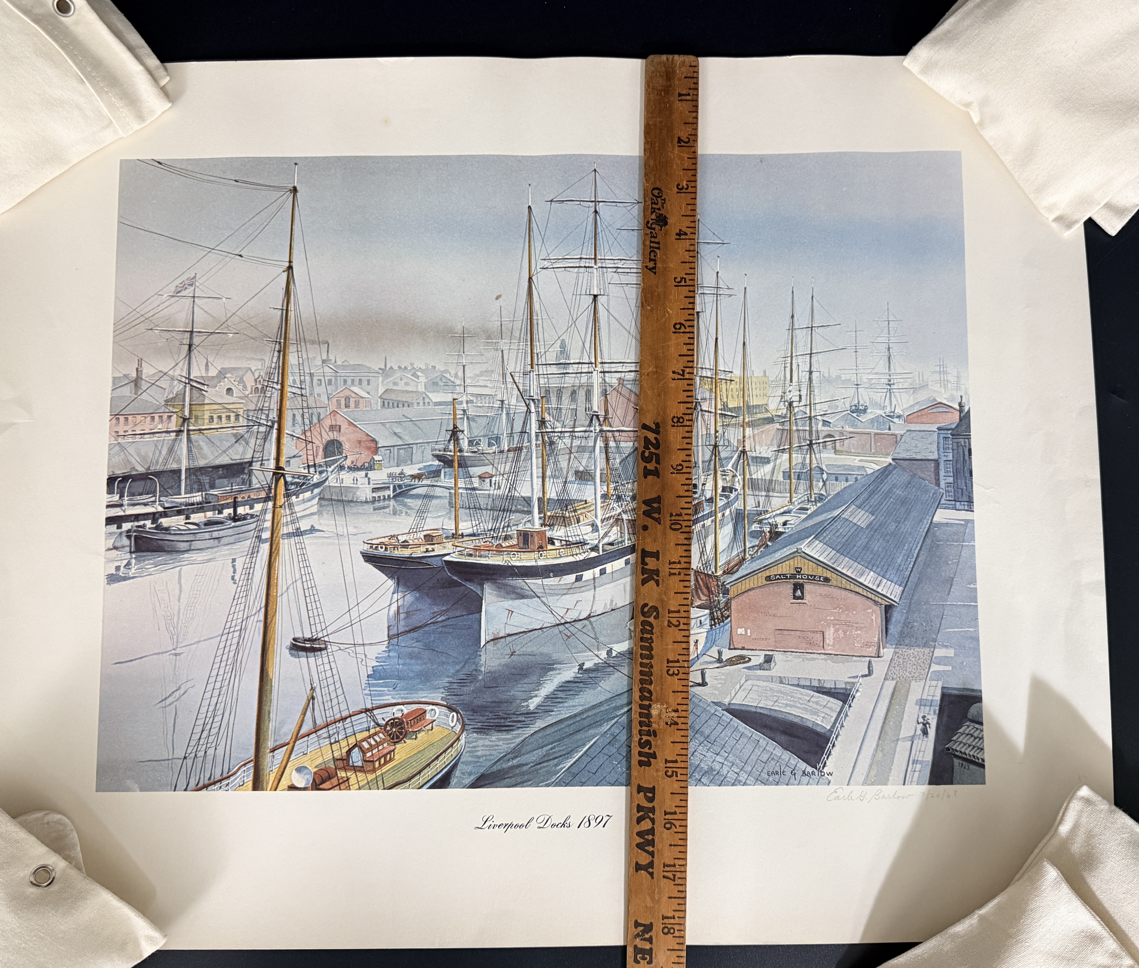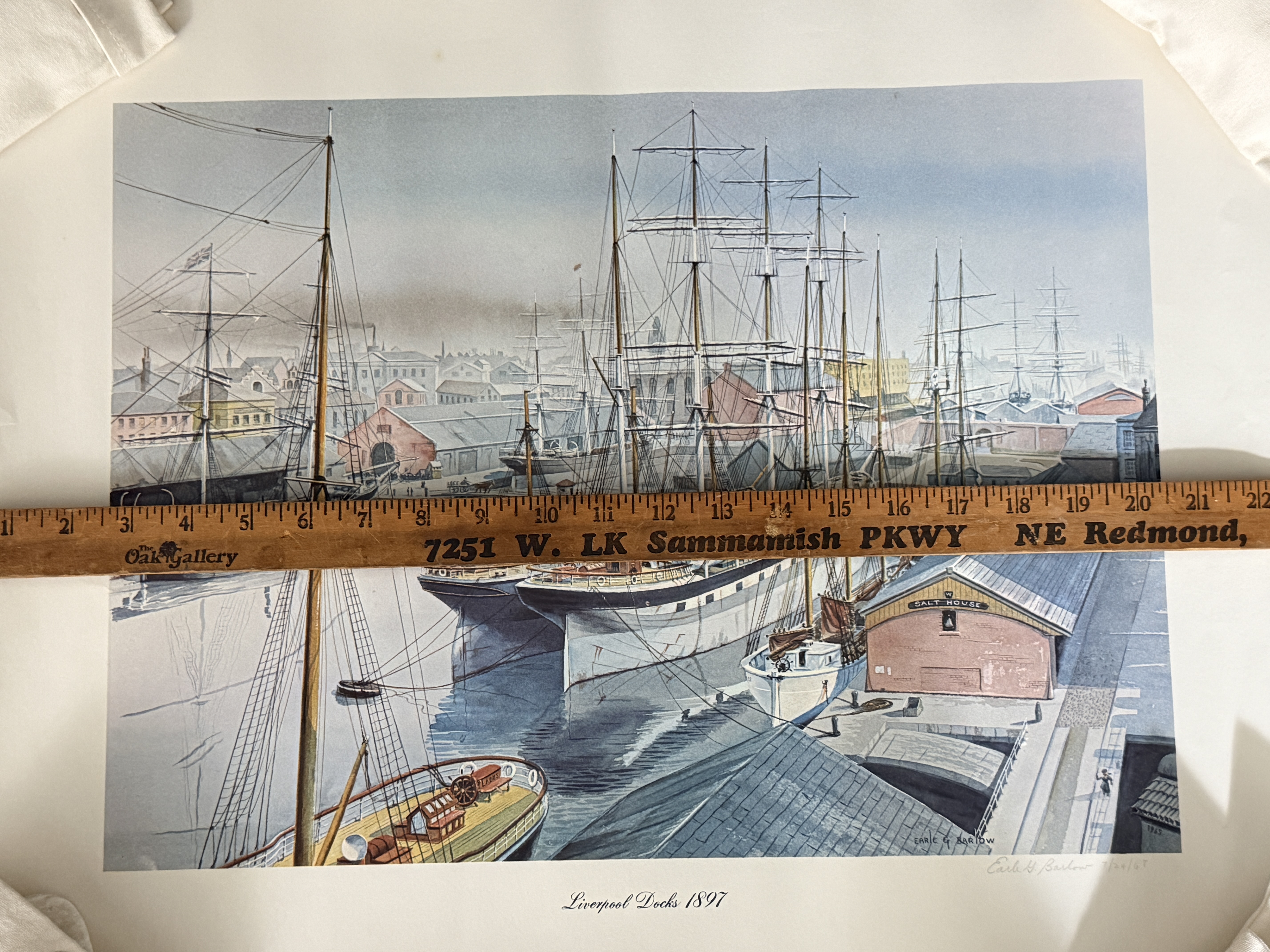 A maritime art print titled Liverpool Docks 1897, depicting a historic harbor scene featuring multiple large, masted sailing vessels and industrial dockside buildings. The scene includes a structure labeled Salt House and various figures along the wharf. This work is a reproduction of an original 1965 painting by Earle G. Barlow, with the artist name and the date 1965 printed in the lower right corner of the image. This specific print is hand-signed in pencil by the artist in the lower right margin and dated 7/24/68. The title is printed in the center of the lower margin.