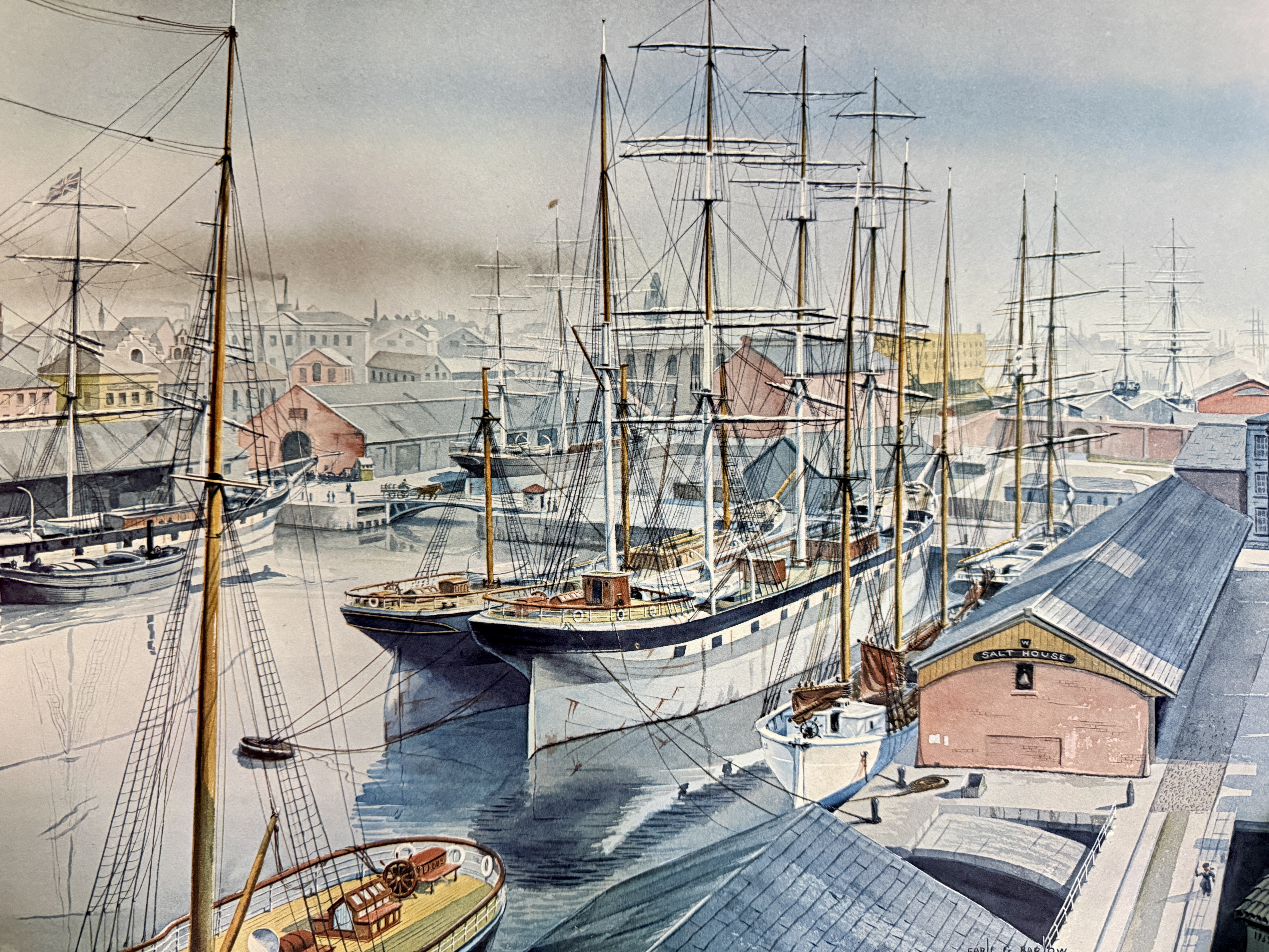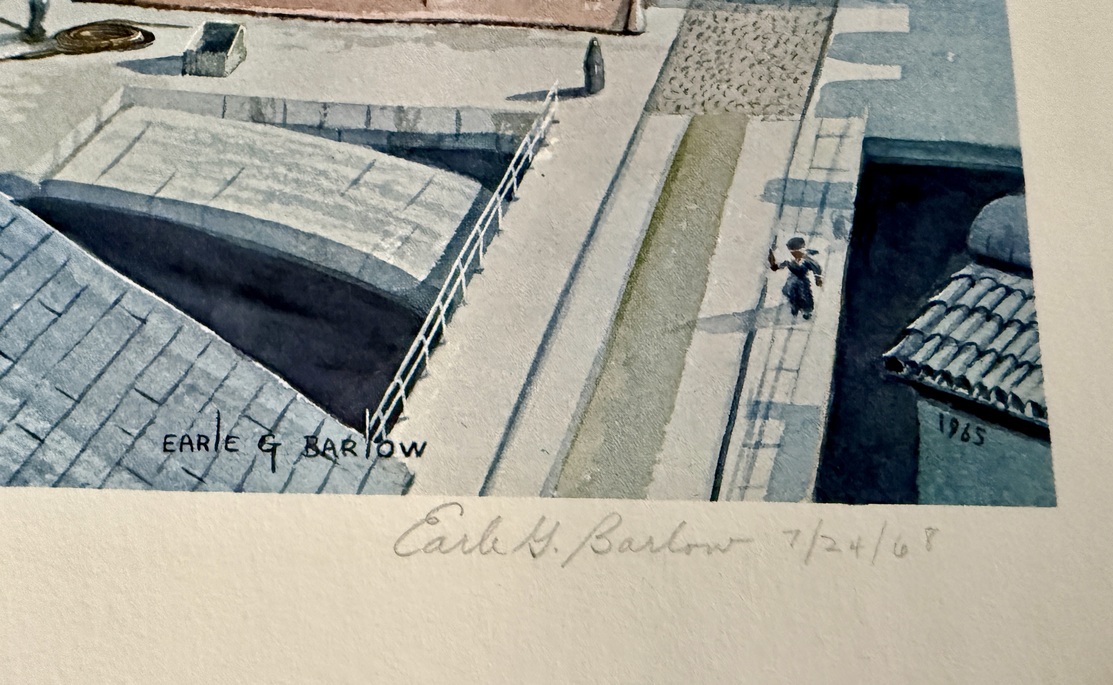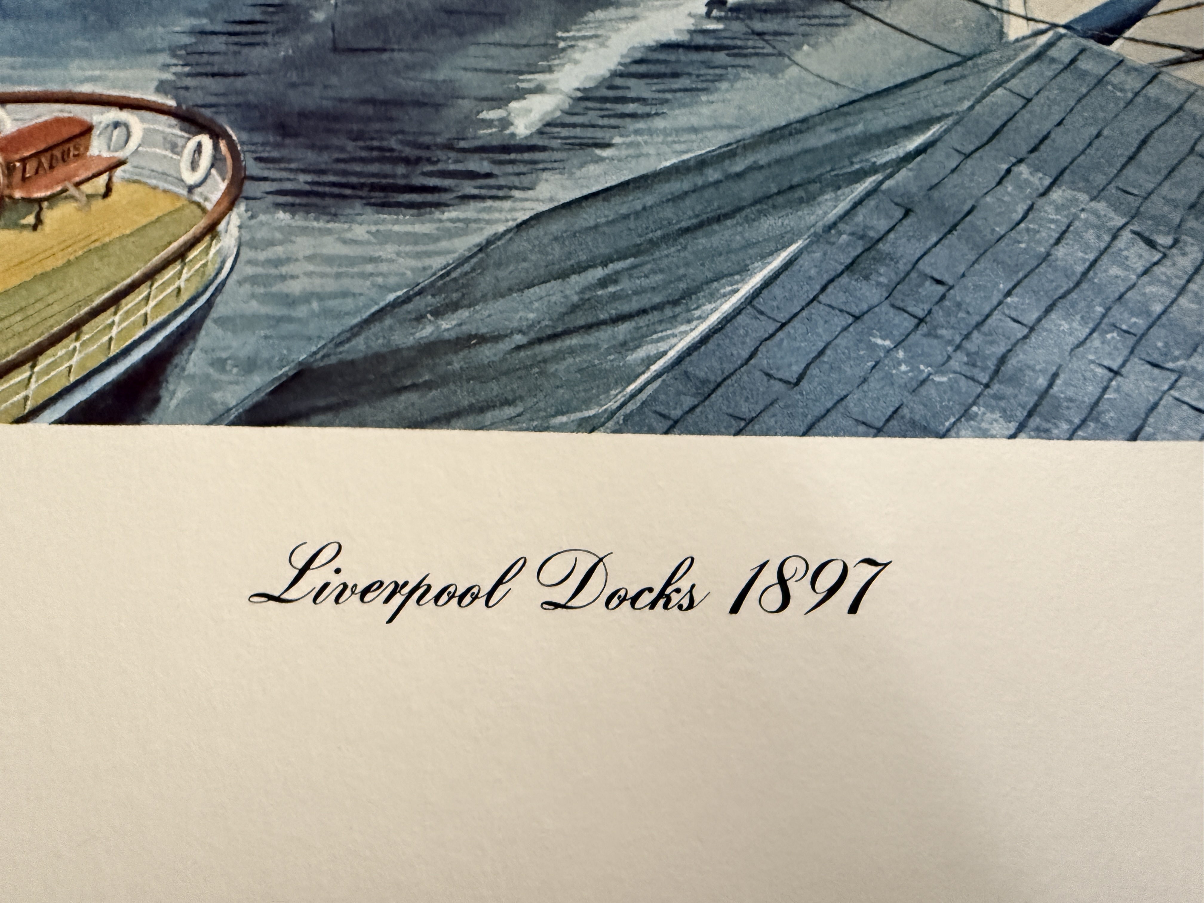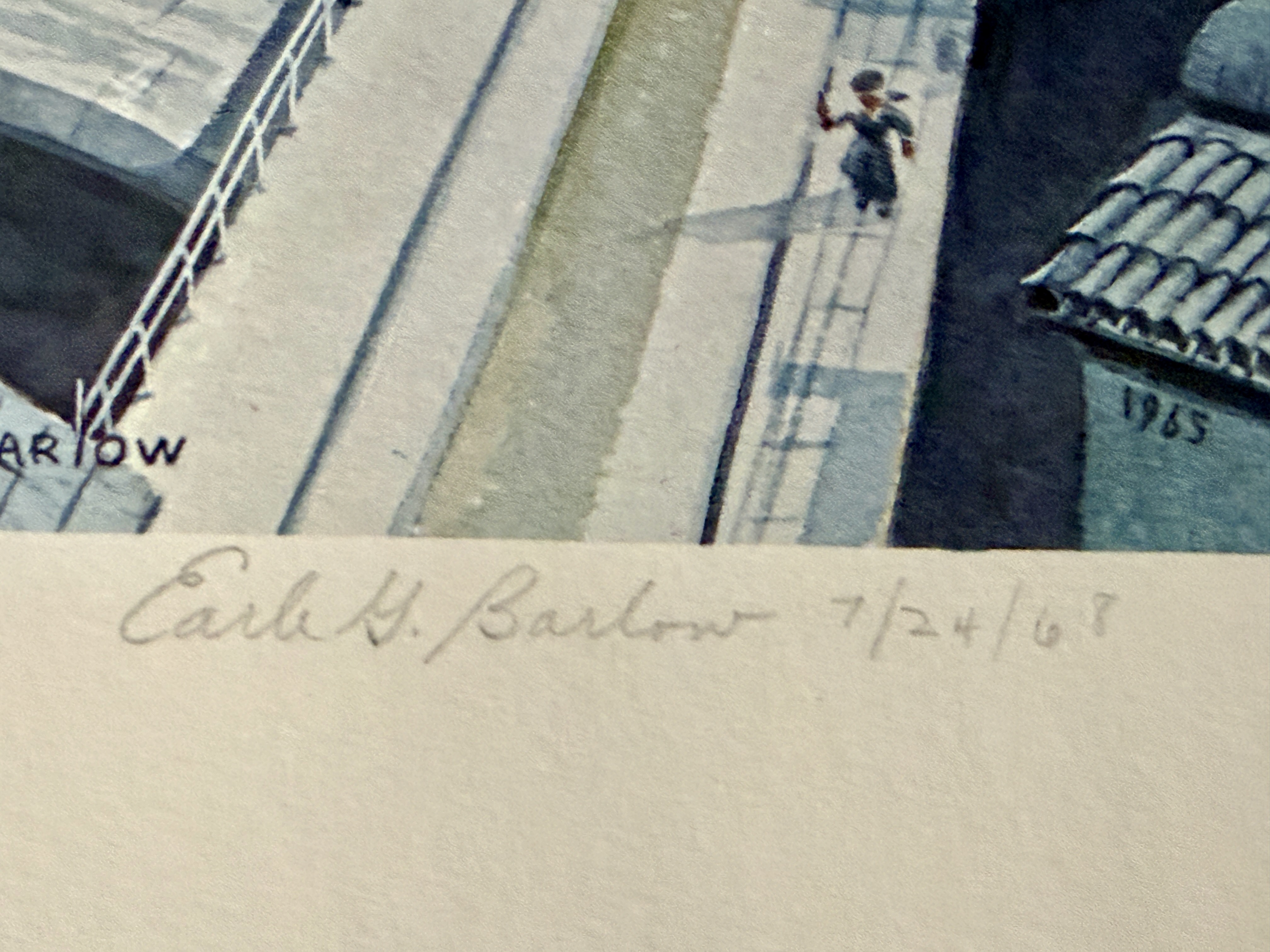 A maritime art print titled Liverpool Docks 1897, depicting a historic harbor scene featuring multiple large, masted sailing vessels and industrial dockside buildings. The scene includes a structure labeled Salt House and various figures along the wharf. This work is a reproduction of an original 1965 painting by Earle G. Barlow, with the artist name and the date 1965 printed in the lower right corner of the image. This specific print is hand-signed in pencil by the artist in the lower right margin and dated 7/24/68. The title is printed in the center of the lower margin.