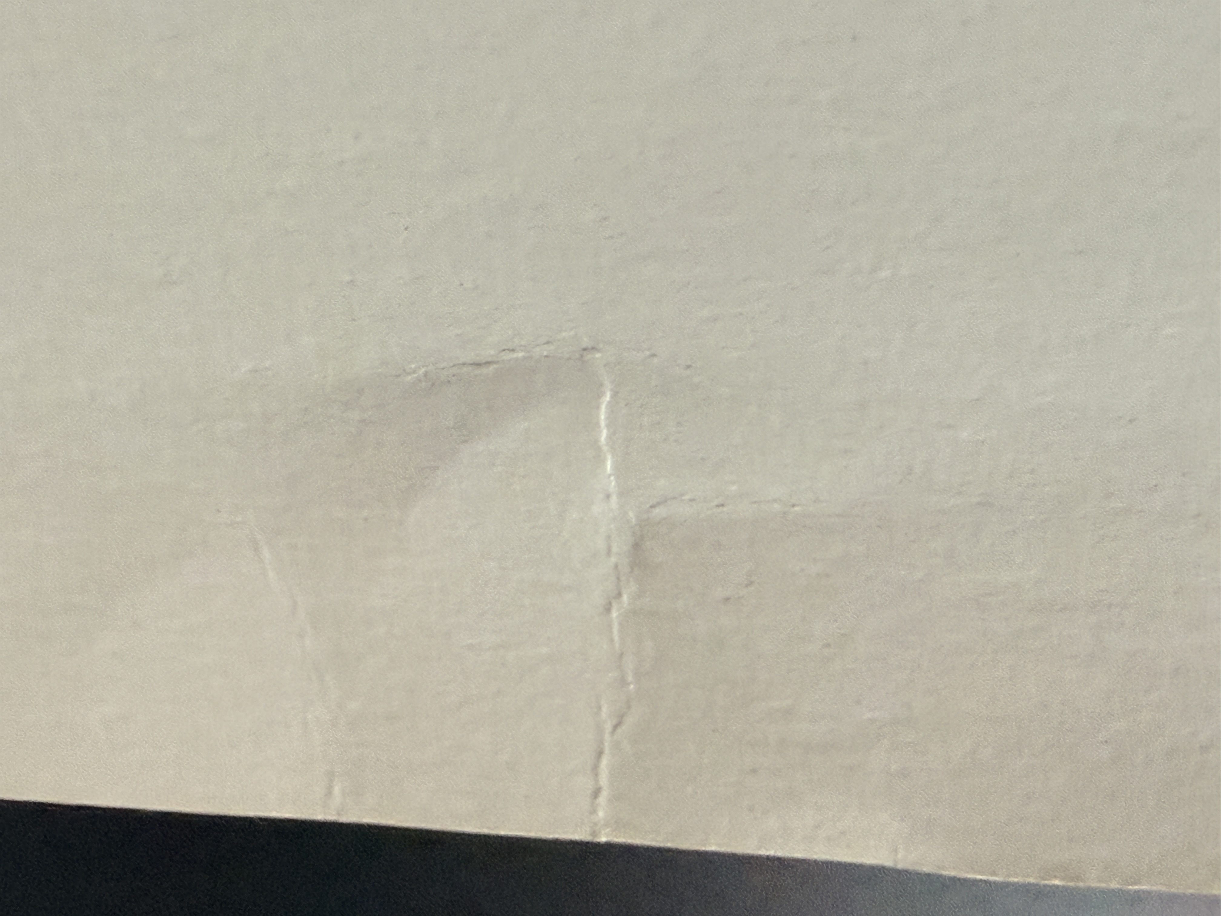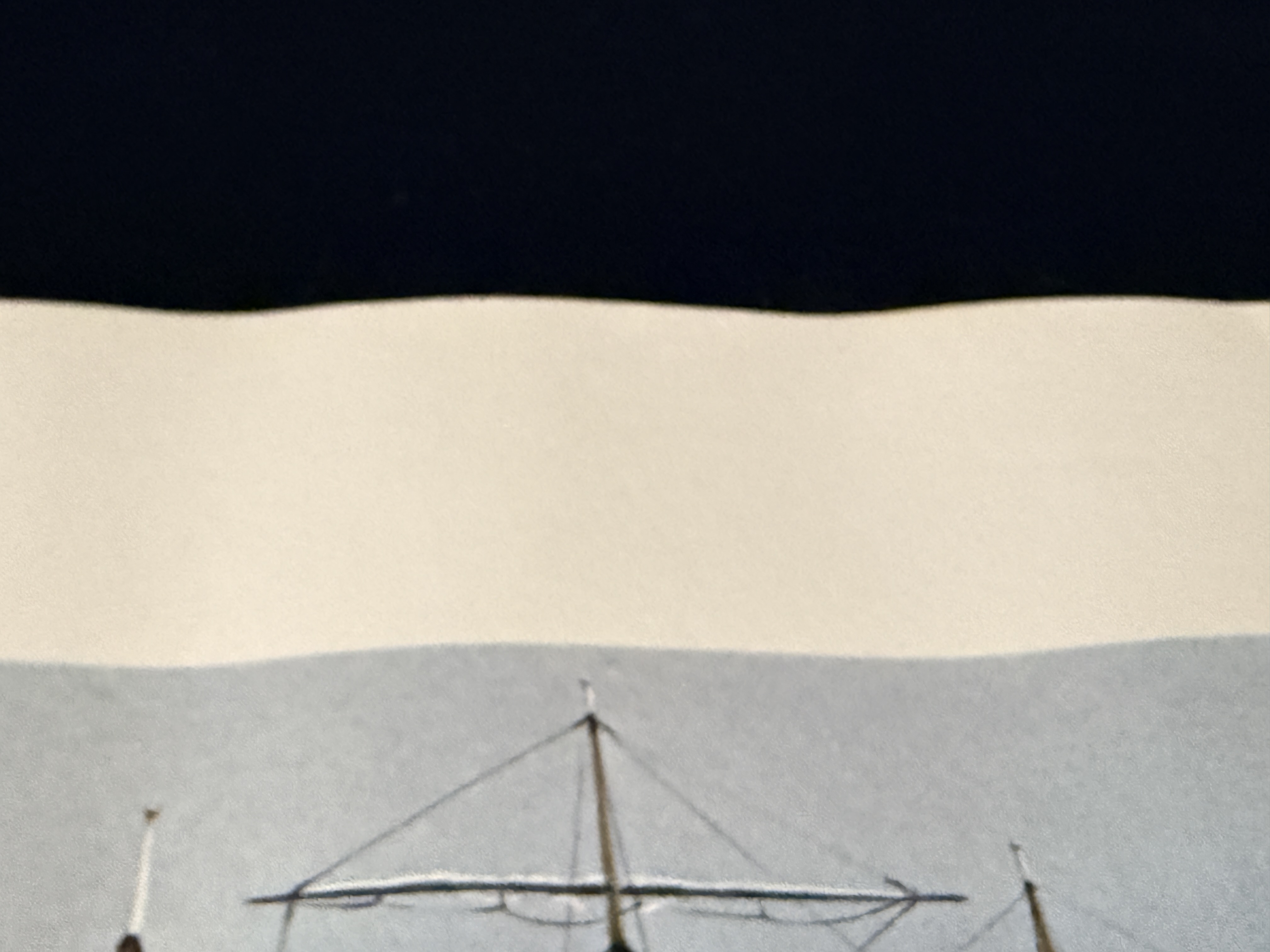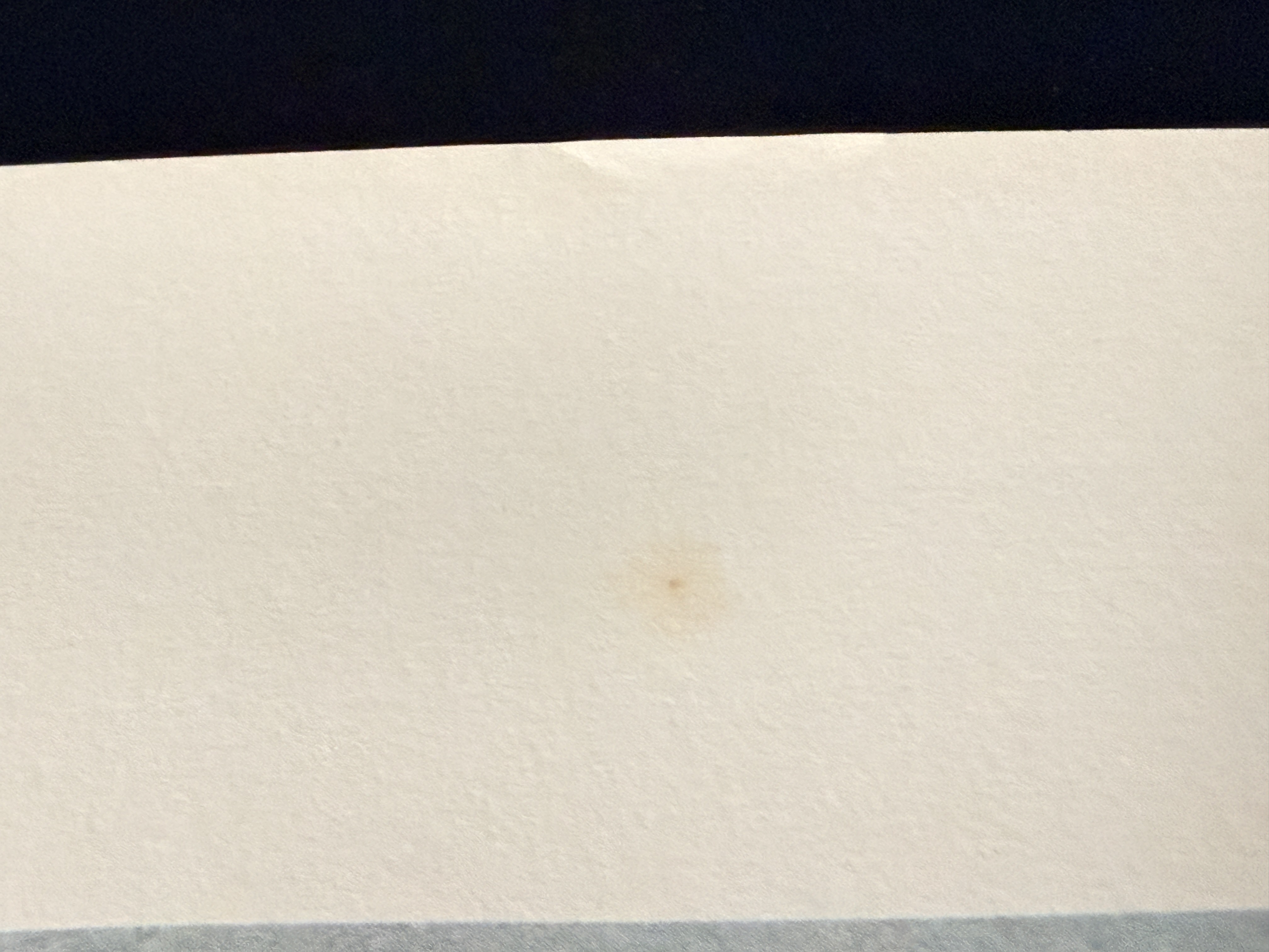 Visible condition details include a small foxing spot in the upper margin and minor surface creasing or indentations to the paper. Art is from a clean smoke free home.