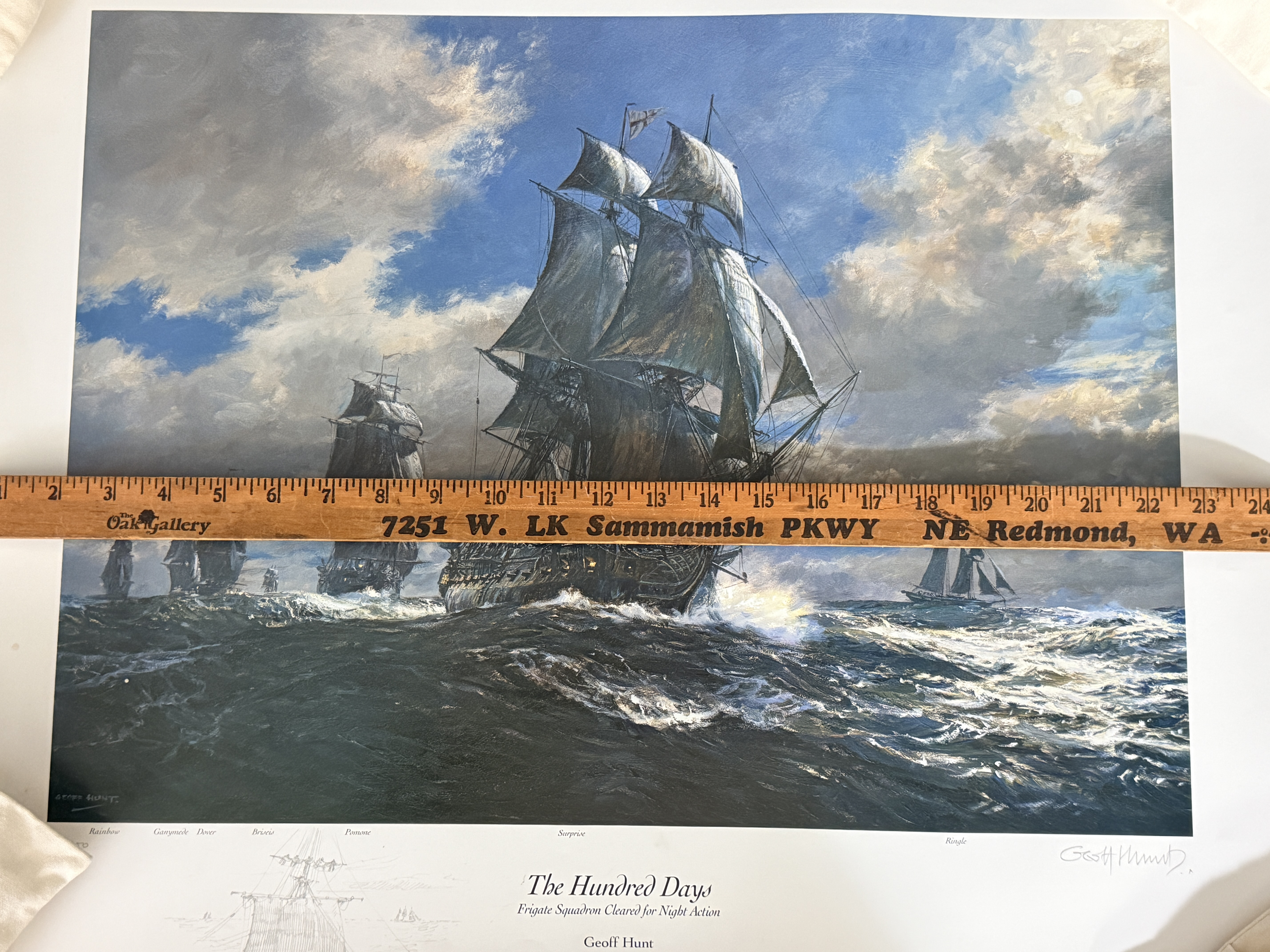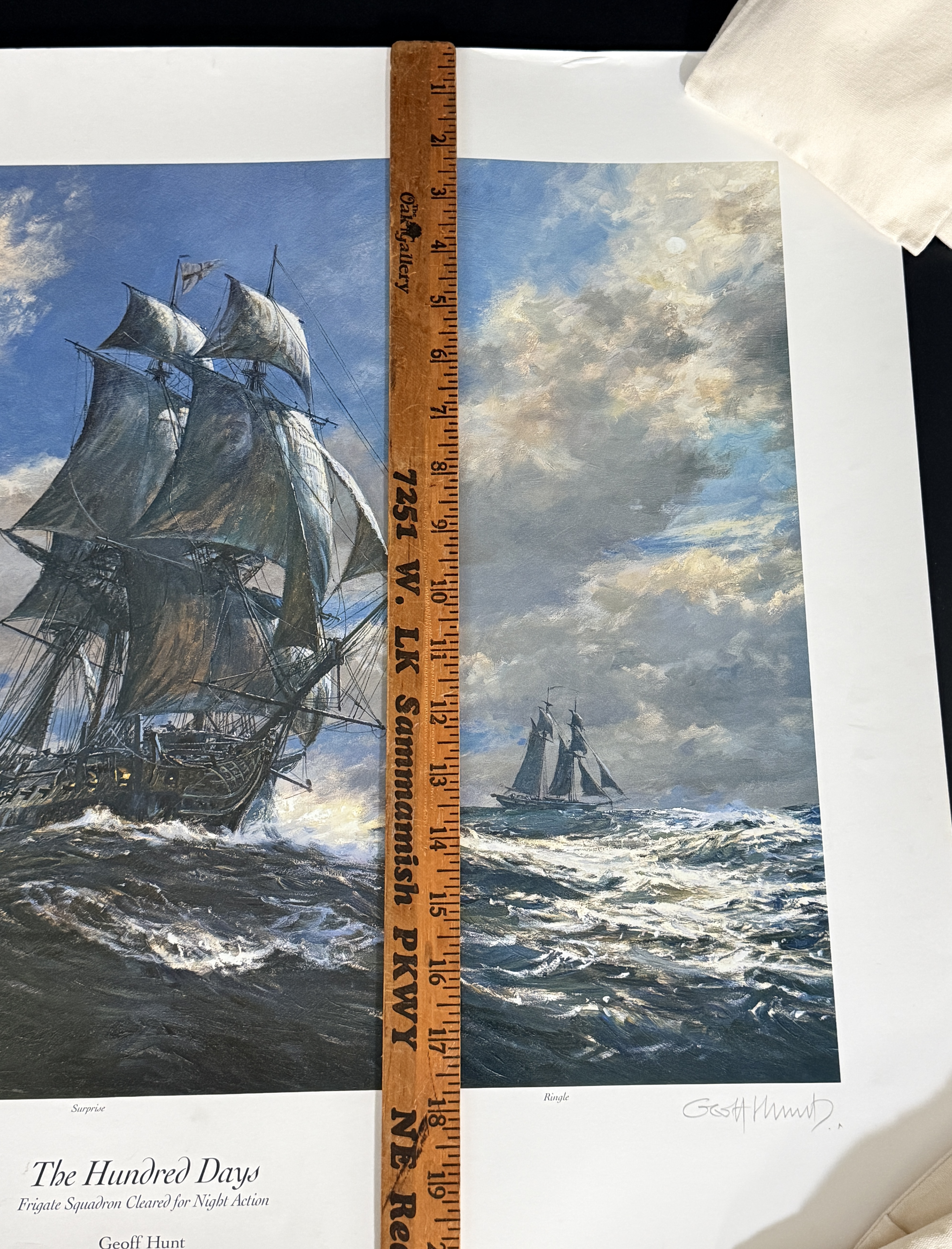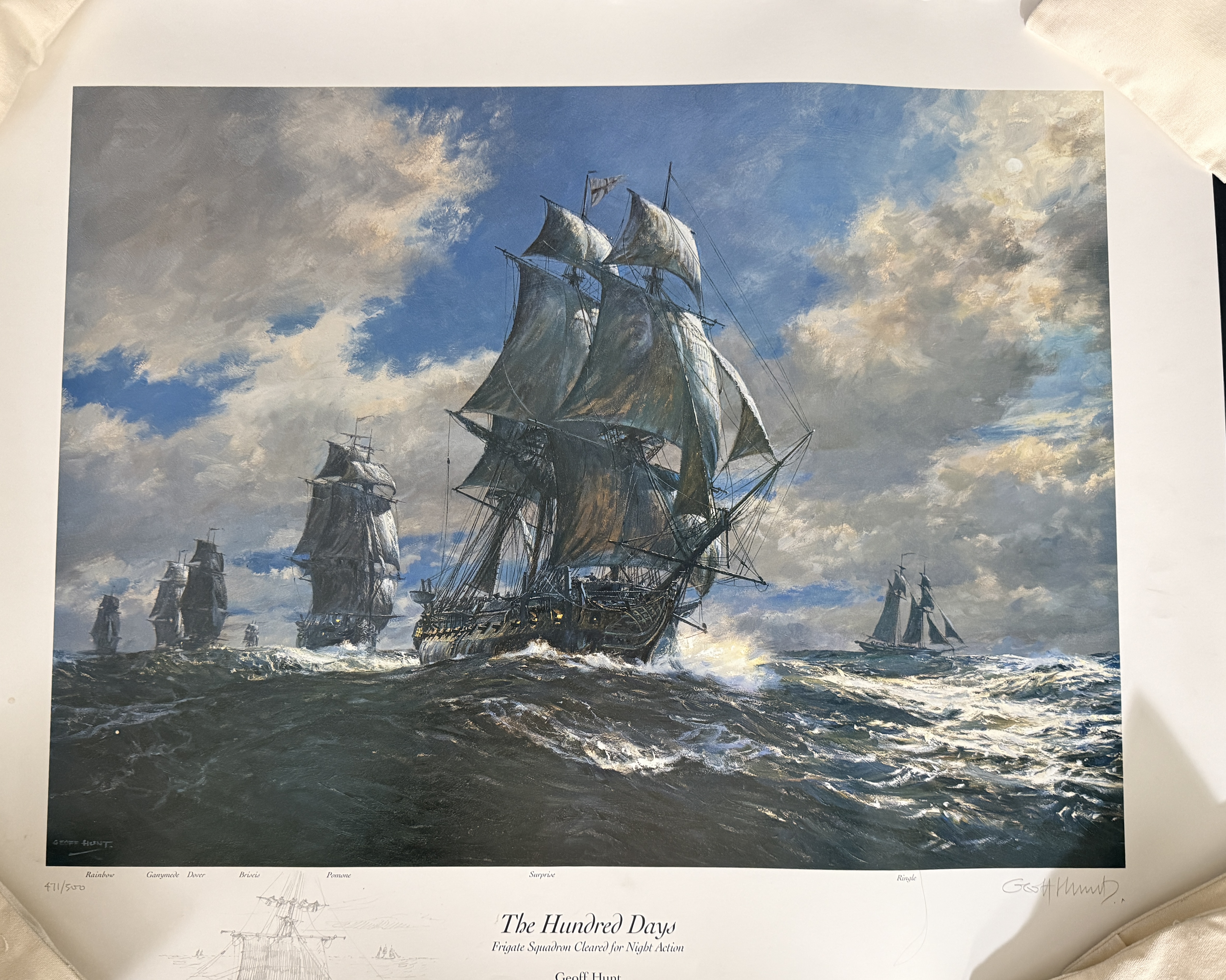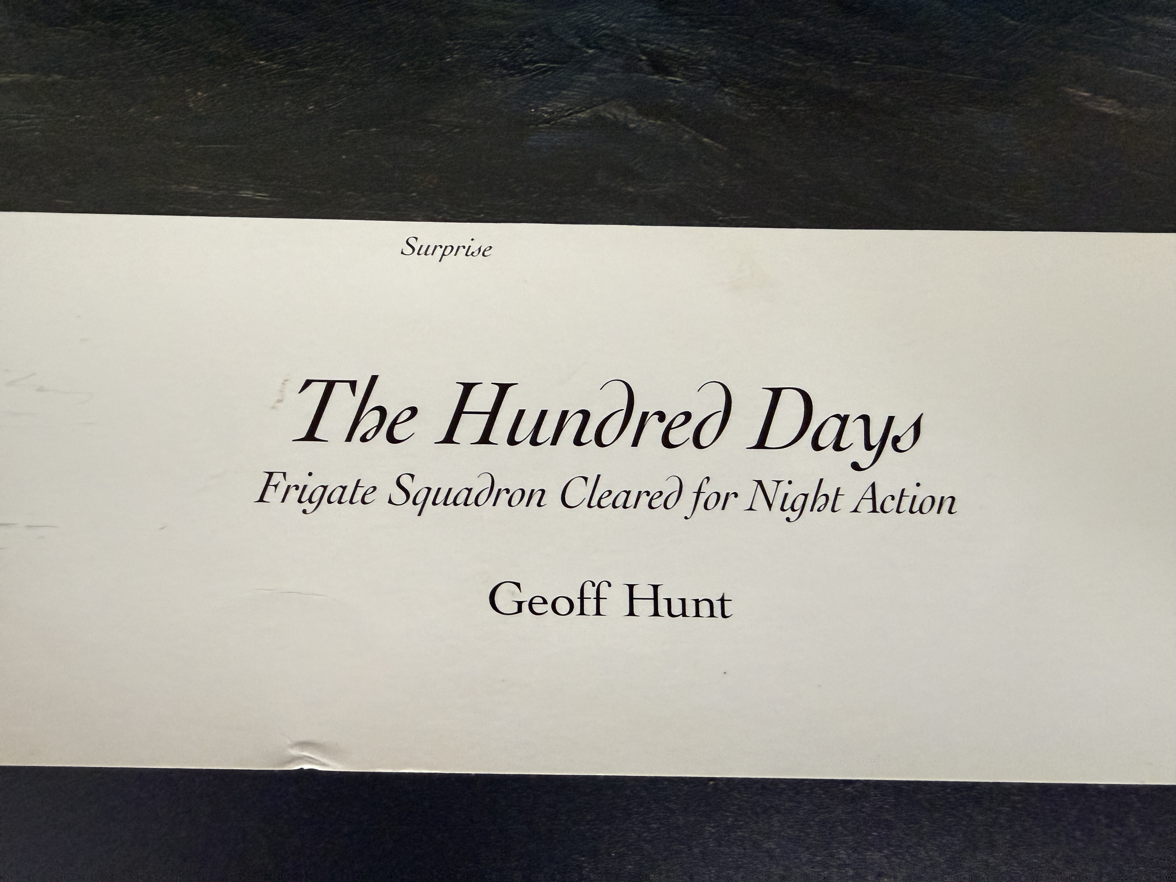 A limited edition maritime art print by Geoff Hunt titled The Hundred Days: Frigate Squadron Cleared for Night Action. The work depicts a collection of sailing frigates including the Surprise, Rainbow, Pomone, Ganymede, Dover, Briseis, and Ringle navigating heavy seas. The piece is printed on heavy paper and carries a 1998 copyright from Mystic Seaport. The print is hand-numbered 471/500 in the lower-left margin and features a pencil signature by the artist in the lower-right margin. A pencil remarque depicting a ship rigging is present in the bottom left margin. Printed ship identifications are visible along the lower edge of the image.