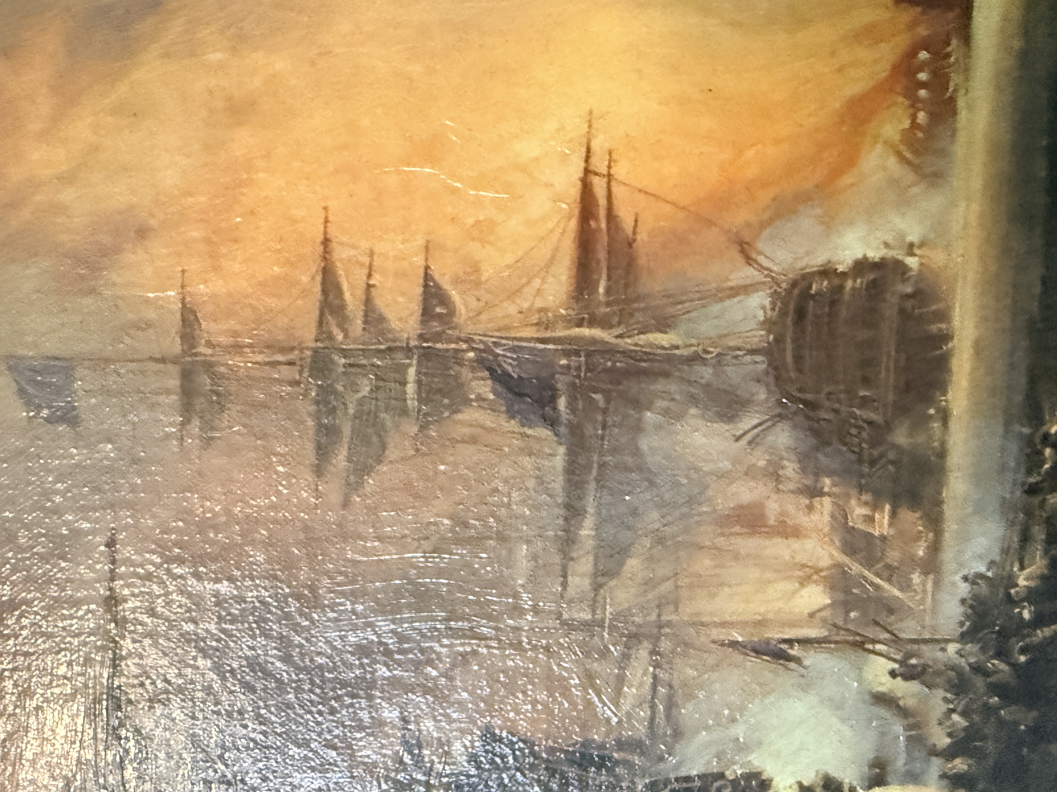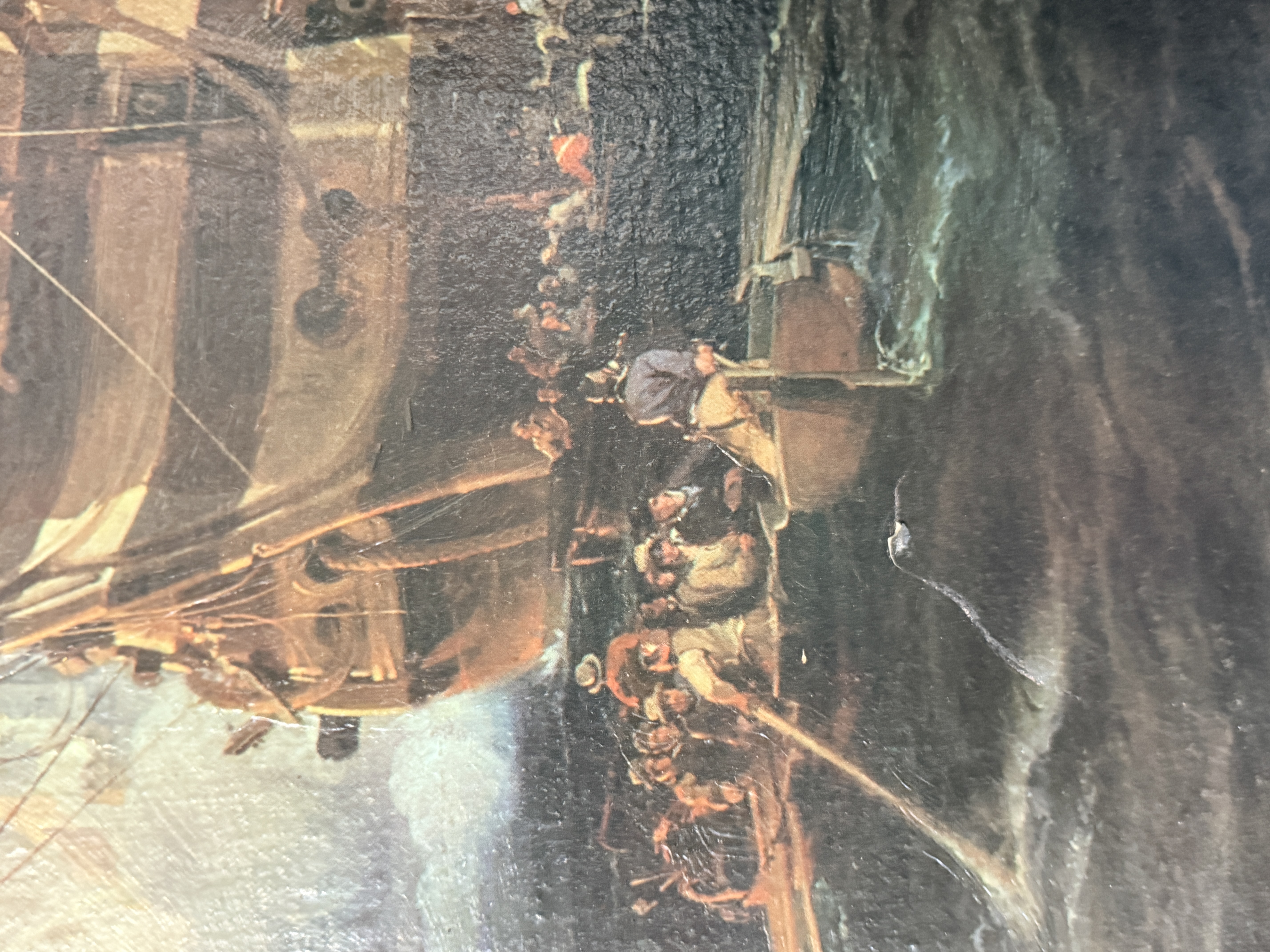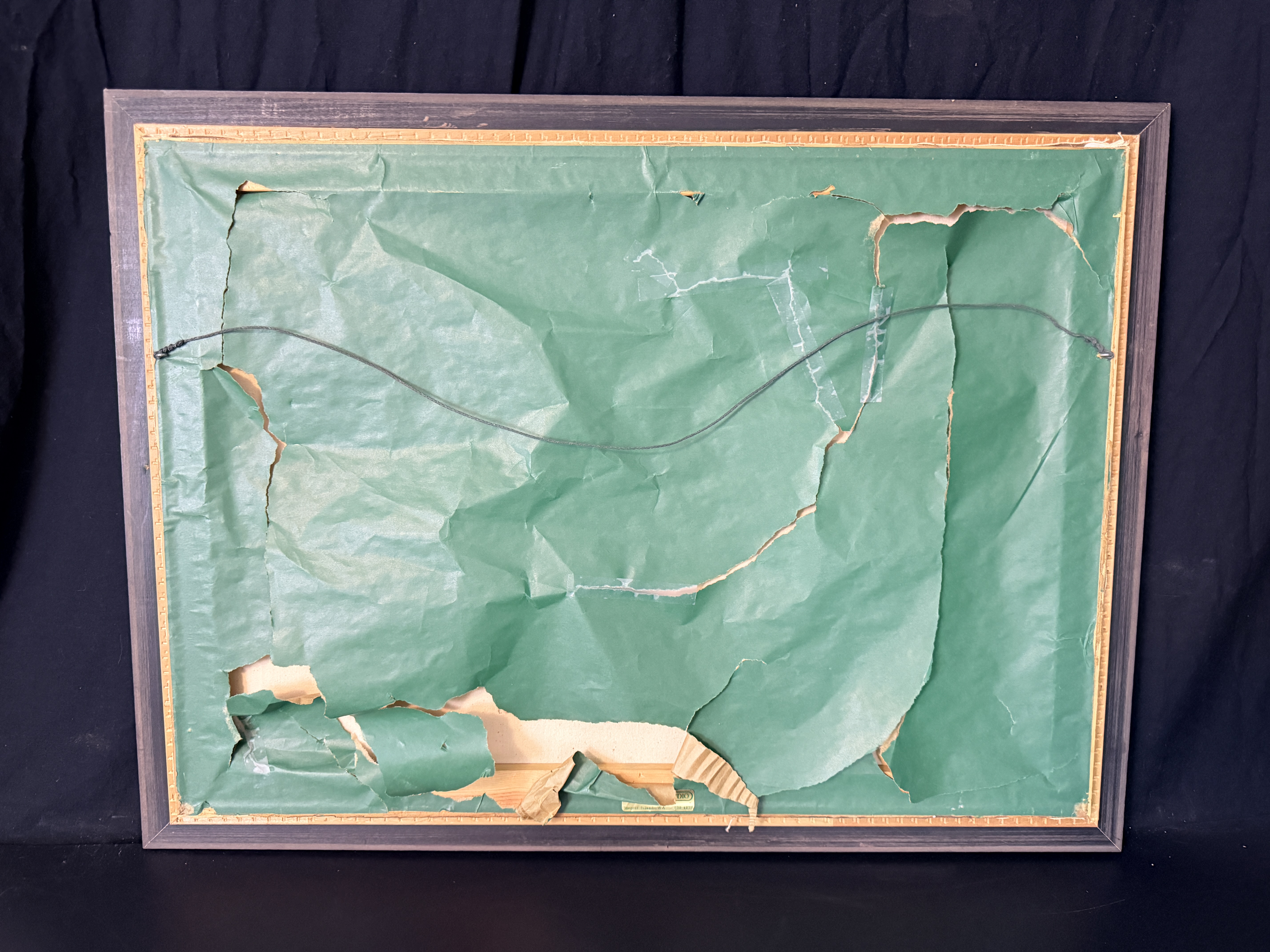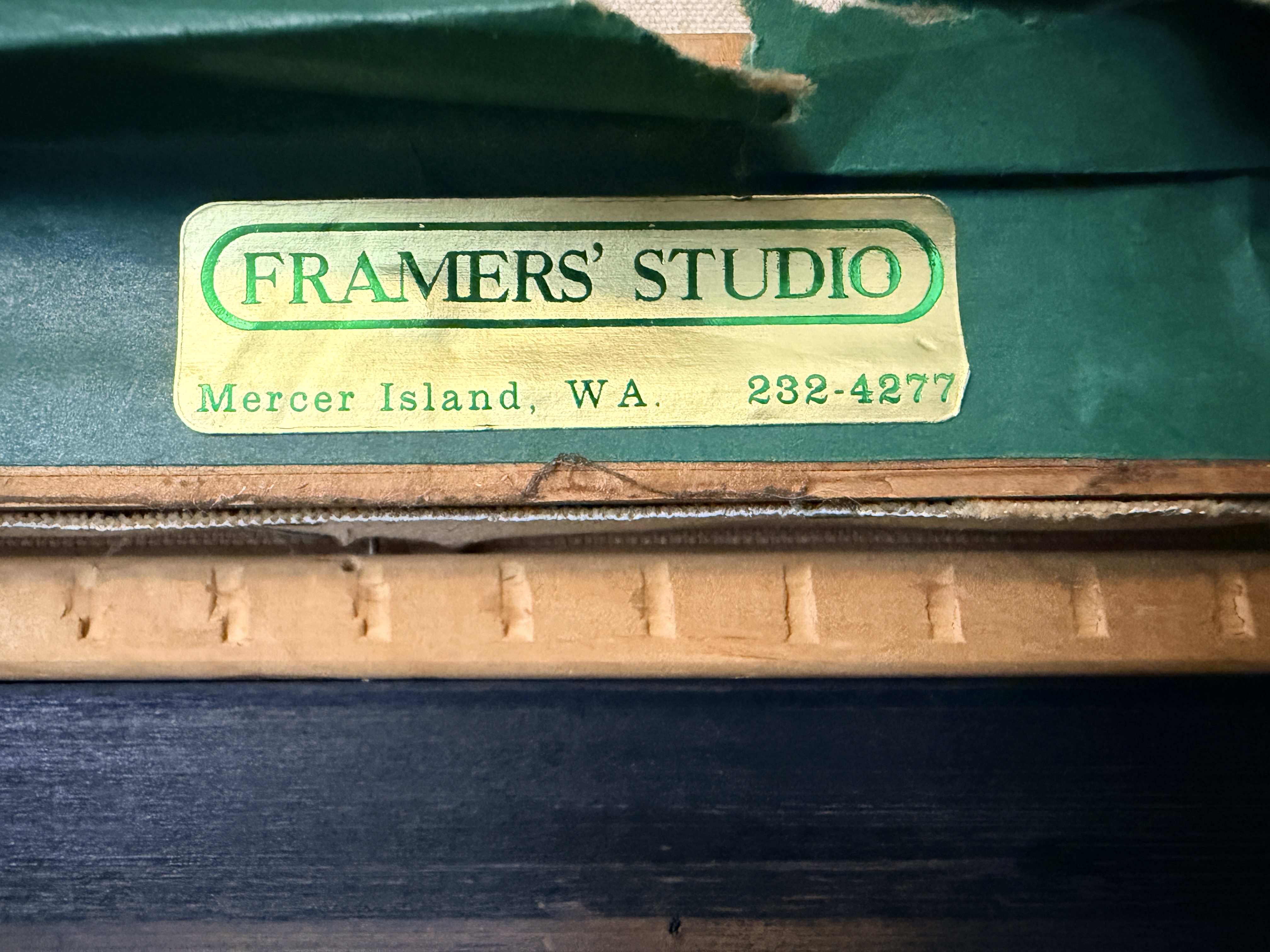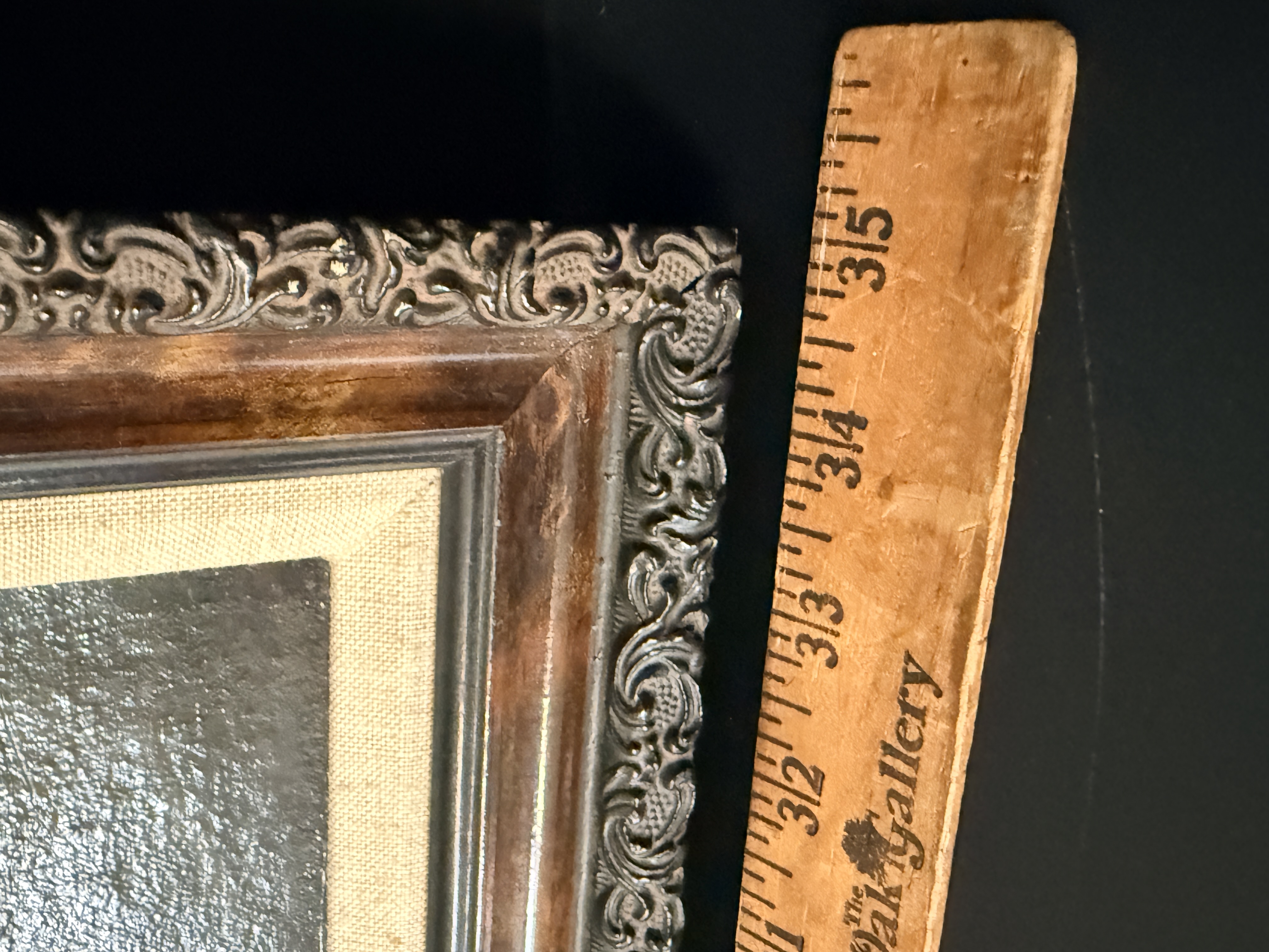 The canvas exhibits a small puncture in the lower right area and some other small dents. The reverse shows significant tearing and loss to the green paper backing. The frame displays minor age-related wear and small losses to the ornate molding. Art is from a clean smoke free home.