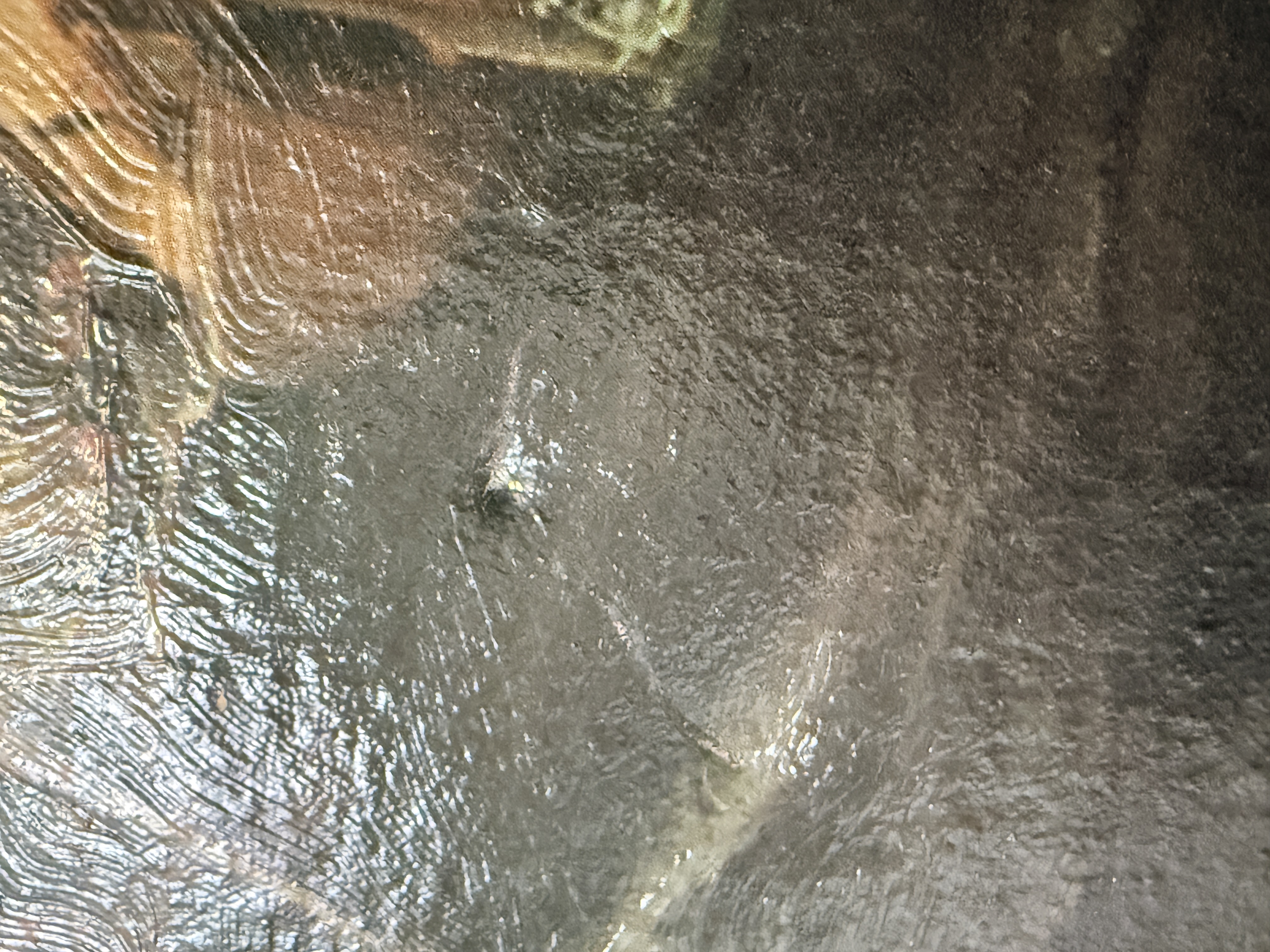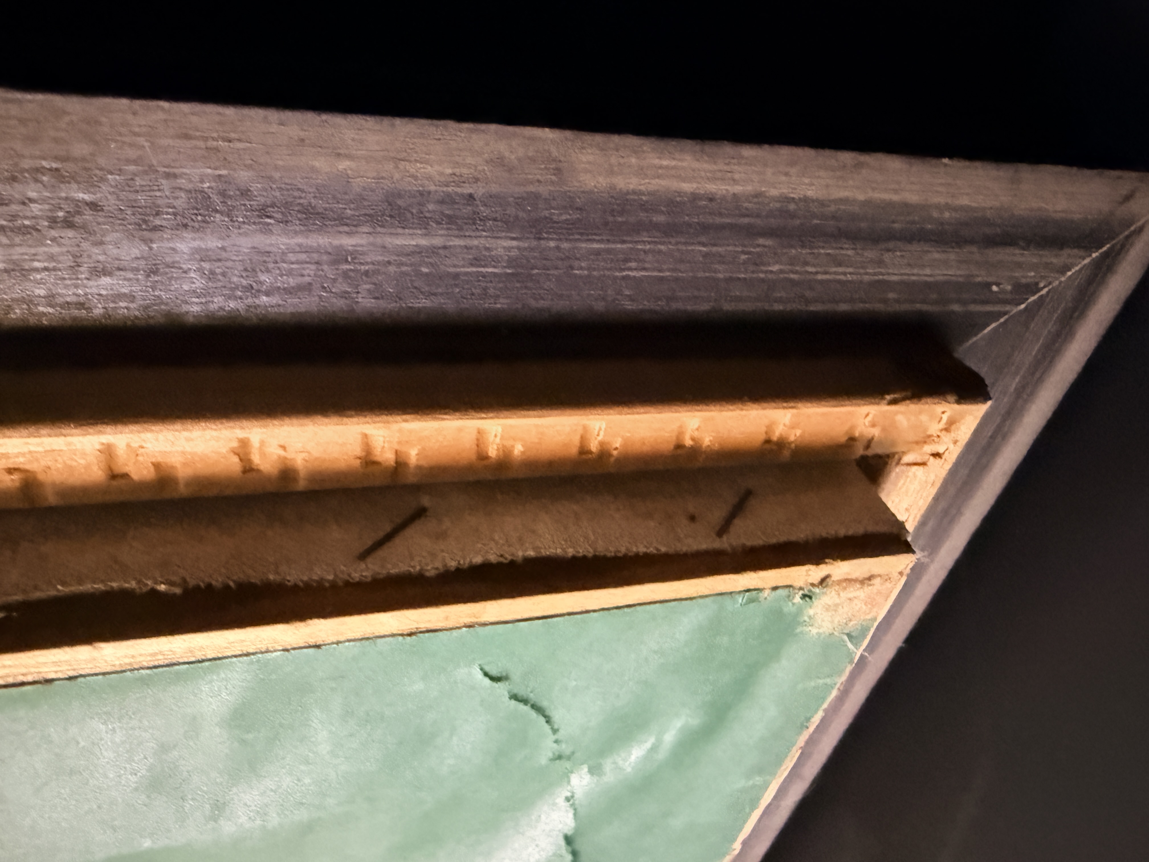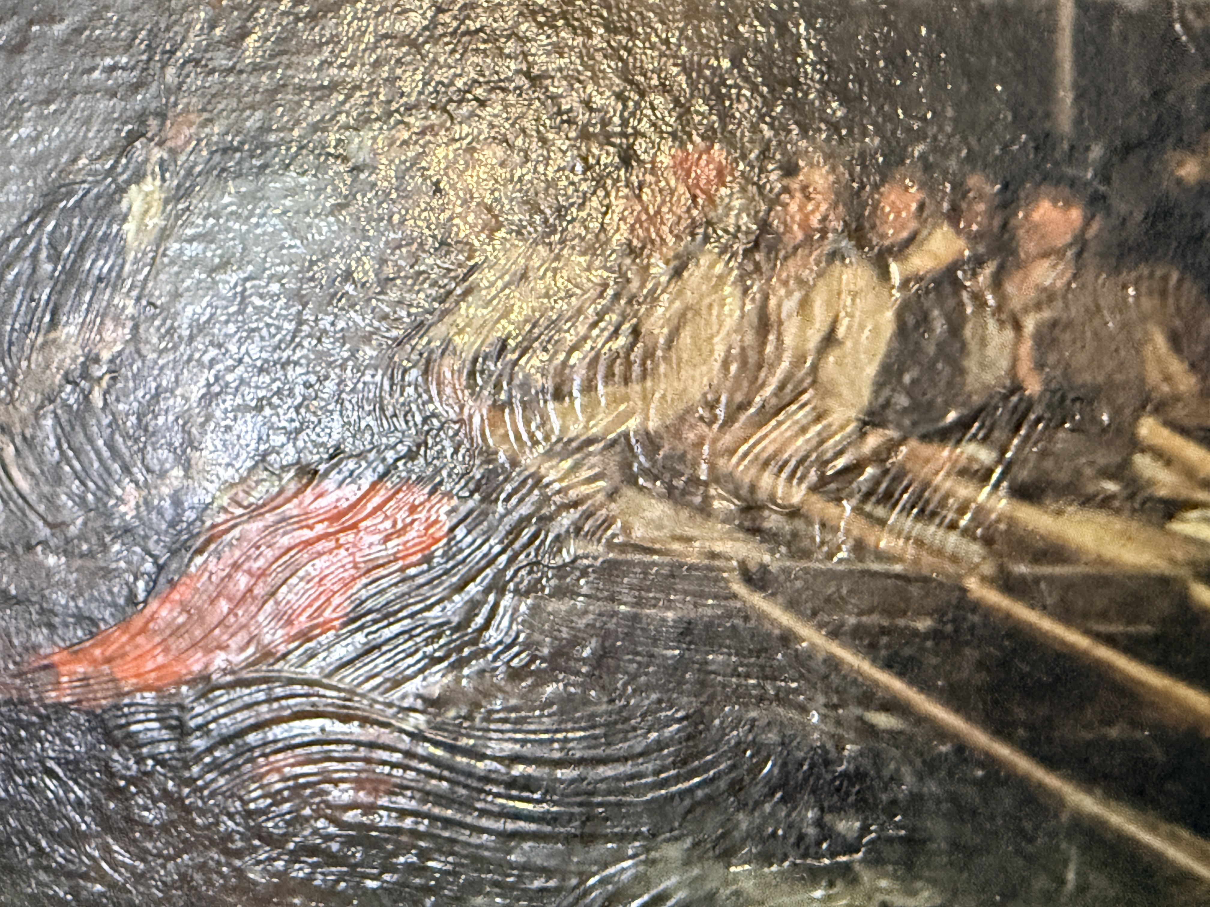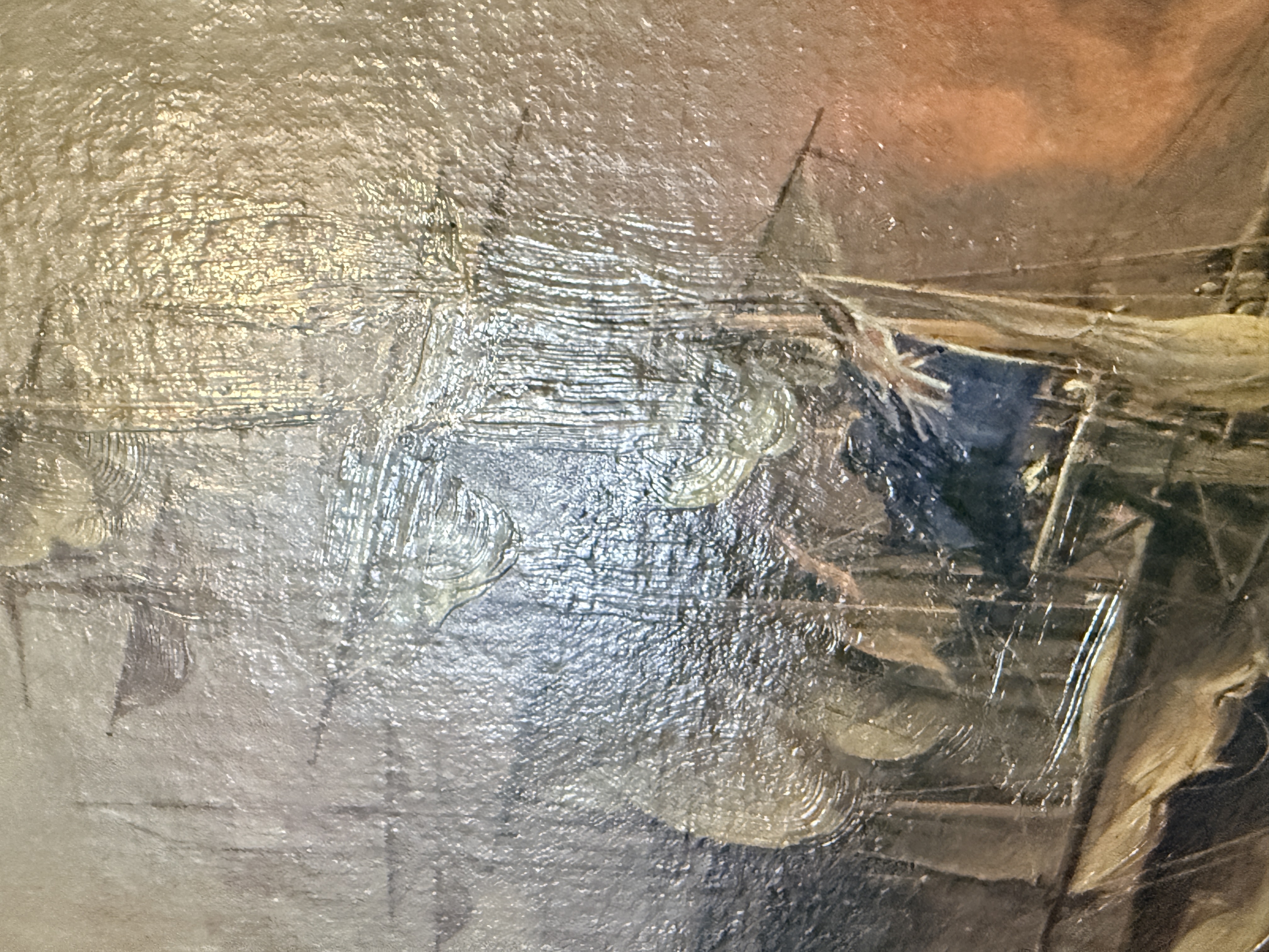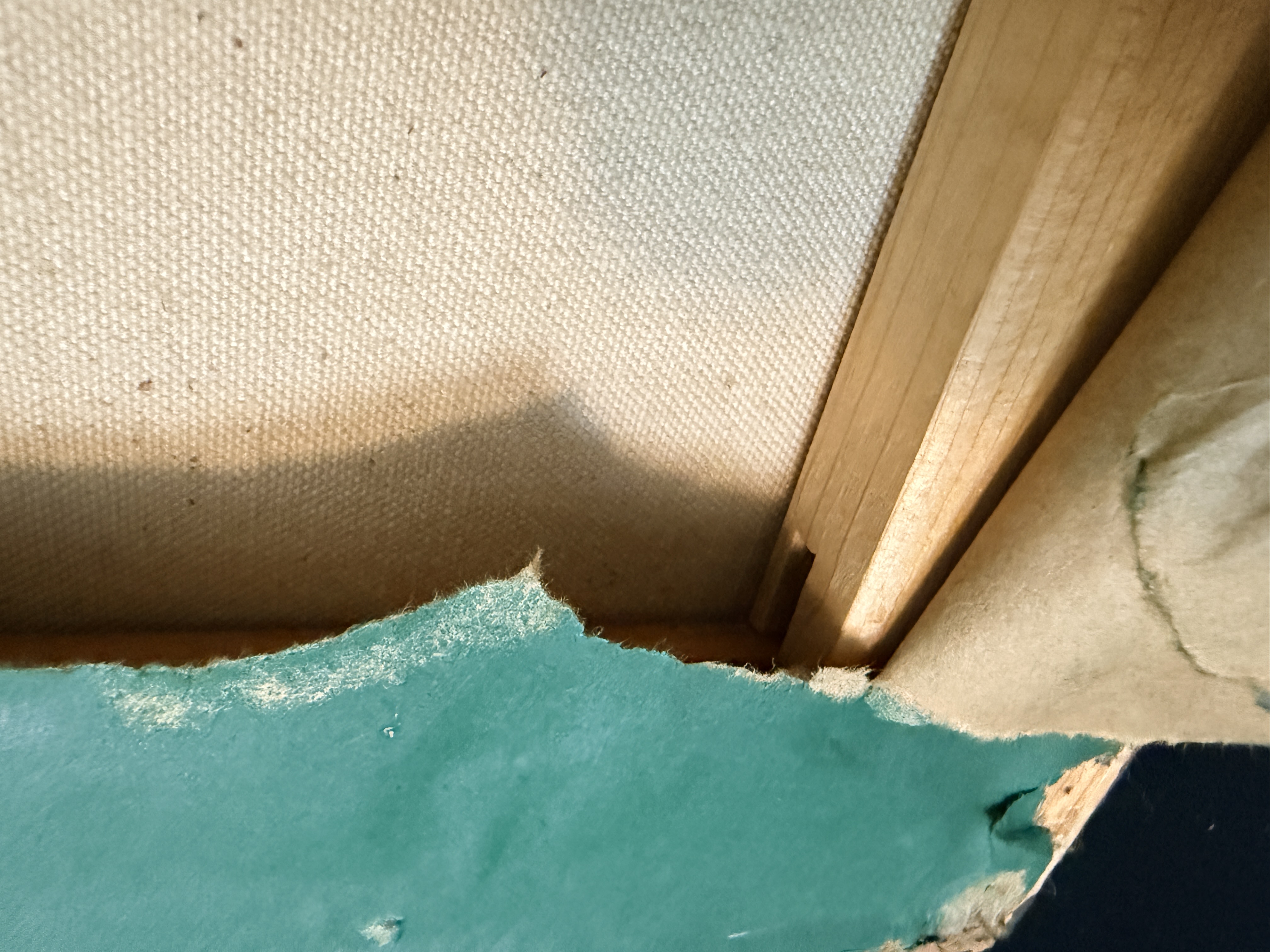 The canvas exhibits a small puncture in the lower right area and some other small dents. The reverse shows significant tearing and loss to the green paper backing. The frame displays minor age-related wear and small losses to the ornate molding. Art is from a clean smoke free home.