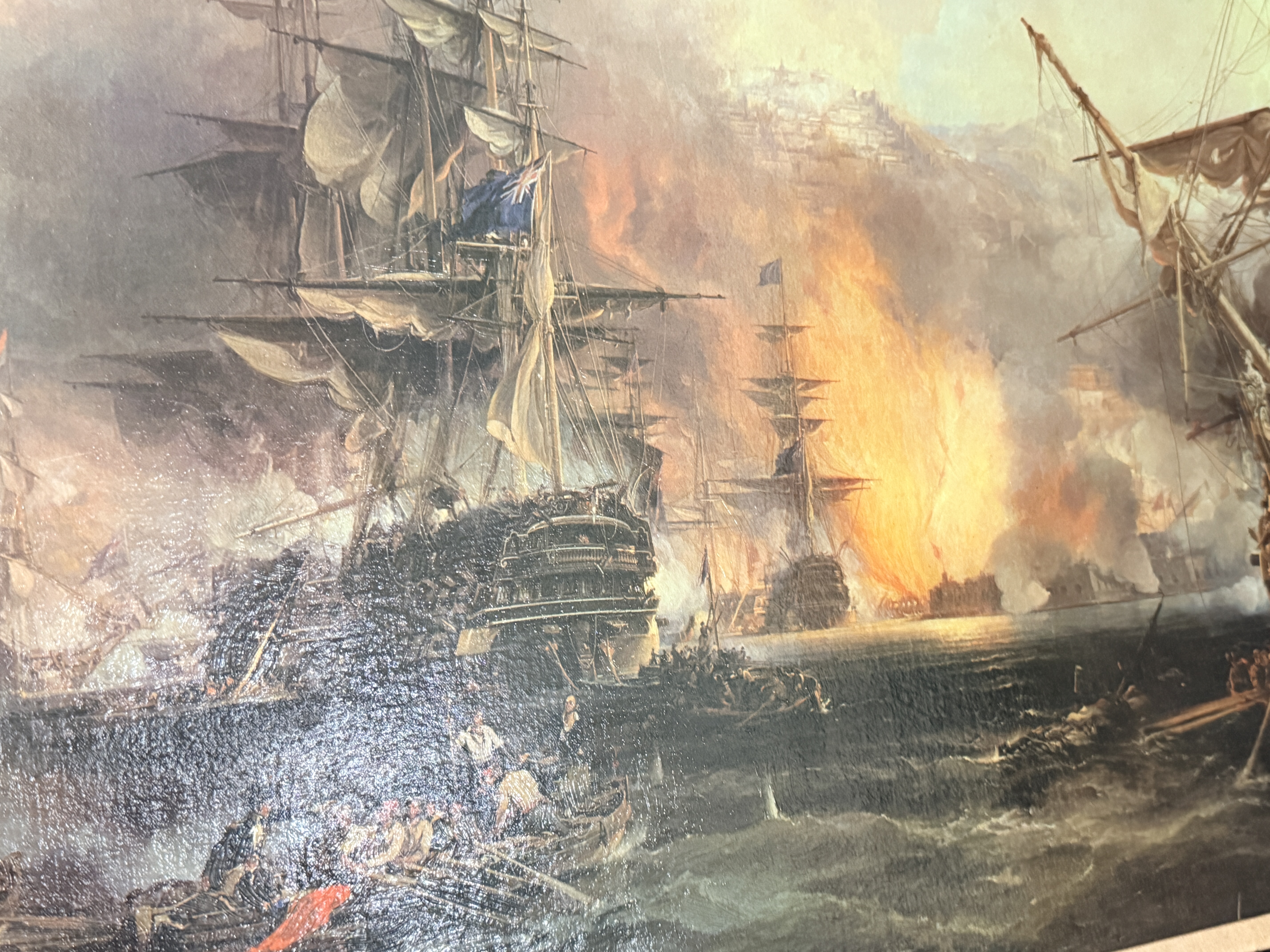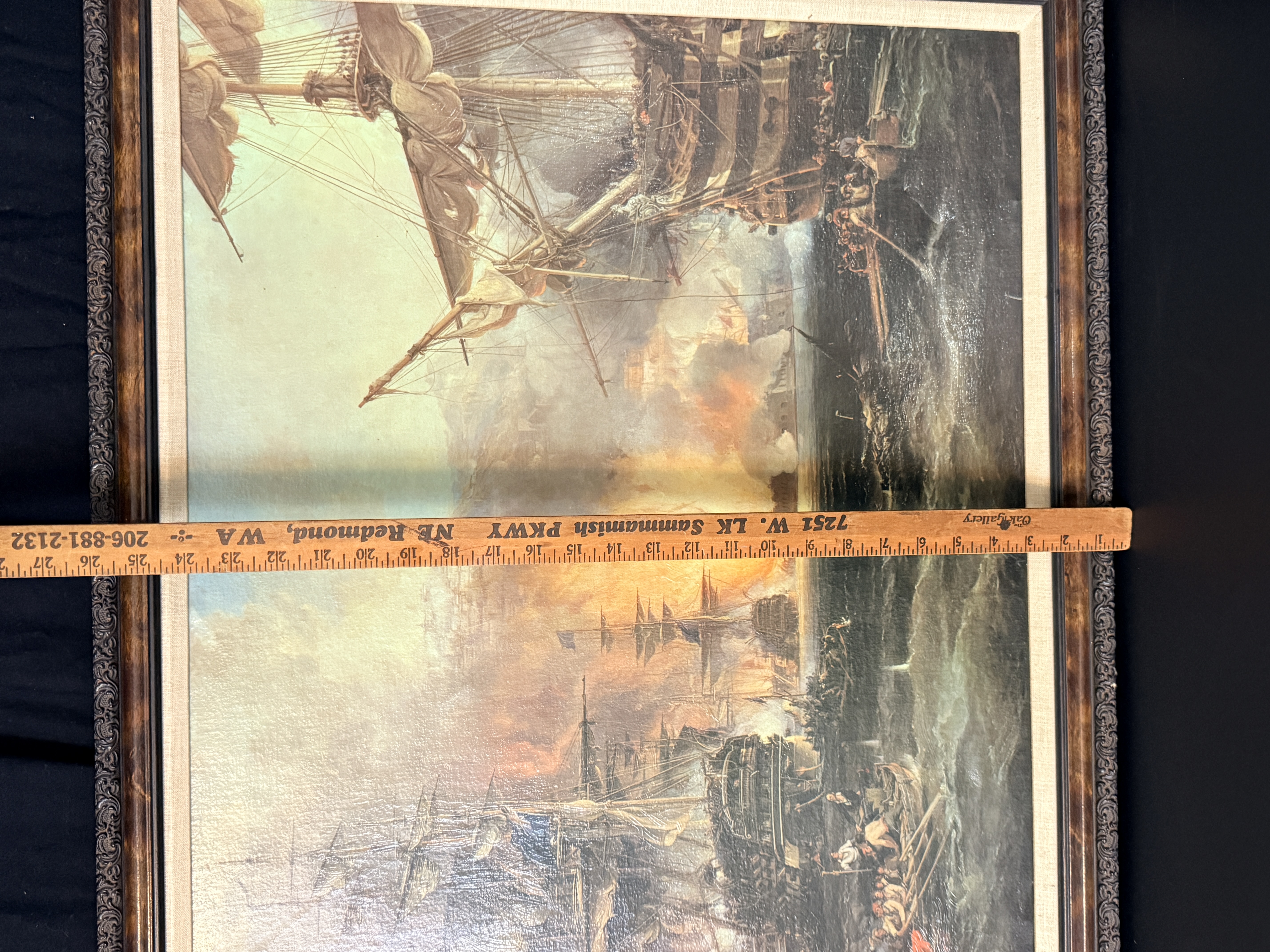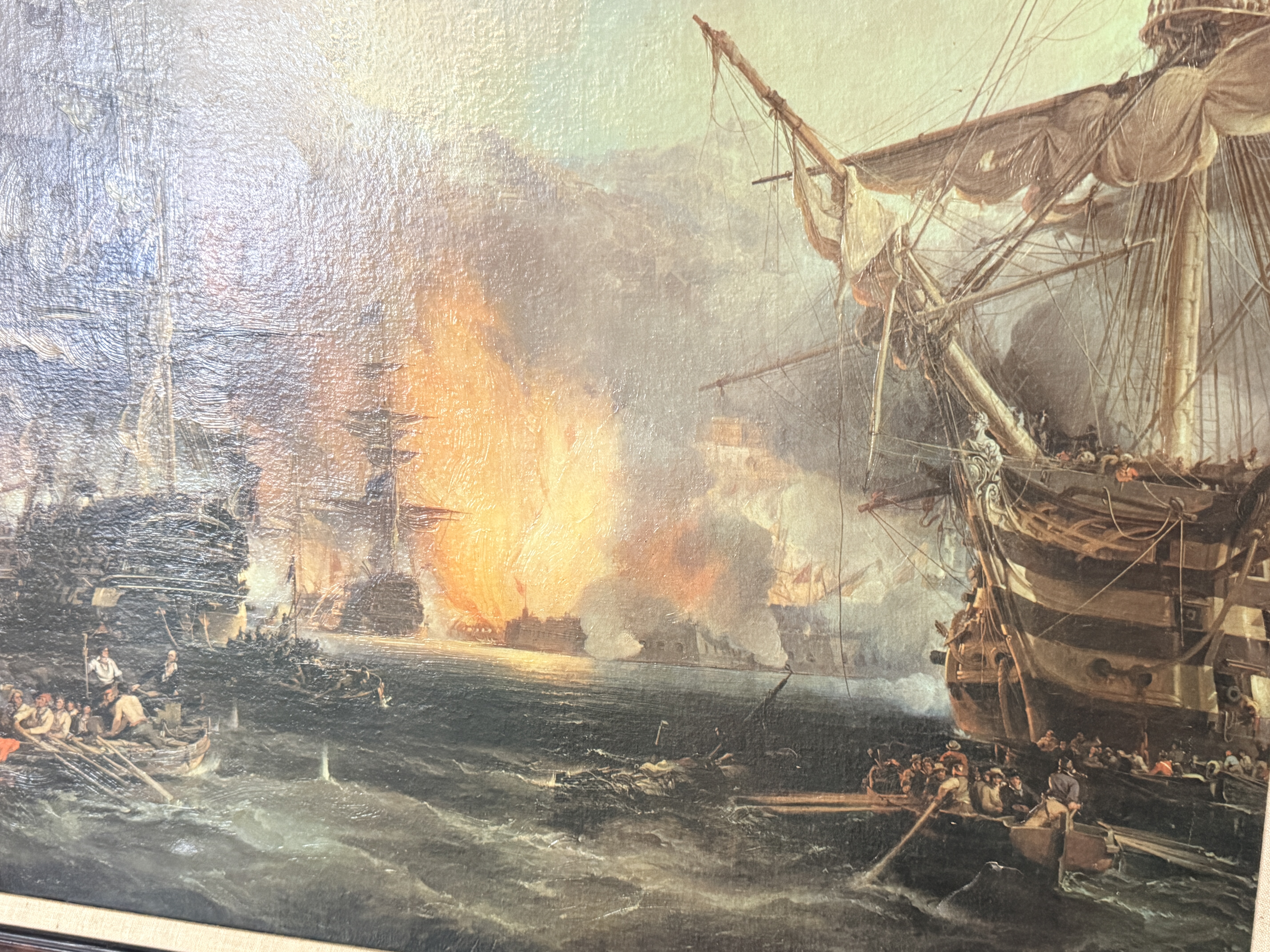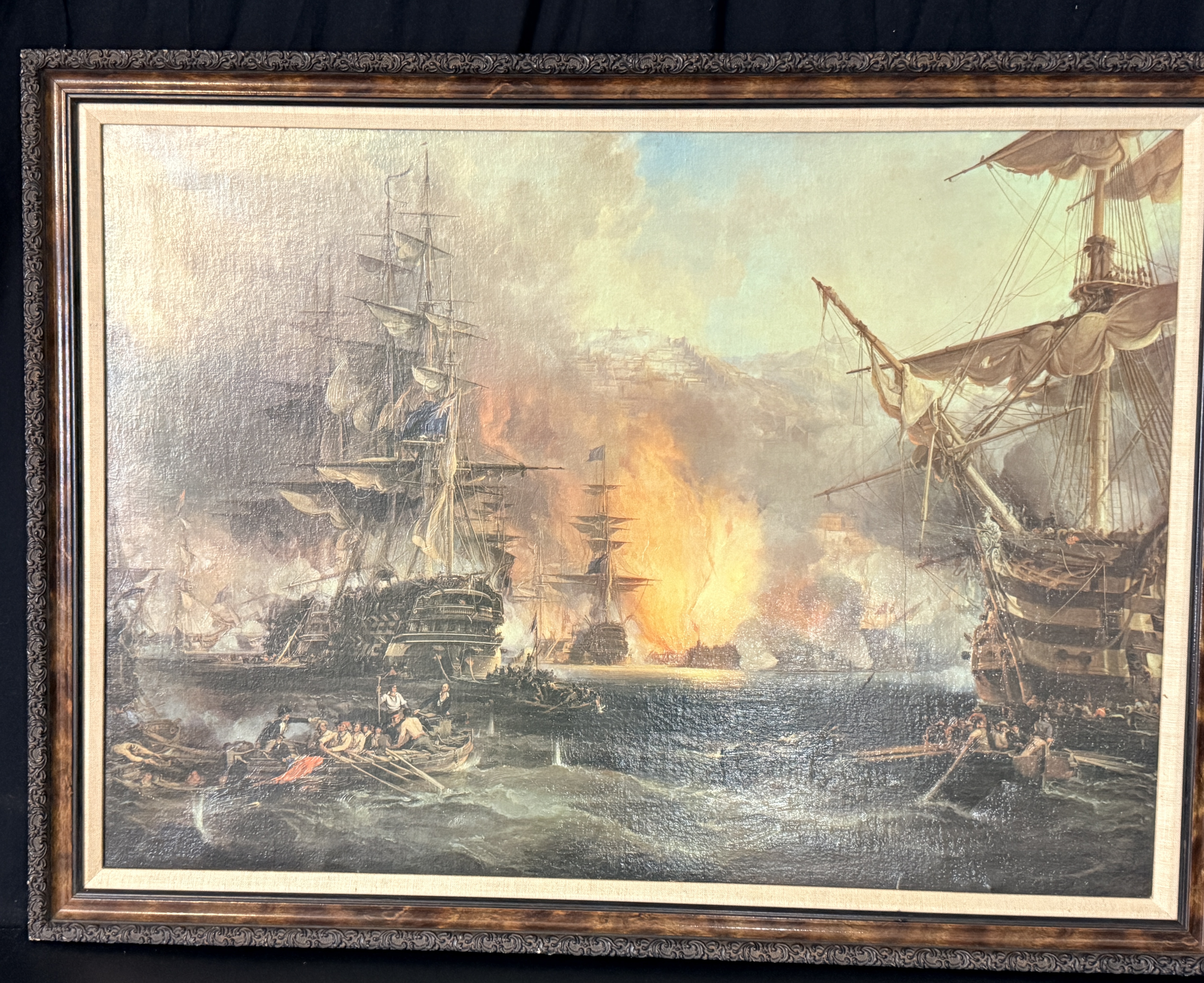 This framed maritime textured print on canvas depicts the Bombardment of Algiers, 1816, a composition closely associated with the work of George Chambers. The scene illustrates several multi-masted sailing vessels engaged in battle amidst heavy smoke and fire, with smaller rowboats and figures visible in the foreground. The work is housed in a heavy, ornate dark-toned frame featuring scrollwork relief and a beige fabric-textured liner. The reverse includes a label from Framers’ Studio, Mercer Island, WA and is equipped with a hanging wire for display.