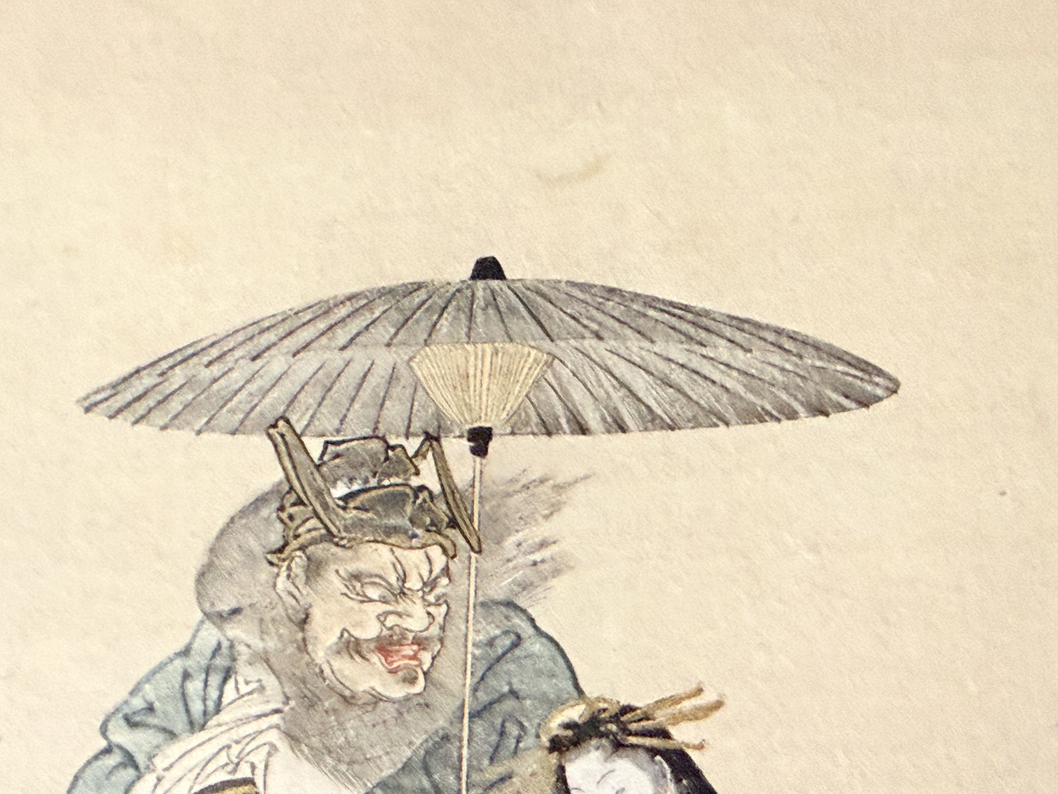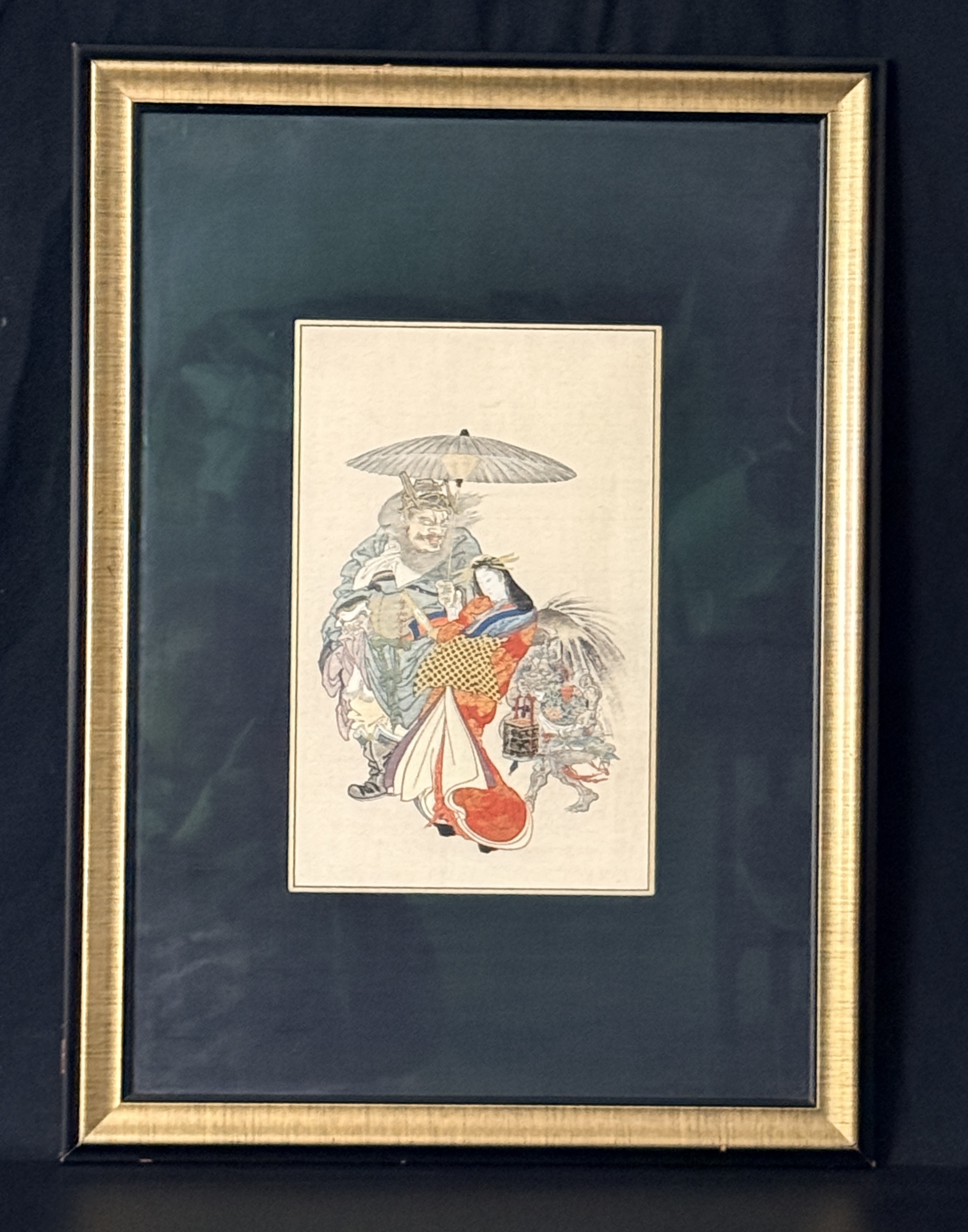This Japanese woodblock print is attributed to the artist Kawanabe Kyosai and depicts the traditional subject of Bijin and Shoki. The composition features a bearded figure in ornate robes holding a paper parasol over a woman dressed in a traditional patterned kimono, accompanied by a smaller attendant carrying a basket. The print is set within a dark blue silk-textured mat and housed in a rectangular gilt-wood frame with a black-finished outer edge. A gallery label for Howard/Mandville Gallery with locations in Kirkland and Edmonds, Washington, is affixed to the reverse. No artist signature or seal is visible on the print surface.