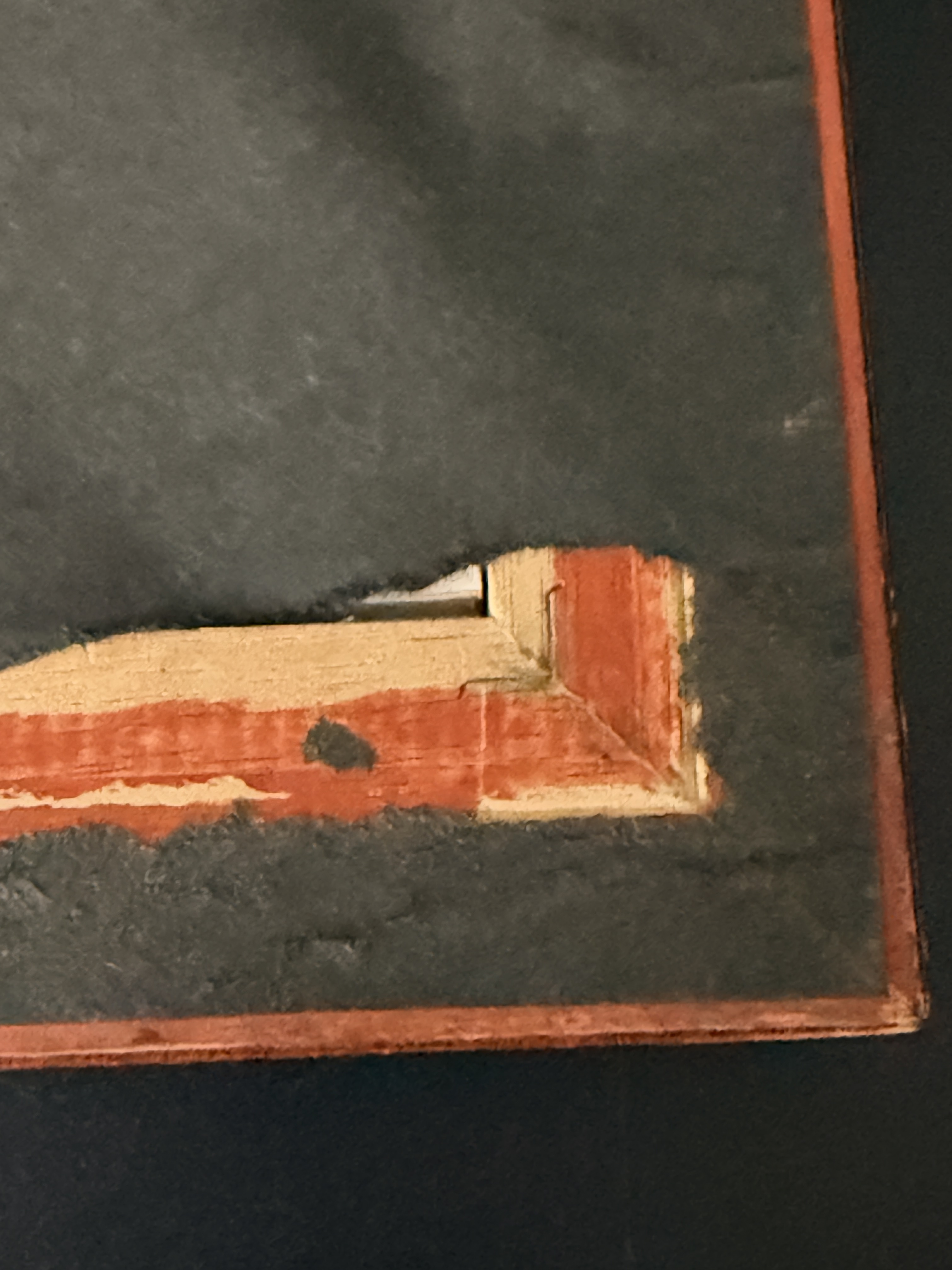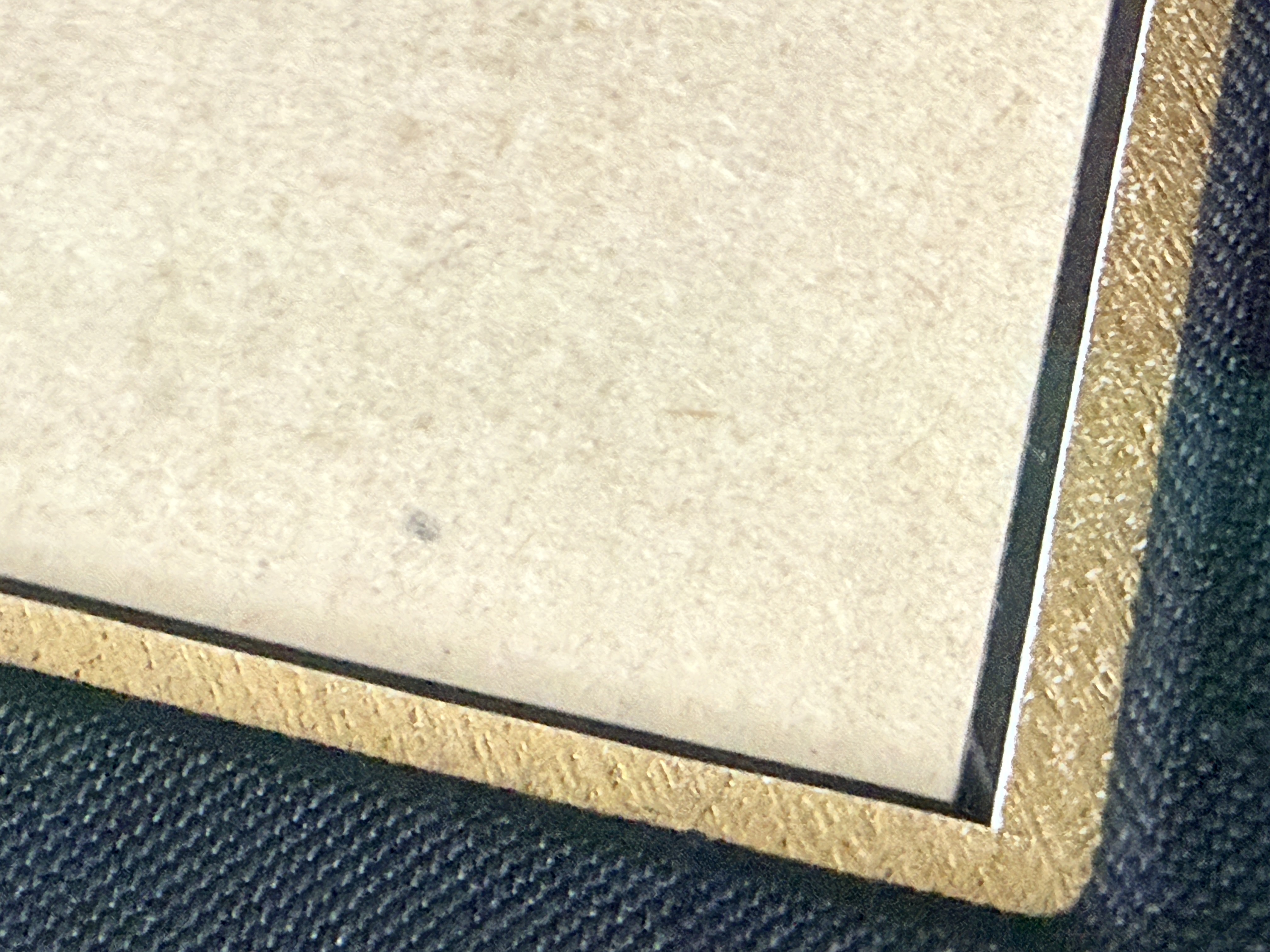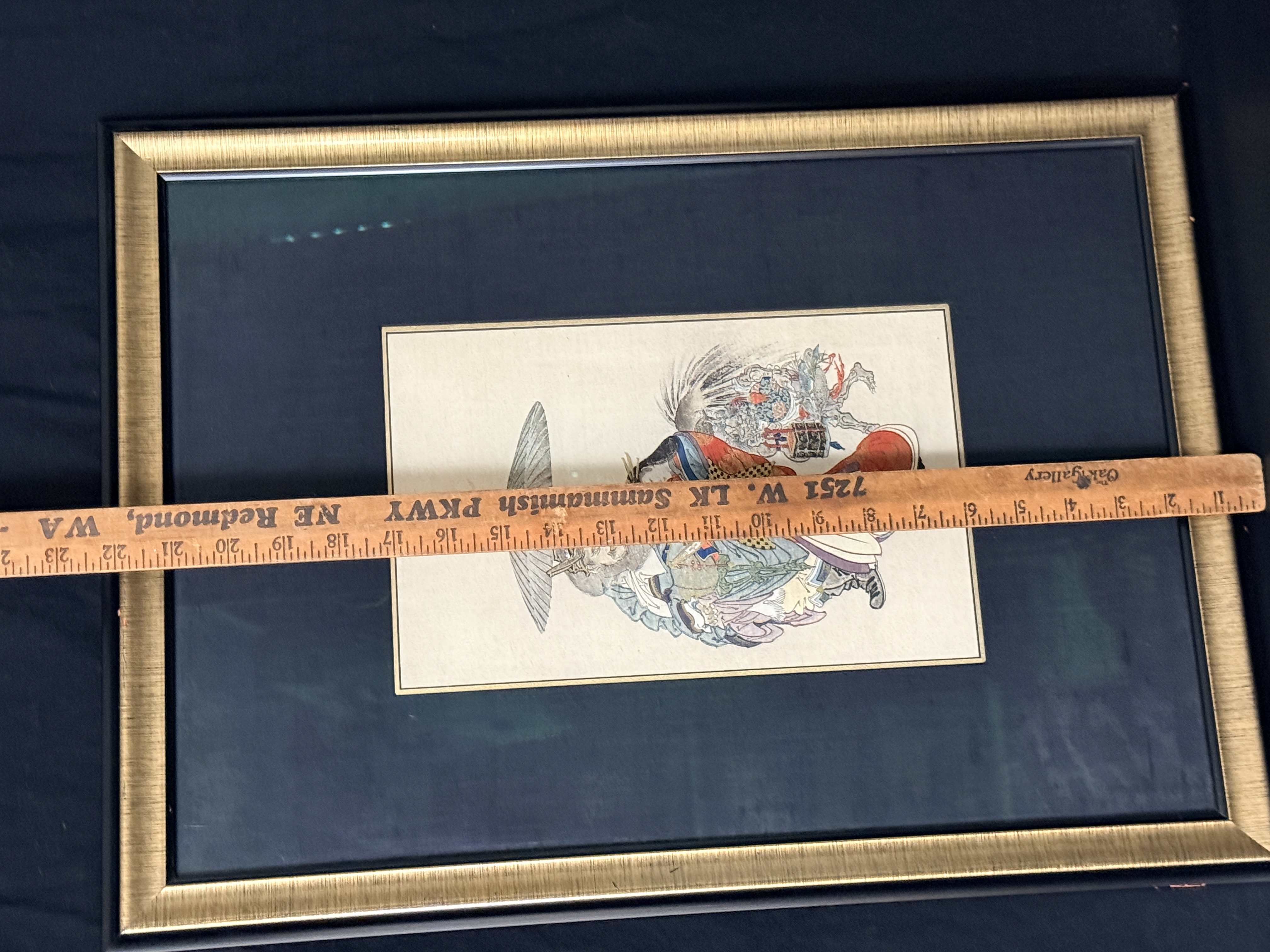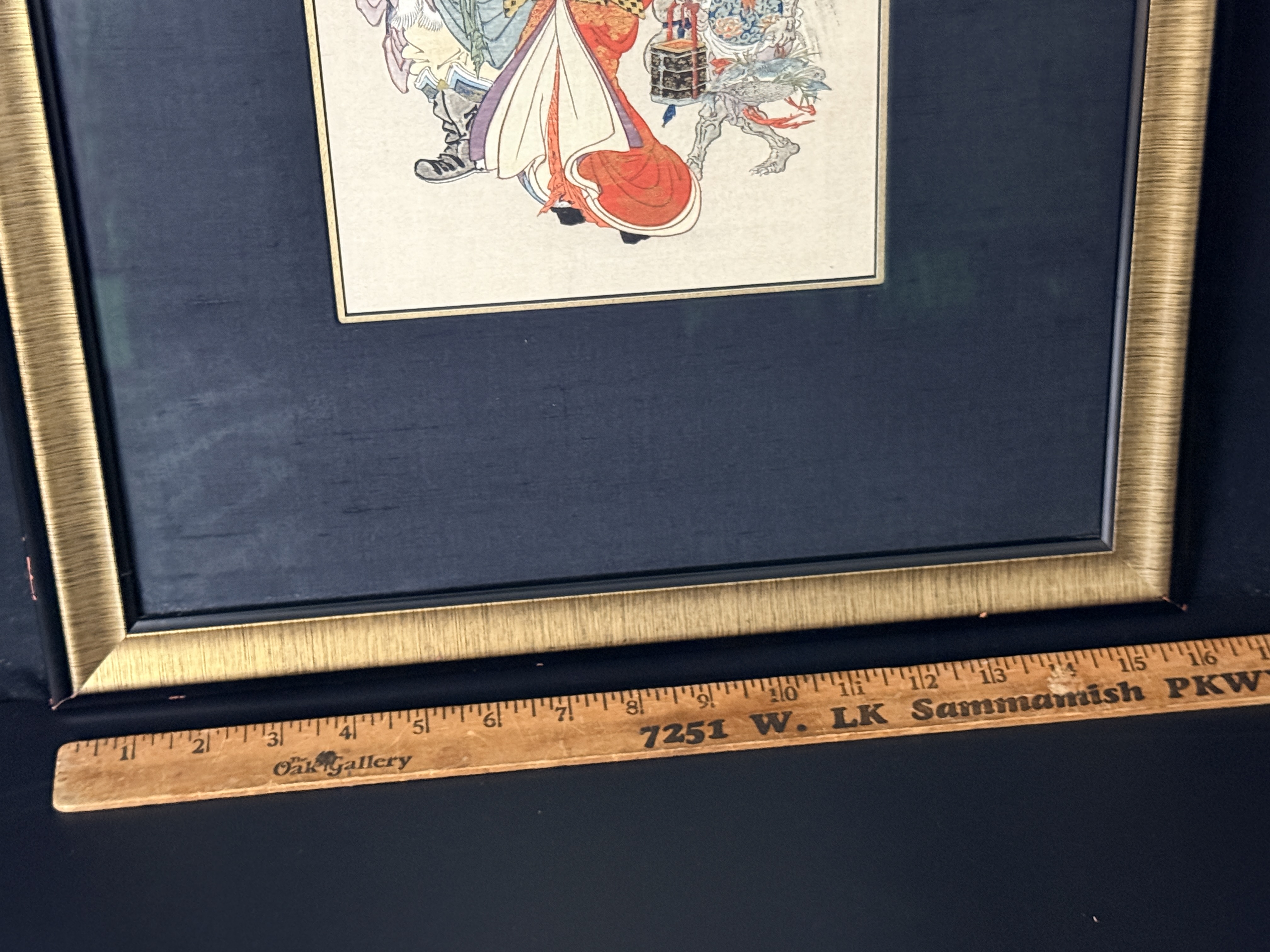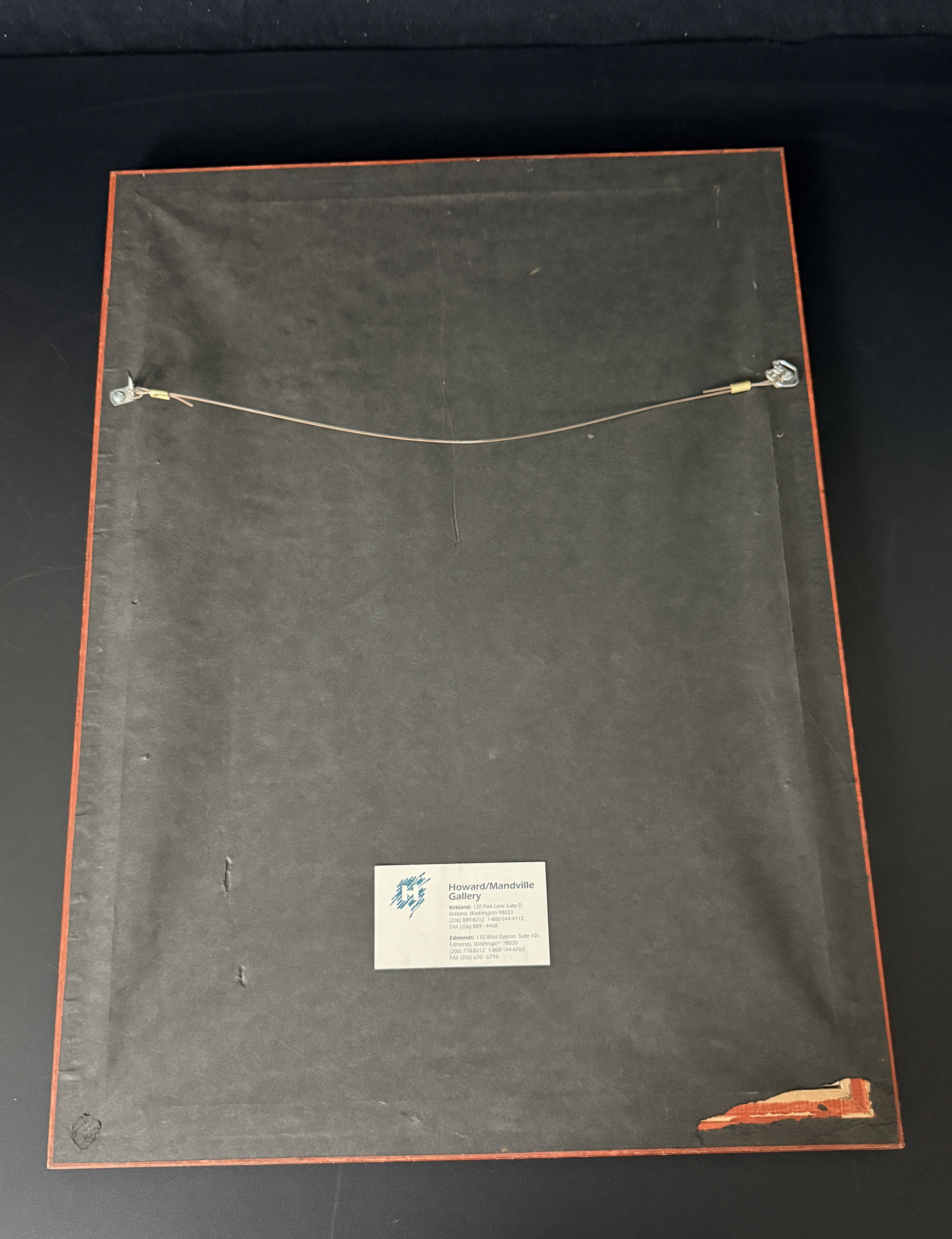 The artwork is in good overall condition. The frame shows minor surface wear to the gilt and black finishes. There is a significant tear in the black backing paper at the lower-right corner, which reveals the interior frame construction. Art is from a clean smoke free home.