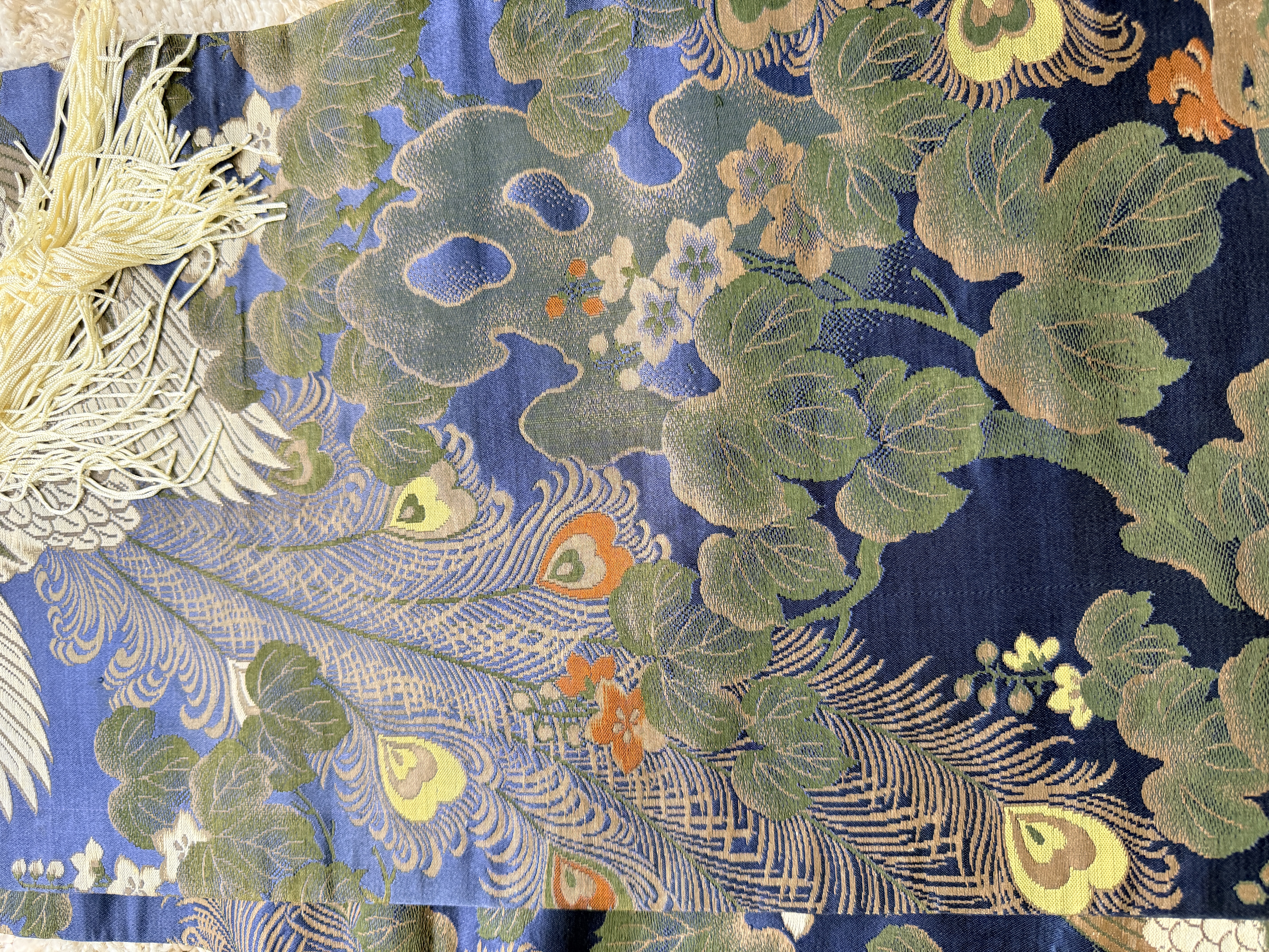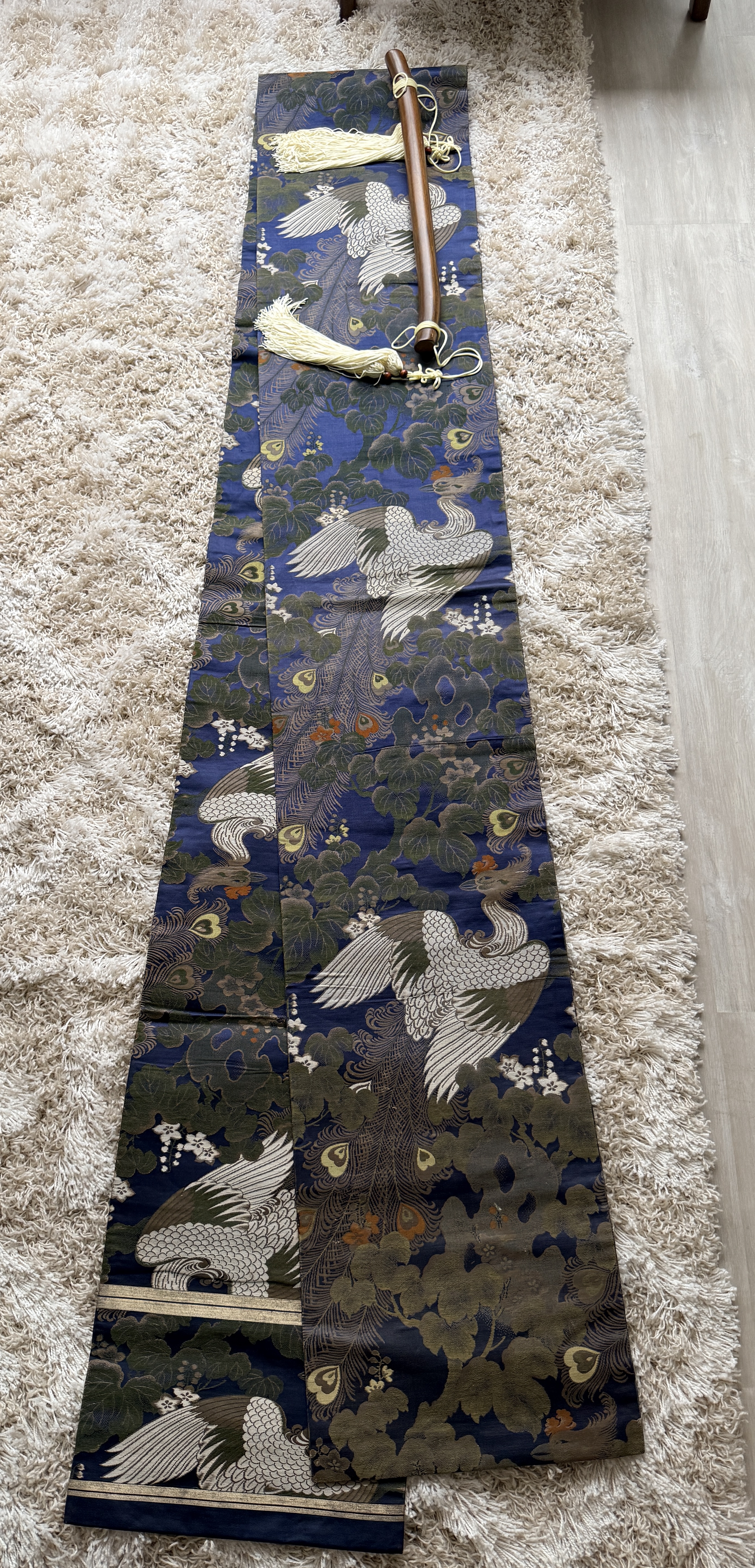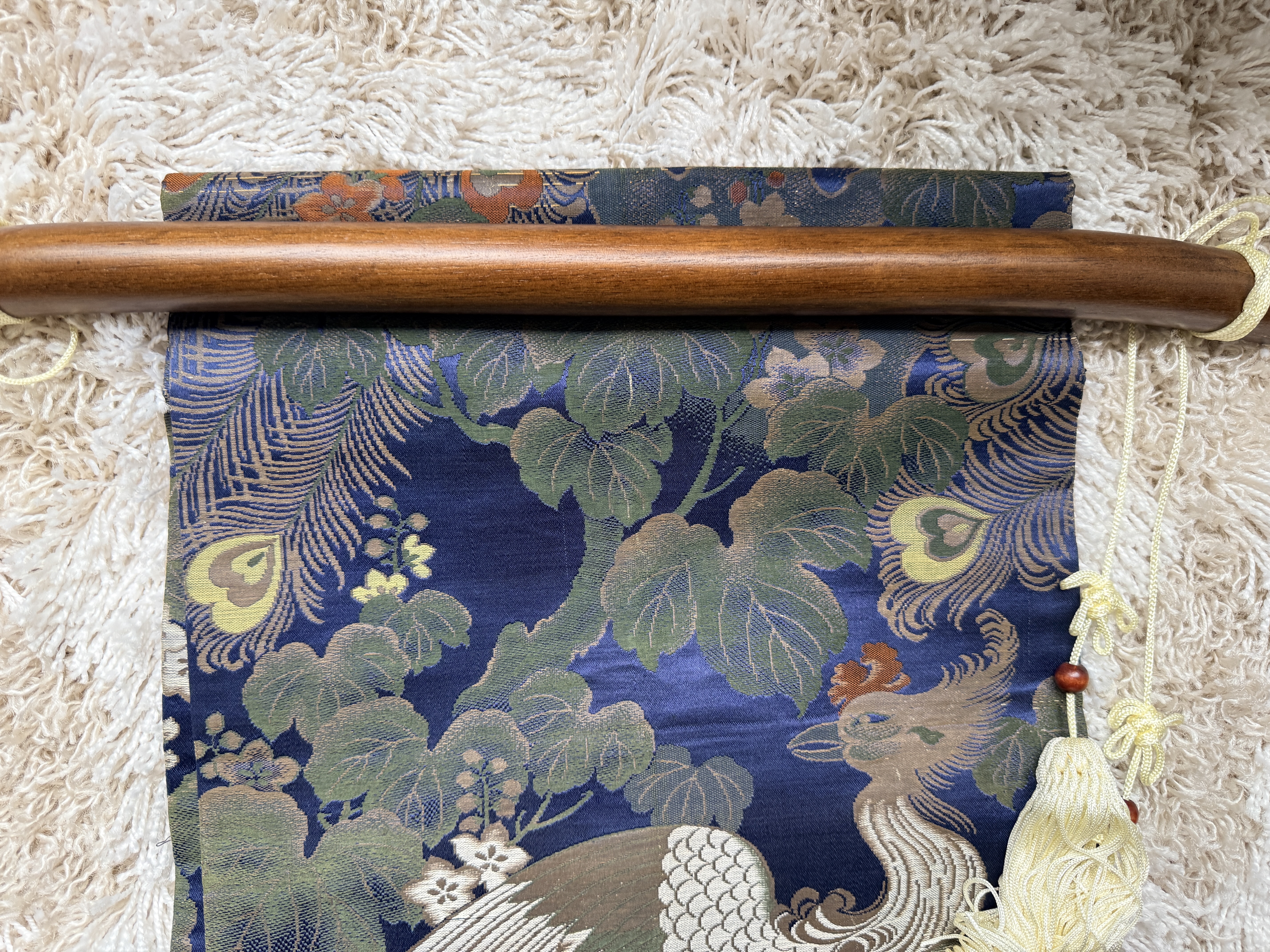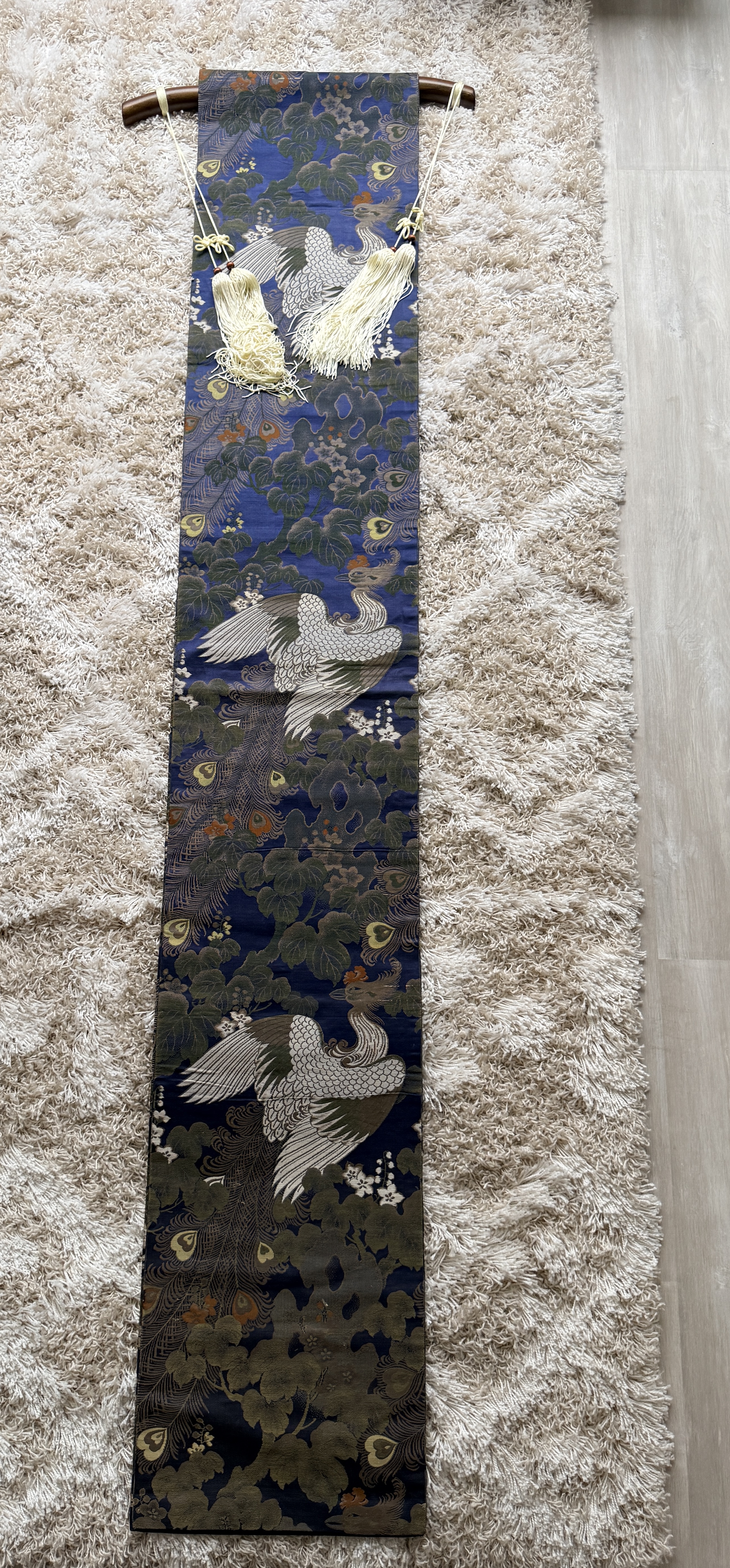 A Japanese silk brocade textile, likely a repurposed obi, presented as a decorative wall hanging. The piece features an intricate repeating pattern of phoenixes with elaborate trailing plumage set against a vibrant blue ground populated with paulownia-style foliage and small flowers in shades of green, gold, and orange. The textile is mounted on a dark-finished, curved wooden hanging rod accented with off-white decorative tassels and suspension cords.