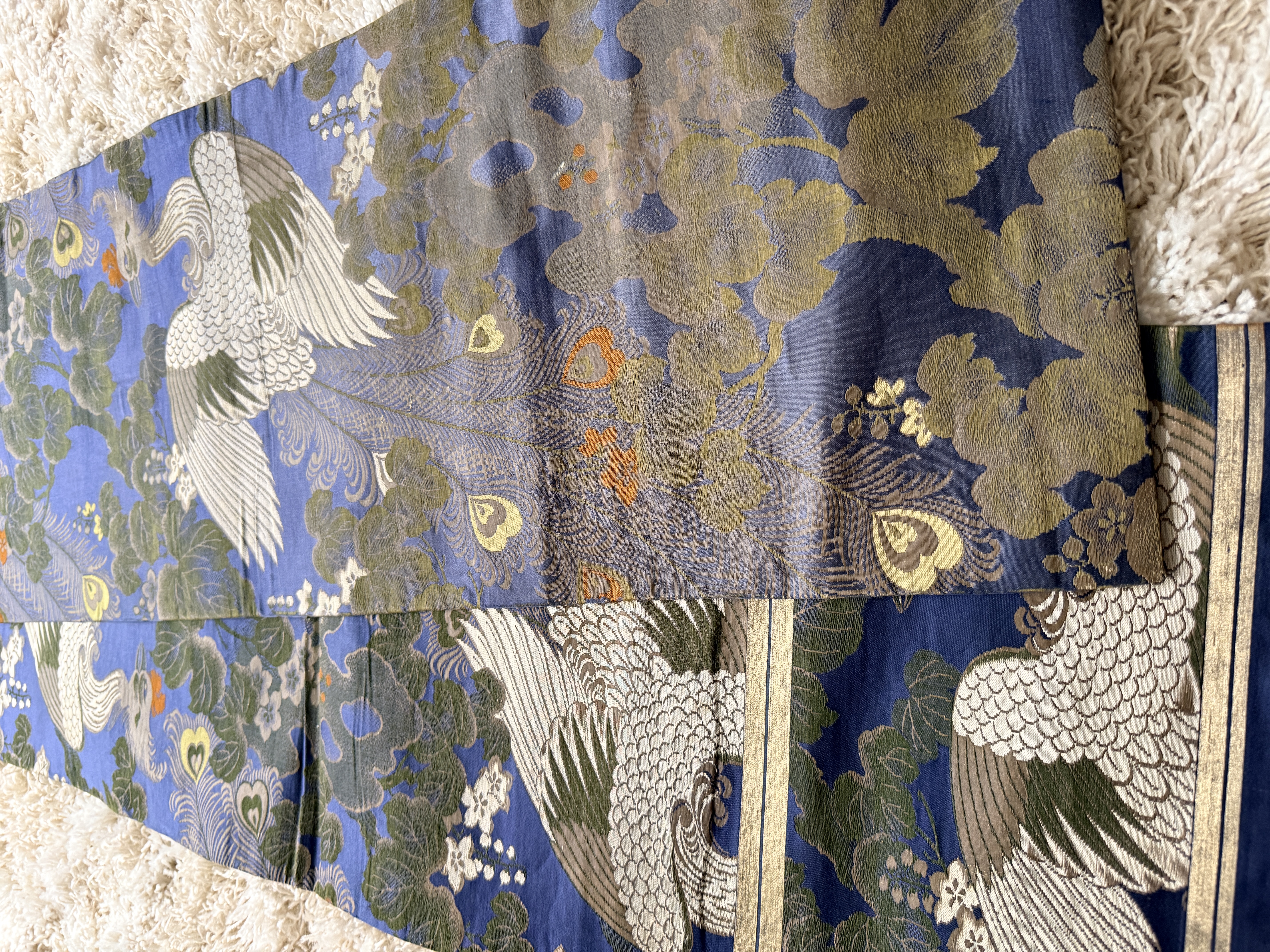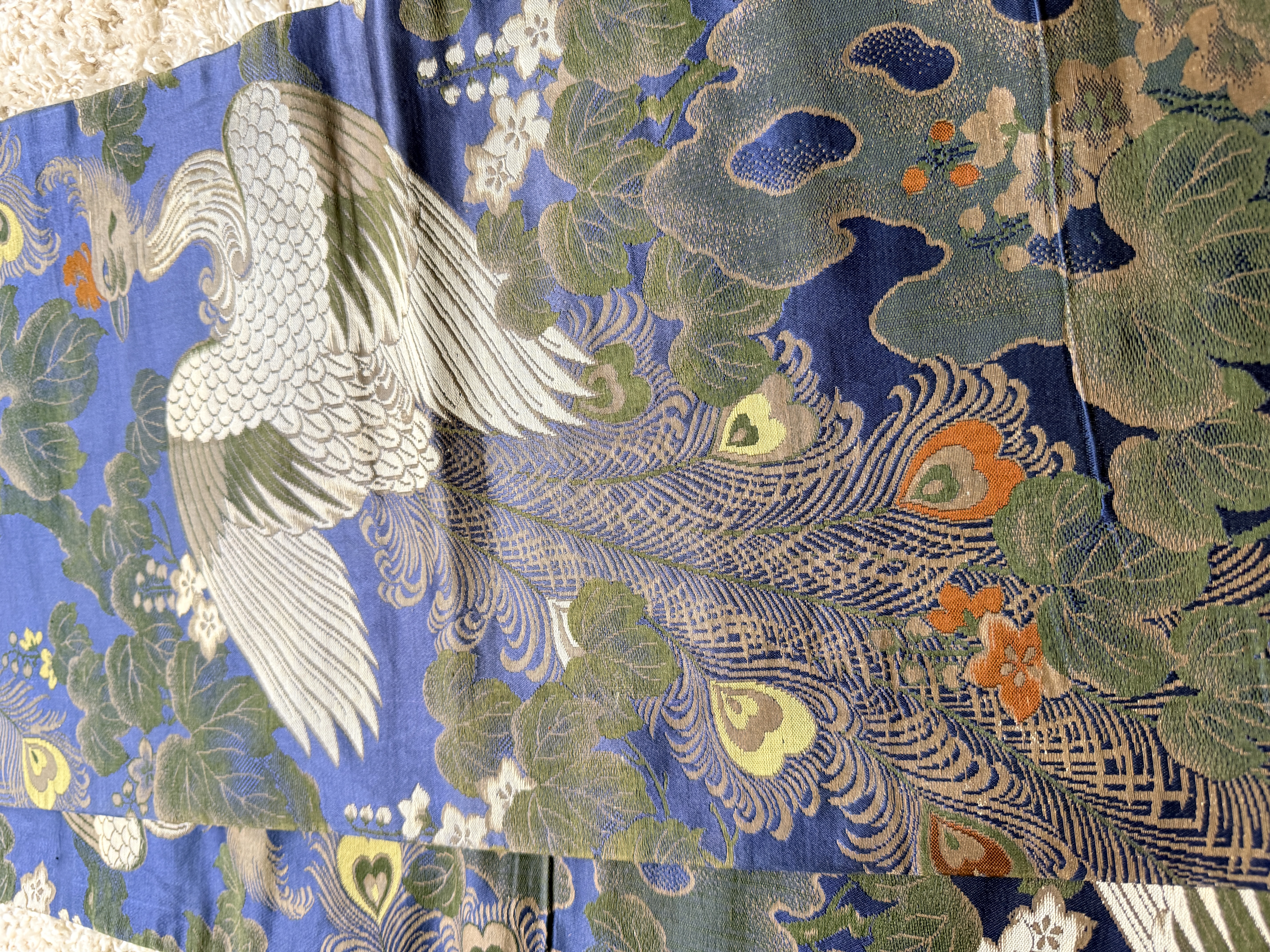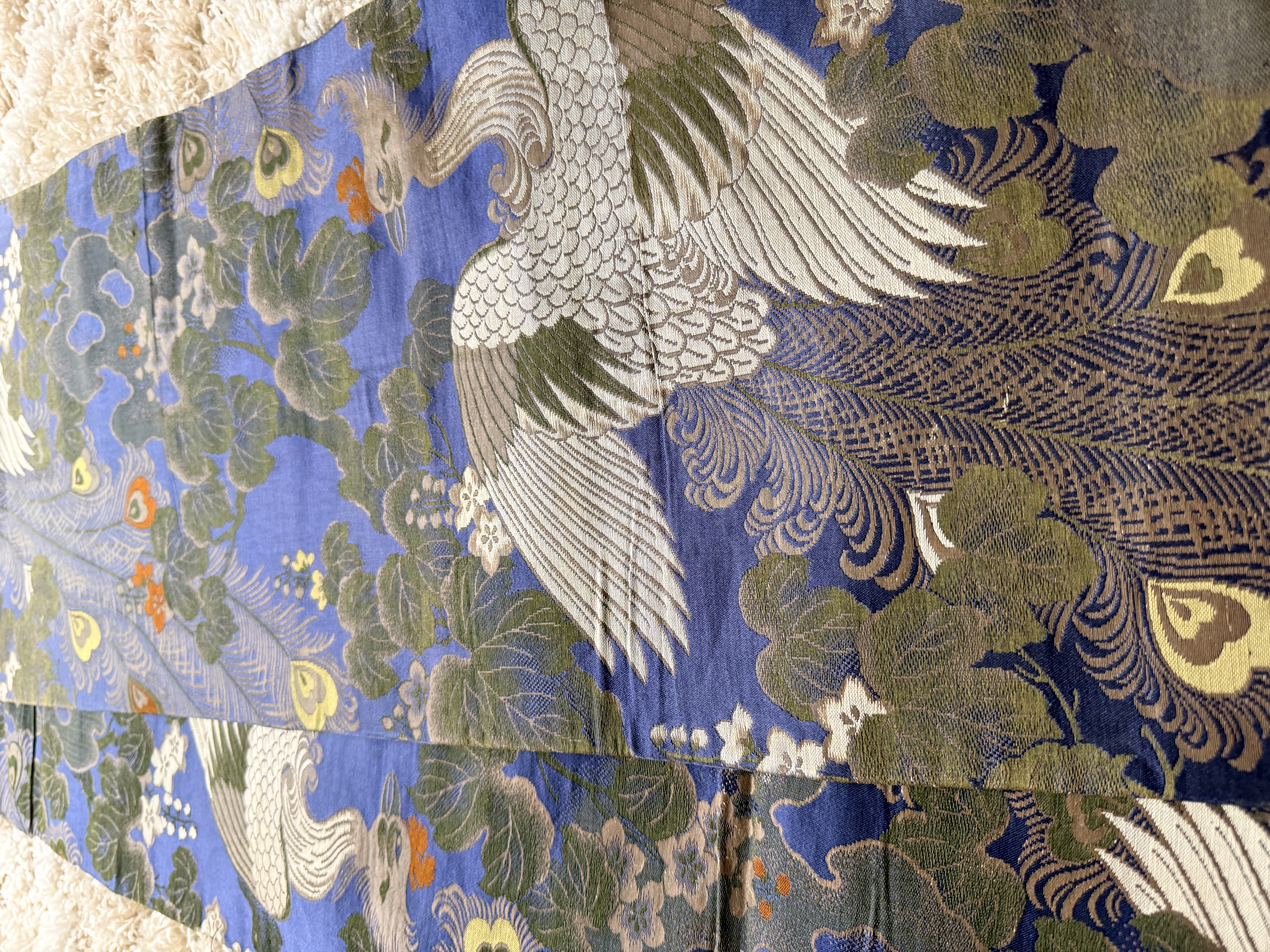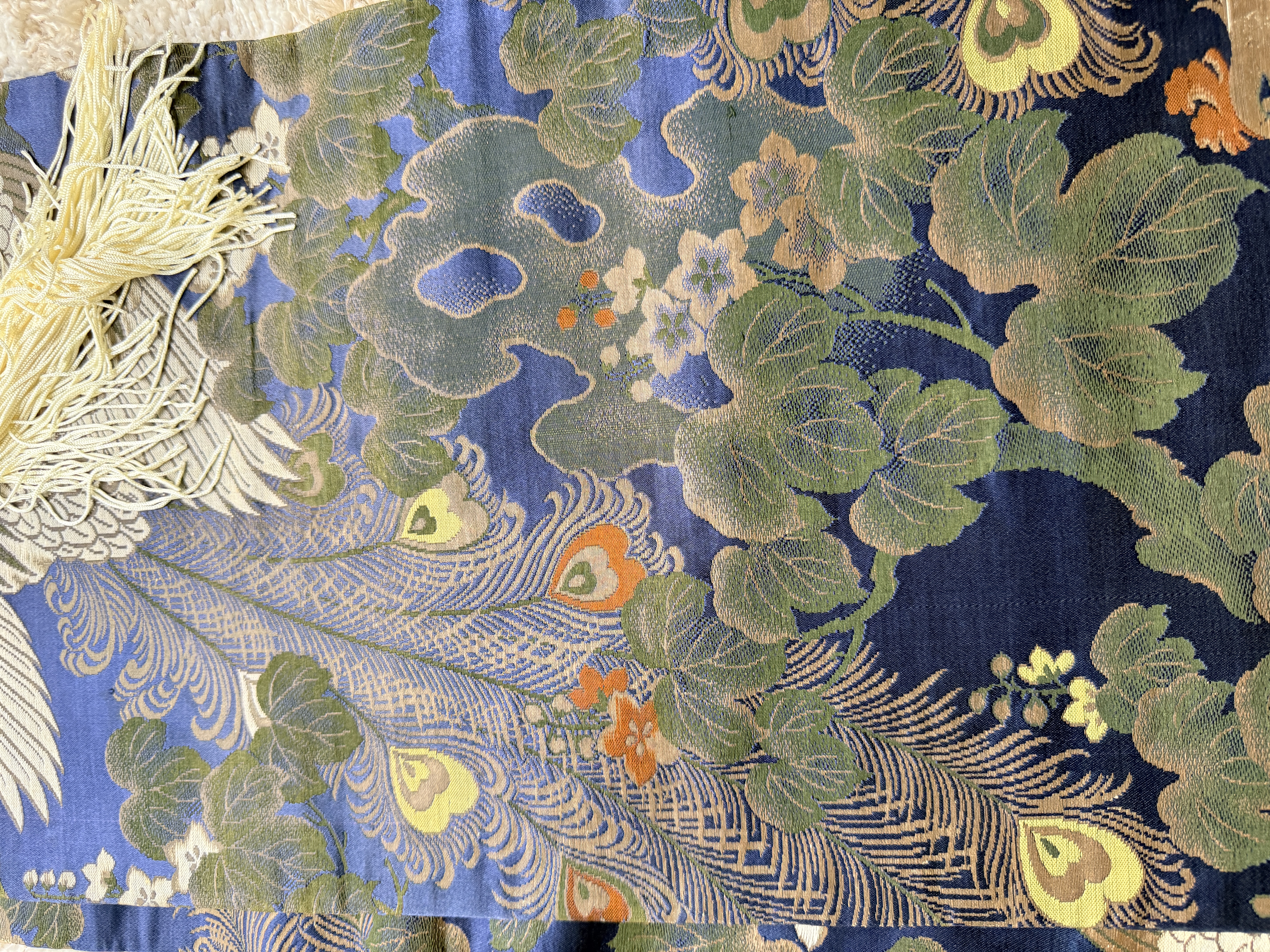 A Japanese silk brocade textile, likely a repurposed obi, presented as a decorative wall hanging. The piece features an intricate repeating pattern of phoenixes with elaborate trailing plumage set against a vibrant blue ground populated with paulownia-style foliage and small flowers in shades of green, gold, and orange. The textile is mounted on a dark-finished, curved wooden hanging rod accented with off-white decorative tassels and suspension cords.