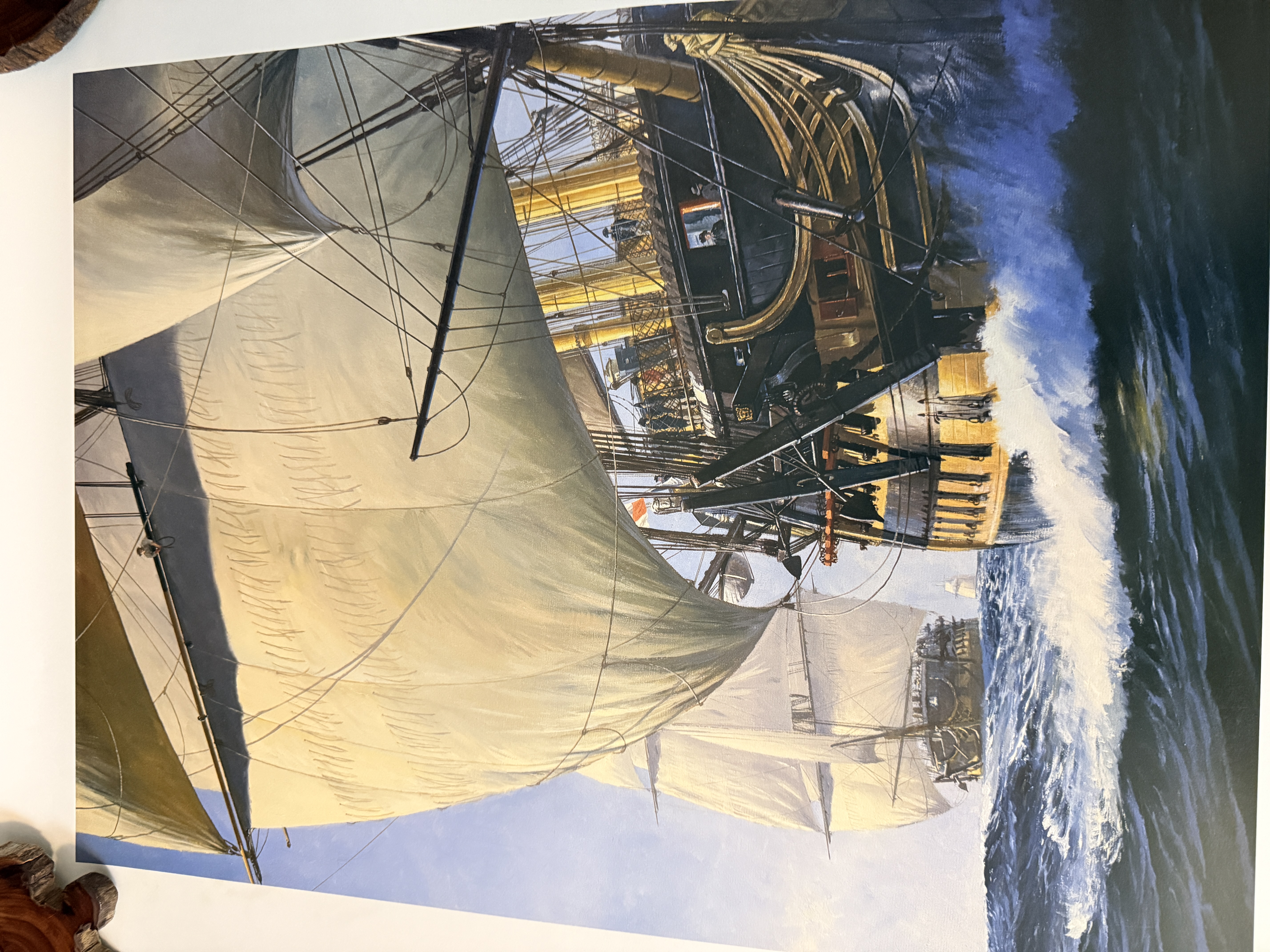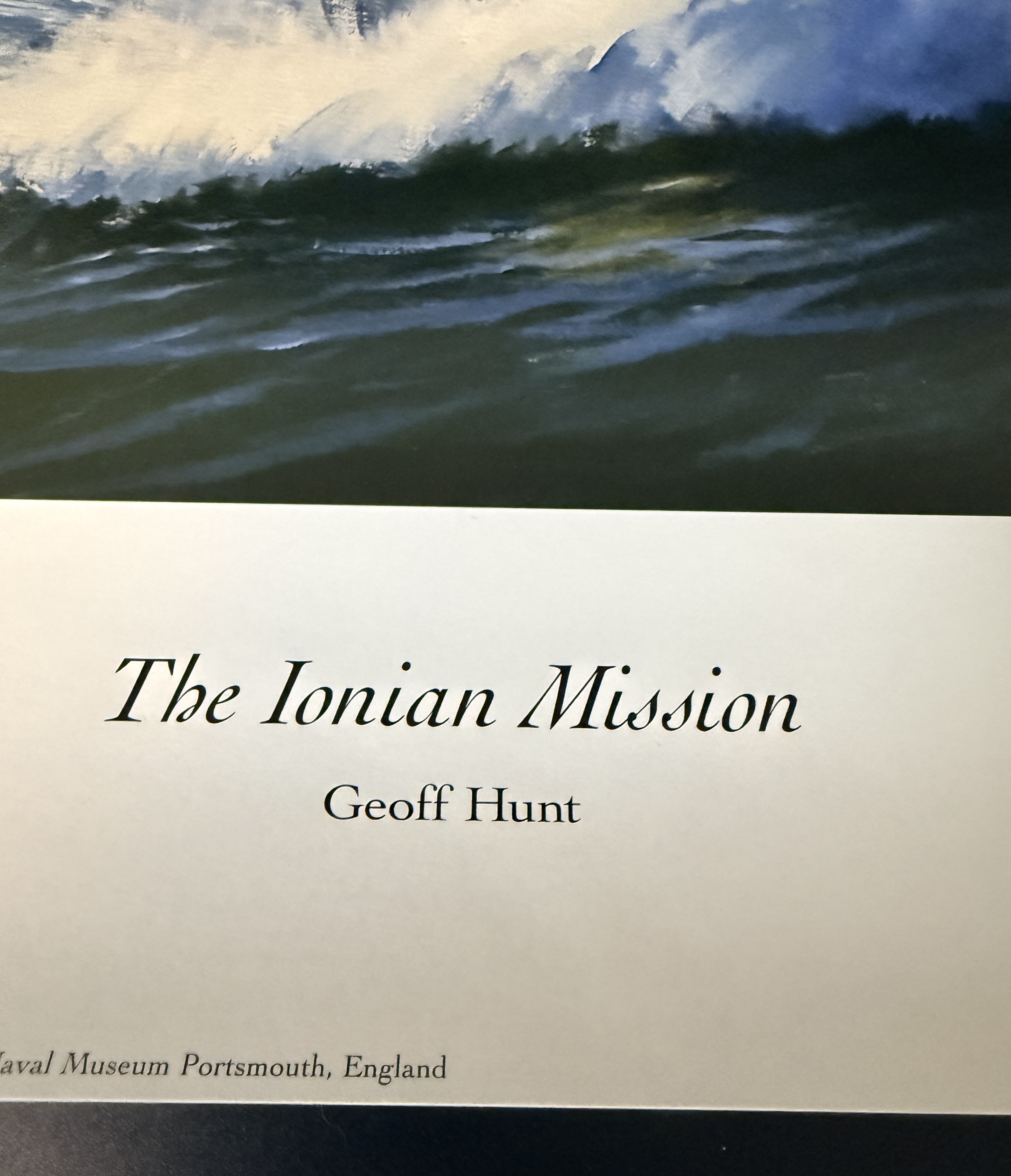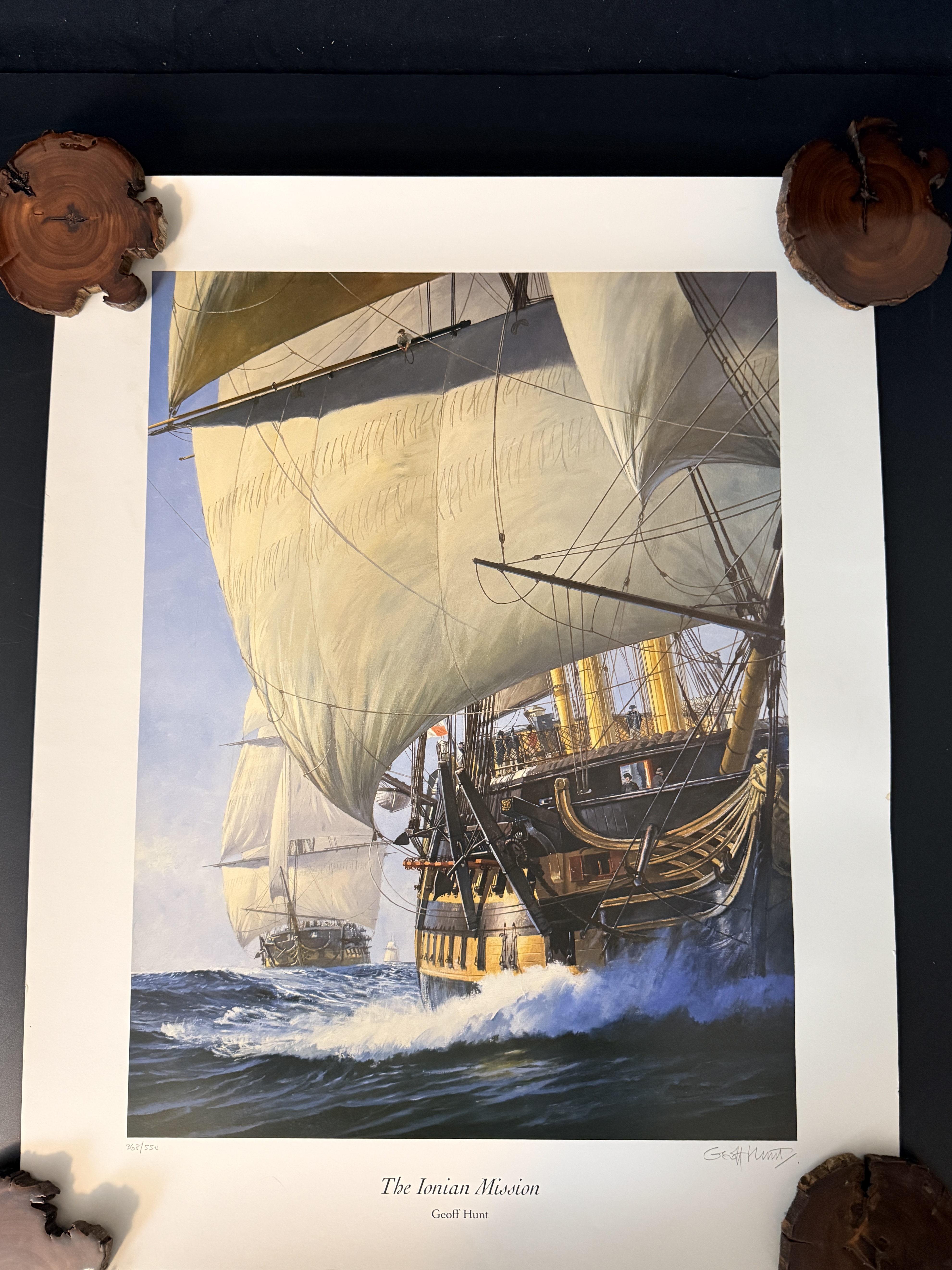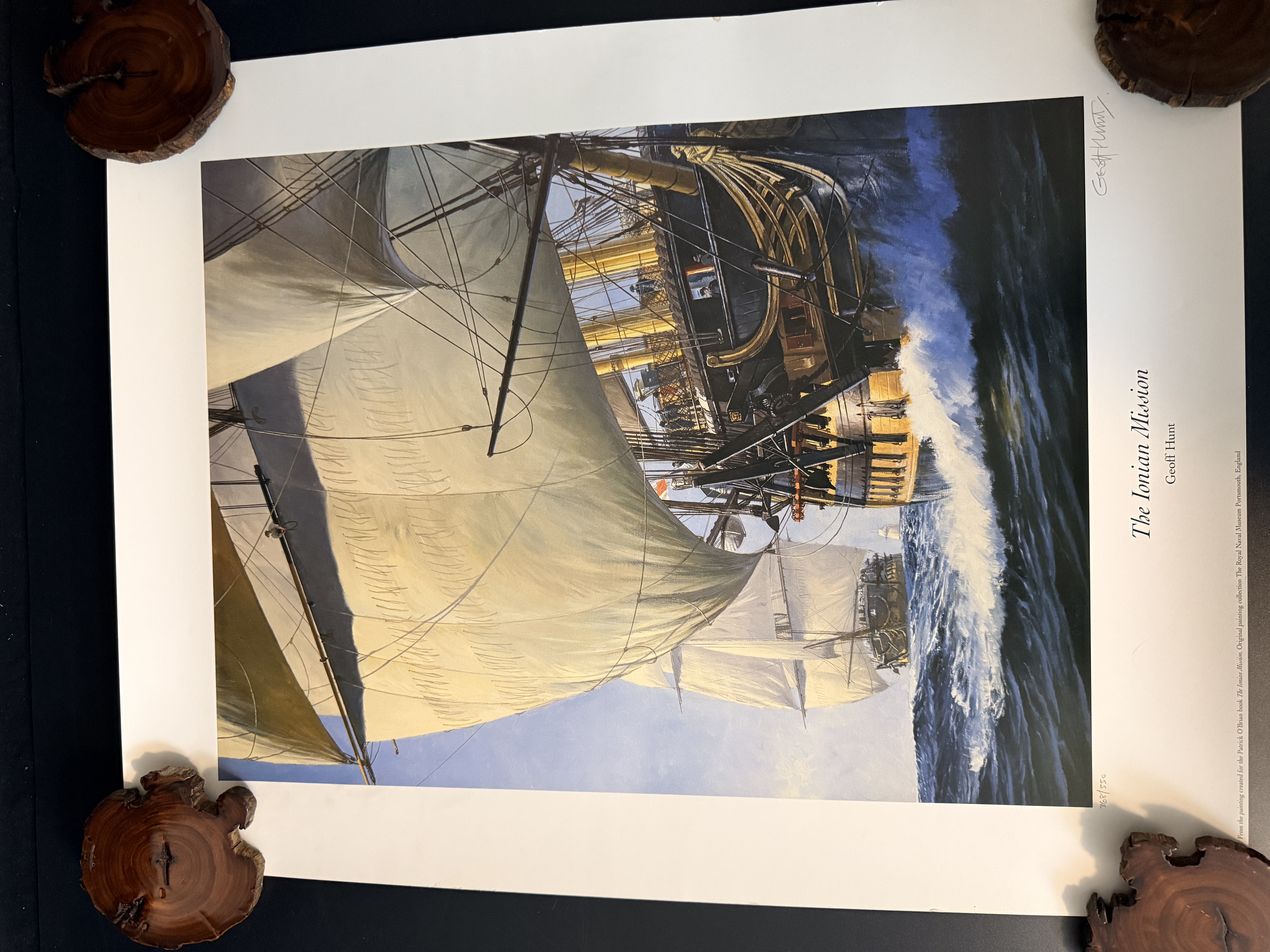 A limited edition marine art print by artist Geoff Hunt titled The Ionian Mission. This work depicts historical sailing vessels navigating a swelling sea and serves as a reproduction of the painting originally created for the cover of Patrick O’Brian’s novel of the same name. The original painting is held in the collection of The Royal Naval Museum in Portsmouth, England. The print features a handwritten edition number of 368/550 in the bottom left margin and a corresponding graphite signature by the artist in the bottom right. Printed text along the bottom provides publication details, including a 1997 copyright by Mystic Seaport. The item is presented on heavy art paper.