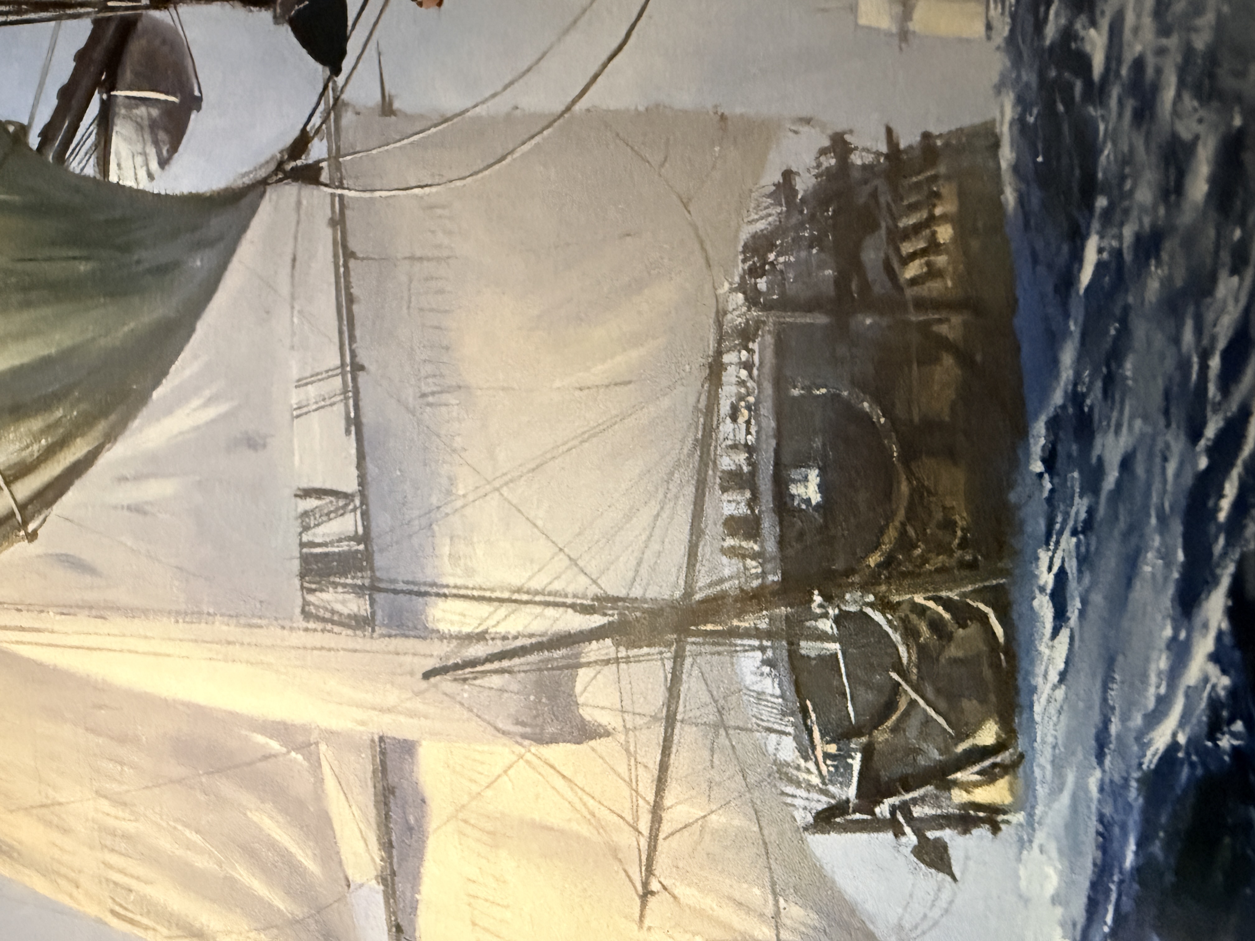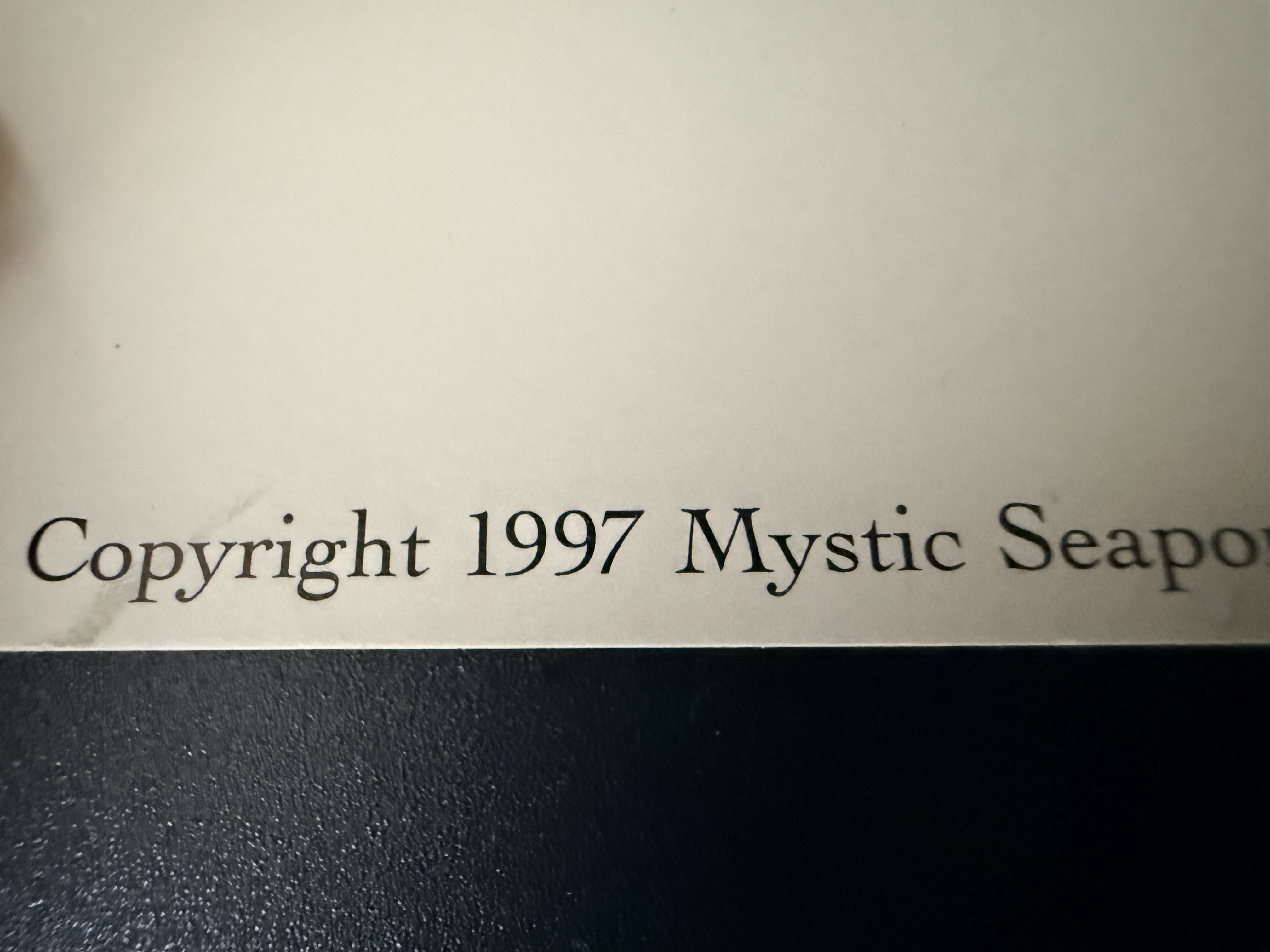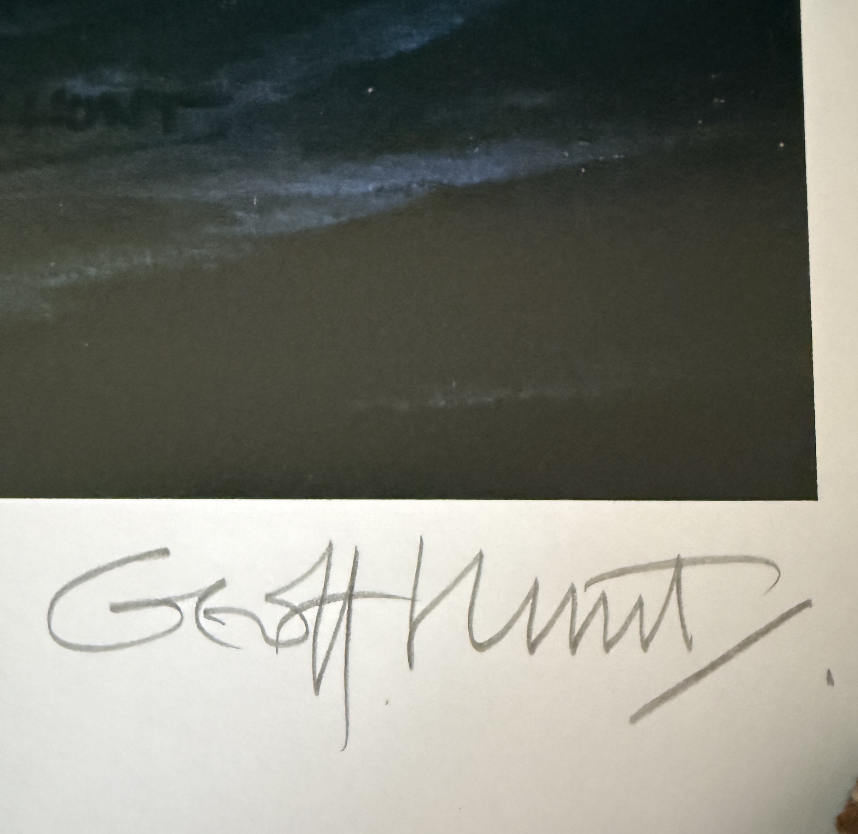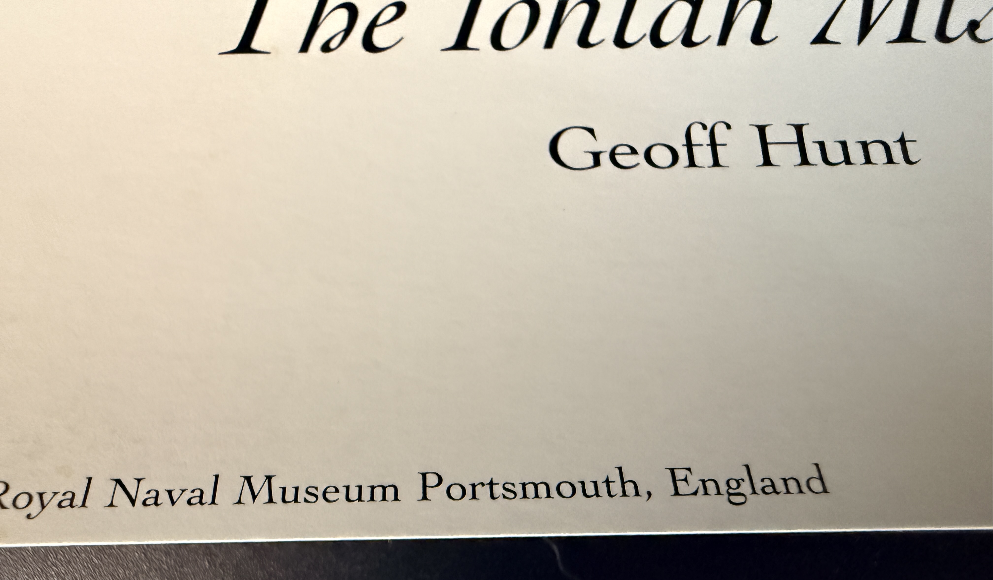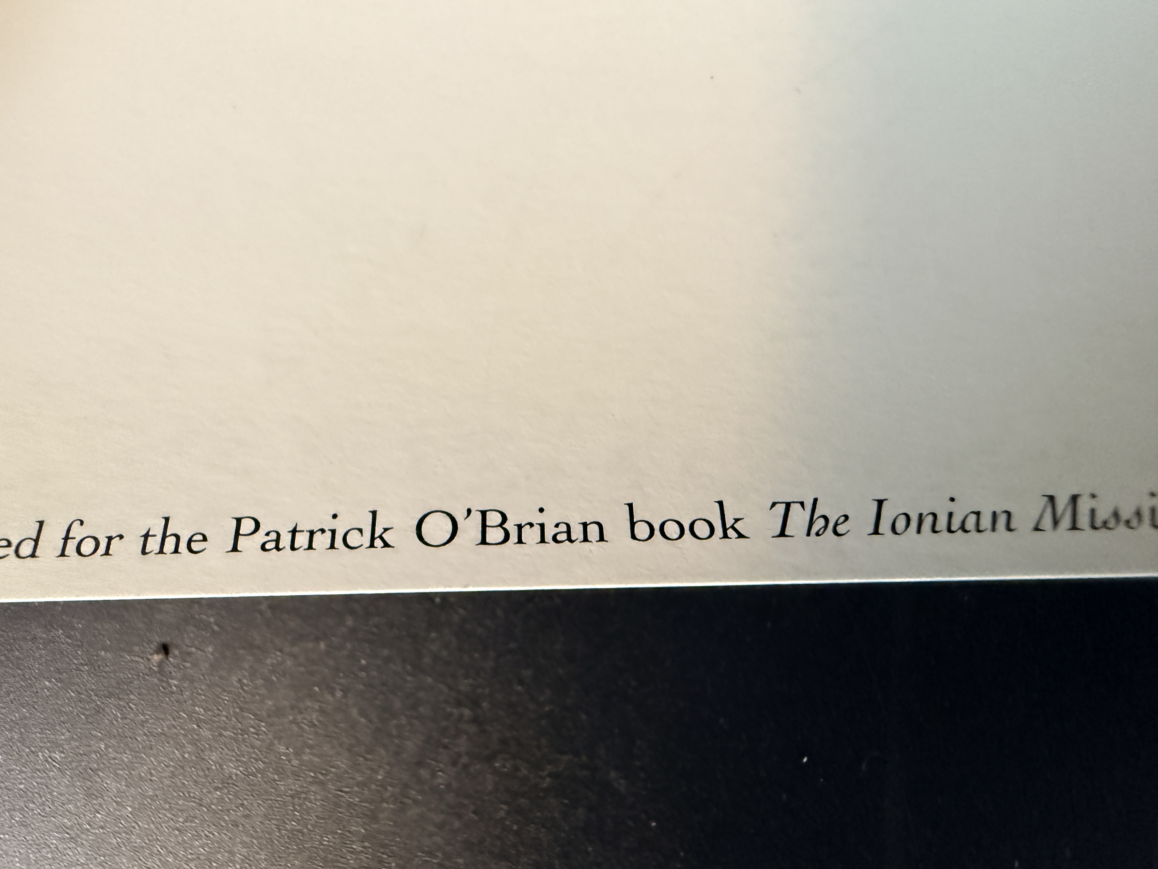 A limited edition marine art print by artist Geoff Hunt titled The Ionian Mission. This work depicts historical sailing vessels navigating a swelling sea and serves as a reproduction of the painting originally created for the cover of Patrick O’Brian’s novel of the same name. The original painting is held in the collection of The Royal Naval Museum in Portsmouth, England. The print features a handwritten edition number of 368/550 in the bottom left margin and a corresponding graphite signature by the artist in the bottom right. Printed text along the bottom provides publication details, including a 1997 copyright by Mystic Seaport. The item is presented on heavy art paper.