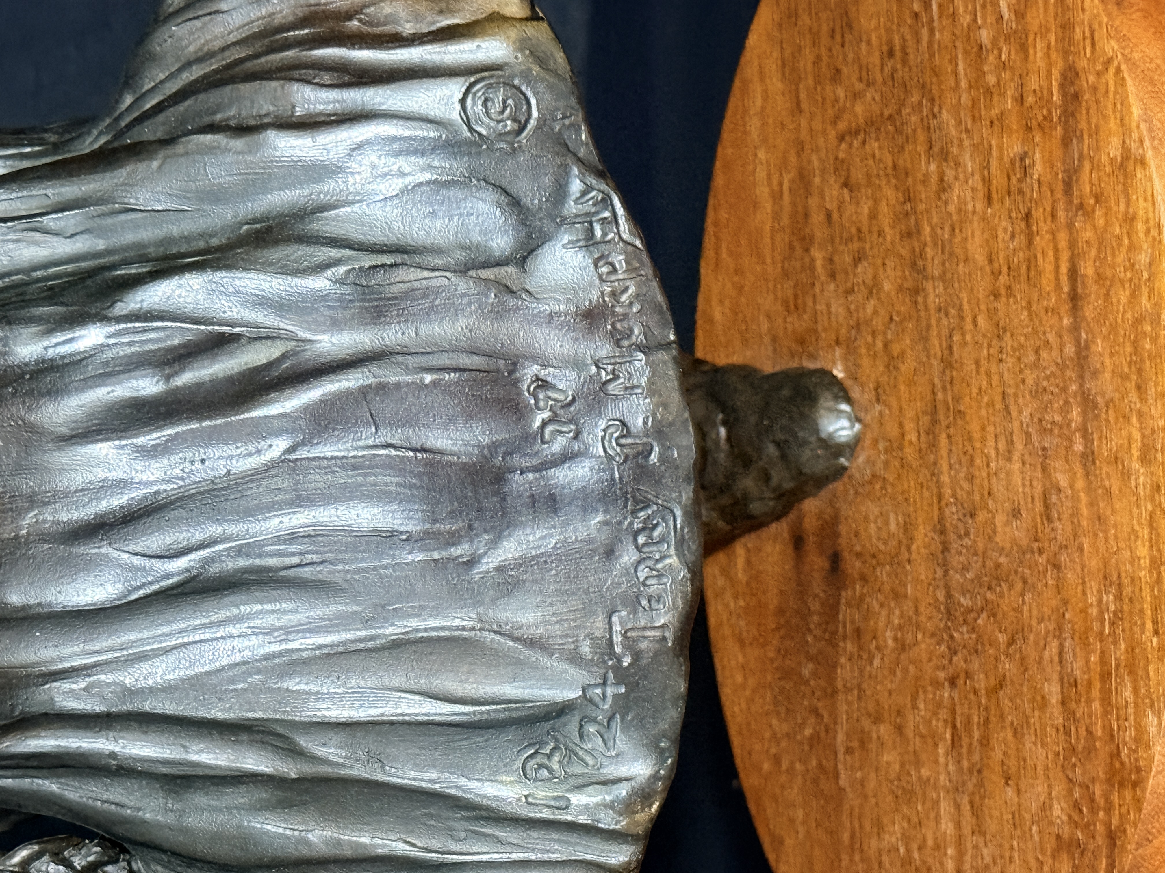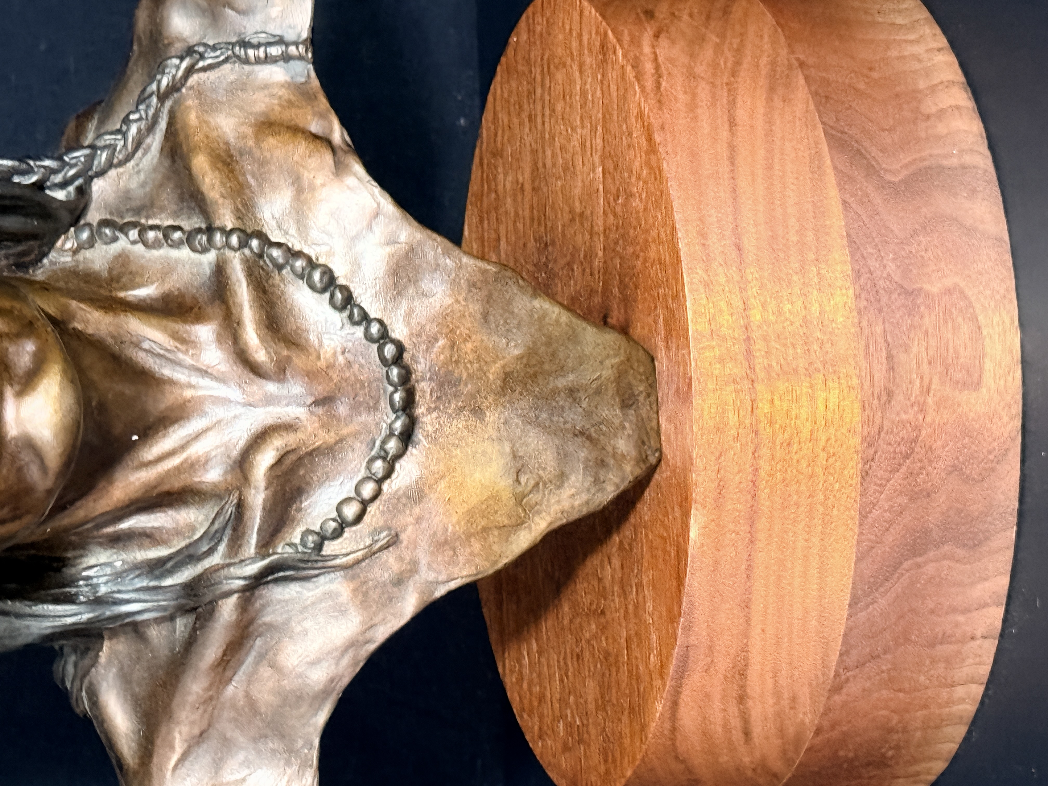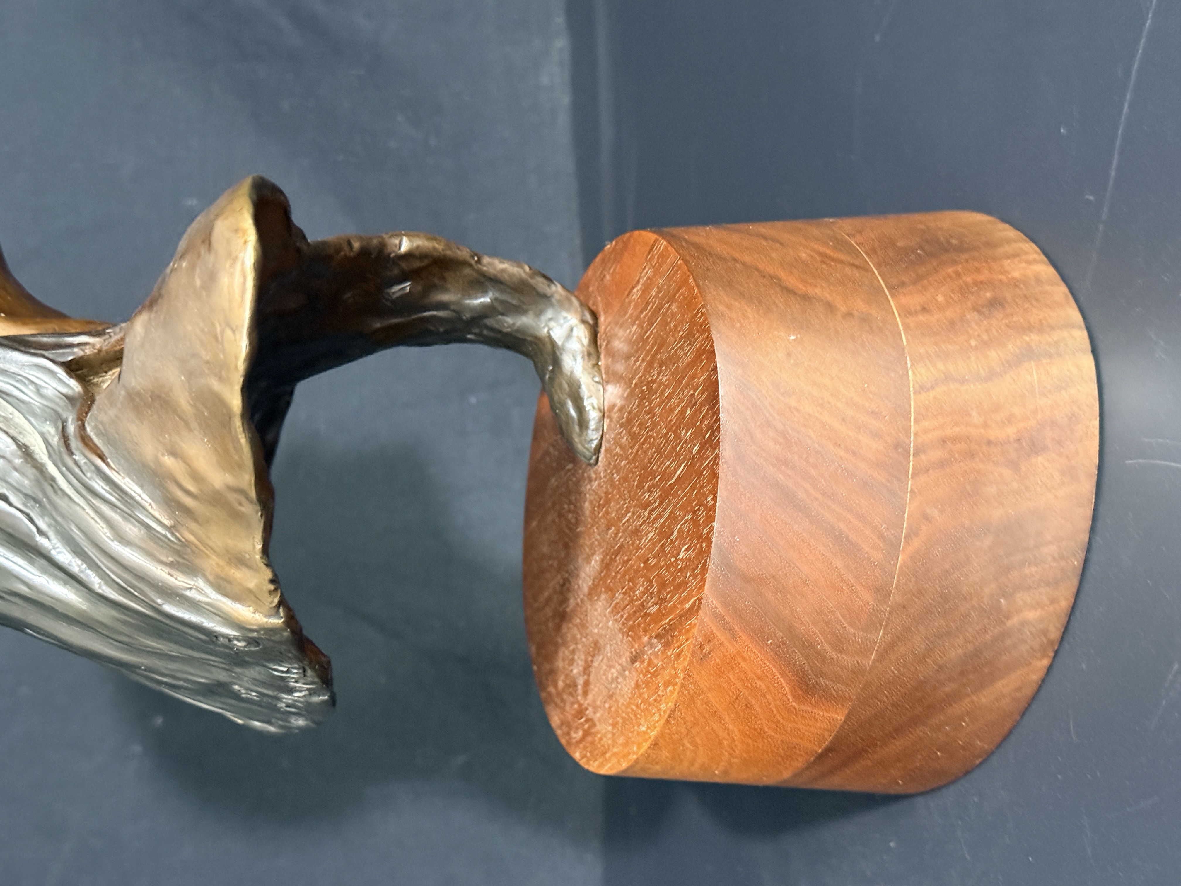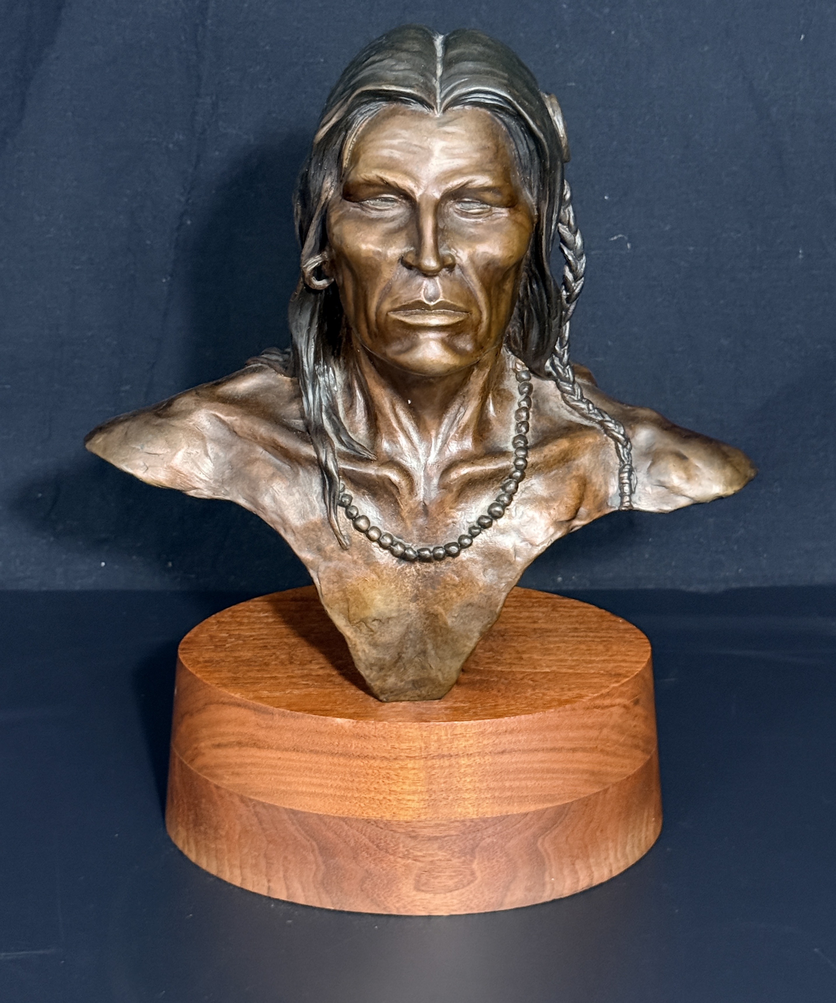 The sculpture is in good condition with no visible signs of repair or restoration. The patina is well-preserved, and the wood base shows minor surface wear consistent with age. Art is from a clean smoke free home.