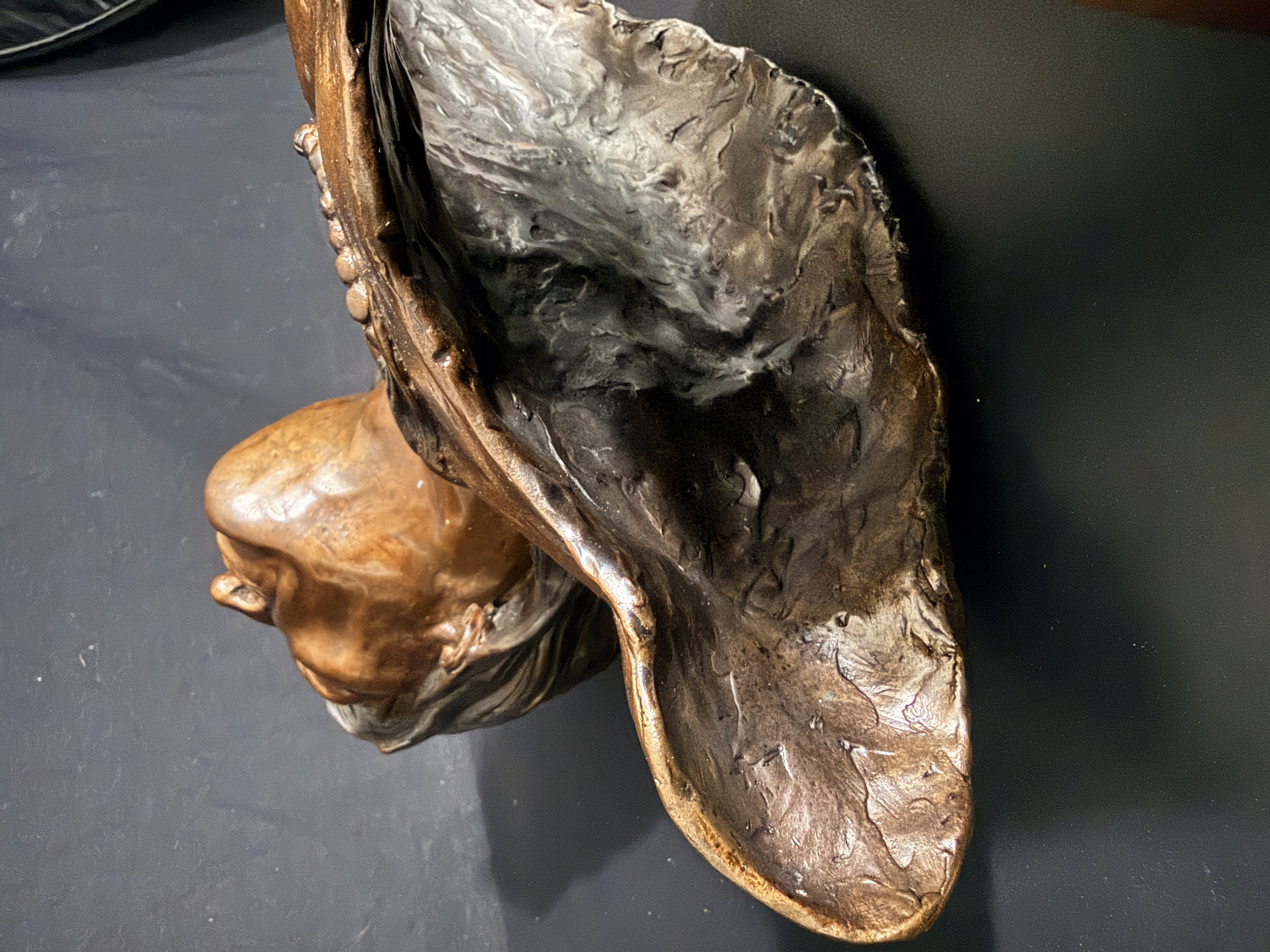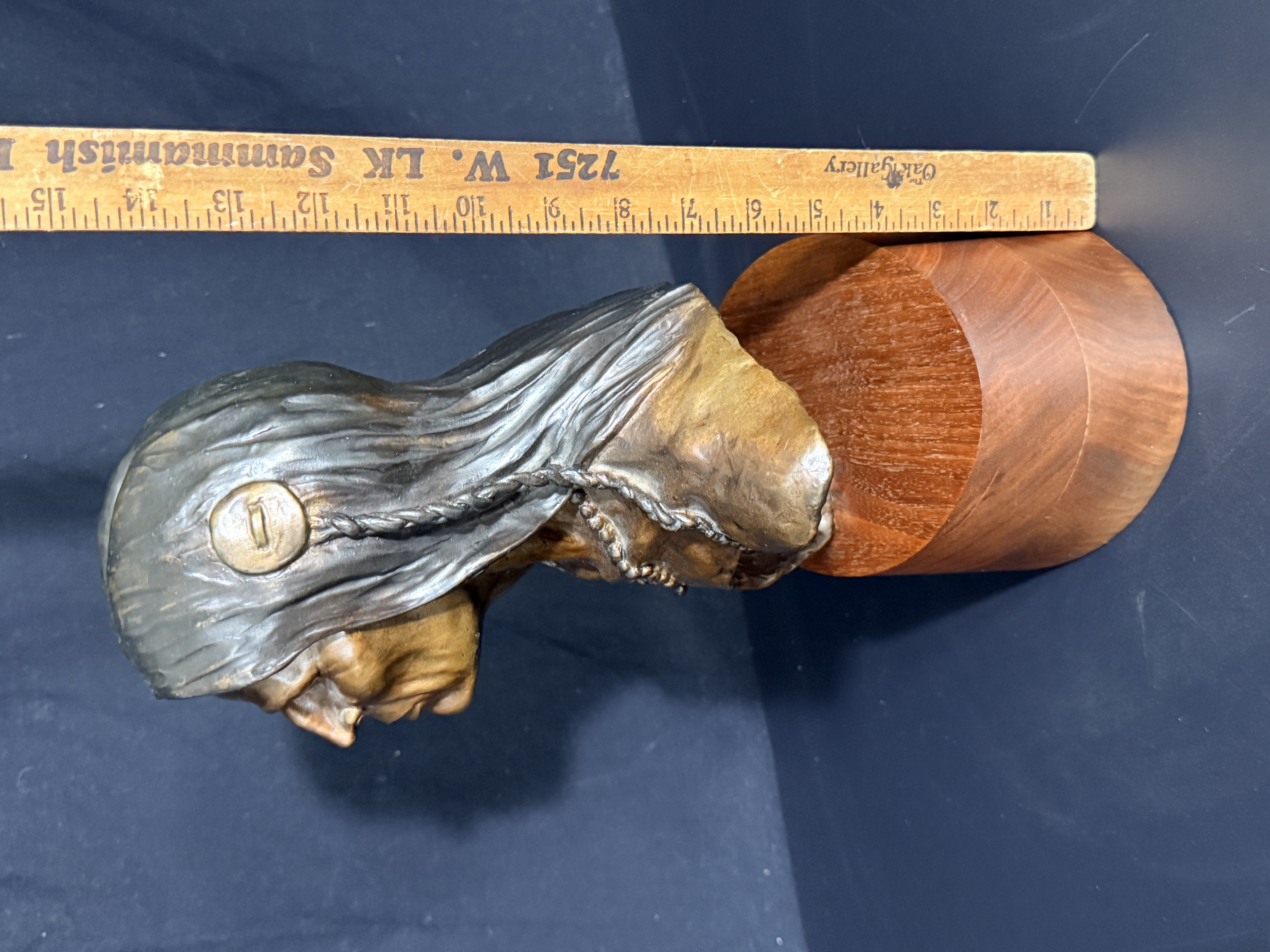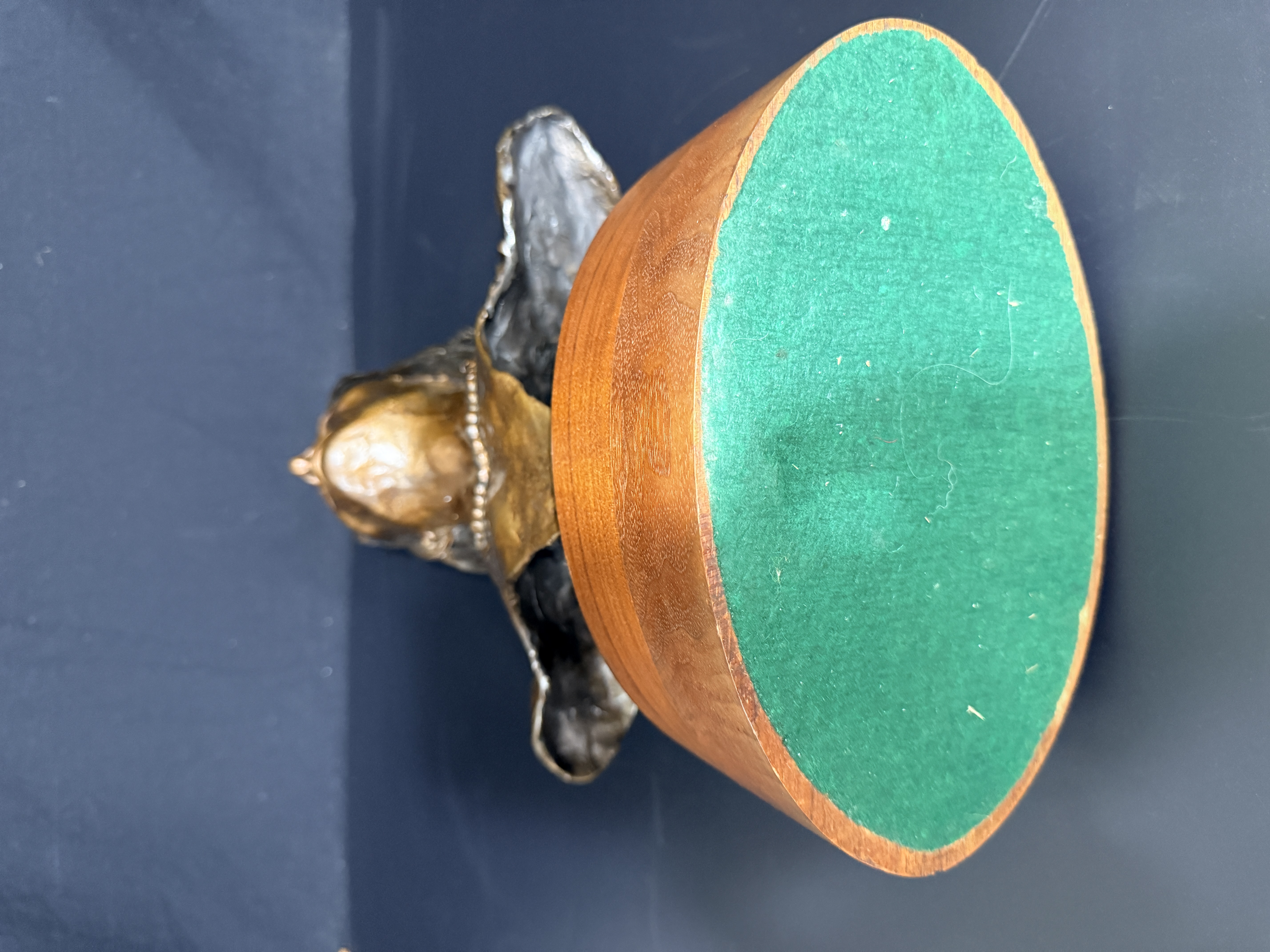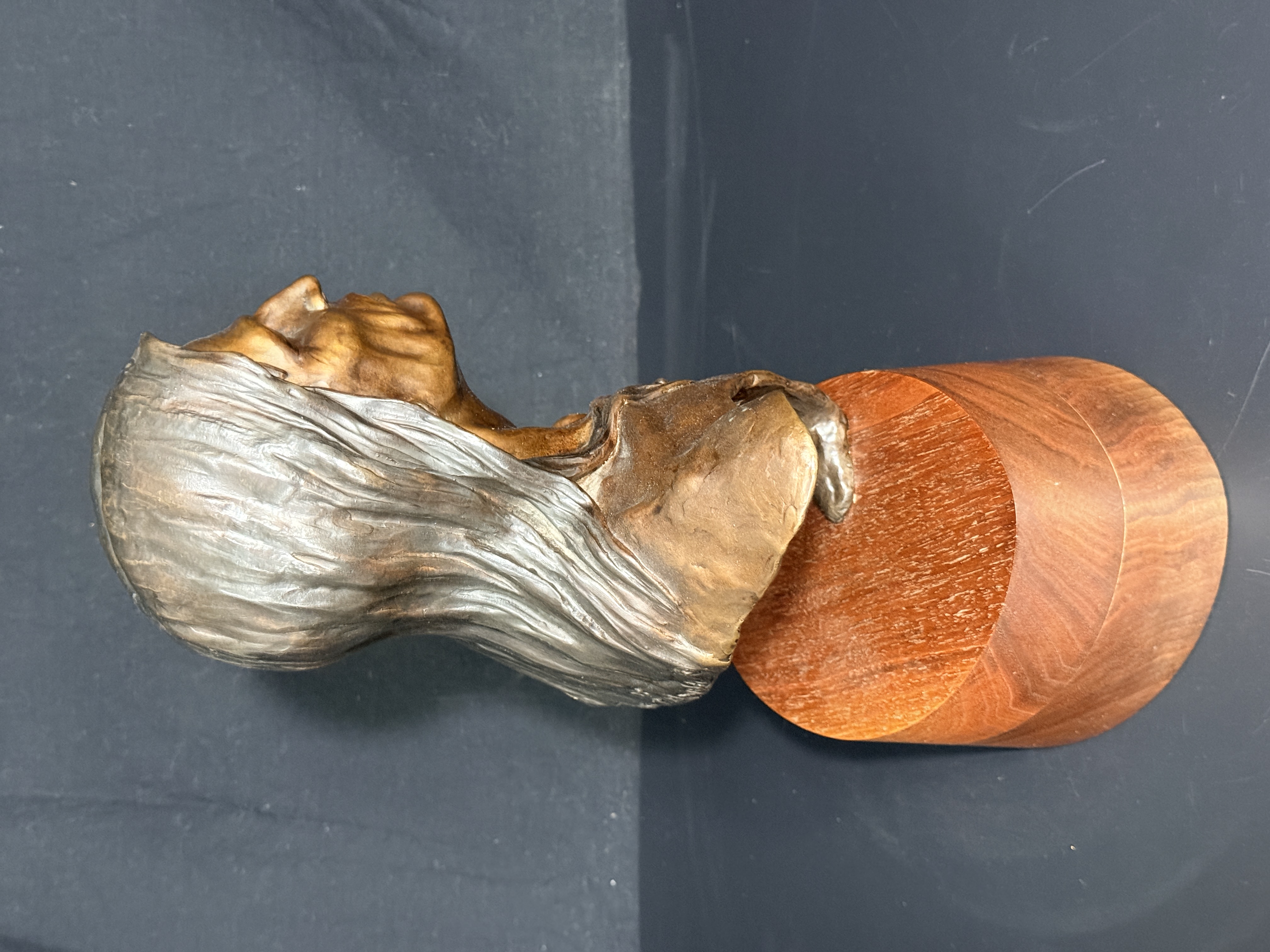 The sculpture is in good condition with no visible signs of repair or restoration. The patina is well-preserved, and the wood base shows minor surface wear consistent with age. Art is from a clean smoke free home.