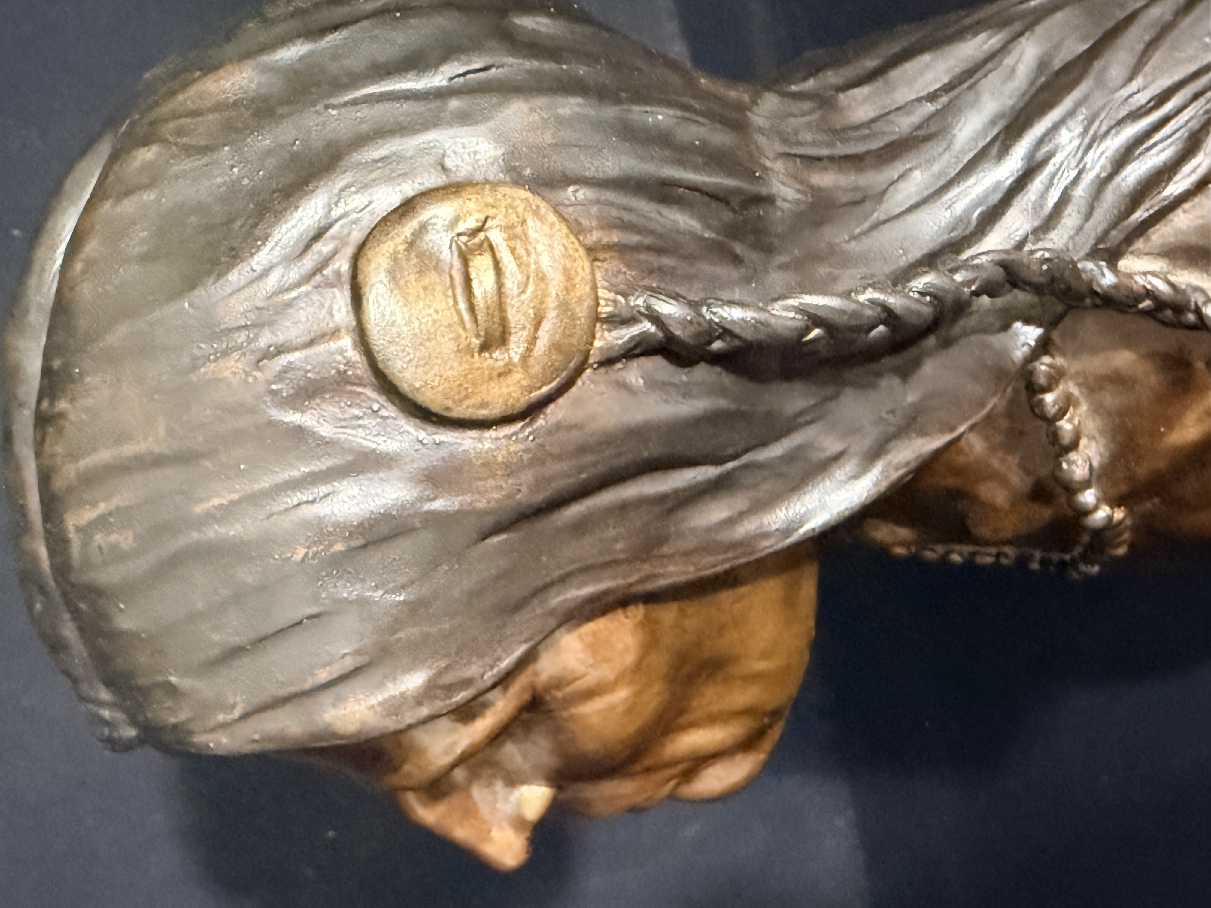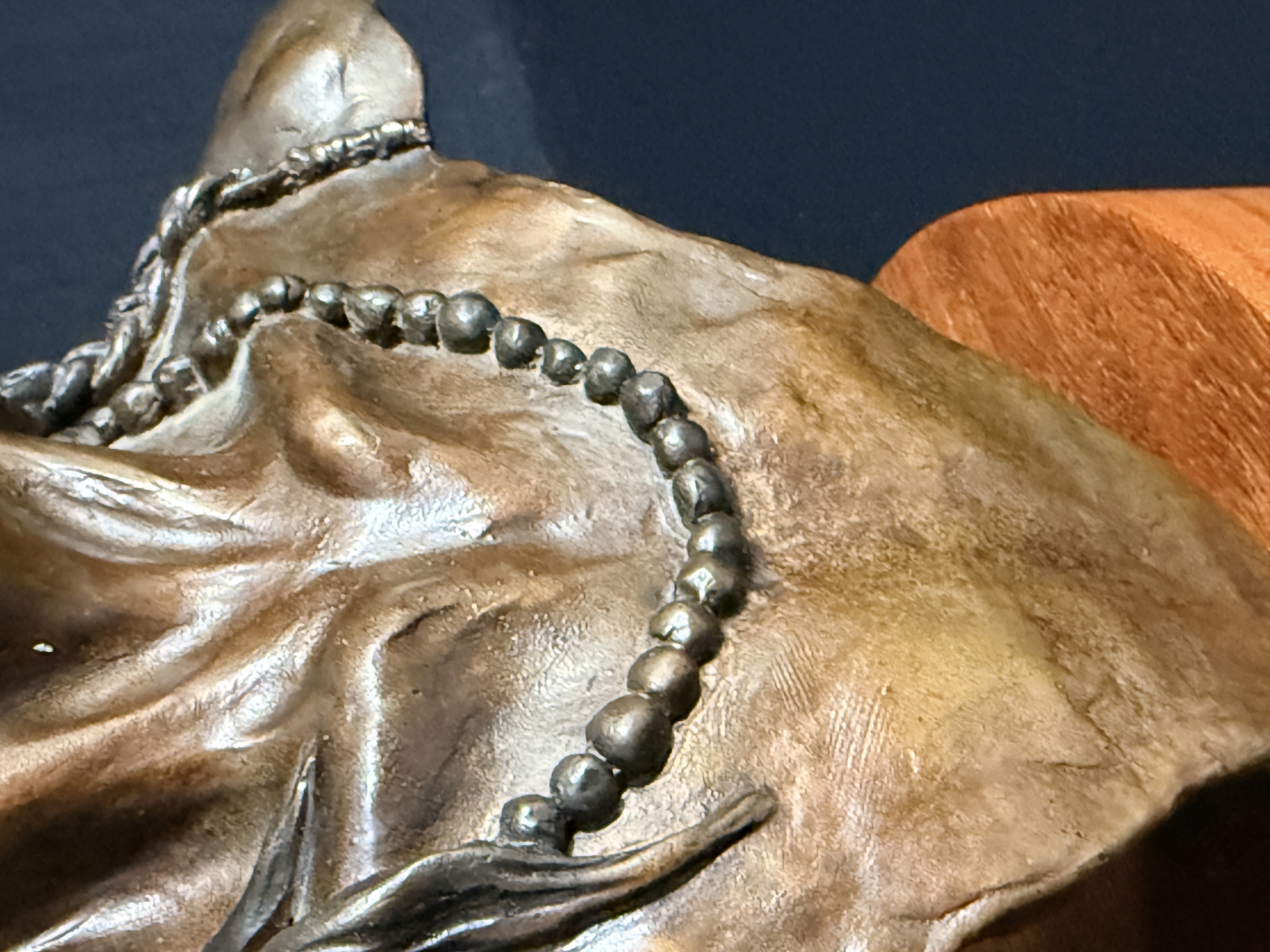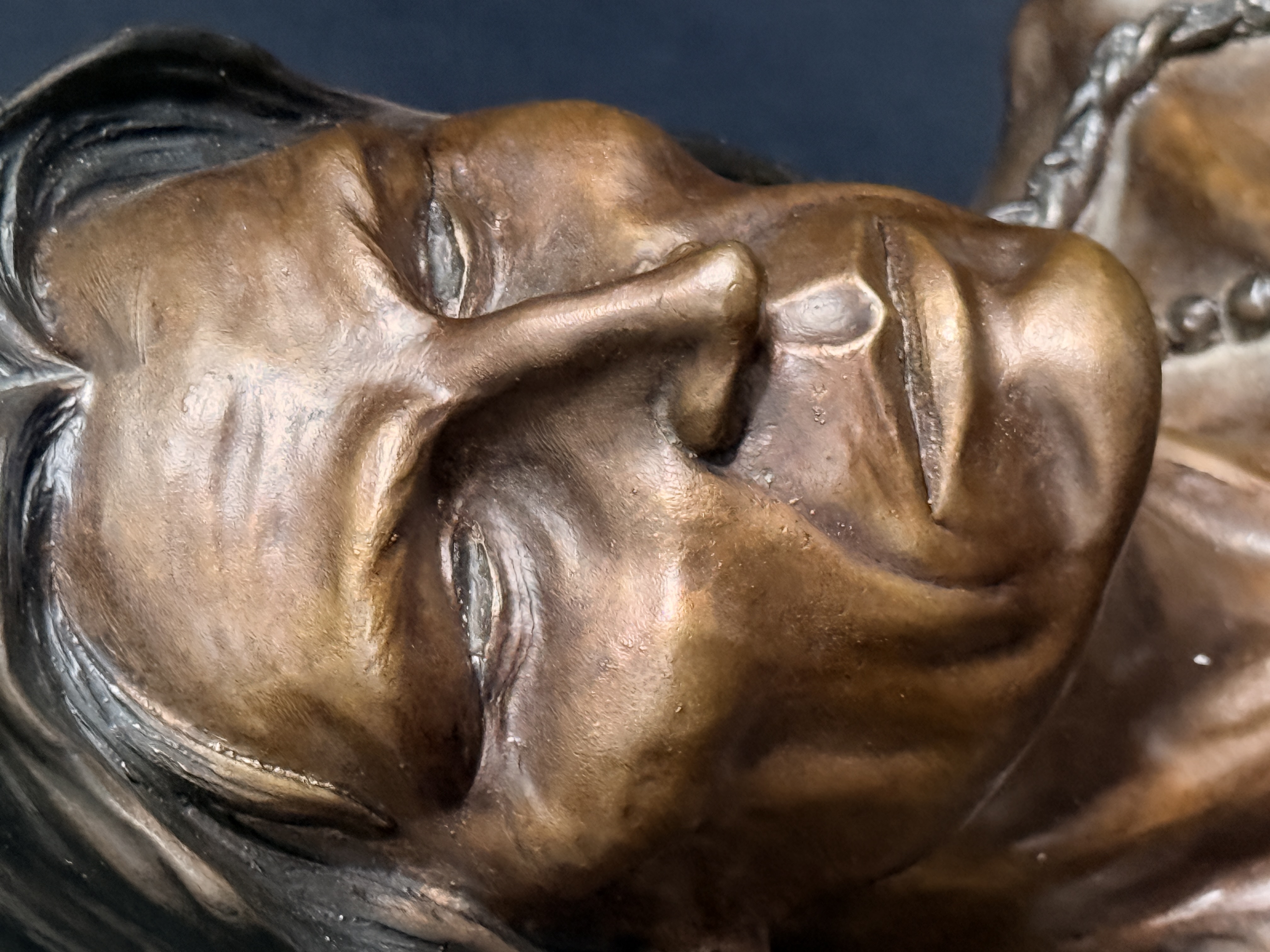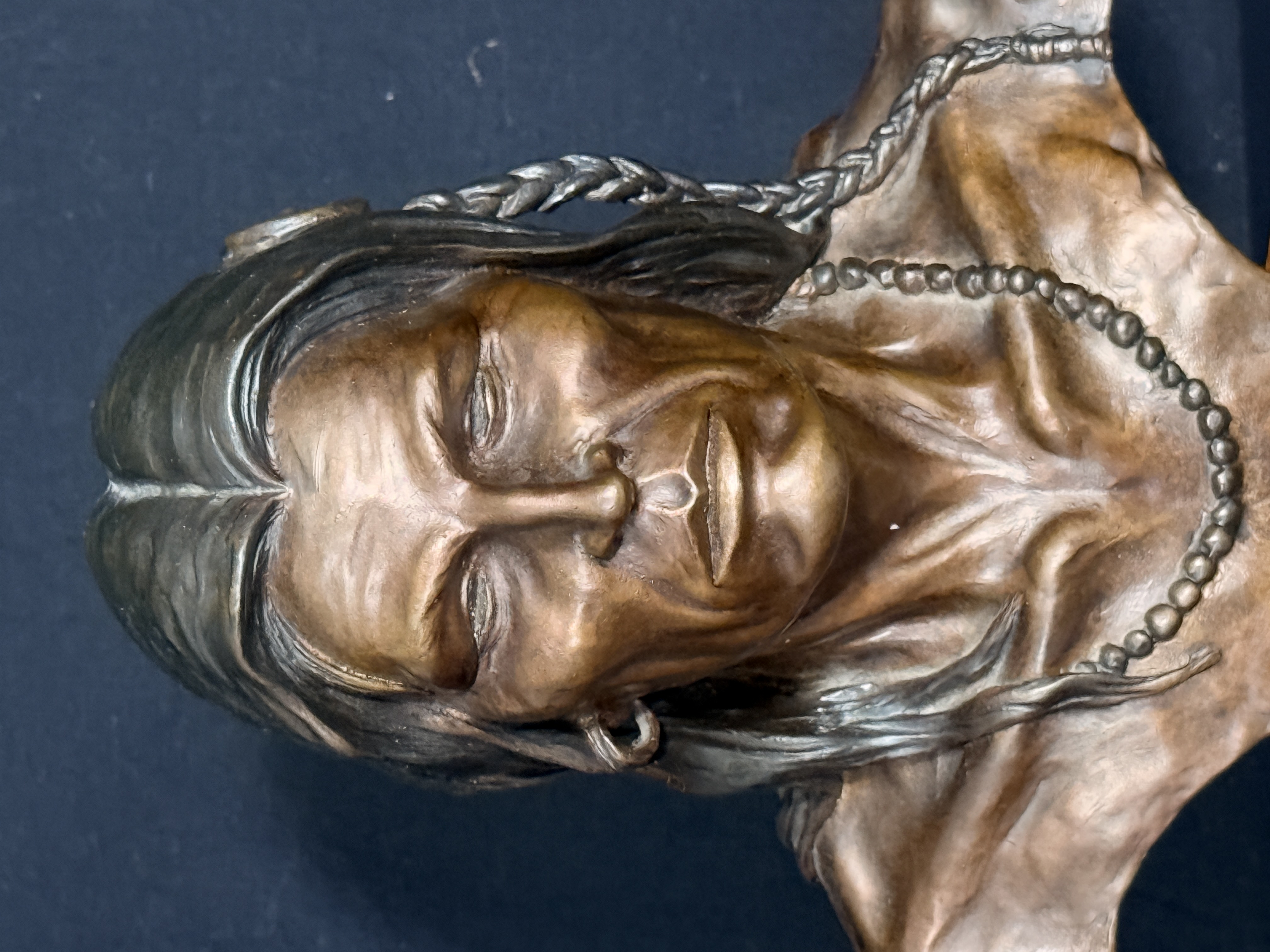 The sculpture is in good condition with no visible signs of repair or restoration. The patina is well-preserved, and the wood base shows minor surface wear consistent with age. Art is from a clean smoke free home.