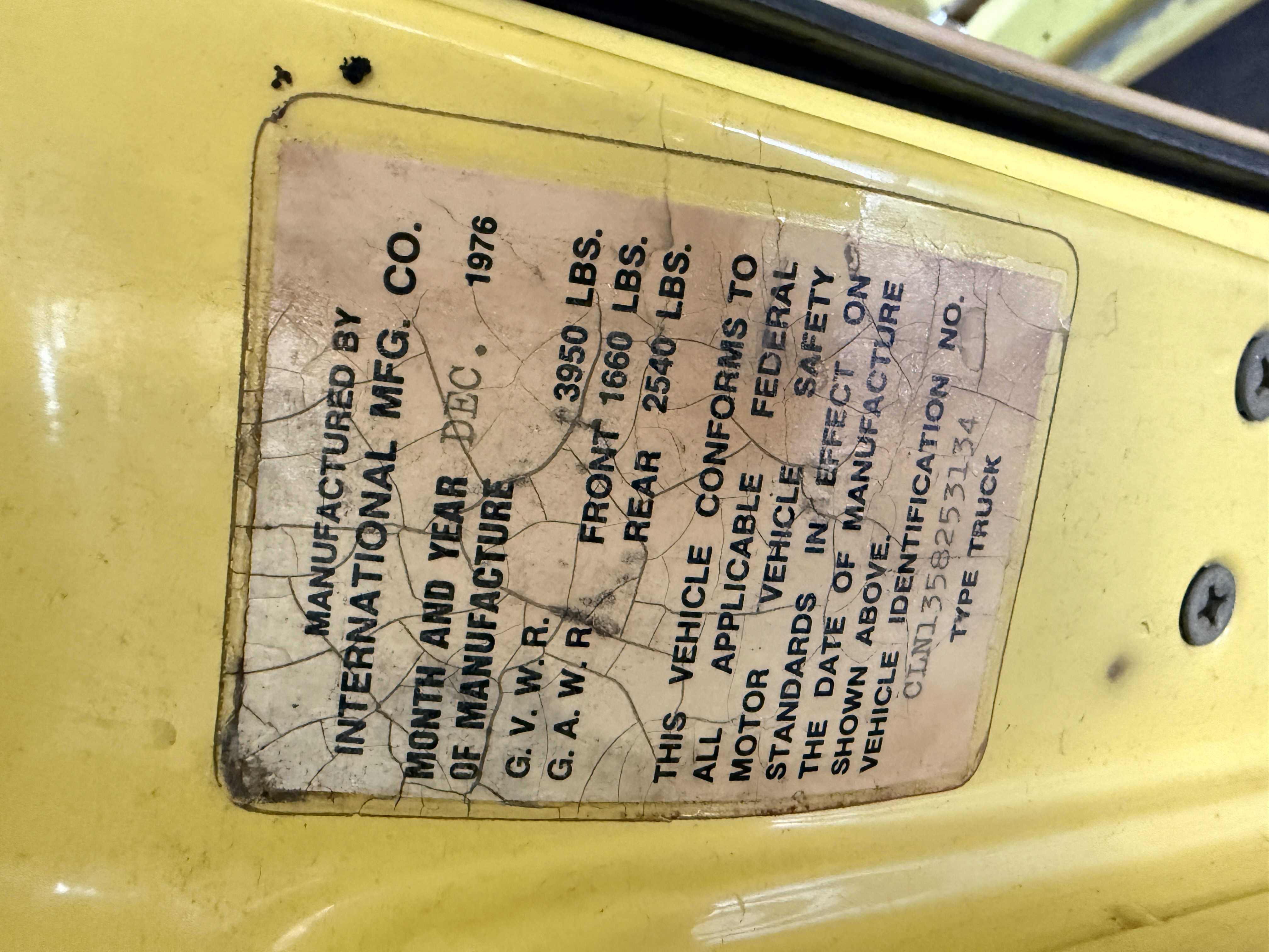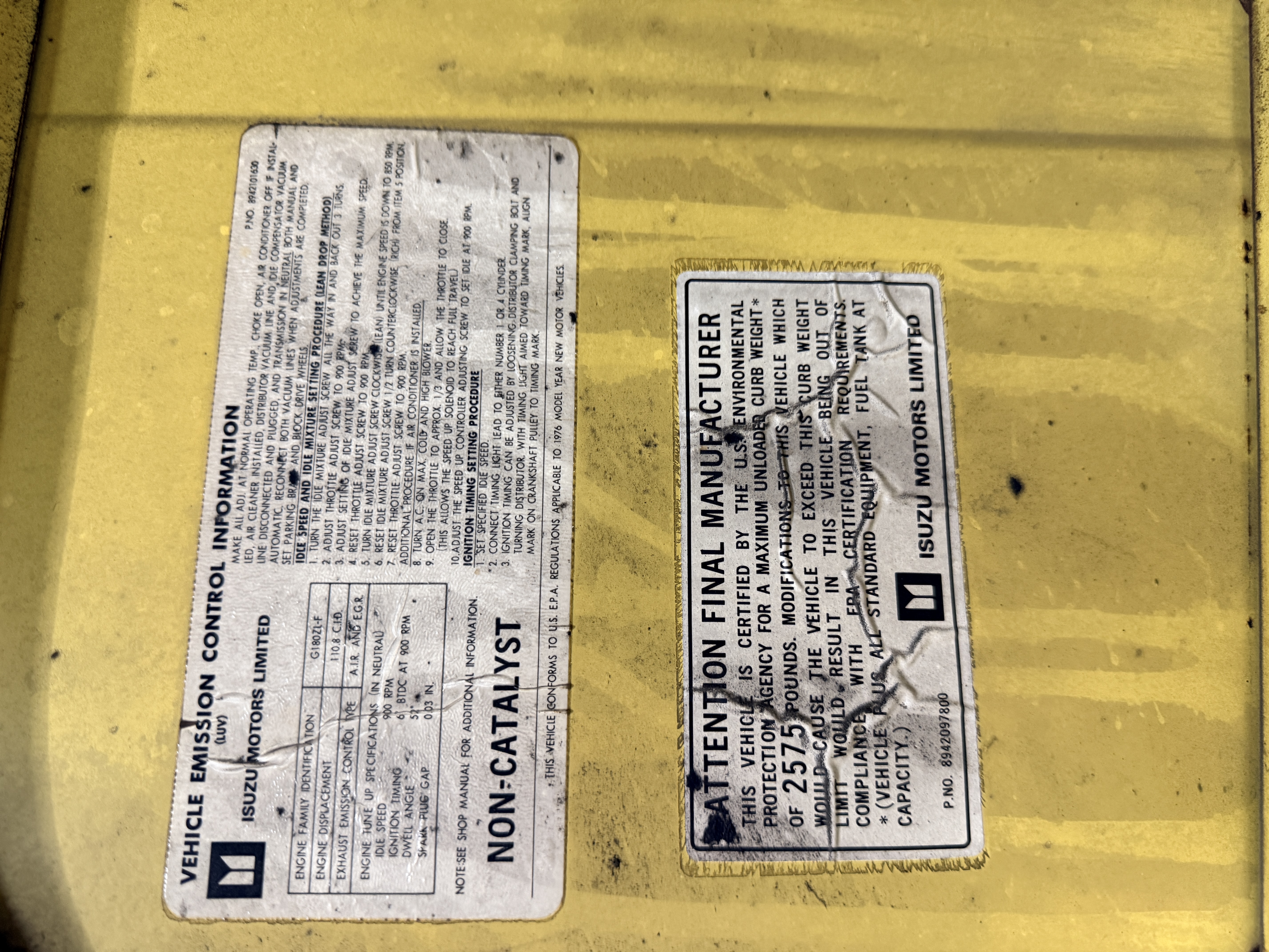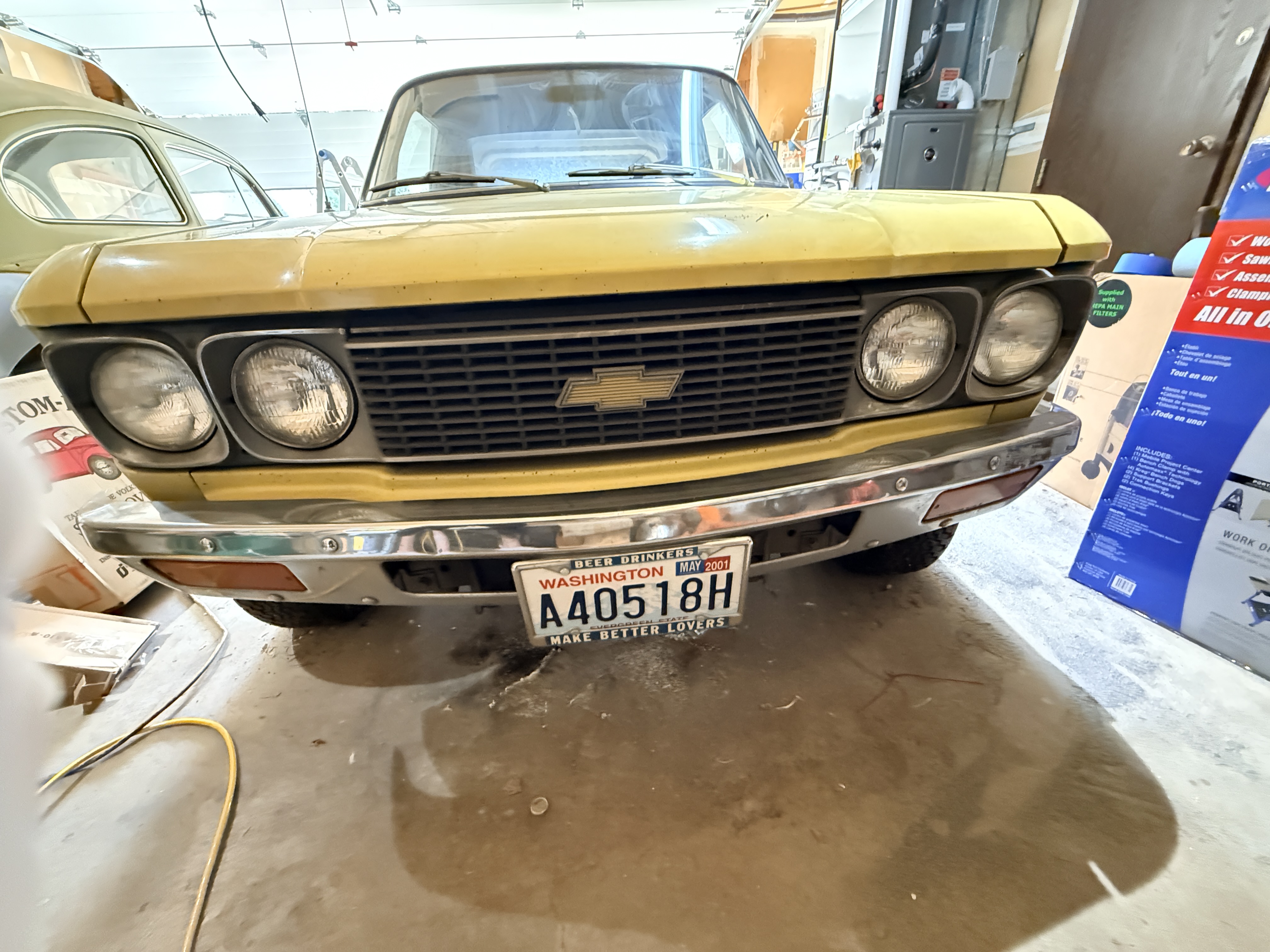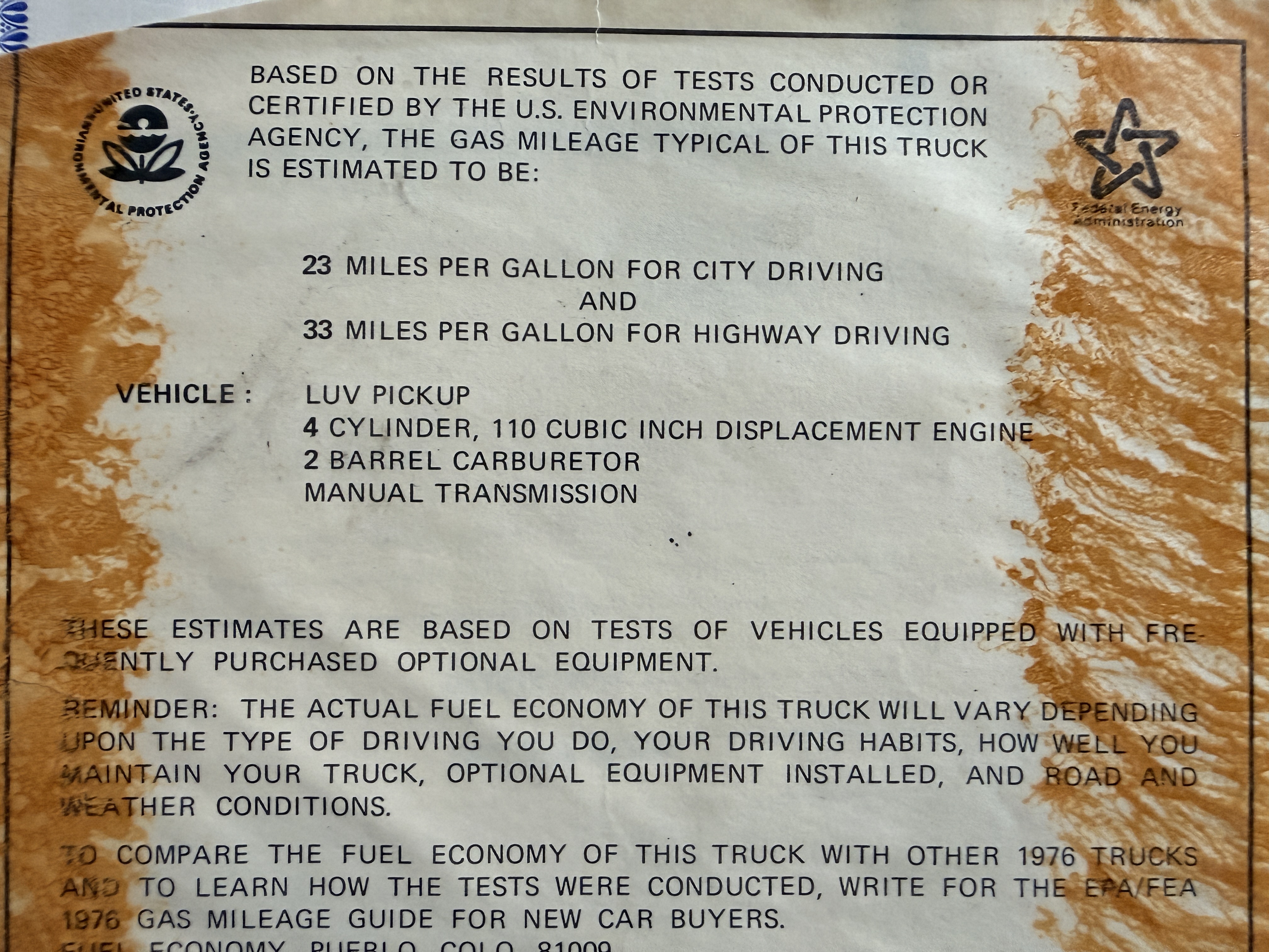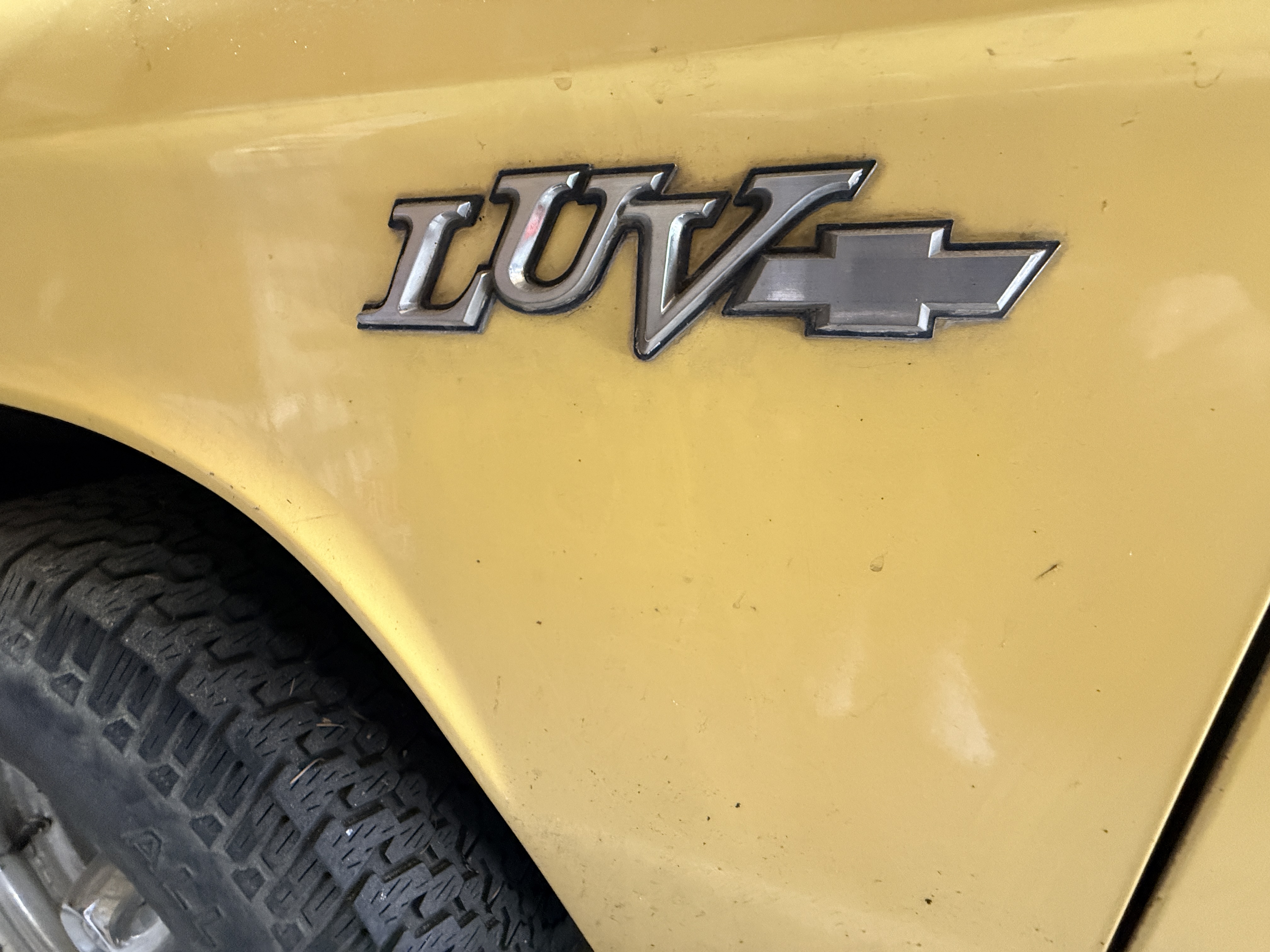 Garaged – This 1976 Chevrolet LUV is a first-generation light utility vehicle manufactured by Isuzu Motors Ltd. in Japan for Chevrolet. The vehicle is finished in yellow and features a color-matched custom integrated canopy manufactured by International Mfg. Co. in December 1976. The exterior is equipped with a chrome front bumper, a quad-headlight grille with a central Chevrolet bowtie emblem, LUV fender badges, and a tailgate featuring black Chevrolet block lettering. It rides on steel wheels fitted with Supreme star-logo center caps and Yokohama All Season M+S tires. The interior is trimmed in tan and brown vinyl and features a bench seat, a four-speed manual transmission with a floor-mounted shifter, and a Sanyo radio with a full auto eject cassette player. The dashboard includes a 100-mph speedometer with a five-digit odometer and gauges for fuel level and coolant temperature. Identification is provided by a chassis plate in the door jamb listing VIN CLN1358253134 and a secondary manufacturer decal from International Mfg. Co. The lot includes two keys and vintage Washington state license plates.