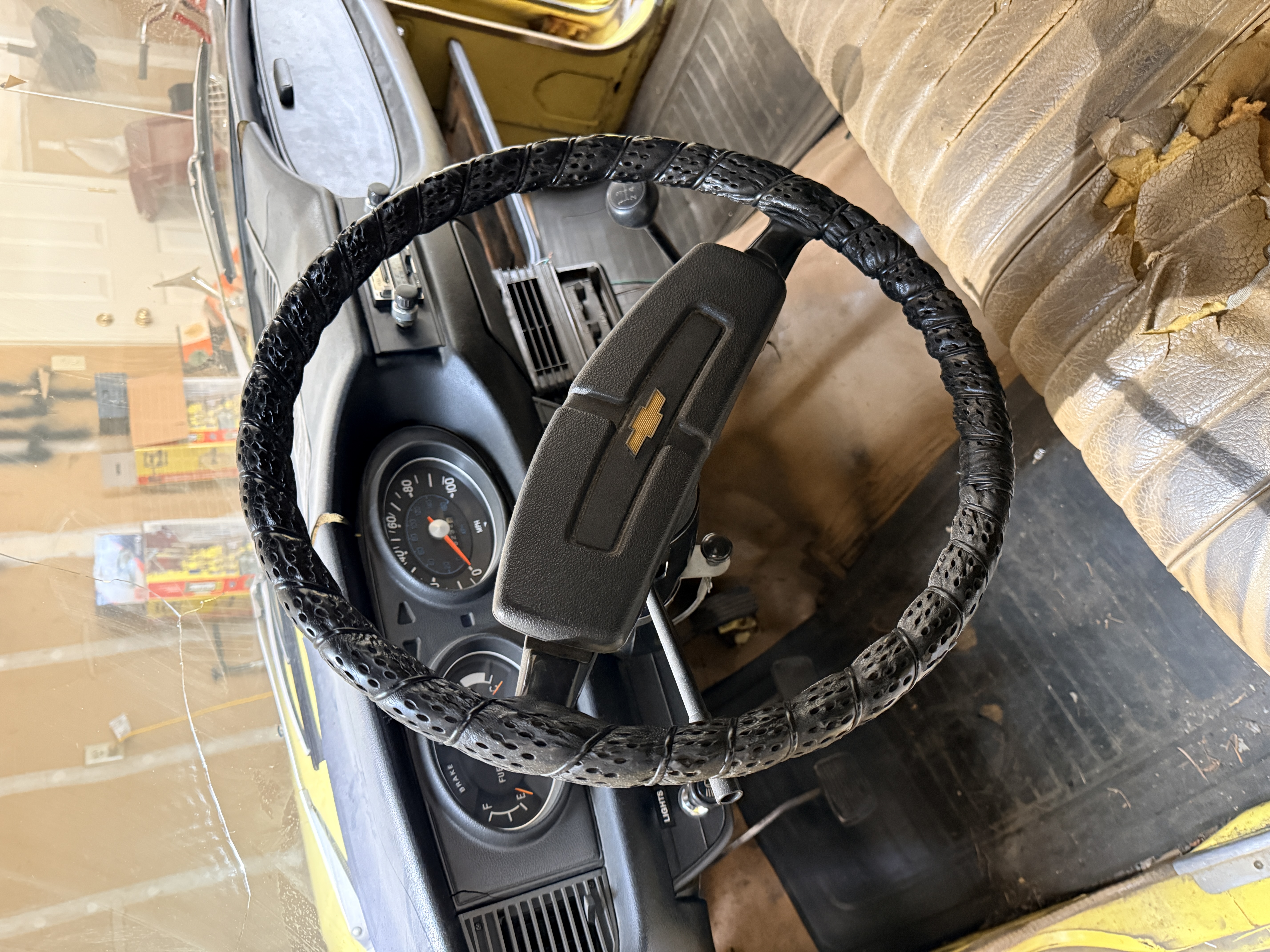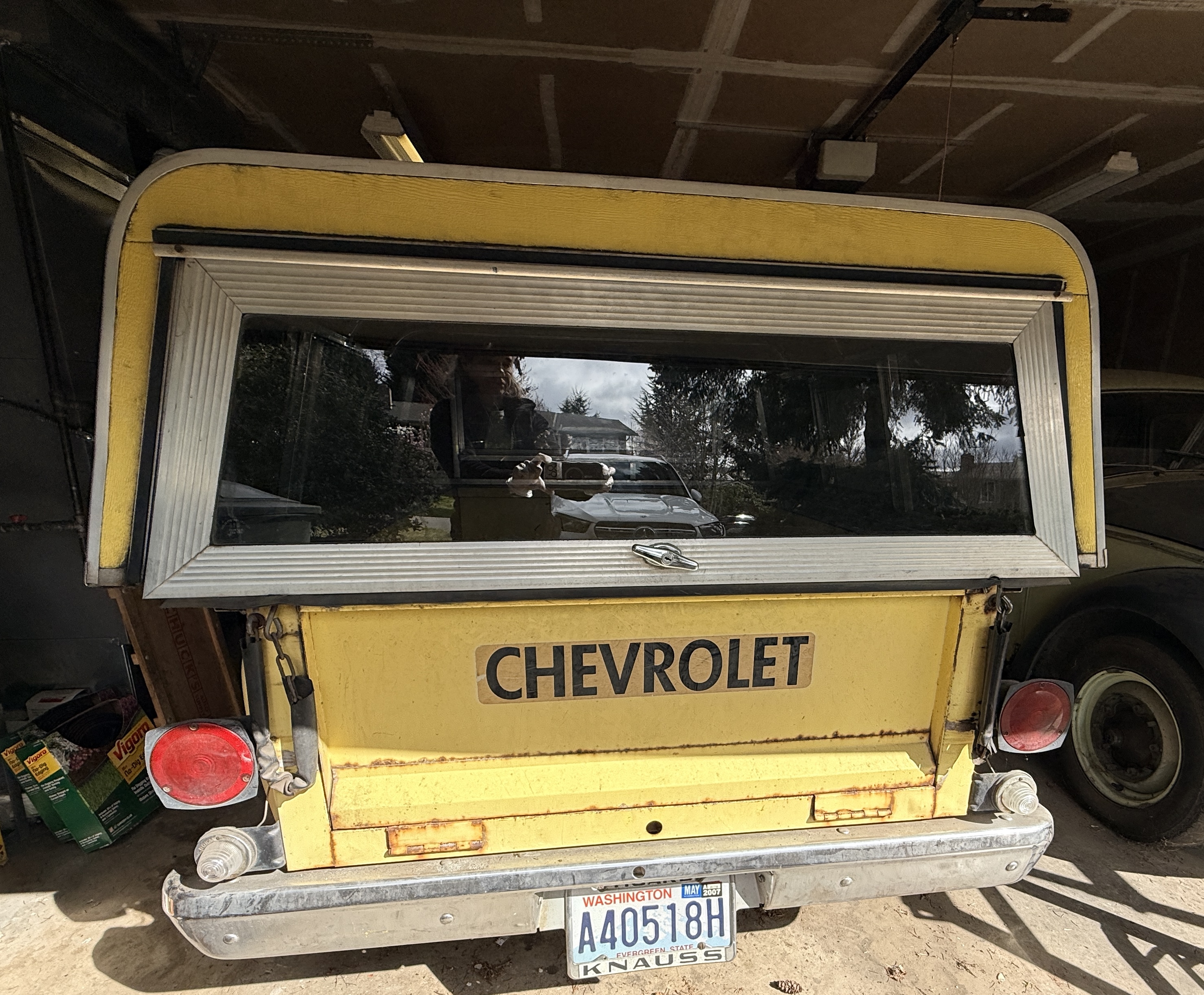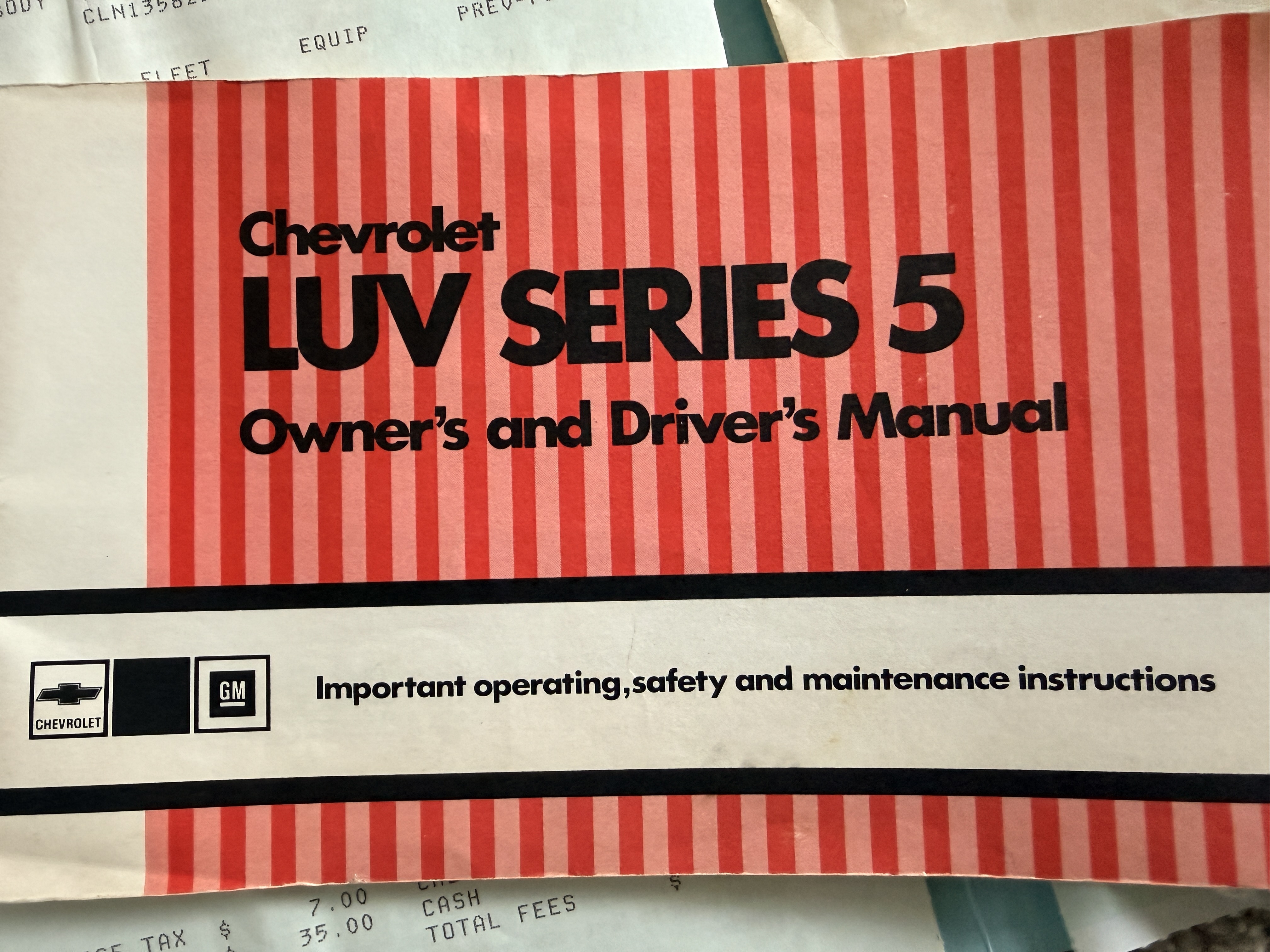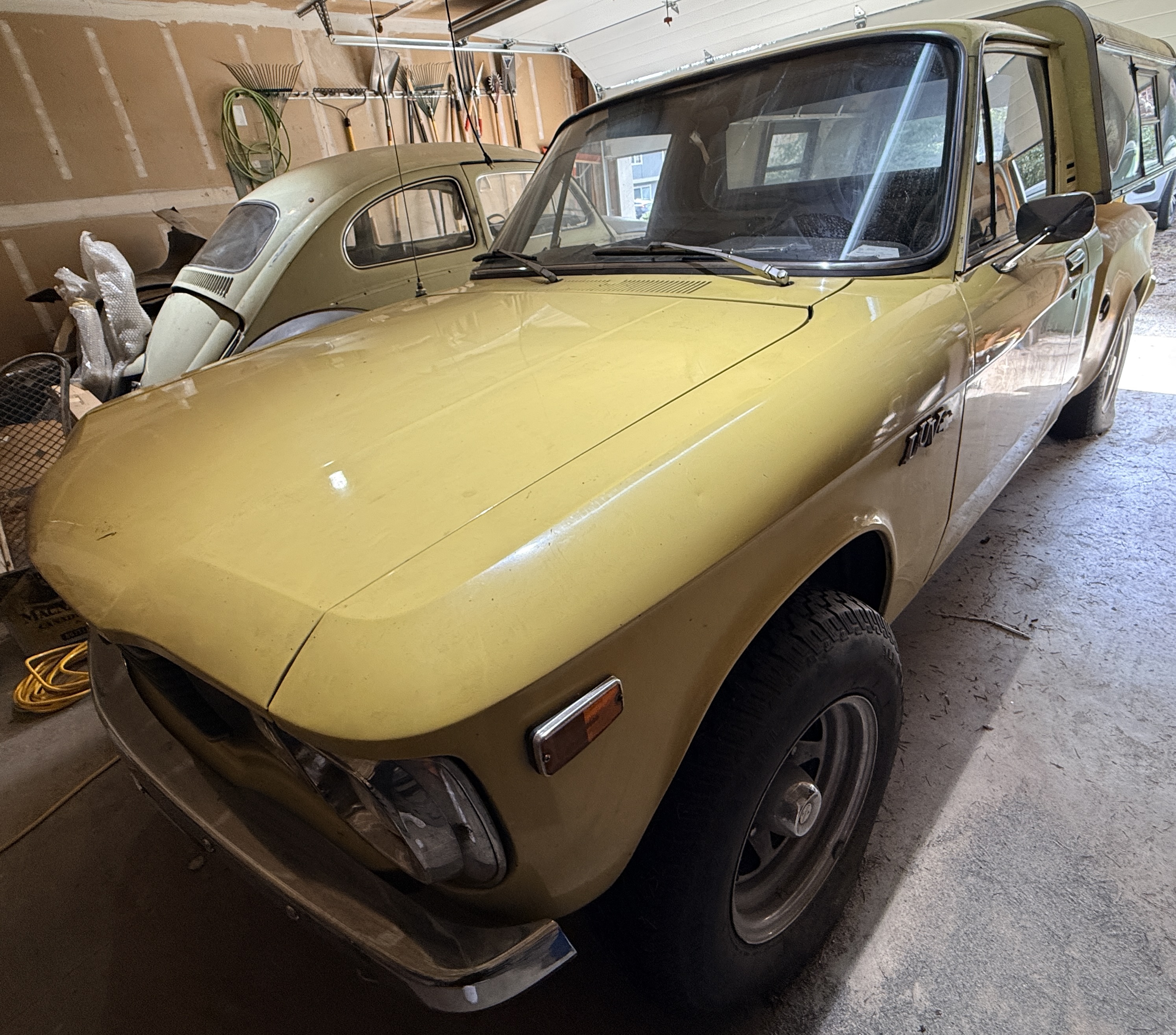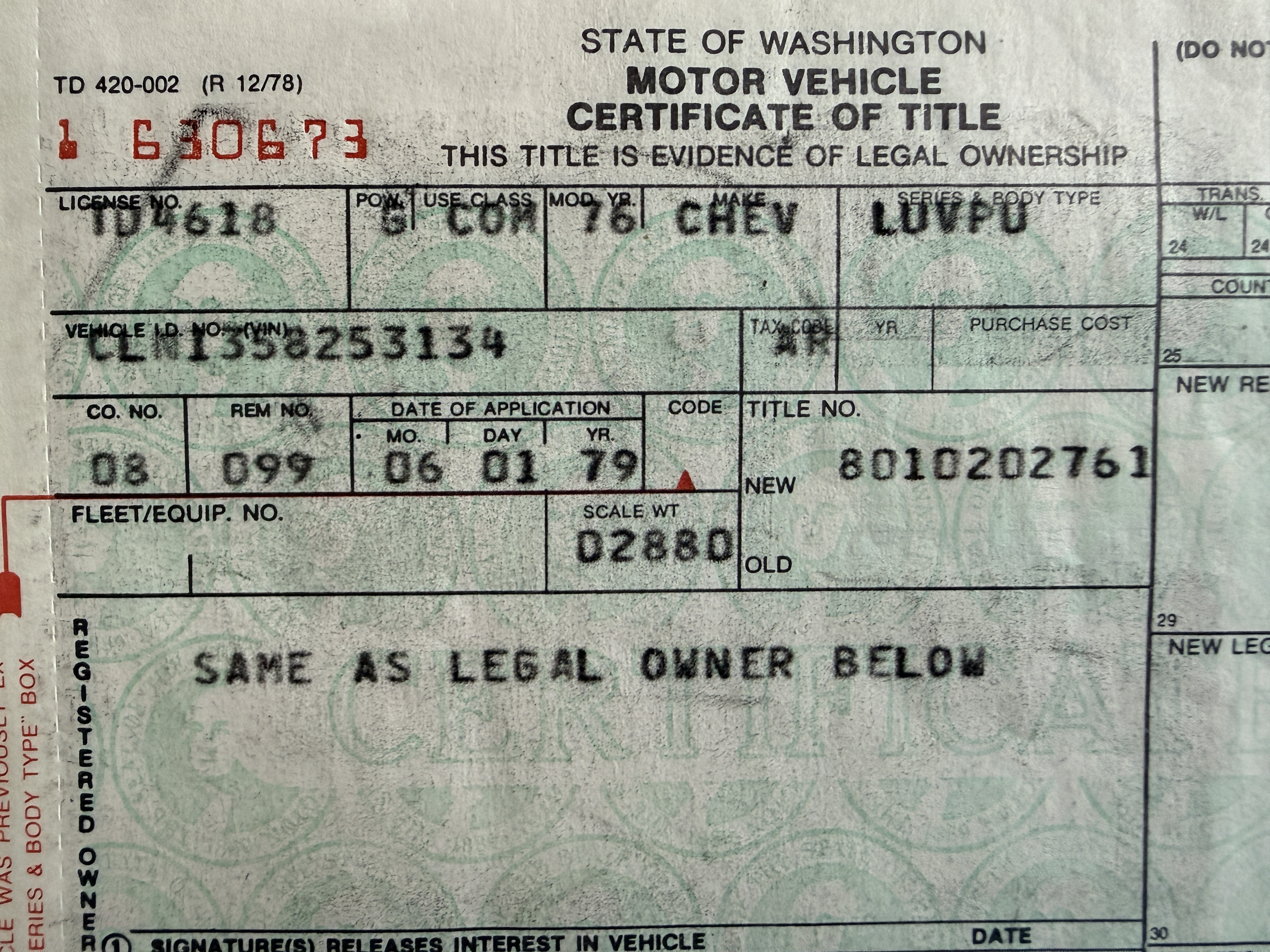 Garaged – This 1976 Chevrolet LUV is a first-generation light utility vehicle manufactured by Isuzu Motors Ltd. in Japan for Chevrolet. The vehicle is finished in yellow and features a color-matched custom integrated canopy manufactured by International Mfg. Co. in December 1976. The exterior is equipped with a chrome front bumper, a quad-headlight grille with a central Chevrolet bowtie emblem, LUV fender badges, and a tailgate featuring black Chevrolet block lettering. It rides on steel wheels fitted with Supreme star-logo center caps and Yokohama All Season M+S tires. The interior is trimmed in tan and brown vinyl and features a bench seat, a four-speed manual transmission with a floor-mounted shifter, and a Sanyo radio with a full auto eject cassette player. The dashboard includes a 100-mph speedometer with a five-digit odometer and gauges for fuel level and coolant temperature. Identification is provided by a chassis plate in the door jamb listing VIN CLN1358253134 and a secondary manufacturer decal from International Mfg. Co. The lot includes two keys and vintage Washington state license plates.