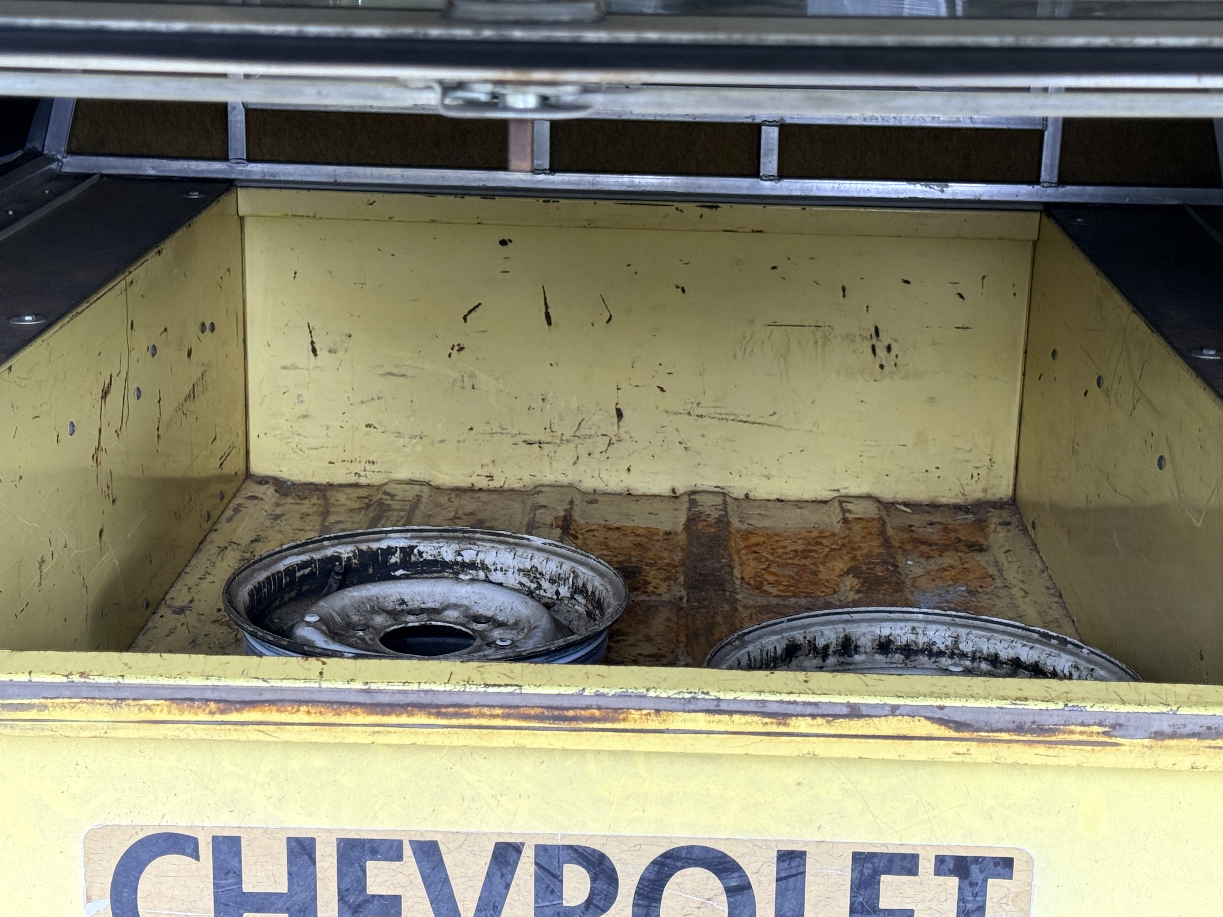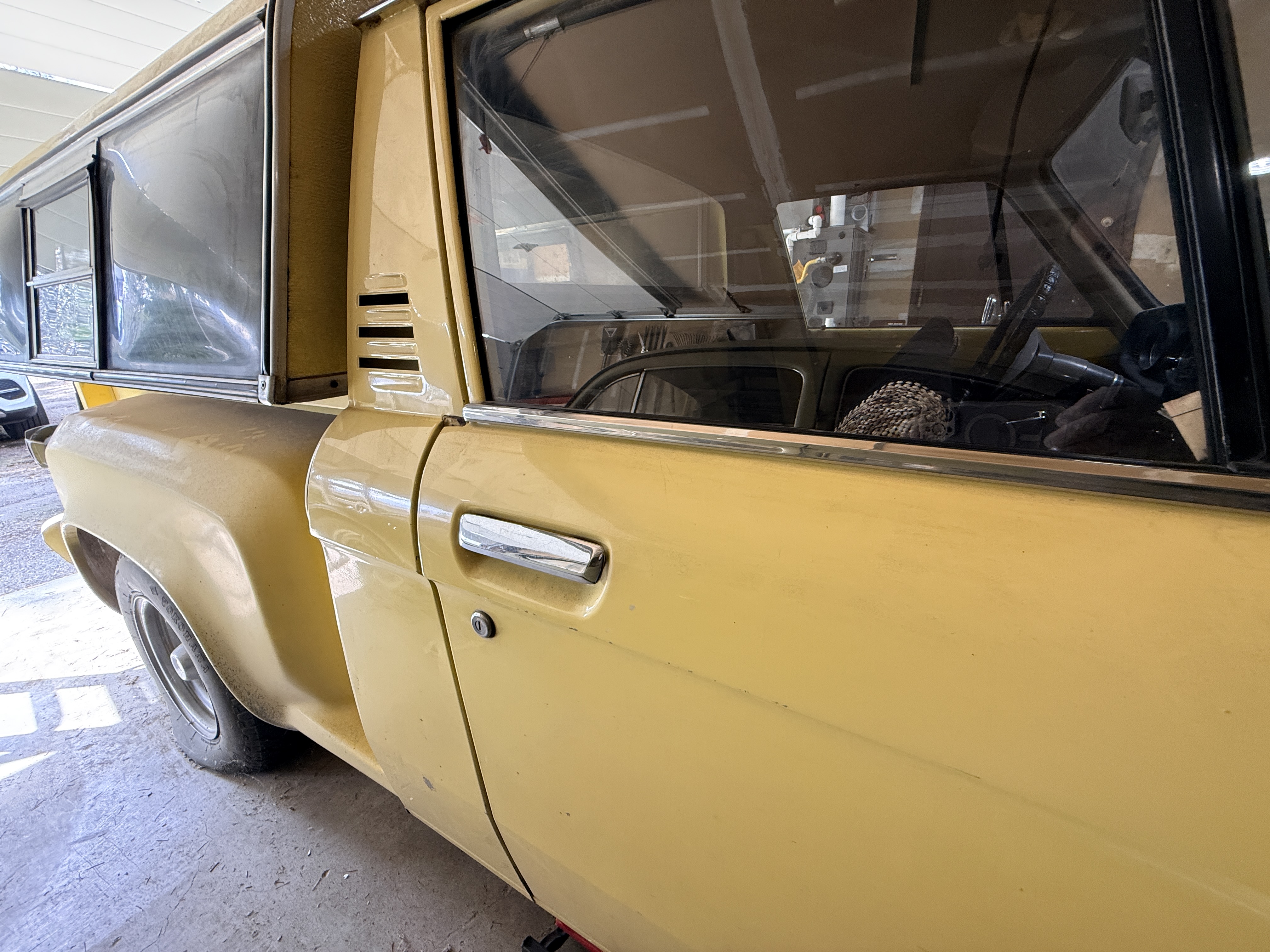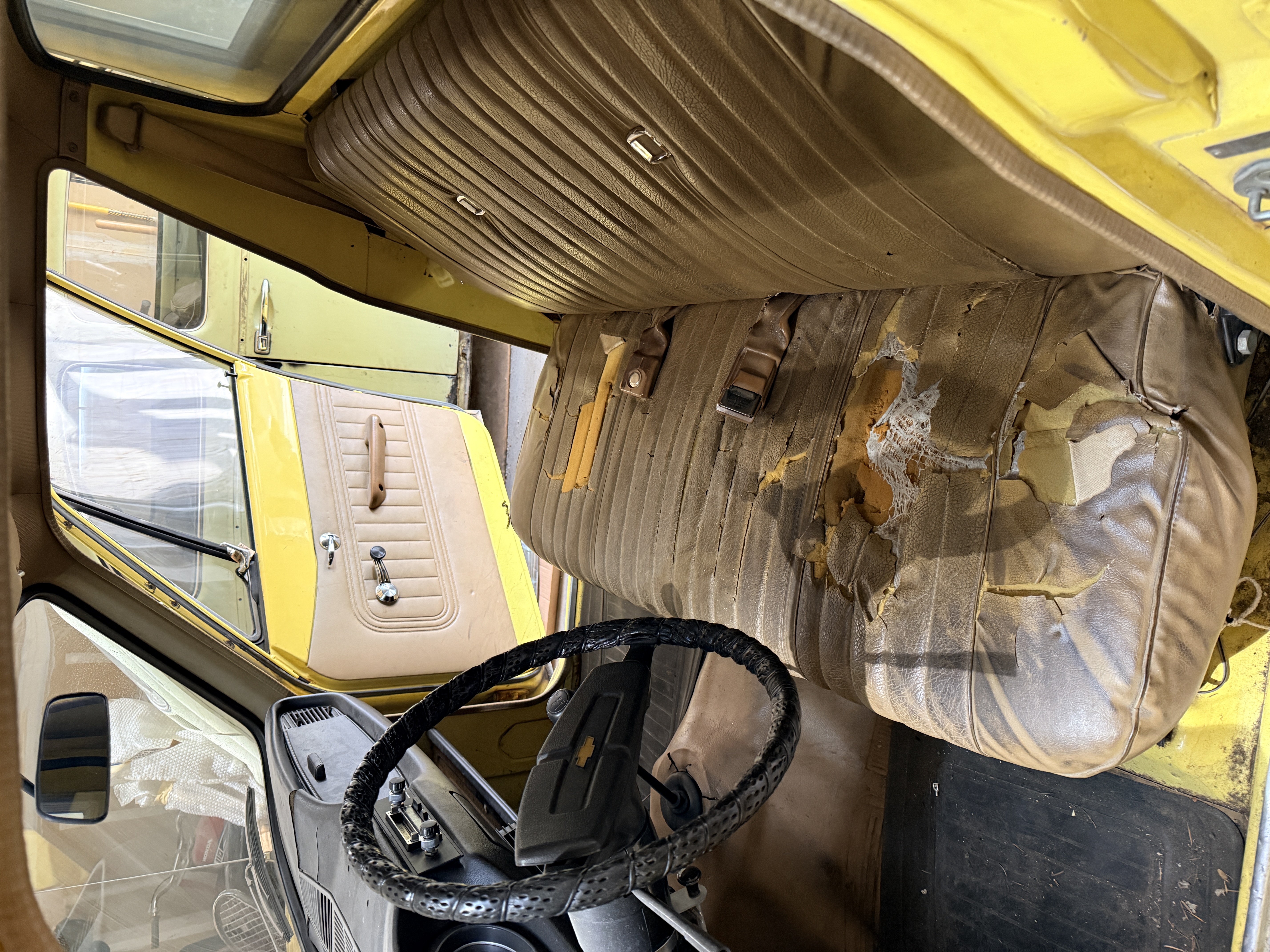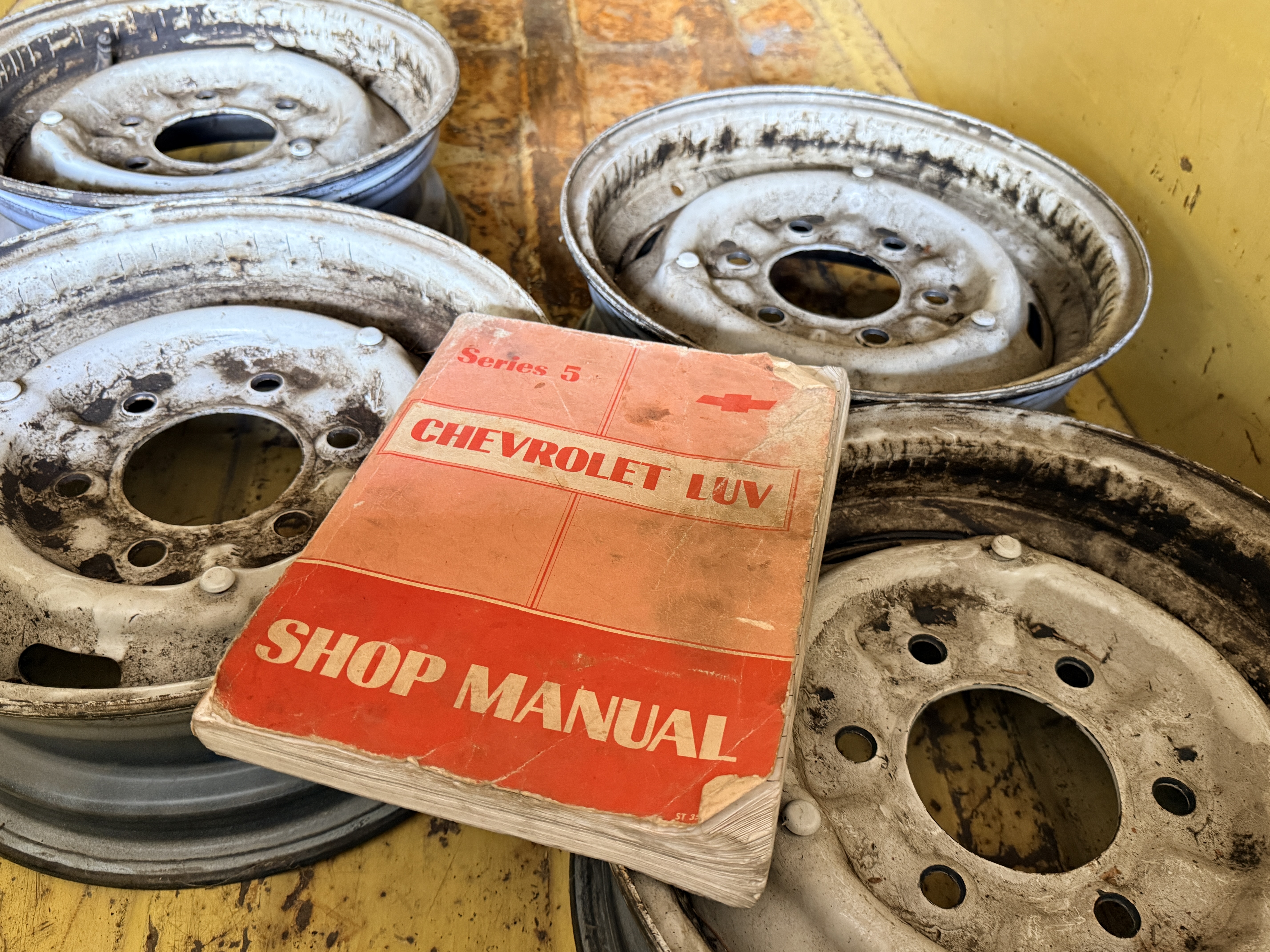 Garaged – This 1976 Chevrolet LUV is a first-generation light utility vehicle manufactured by Isuzu Motors Ltd. in Japan for Chevrolet. The vehicle is finished in yellow and features a color-matched custom integrated canopy manufactured by International Mfg. Co. in December 1976. The exterior is equipped with a chrome front bumper, a quad-headlight grille with a central Chevrolet bowtie emblem, LUV fender badges, and a tailgate featuring black Chevrolet block lettering. It rides on steel wheels fitted with Supreme star-logo center caps and Yokohama All Season M+S tires. The interior is trimmed in tan and brown vinyl and features a bench seat, a four-speed manual transmission with a floor-mounted shifter, and a Sanyo radio with a full auto eject cassette player. The dashboard includes a 100-mph speedometer with a five-digit odometer and gauges for fuel level and coolant temperature. Identification is provided by a chassis plate in the door jamb listing VIN CLN1358253134 and a secondary manufacturer decal from International Mfg. Co. The lot includes two keys and vintage Washington state license plates.