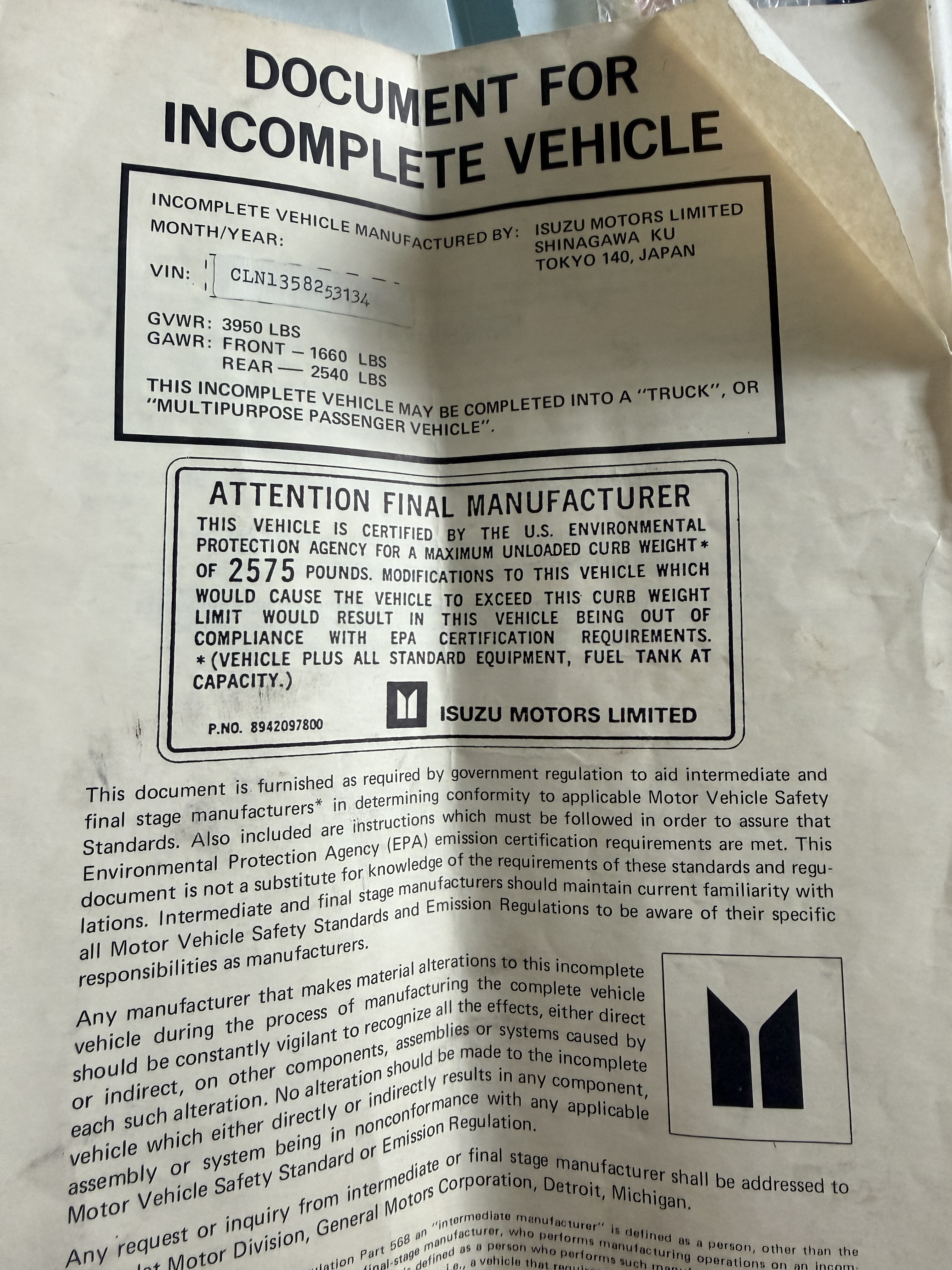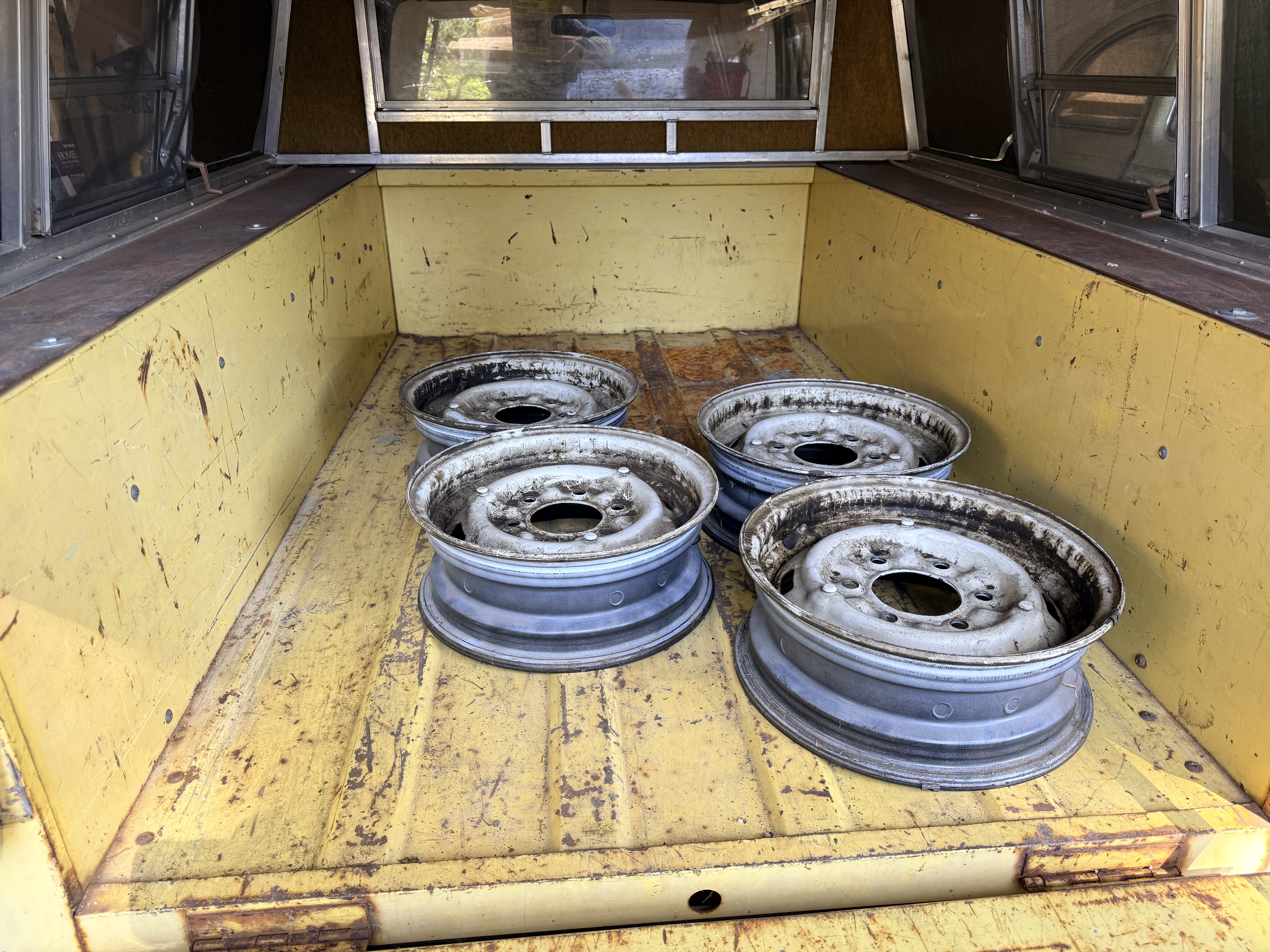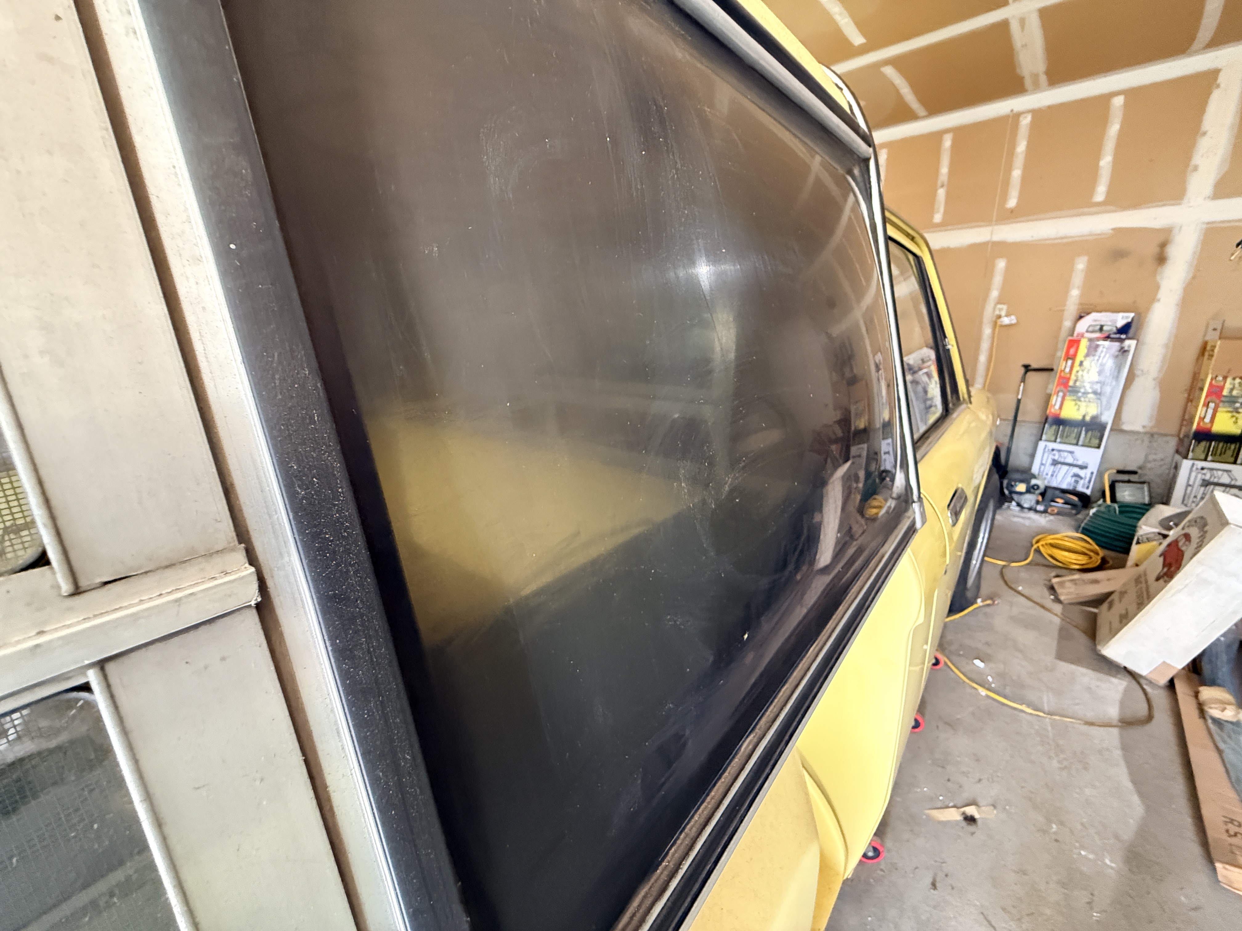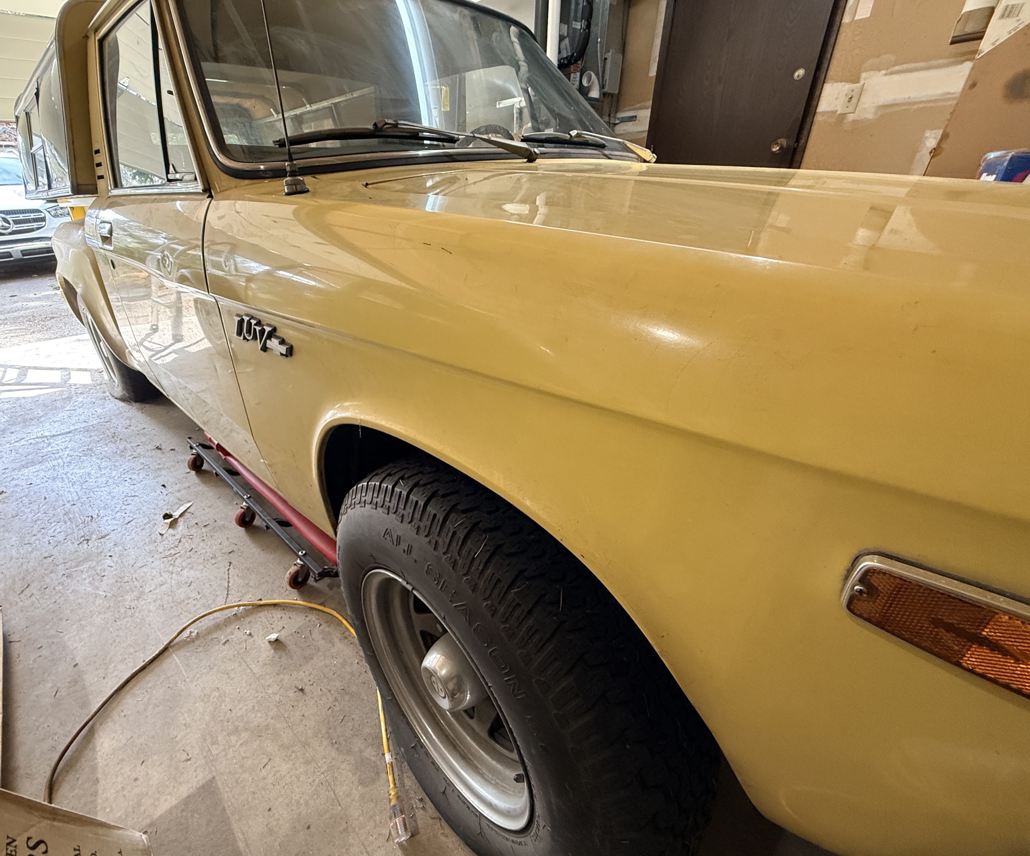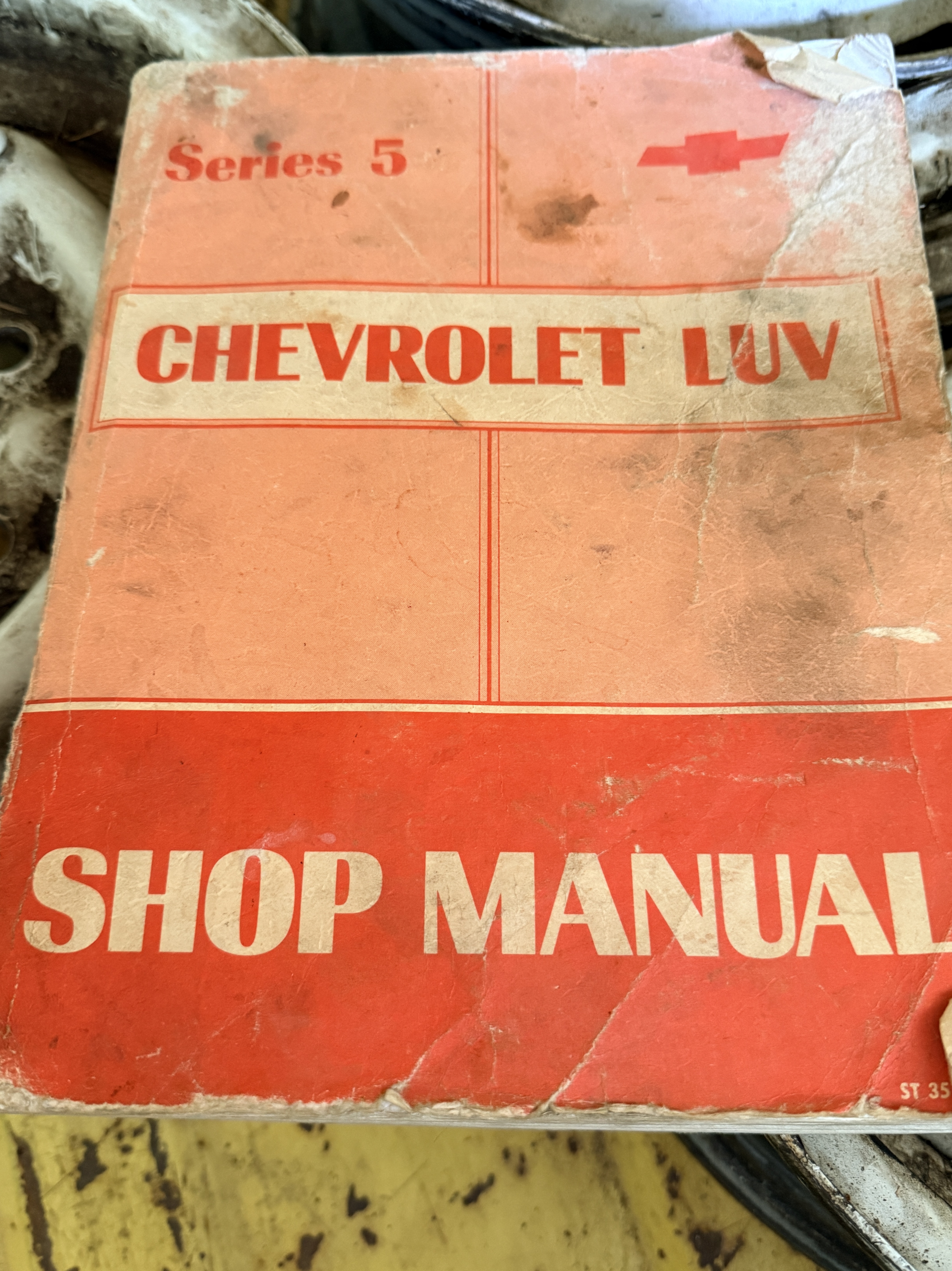 Garaged – This 1976 Chevrolet LUV is a first-generation light utility vehicle manufactured by Isuzu Motors Ltd. in Japan for Chevrolet. The vehicle is finished in yellow and features a color-matched custom integrated canopy manufactured by International Mfg. Co. in December 1976. The exterior is equipped with a chrome front bumper, a quad-headlight grille with a central Chevrolet bowtie emblem, LUV fender badges, and a tailgate featuring black Chevrolet block lettering. It rides on steel wheels fitted with Supreme star-logo center caps and Yokohama All Season M+S tires. The interior is trimmed in tan and brown vinyl and features a bench seat, a four-speed manual transmission with a floor-mounted shifter, and a Sanyo radio with a full auto eject cassette player. The dashboard includes a 100-mph speedometer with a five-digit odometer and gauges for fuel level and coolant temperature. Identification is provided by a chassis plate in the door jamb listing VIN CLN1358253134 and a secondary manufacturer decal from International Mfg. Co. The lot includes two keys and vintage Washington state license plates.