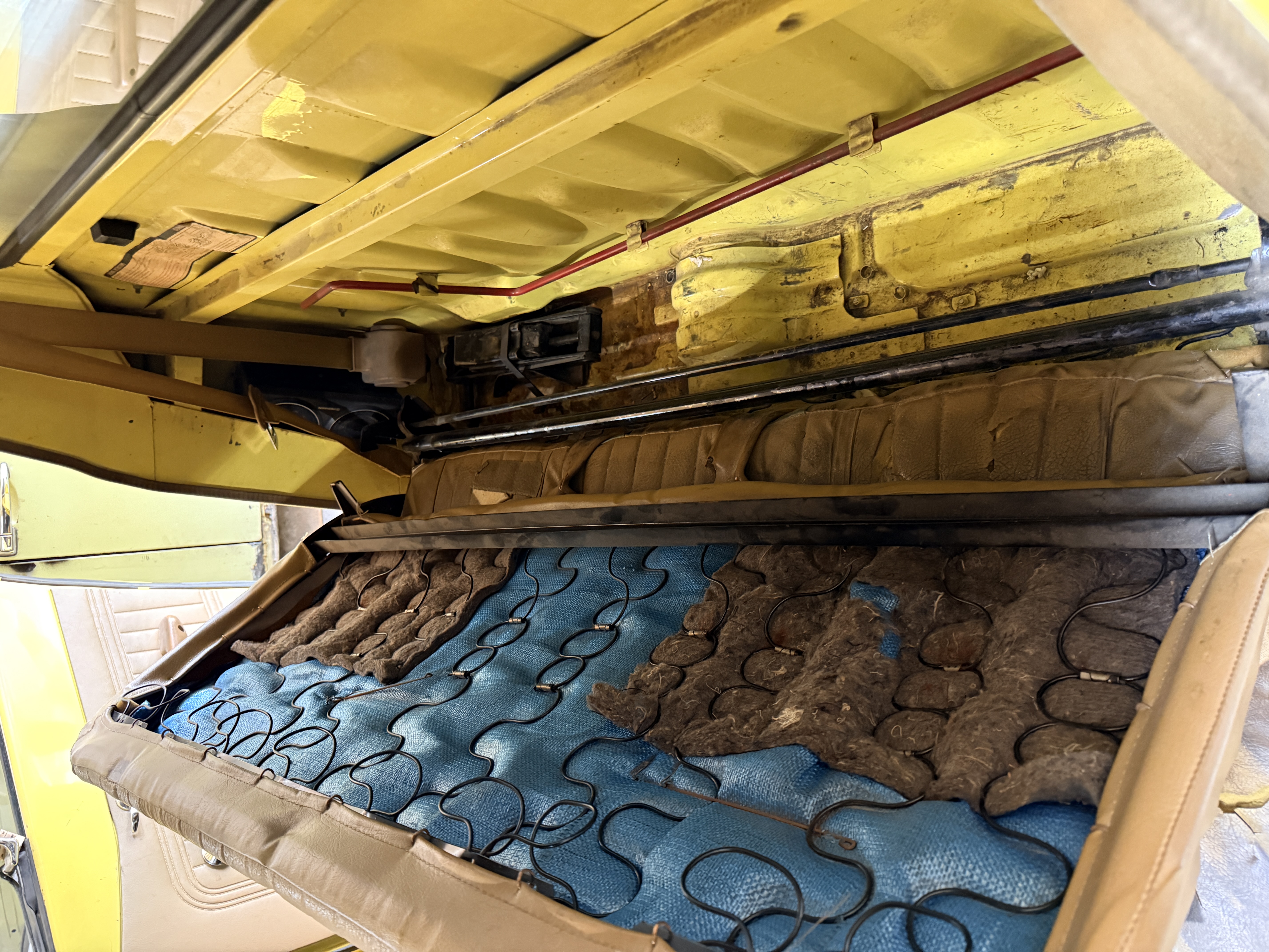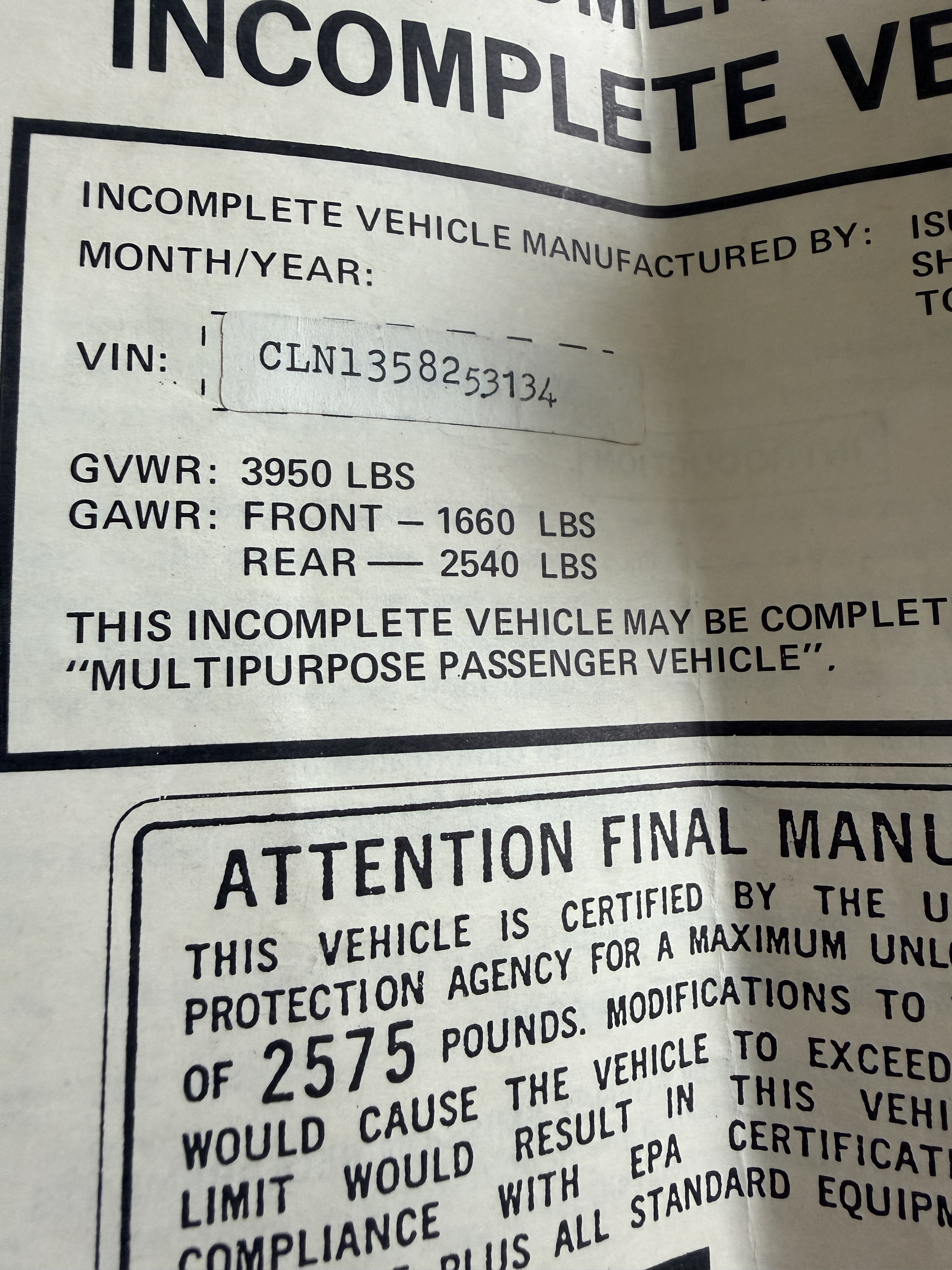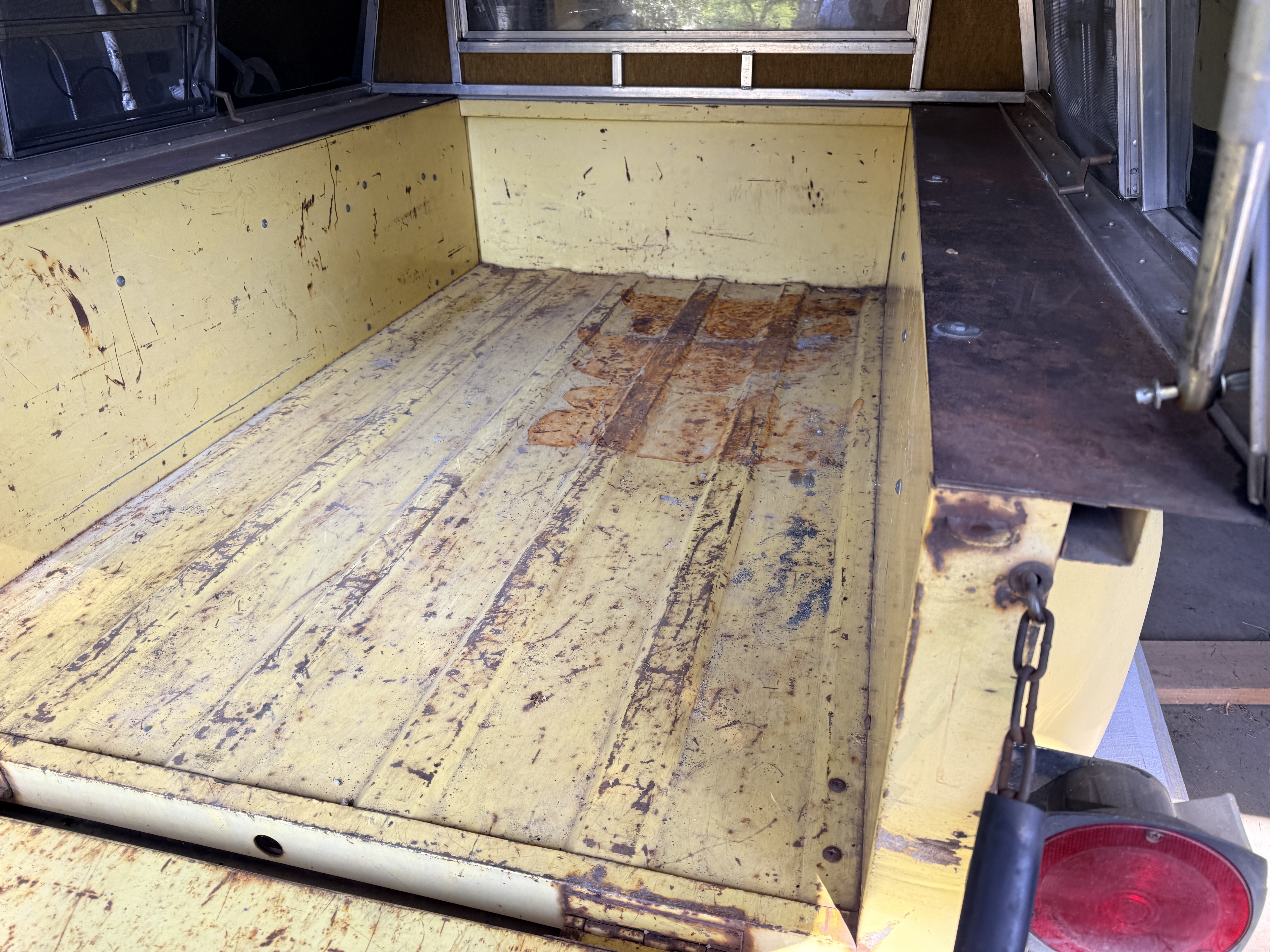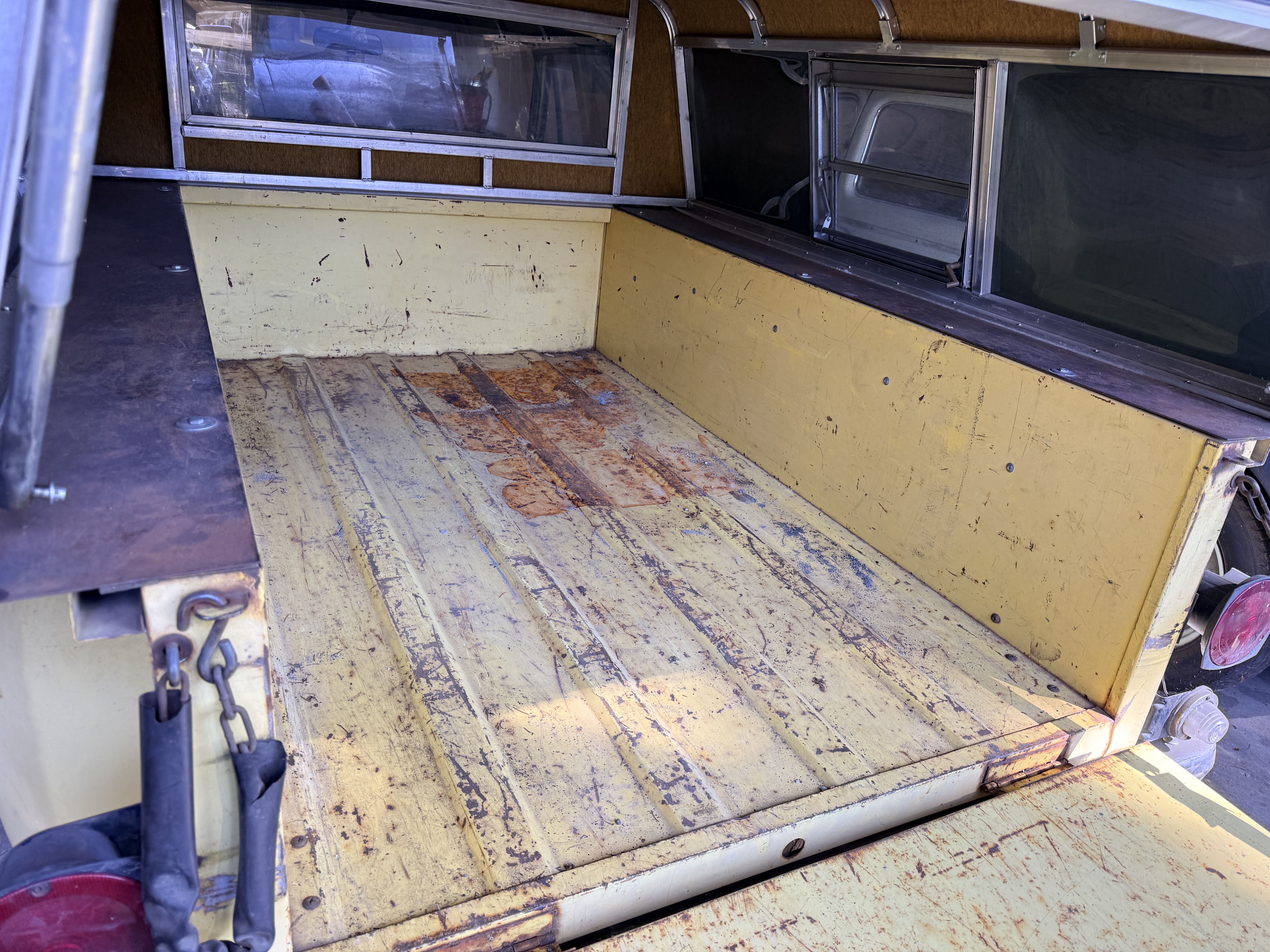 This vehicle is in unrestored and very original condition - owned by a Boeing engineer, it was kept inside his garage and worked on by him - it was his favorite vehicle for fishing, camping and hunting for many years. It has not been driven in awhile, so we did not attempt to start it up. The tires are low - the interior had a slip cover on the seats, but we removed it to show you the original seat and current condition. The windshield is cracked on the driver side. The custom canopy exhibits weathered rubber seals and a deteriorating textured finish. The interior is in poor condition; the vinyl bench seat is heavily torn with exposed foam and springs, the dashboard is cracked near the defrost vents, and the floor mats are worn through. The engine and mechanical systems have not been tested. Tires are aged and mismatched, with the driver-side rear tire being completely flat from just sitting inside the garage. Please review all images for condition and reach out with questions - we will do our best to answer them.