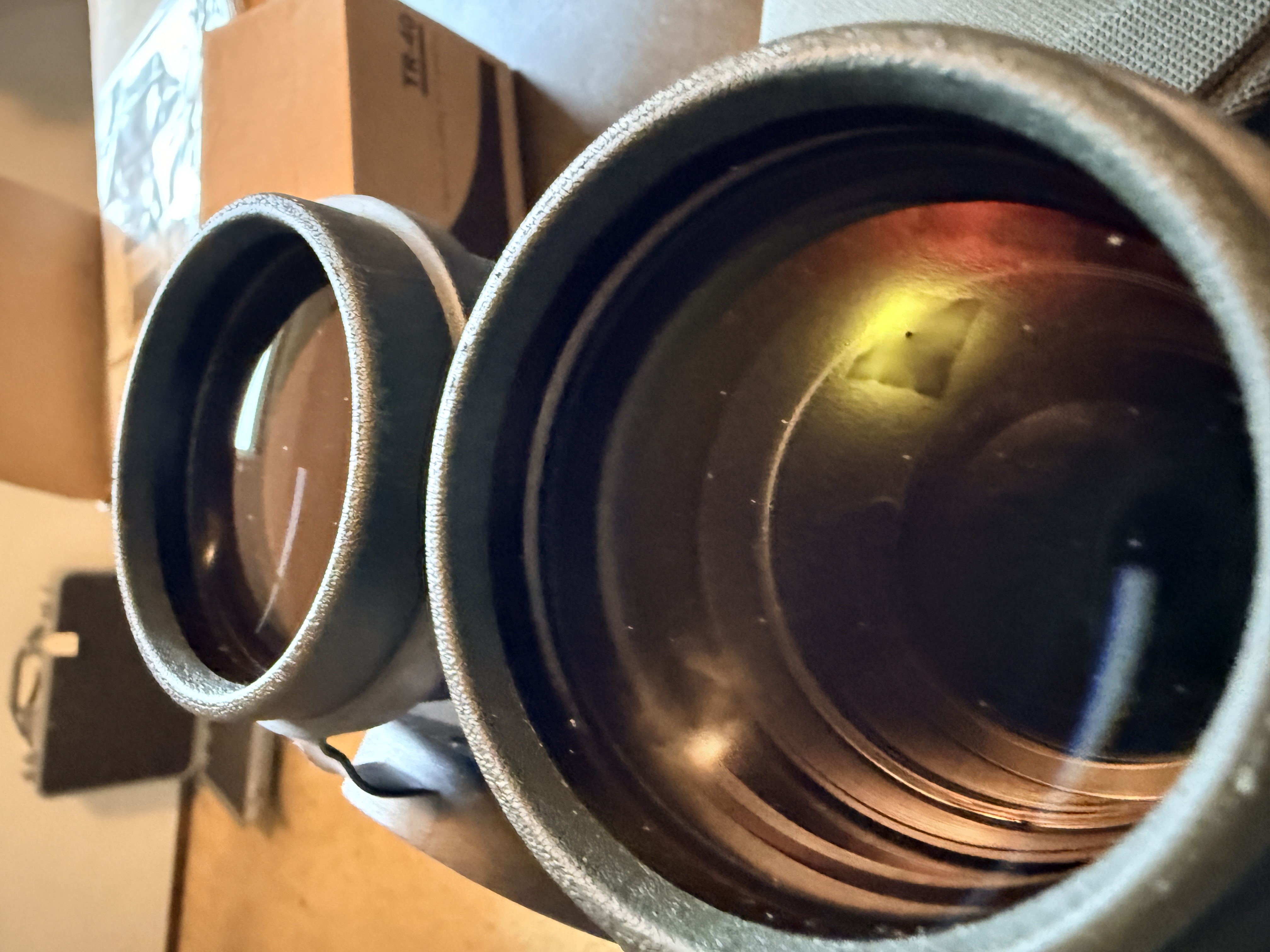 The binoculars appear to be in good professional condition. The 56mm objective lenses and eyepieces are clear and free of significant scratches, haze, or fungus. The rubber armor shows minor signs of handling but remains intact and well-adhered to the body. The central focus wheel and diopter adjustment operate through their intended range of motion. The folding bridge maintains proper tension and alignment. The carrying case and lens covers show light wear consistent with field use. It is possible these were never used, and only contain some dust from being stored.