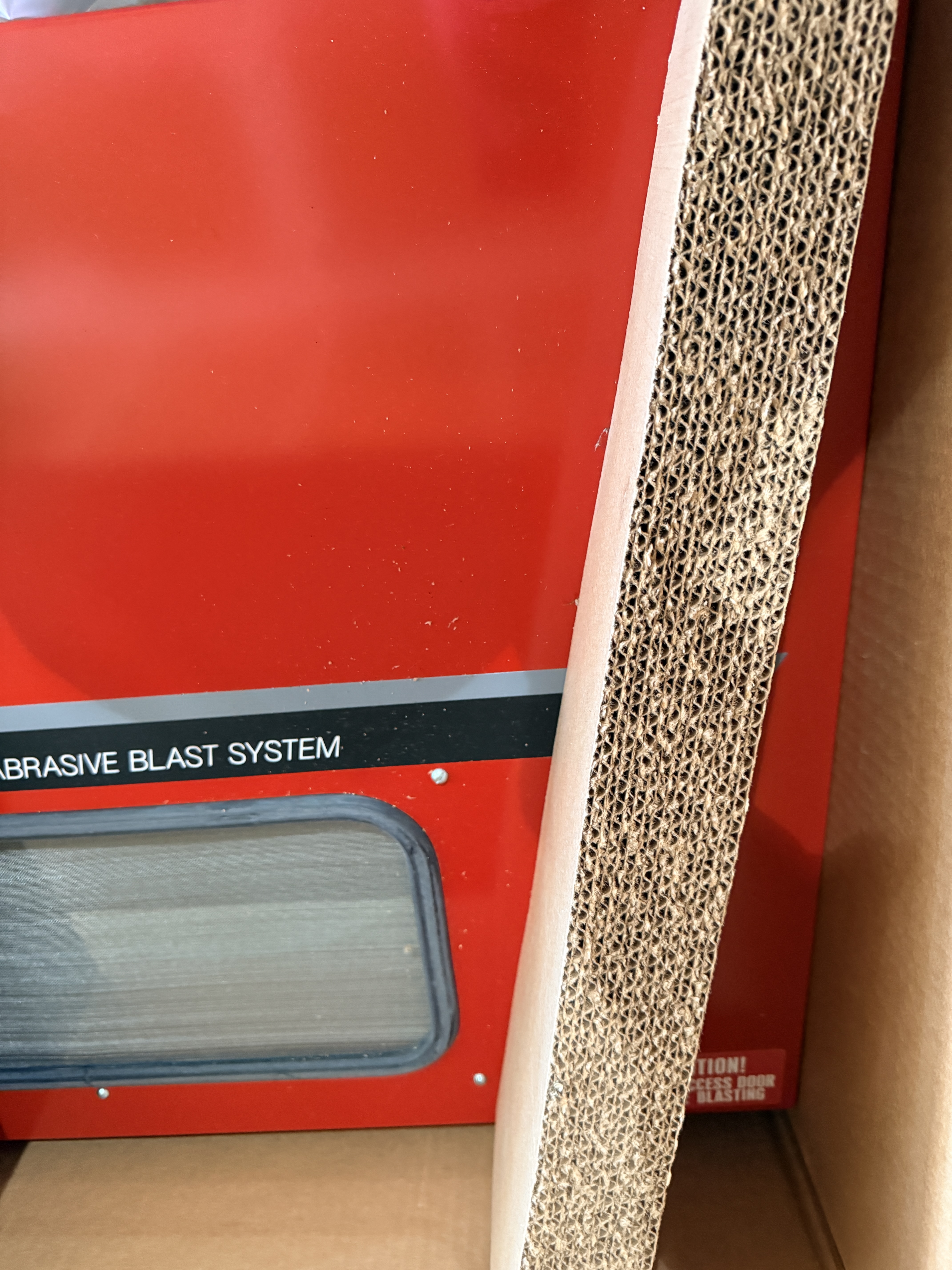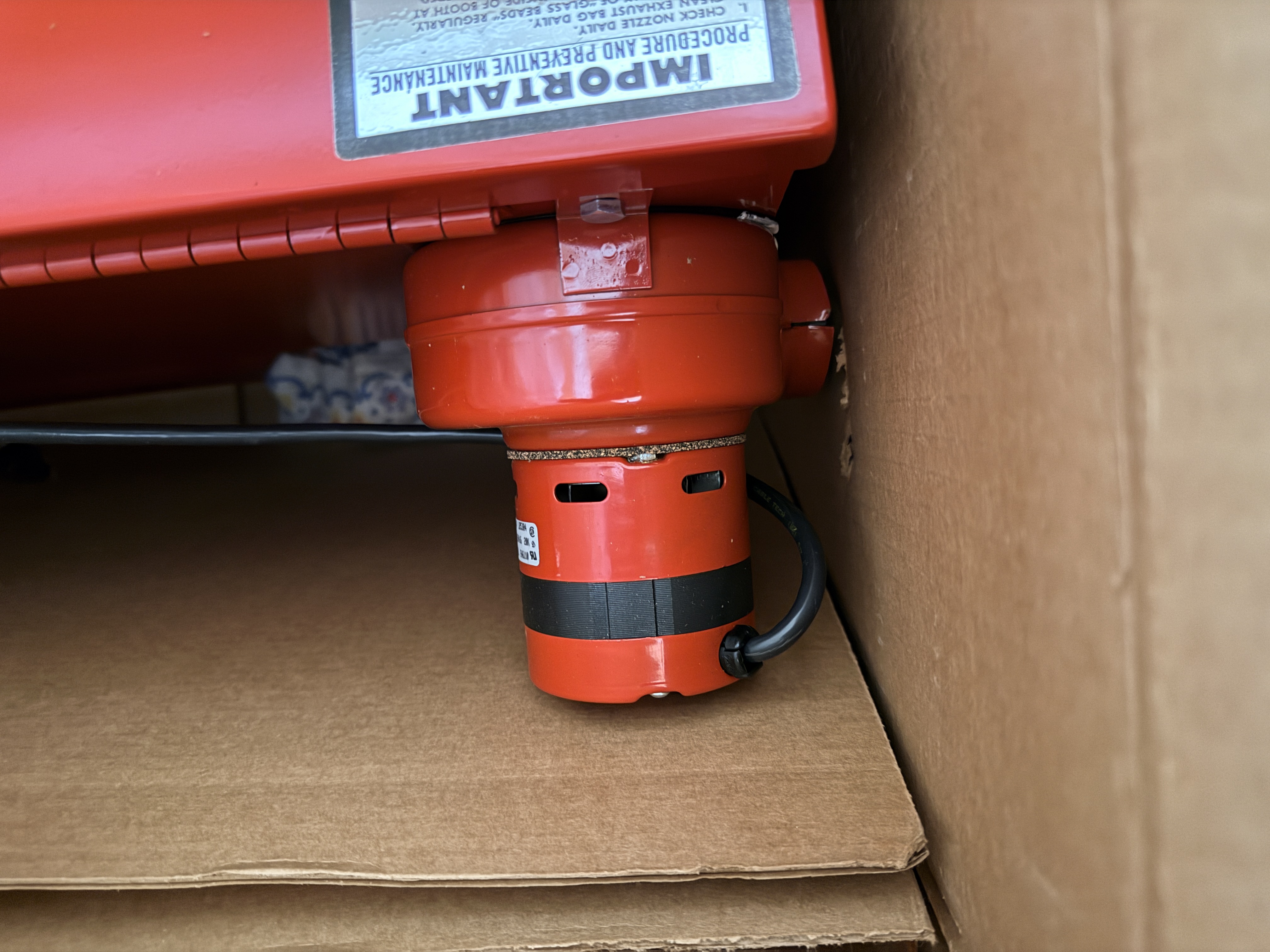 This item is in New Old Stock condition, remaining in its original factory cardboard shipping container with internal protective plastic wrapping and structural inserts. The blast cabinet shows no signs of previous use or exposure to abrasive media. The exterior cardboard box exhibits significant shelf wear, including dust, moisture staining, and minor structural degradation from long-term storage. Completeness of internal accessories and working status of electrical components are unverified. *As with many items in this estate this appears new and unused in the original box. No smoking home, just a bit dusty.
