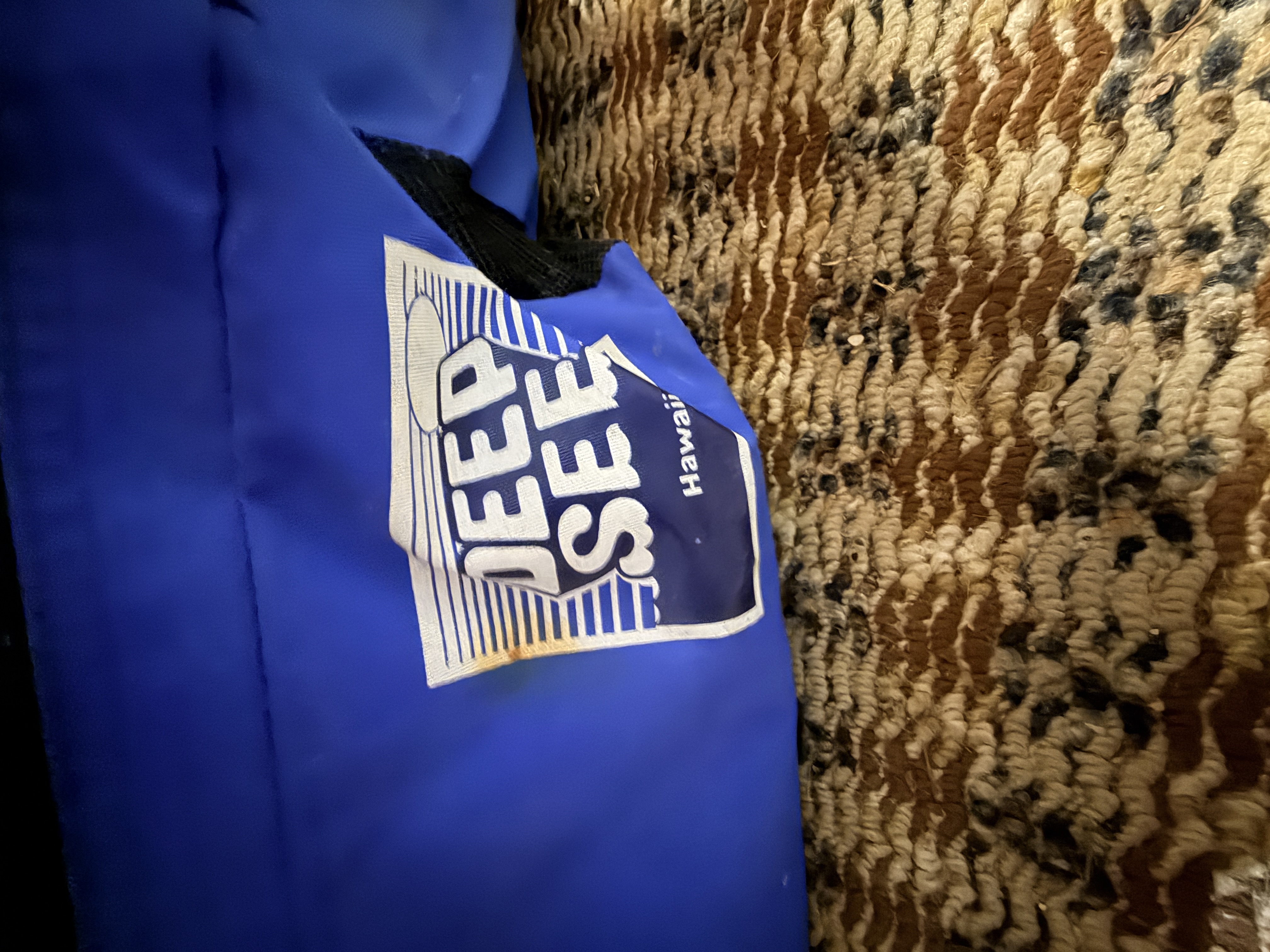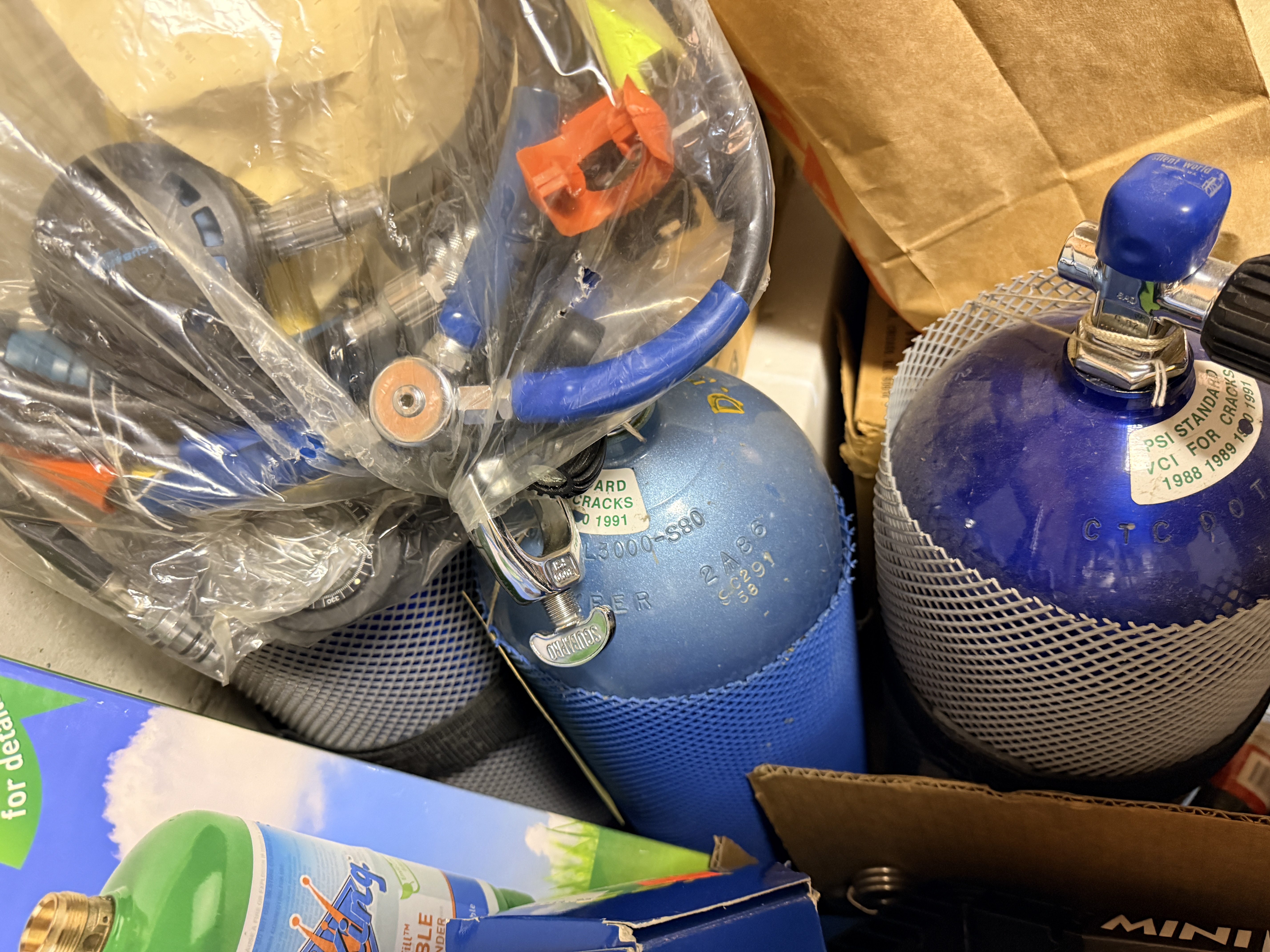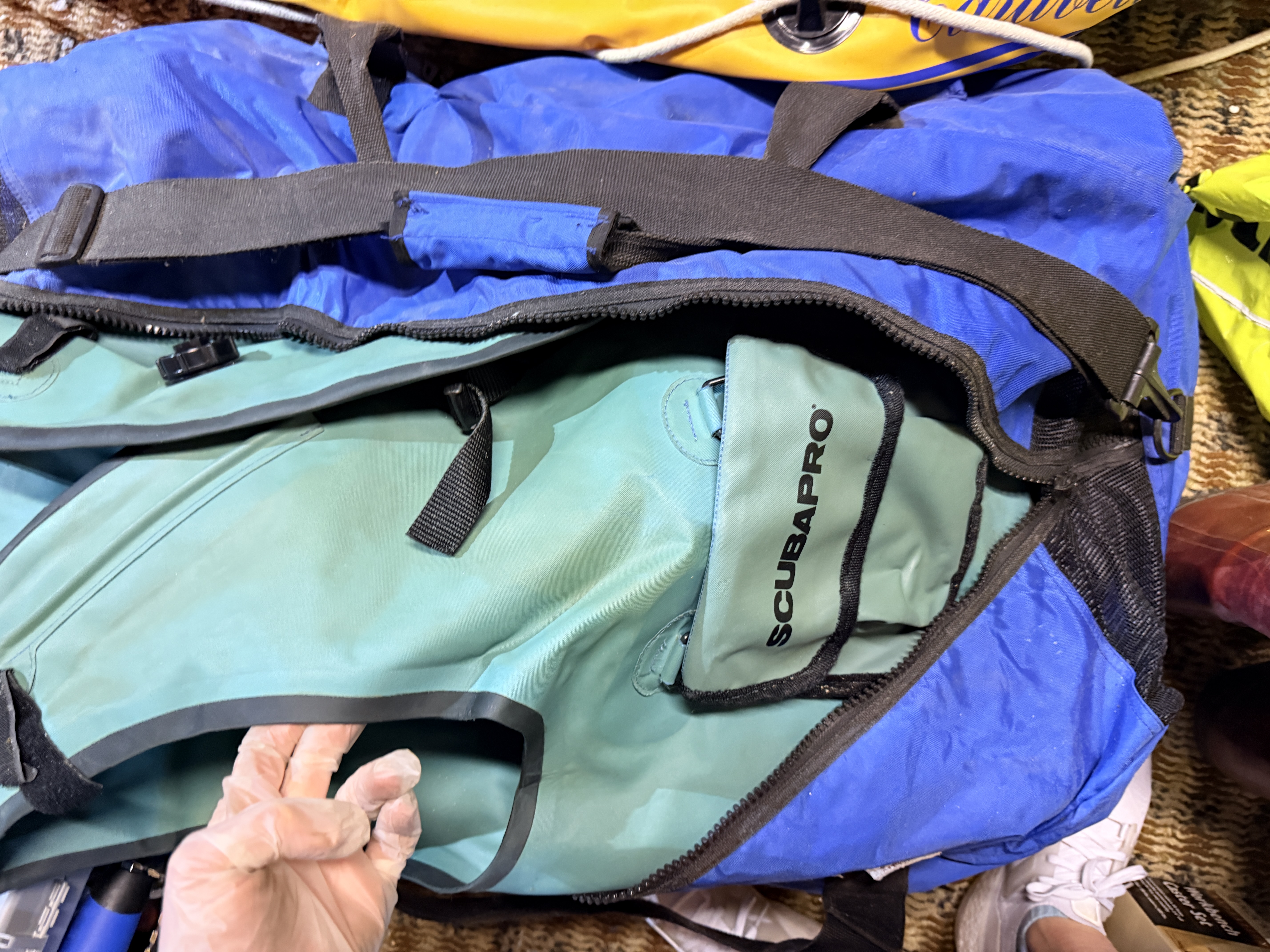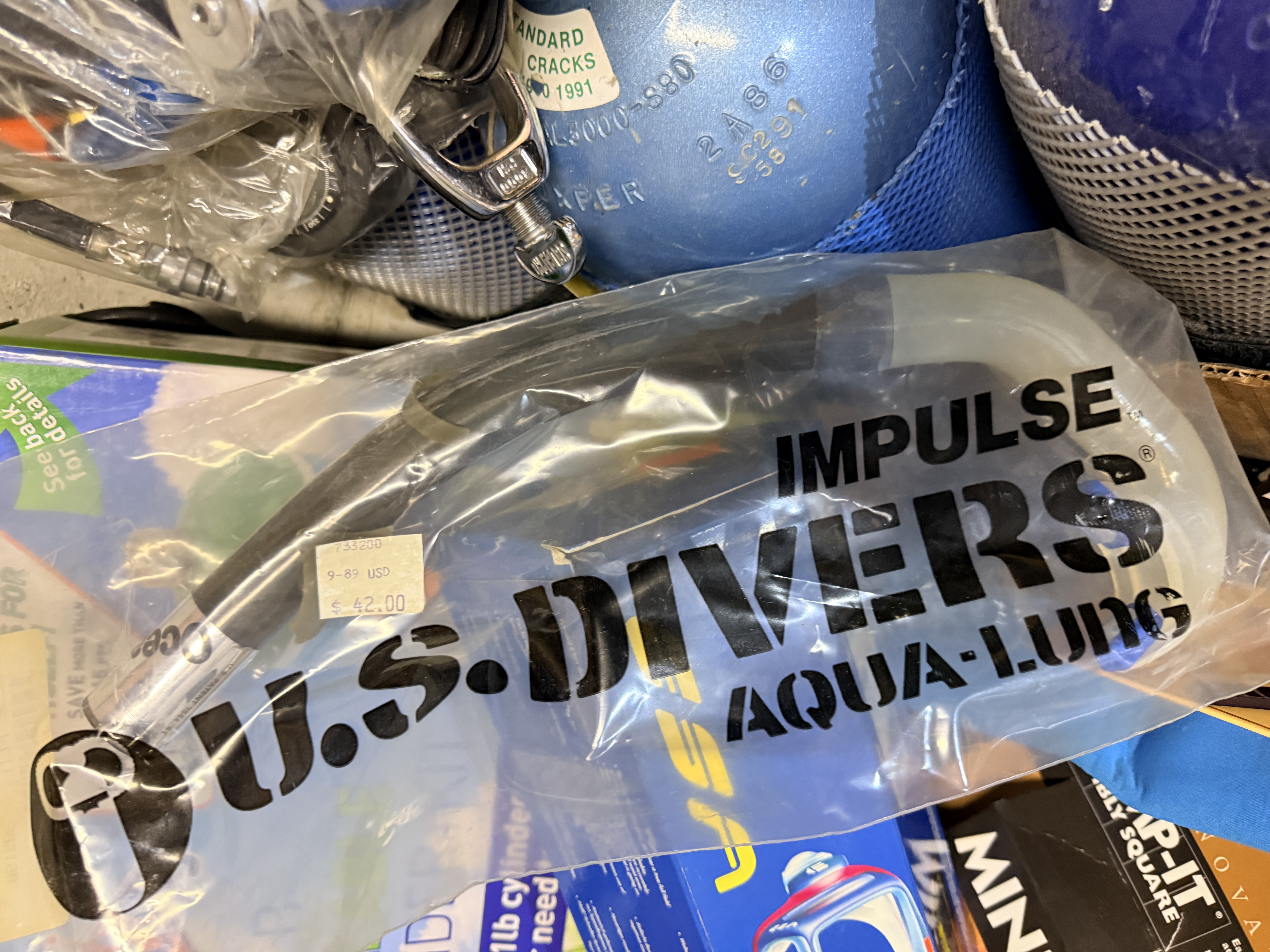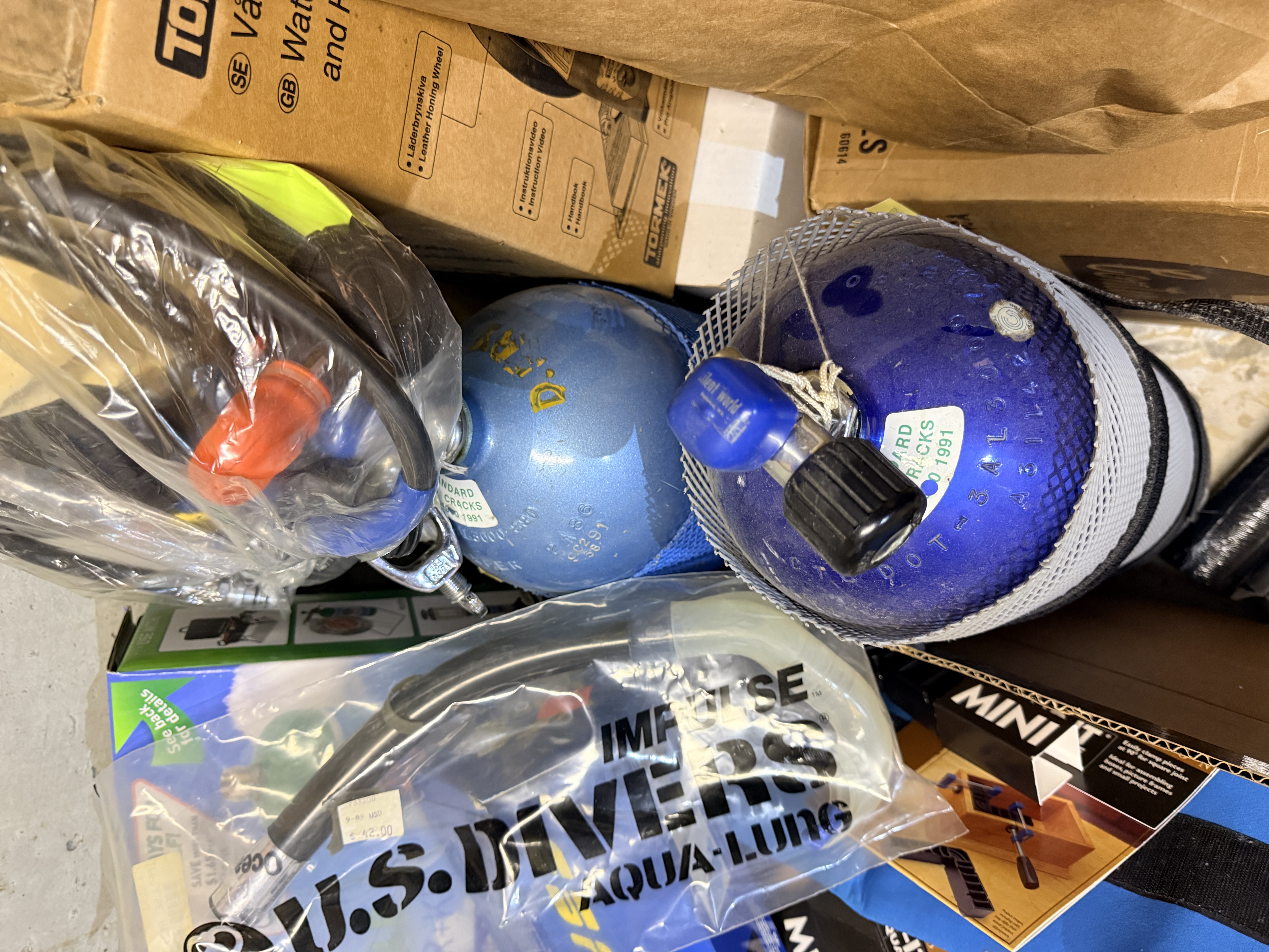 This Dive gear Lot features an assortment of scuba diving equipment and related accessories from manufacturers including Scubapro, U.S. Divers, Mares, and Luxfer. The collection includes a Scubapro mesh gear bag, resembling the Sport Mesh 95 model, and a Deep See Hawaii branded bag. Technical equipment includes aluminum scuba tanks; one light blue tank is marked CTC/DOT-3AL 3000-S80 LUXFER with a 2A86 stamp, while a dark blue tank features a mesh cover and PSI STANDARD inspection stickers dating from 1988 to 1991. Apparel and personal gear include a U.S. Divers full-body wetsuit in blue and red neoprene and a pair of blue Mares Plana Avanti swim fins. Packaged items include a U.S. Divers Aqua-Lung Impulse snorkel in its original plastic sleeve with a September 1989 price tag and a Mares diving mask in its original retail box. Any other diver gear not pictured is available upon pickup appointment if you win this lot.