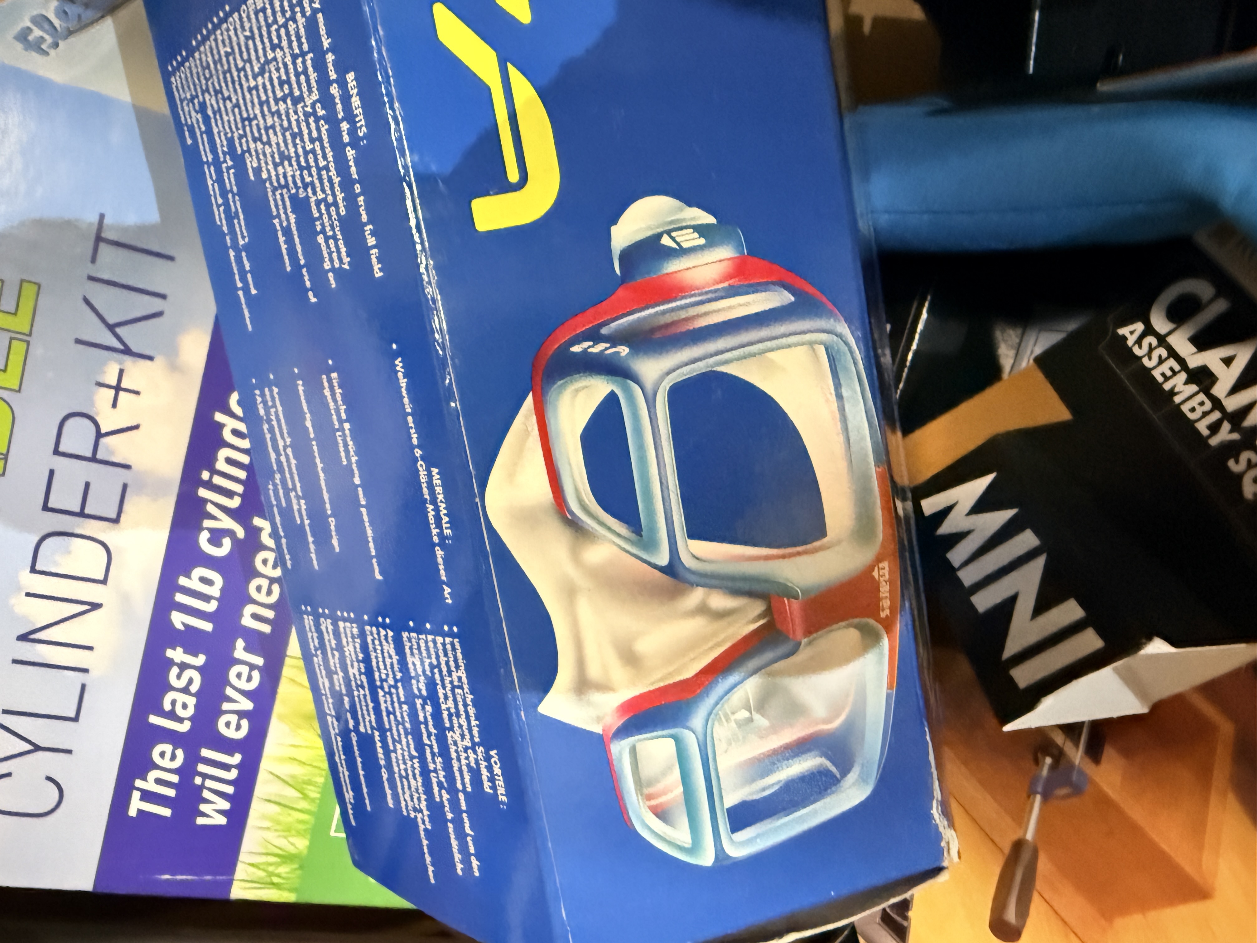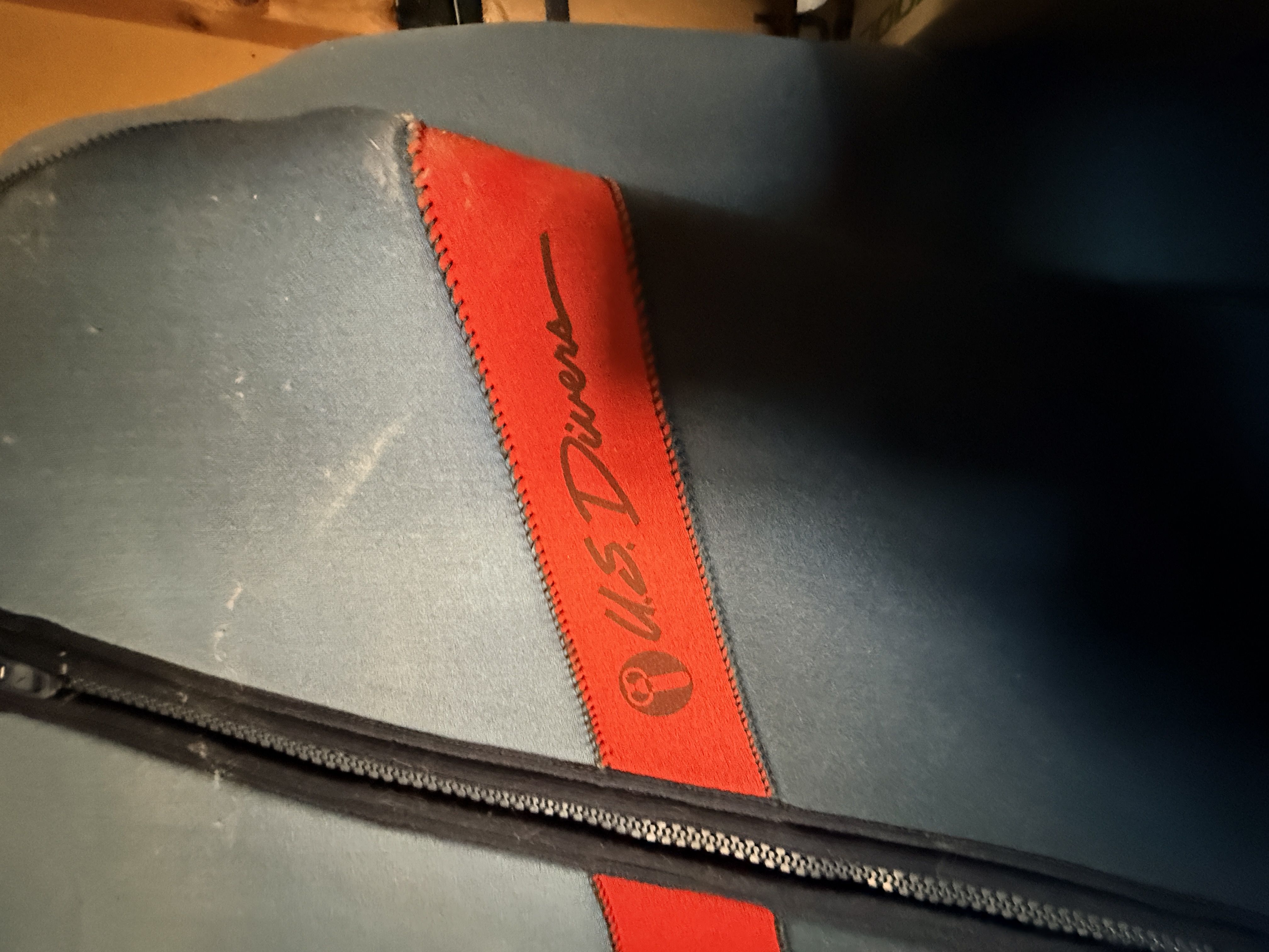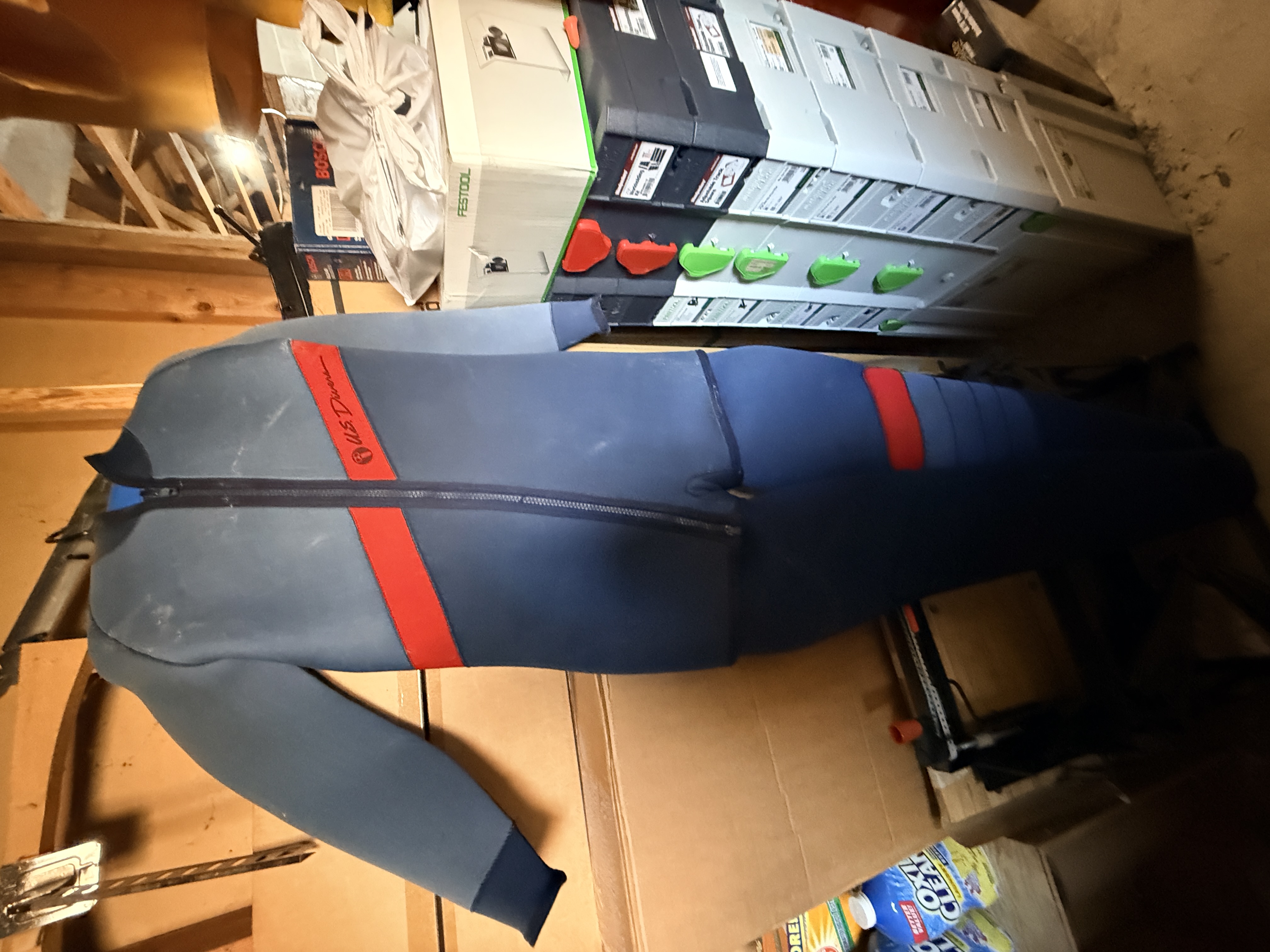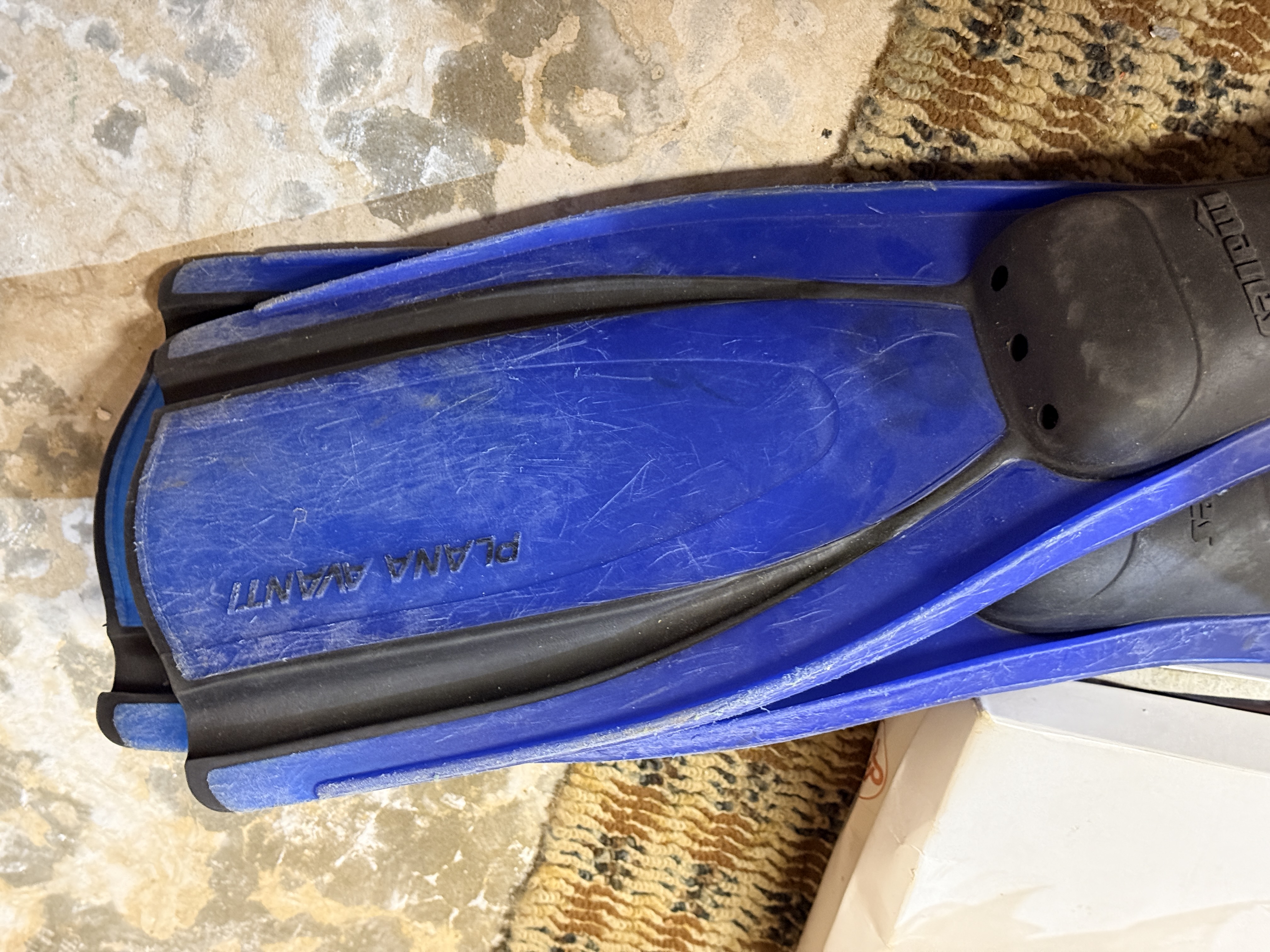 Items range in condition from new-in-box to well-used. The Mares diving mask and U.S. Divers snorkel remain in original packaging. The Mares Plana Avanti fins exhibit heavy surface scuffing and scratches from use. The aluminum tanks show external wear and carry expired inspection stickers from the early 1990s. The U.S. Divers wetsuit shows signs of age and previous use. All life-support equipment requires professional inspection and testing before any potential use.