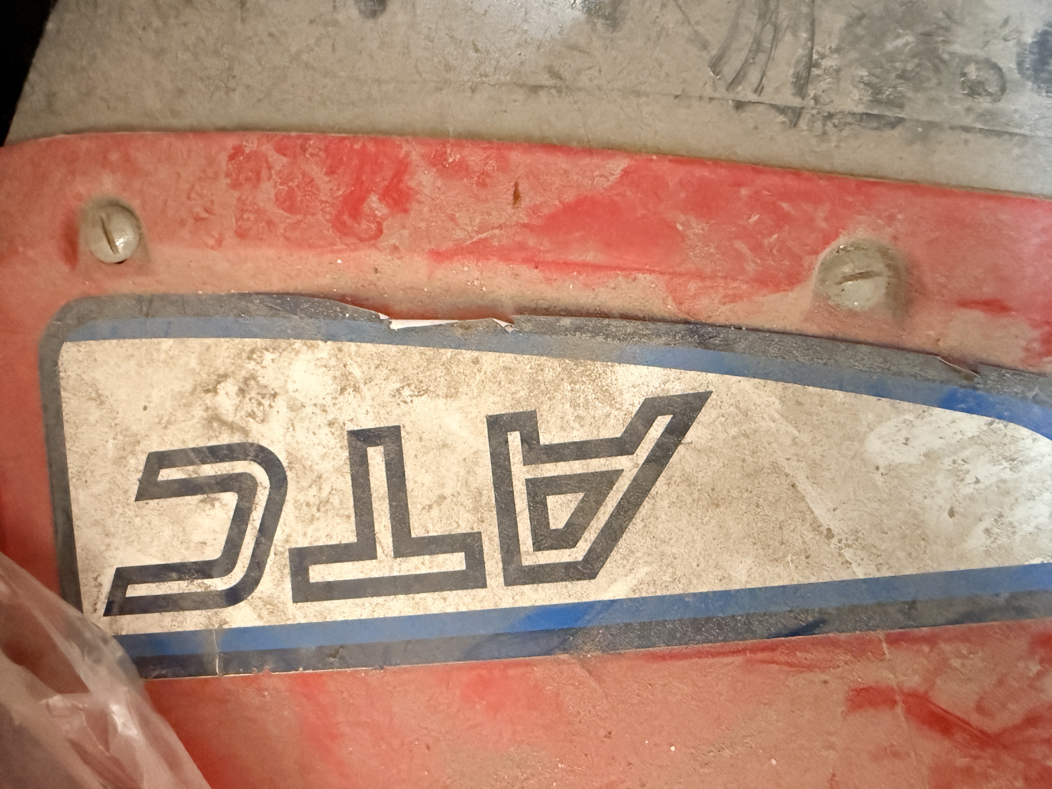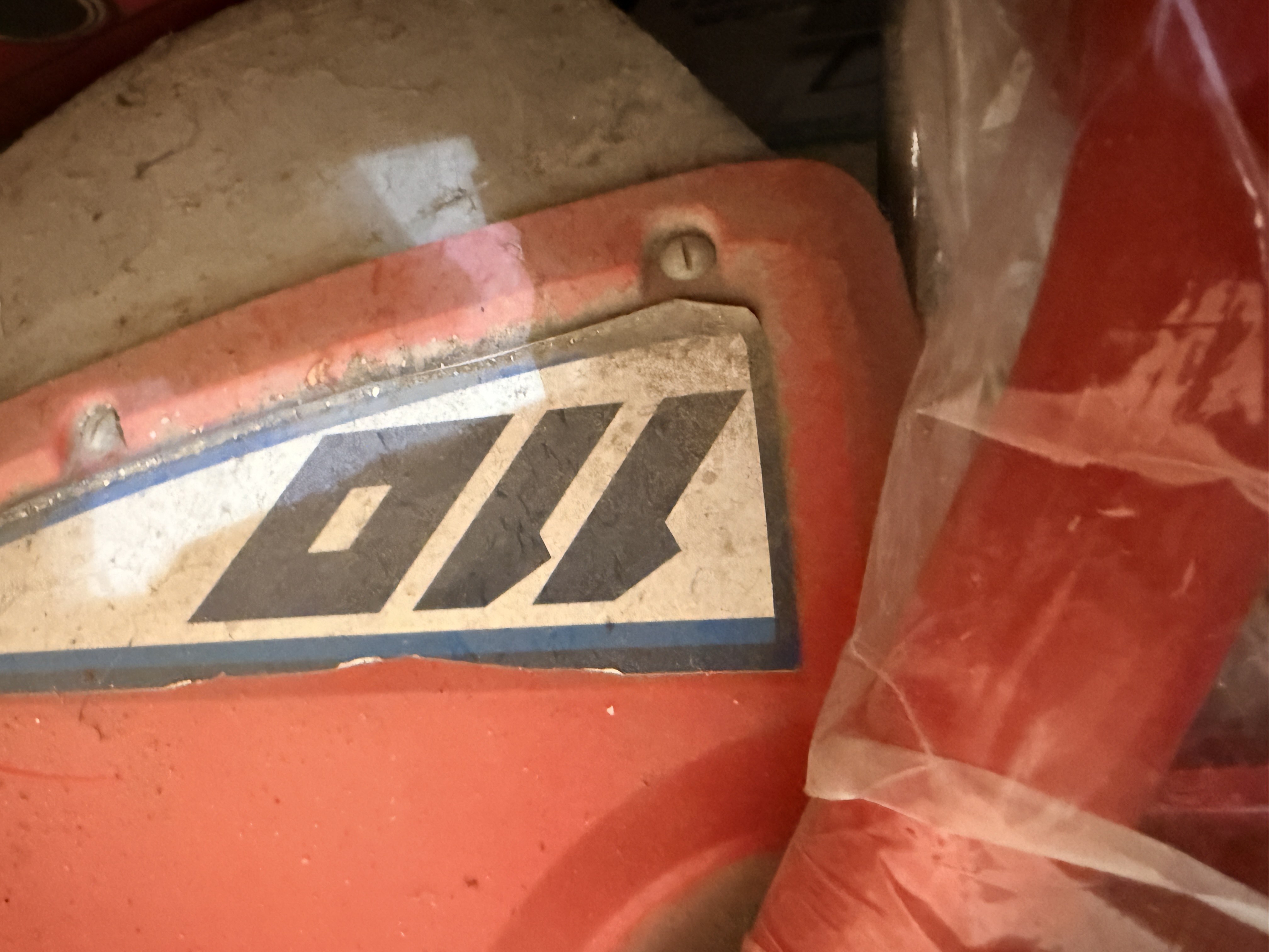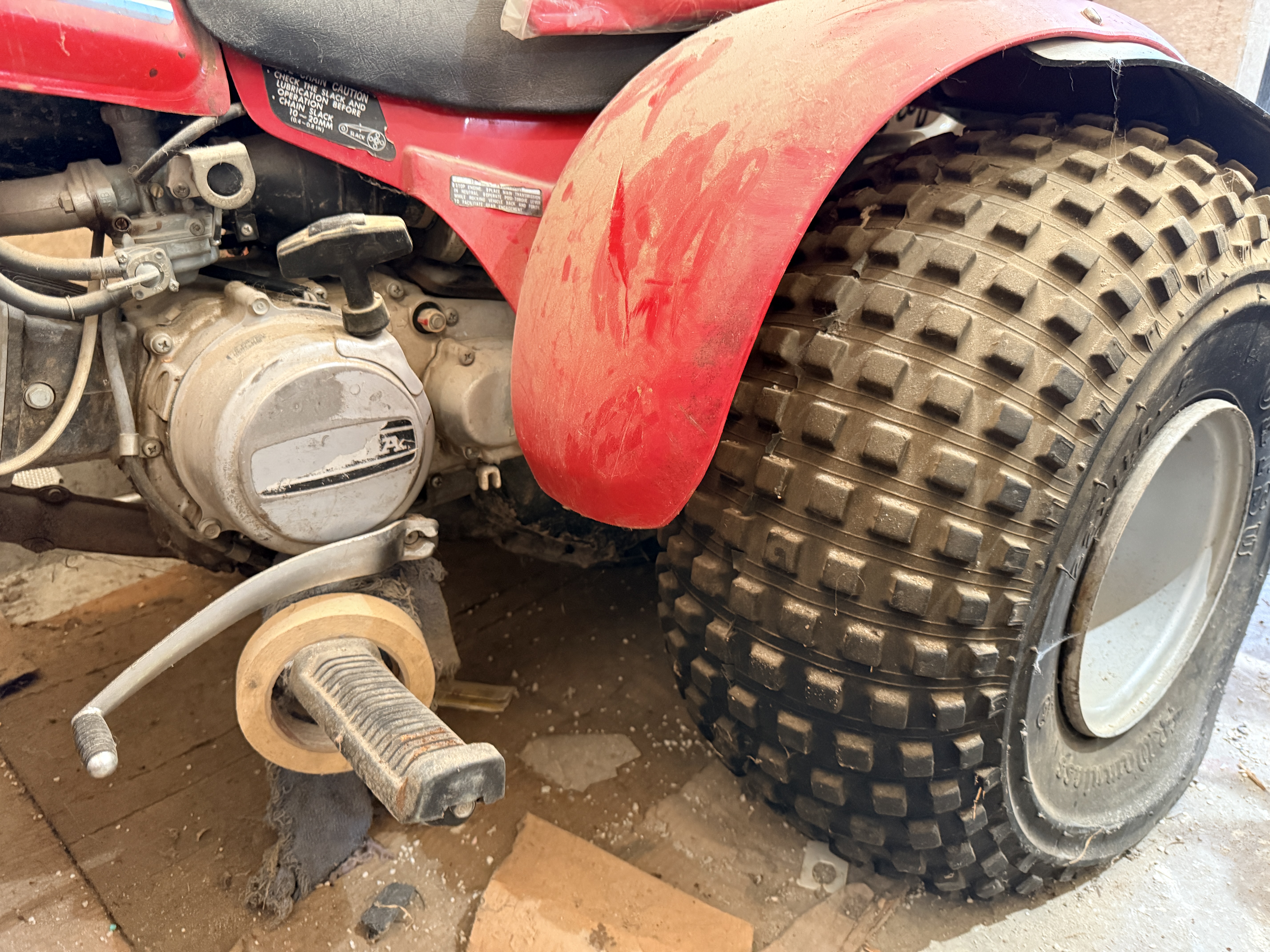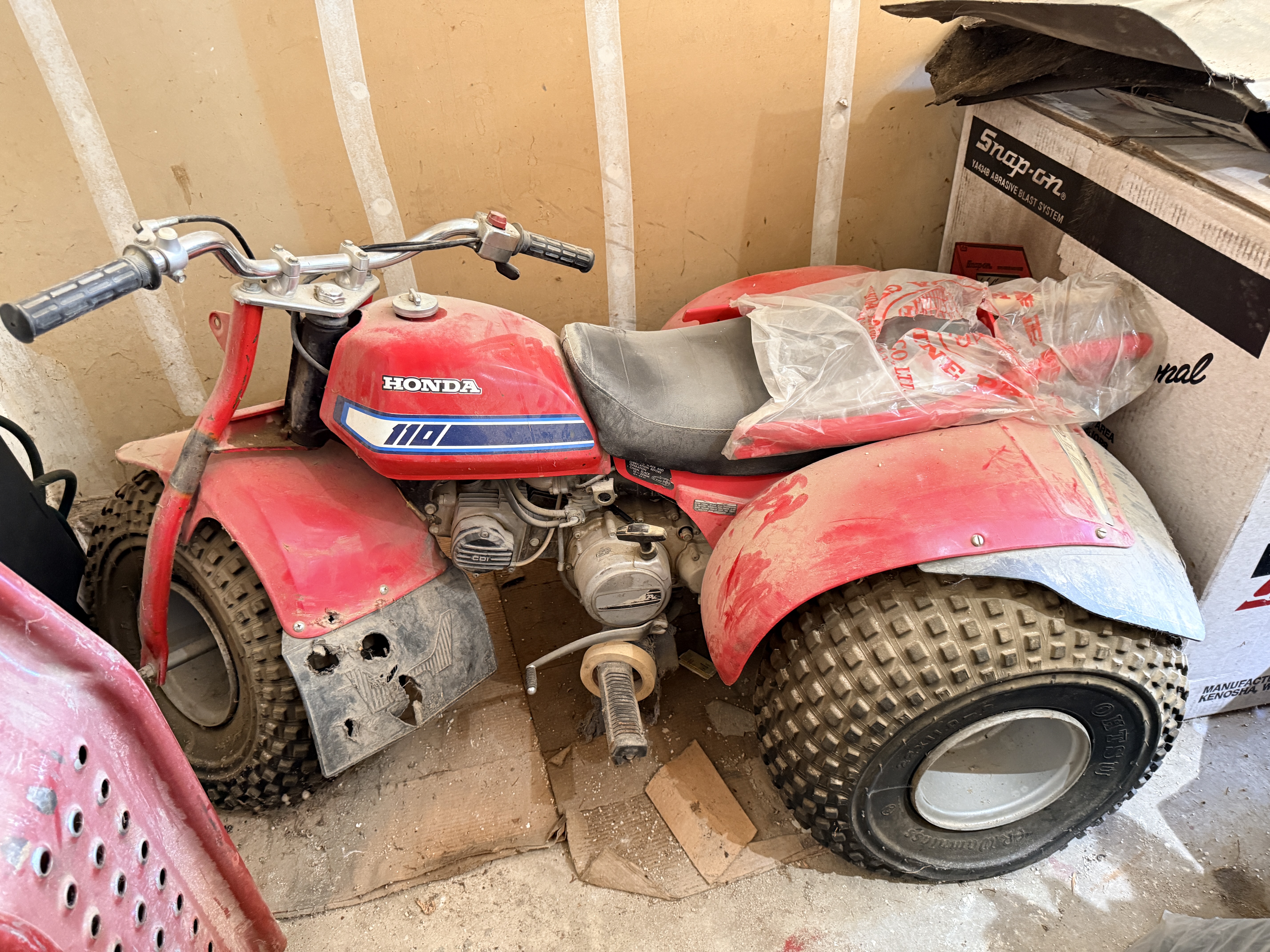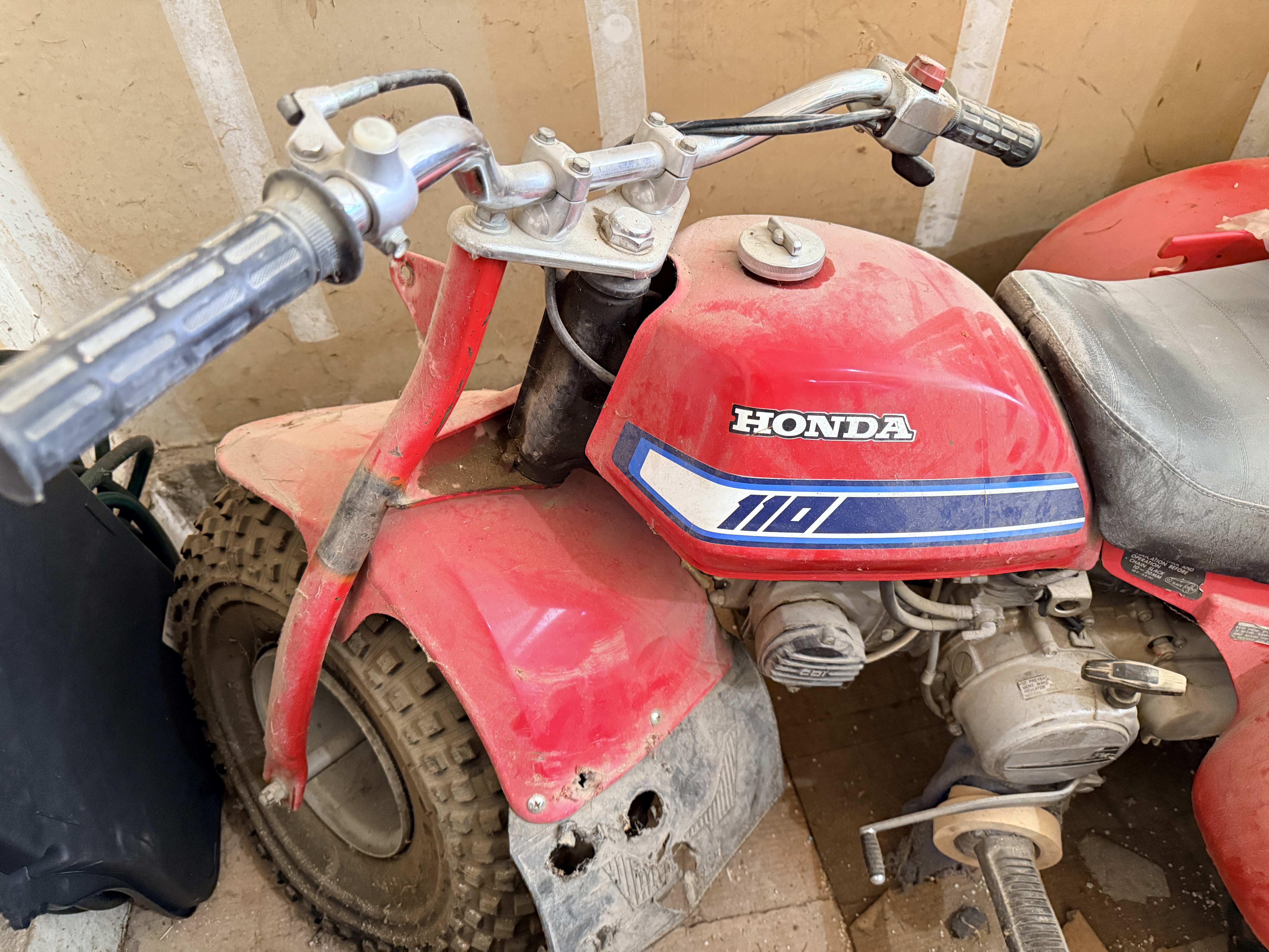 This vehicle is in garage find condition. The red plastic components are intact but exhibit fading, surface scratches, and heavy dust. The front rubber mudflap is heavily degraded with multiple large tears and holes. Surface corrosion is visible on the handlebars, footpegs, and exposed hardware. The engine and mechanical systems are untested and the operational status is unknown. Tires show age-related wear and soil.