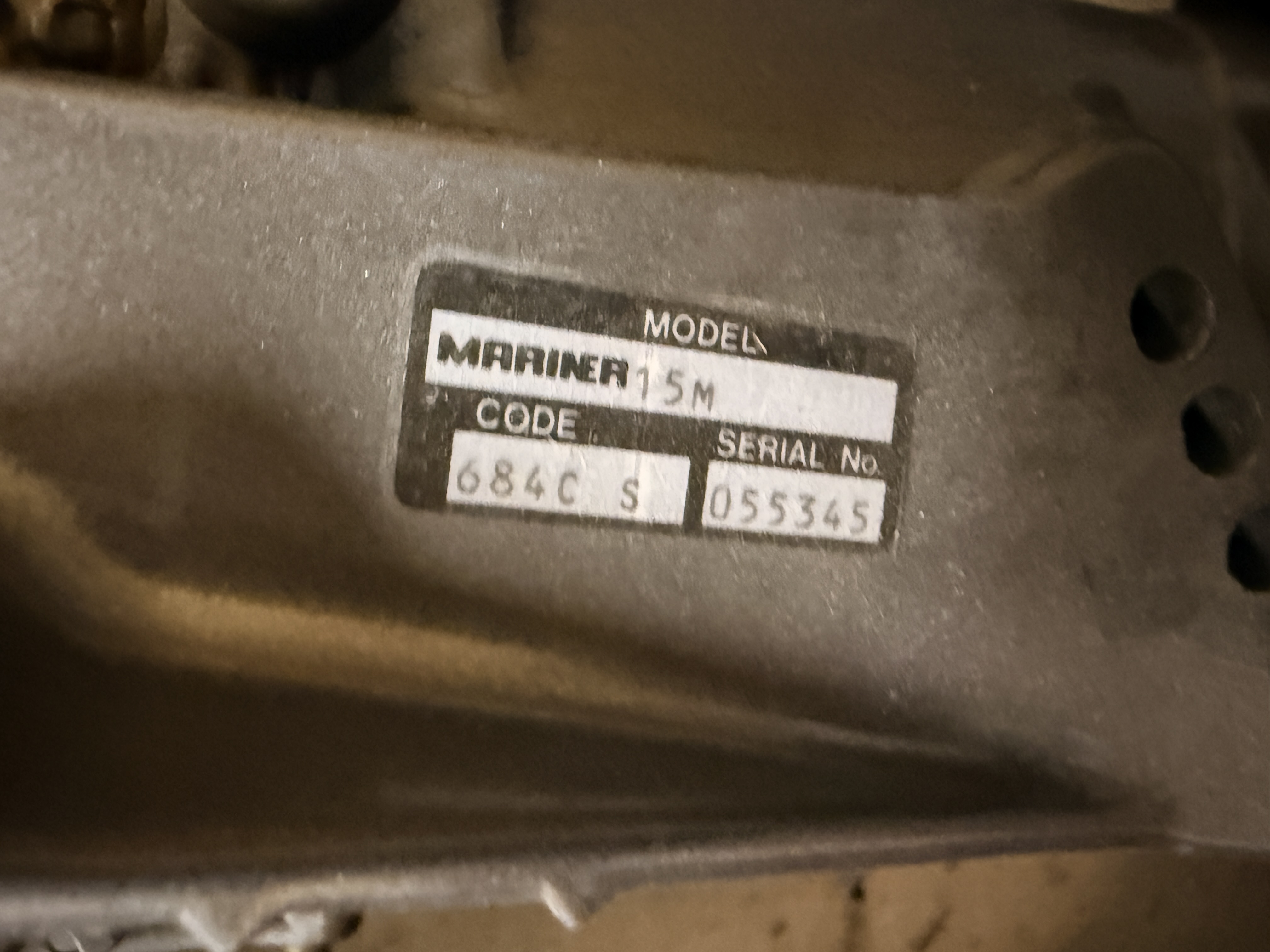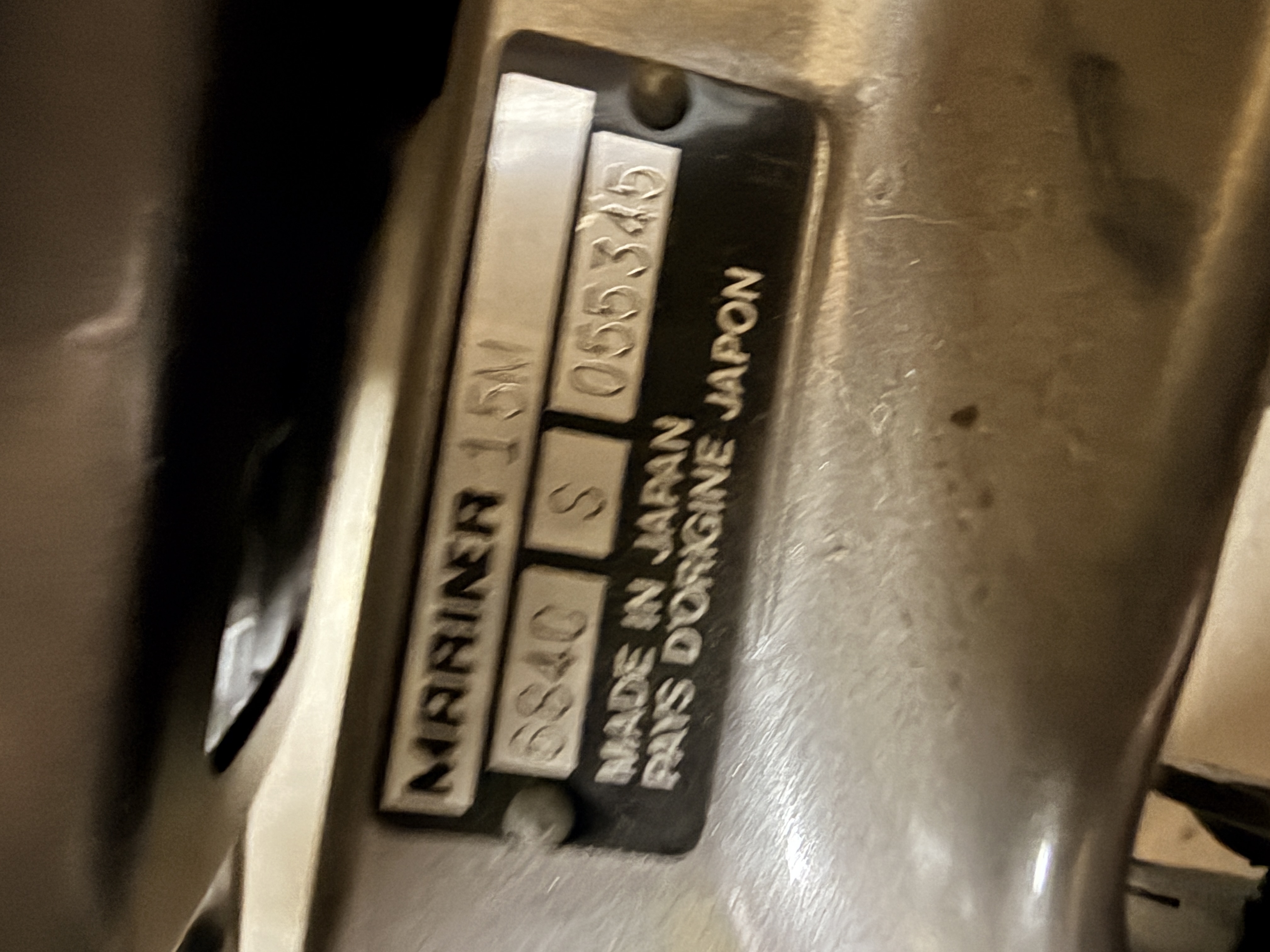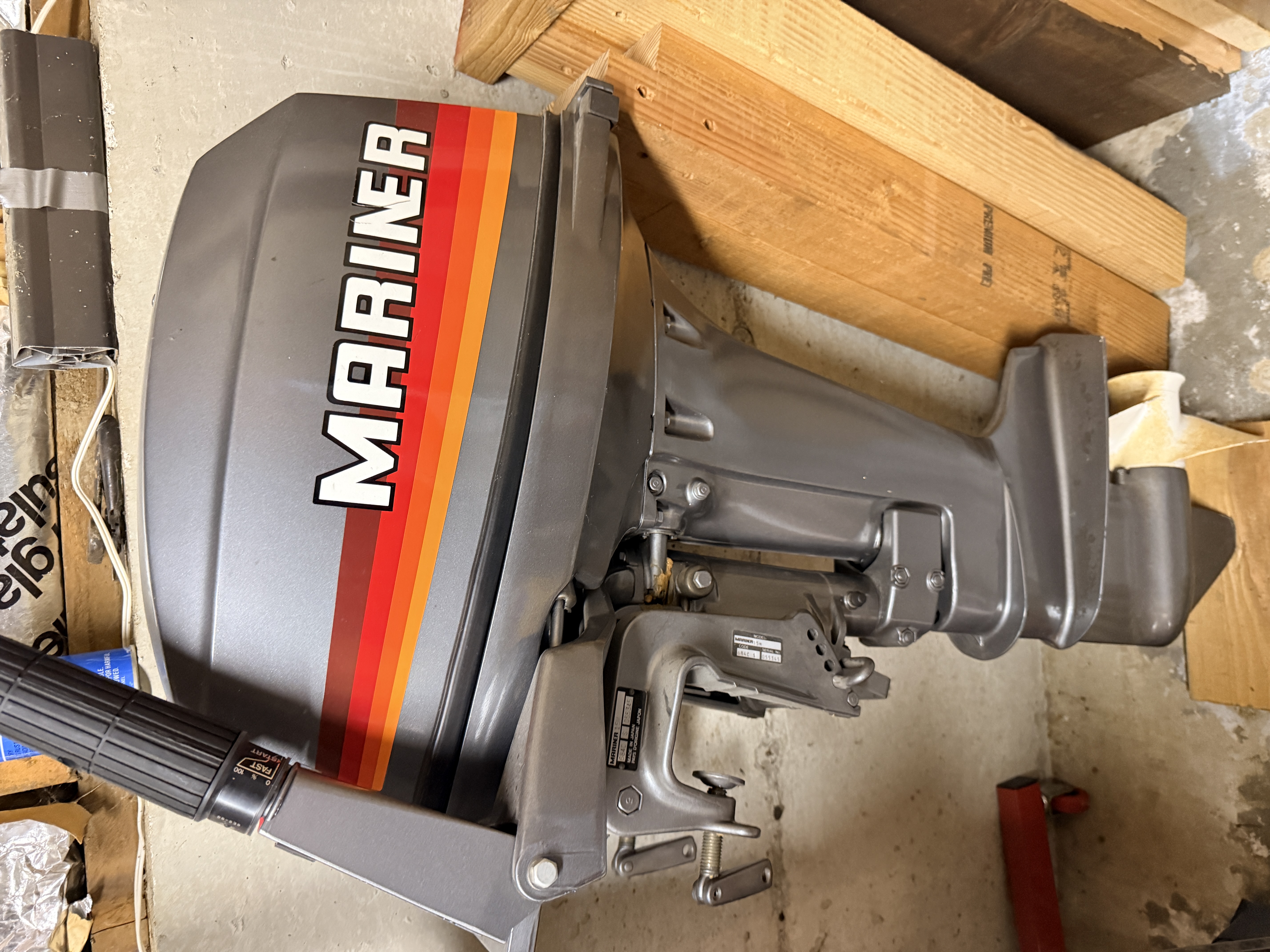 This Mariner 15M is a 15 horsepower outboard boat motor manufactured in Japan. The unit features a manual pull-start mechanism with the word START embossed on the handle and a tiller-style steering handle with integrated twist-grip throttle controls. The exterior is finished in gray, and the cowling features a large decal with the letters MARINER in white over red, orange, and yellow racing stripes. The top rear of the cowling displays the number 15. The motor is equipped with a white-finished three-blade propeller and a red coiled safety kill-switch lanyard. It includes an externally mounted mounting bracket with manual screw clamps. A black and silver metal data plate is affixed to the mounting bracket, embossed with MODEL MARINER 15M, CODE 684C S, and SERIAL No. 055345. A secondary plate states MADE IN JAPAN and PAYS D ORIGINE JAPON. The throttle handle indicates FAST, START, 100, and 0 positions.