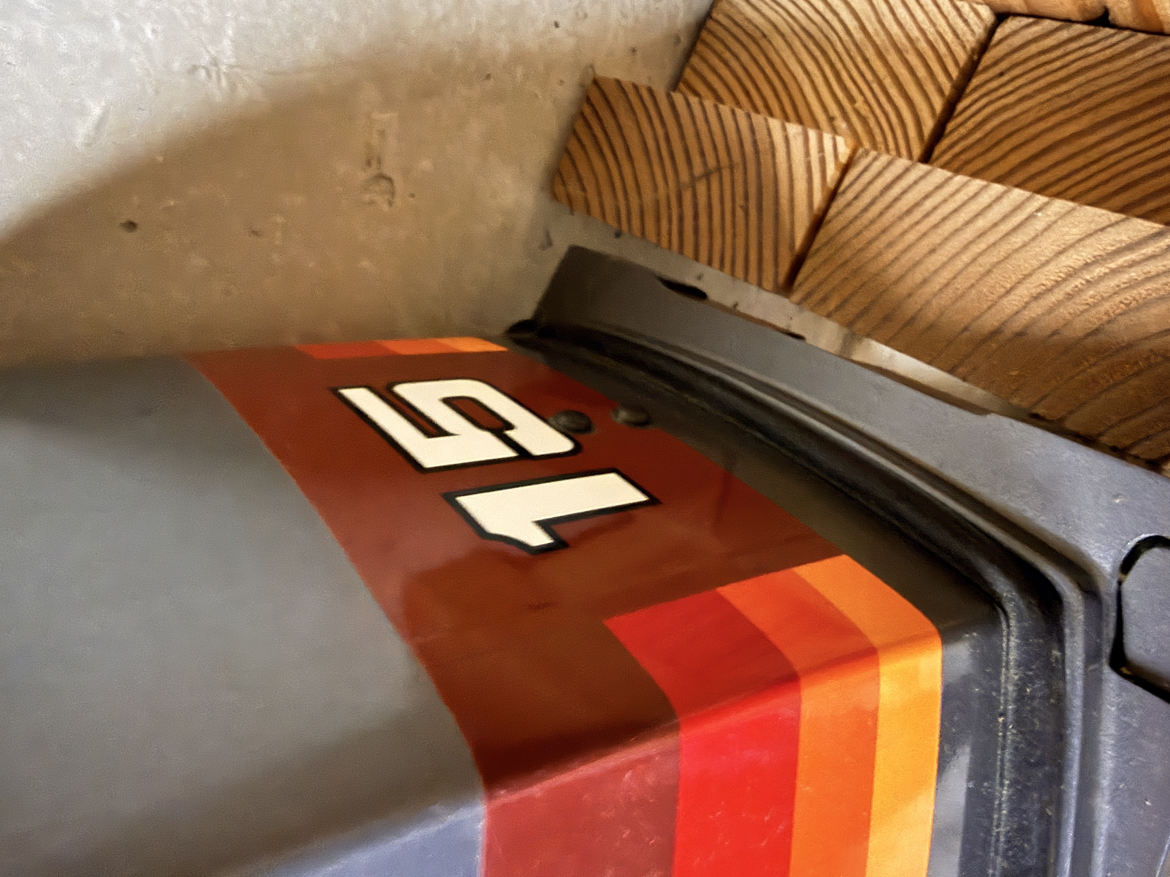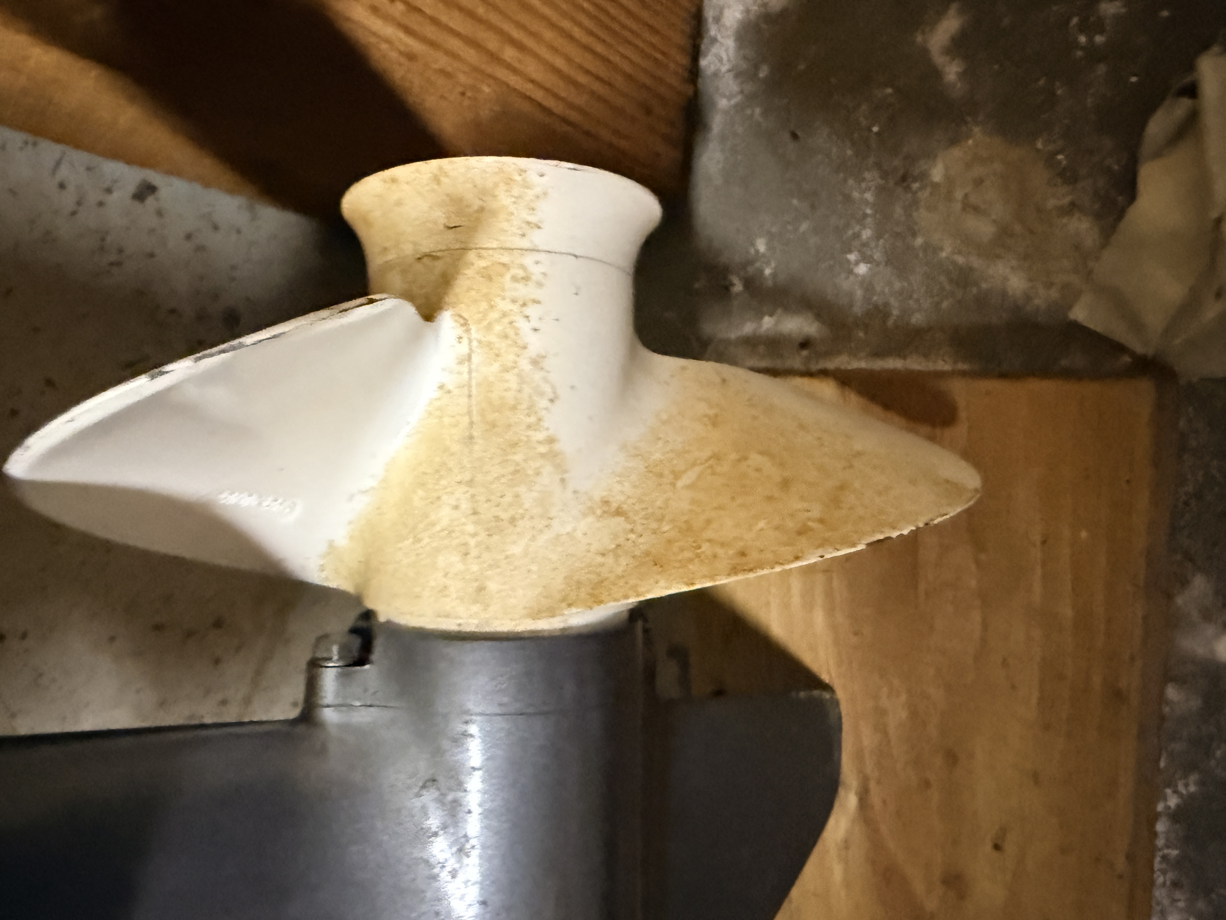The outboard motor is in good used cosmetic condition. The cowling and decals remain vibrant with minimal fading or peeling. The paint on the midsection and lower unit shows minor scuffs and surface wear consistent with age and use. The propeller exhibits brownish mineral staining and minor edge wear on the blades. Mechanical and operational condition has not been tested; the motor is sold as-is. Engine hours we are told by the estate are less than 30 hours.