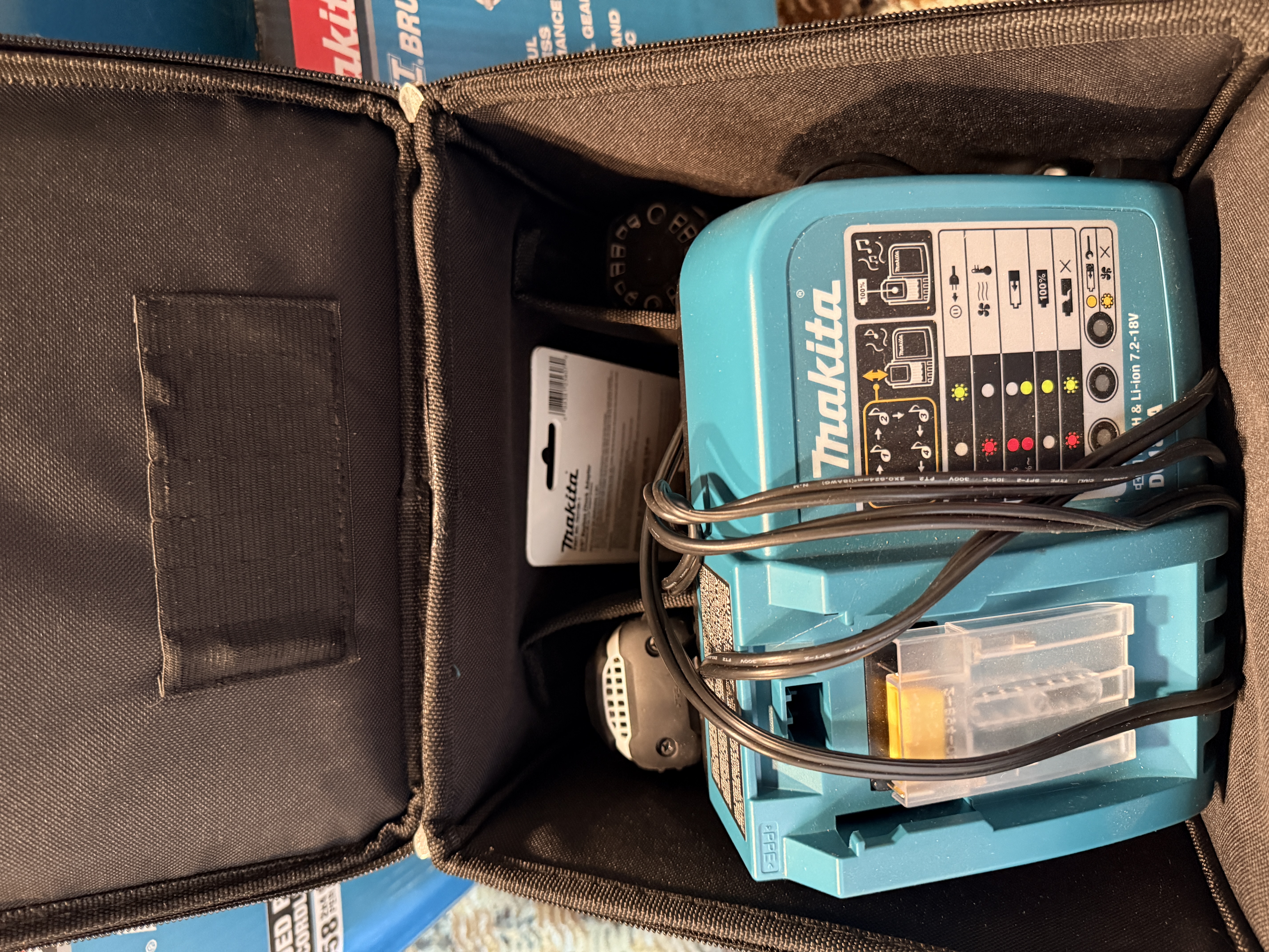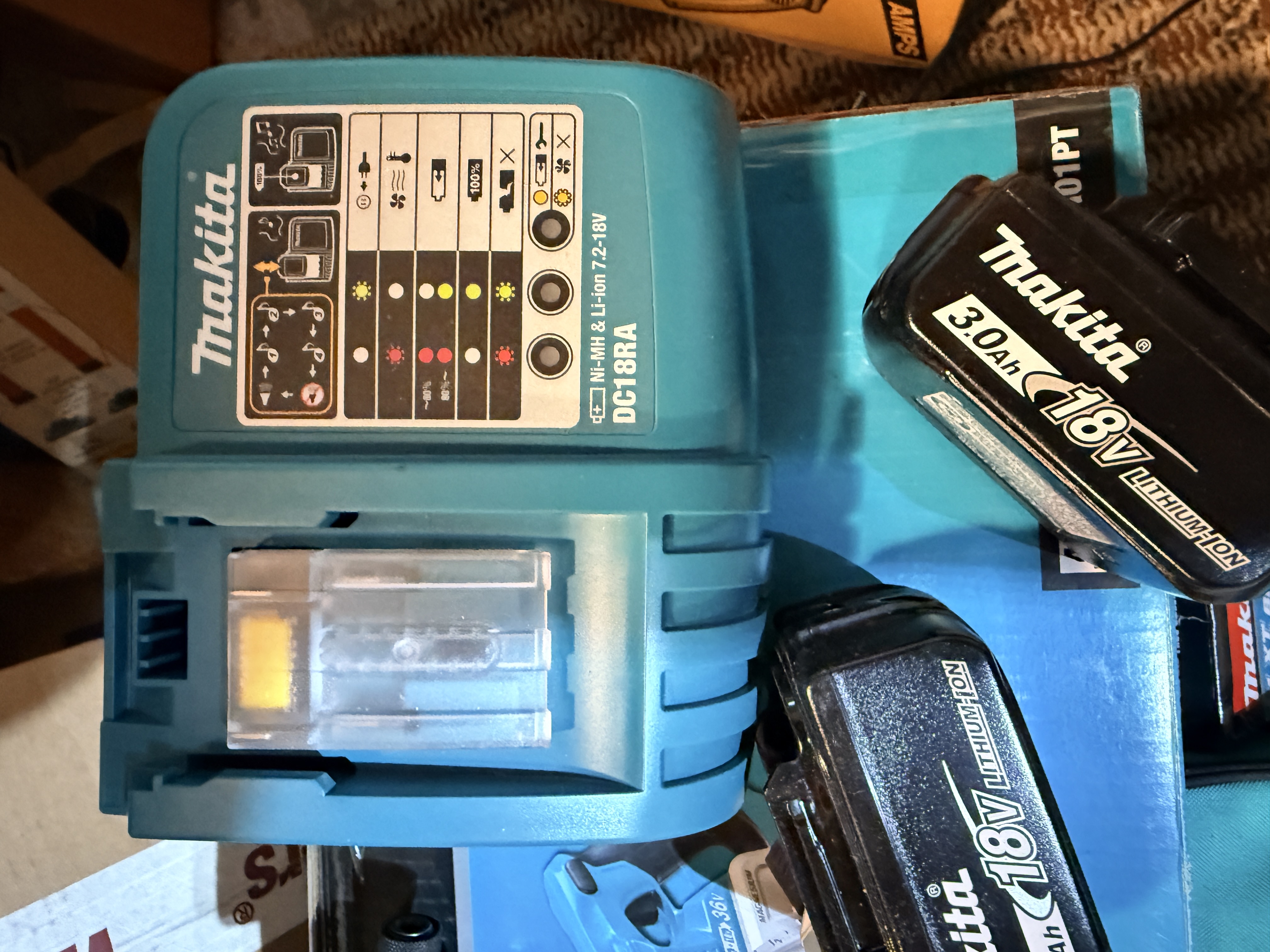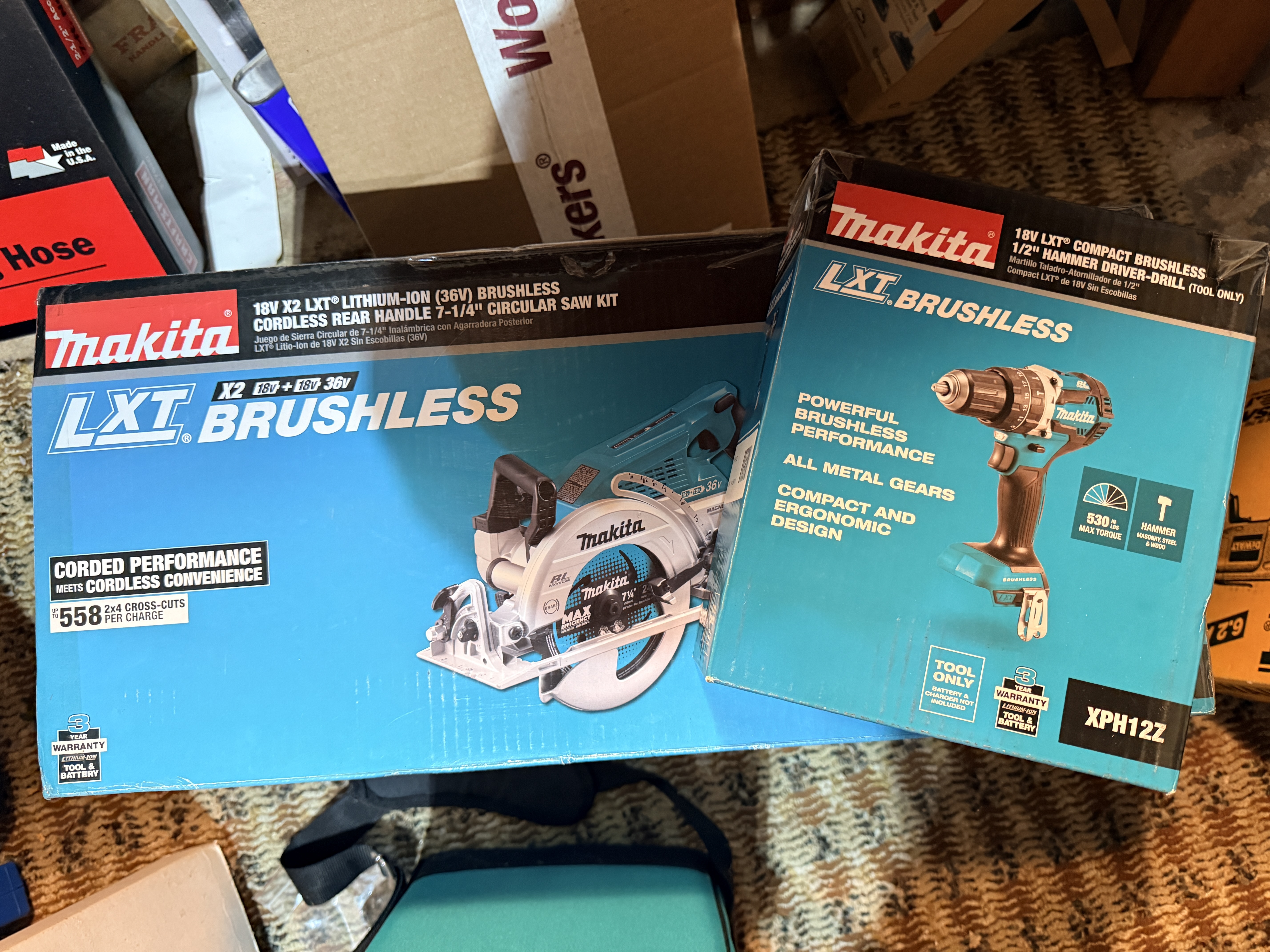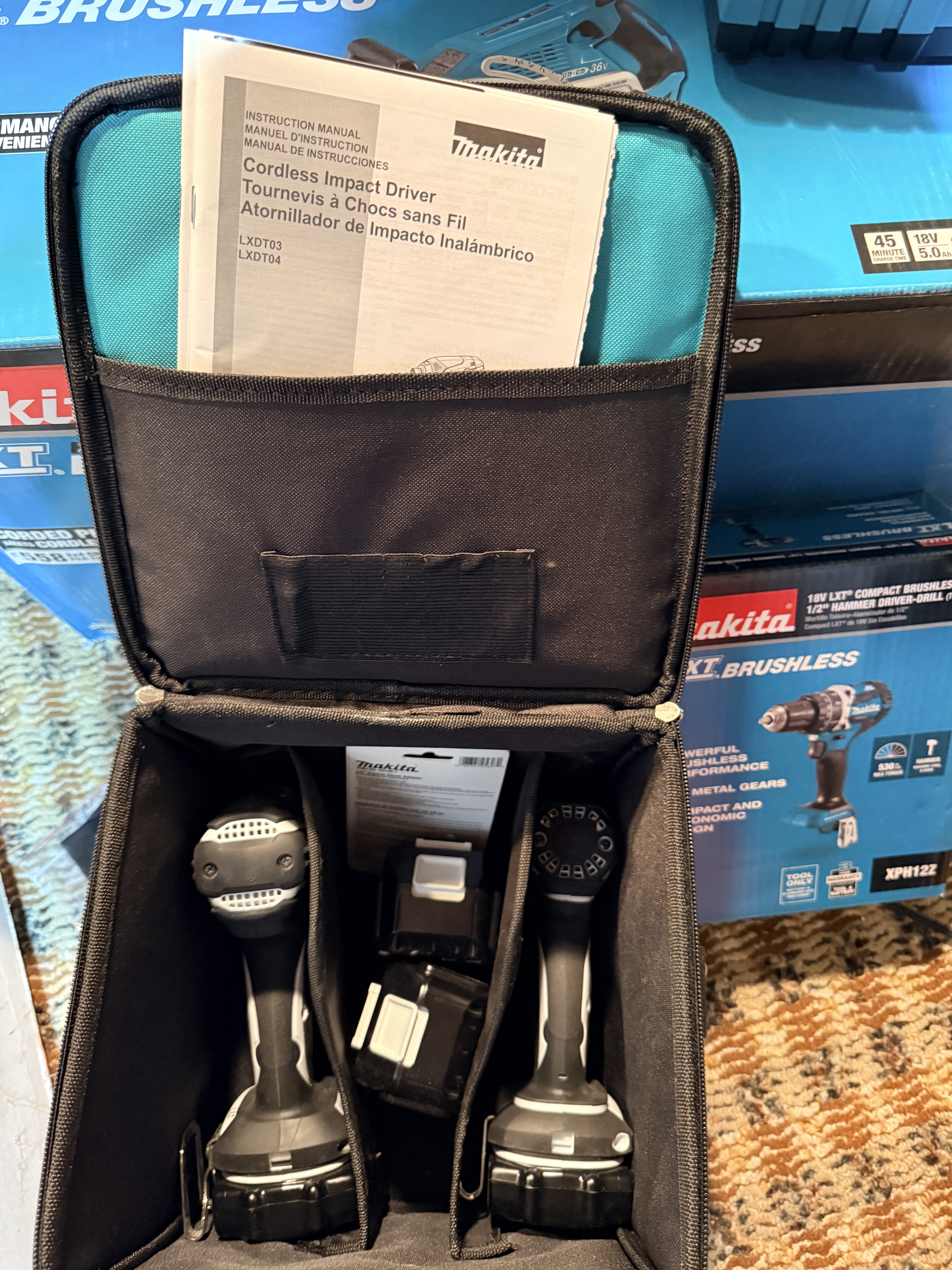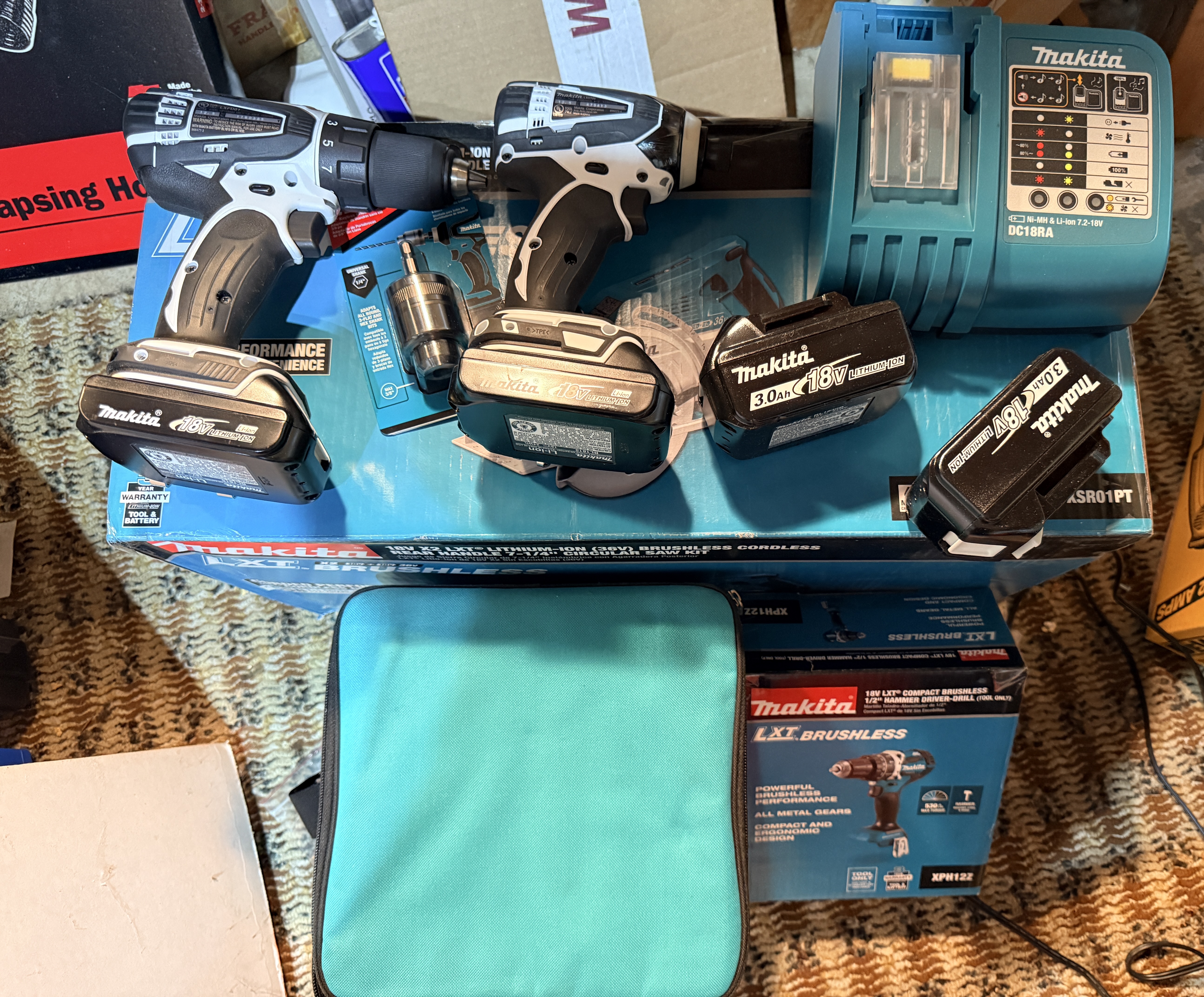 This lot consists of an assortment of Makita brand 18V LXT cordless power tools and accessories, including components of a Makita 18V Lithium-Ion Compact Combo Kit. The group includes one Makita LXFD01 18V LXT Lithium-Ion 1/2 inch Cordless Driver-Drill and one Makita LXDT04 18V LXT Lithium-Ion Cordless Impact Driver, both finished in a white and black color scheme. Also included is one Makita DC18RA Rapid Optimum Charger compatible with 7.2V to 18V Ni-MH and Li-ion batteries. The lot features four Makita BL1830 18V 3.0Ah Lithium-Ion rechargeable batteries. Accessories include a new-in-package Makita 1/4 inch hex shank to 3/8 inch keyless chuck adapter, an instructional manual for the LXDT03 and LXDT04 impact drivers, and a teal and black soft-sided carrying bag with embroidered Makita branding. The lot is accompanied by original retail boxes for a Makita XPH12Z Hammer Driver-Drill and a Makita XSR01PT 18V X2 LXT Rear Handle Circular Saw Kit. Identification labels on the tools specify Makita Corporation of Anjo, Aichi, Japan, and indicate the items were made in China.