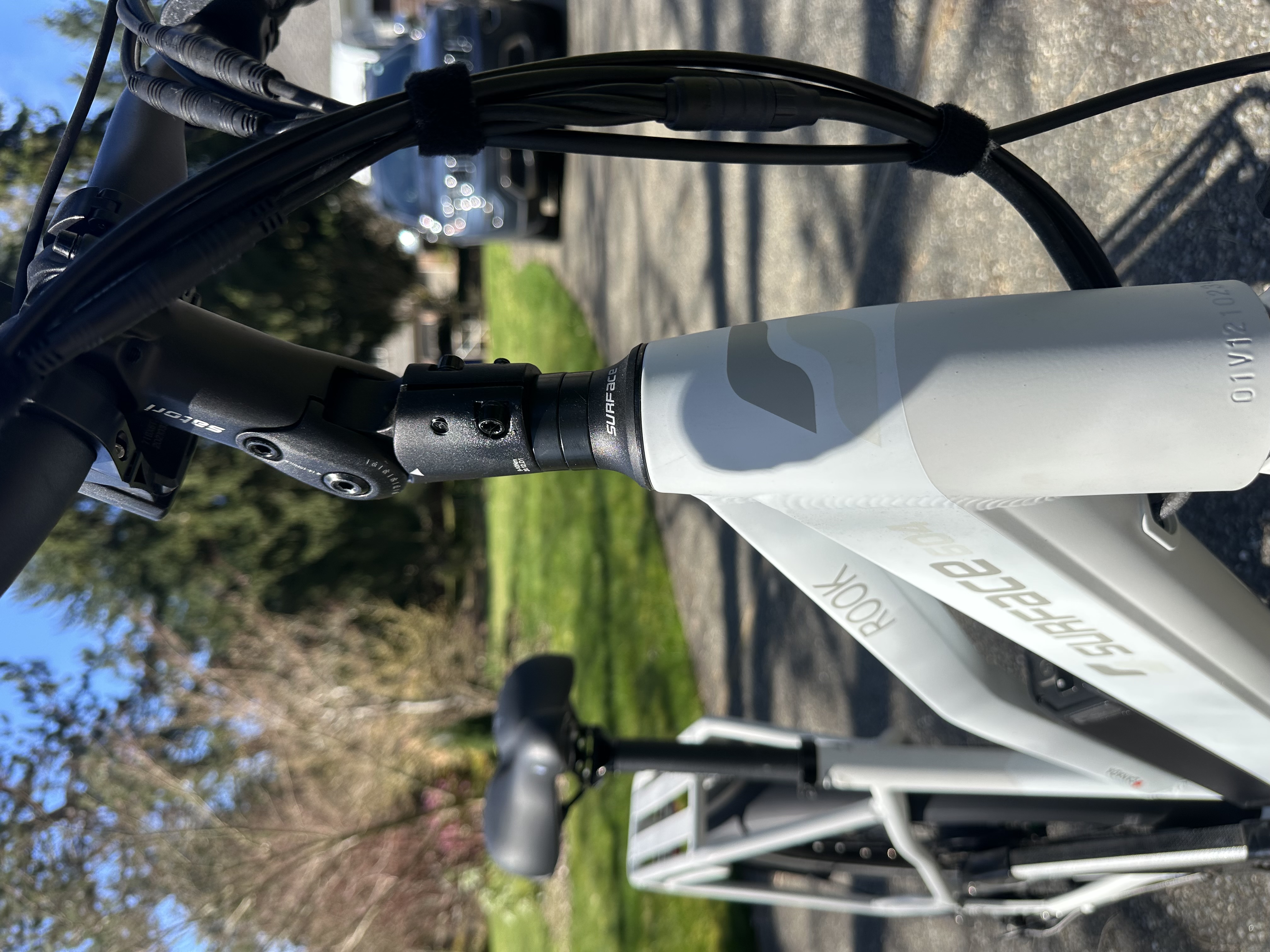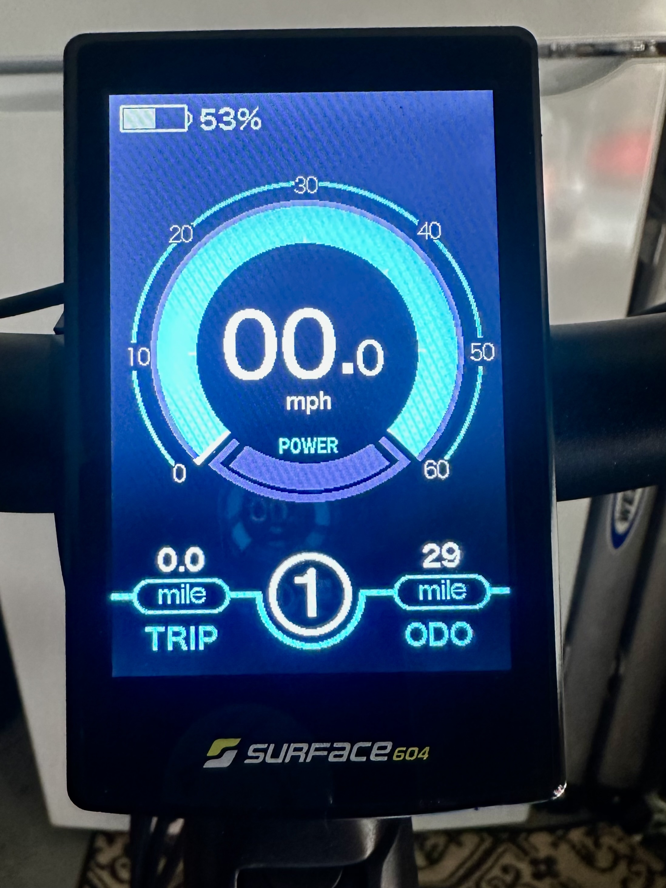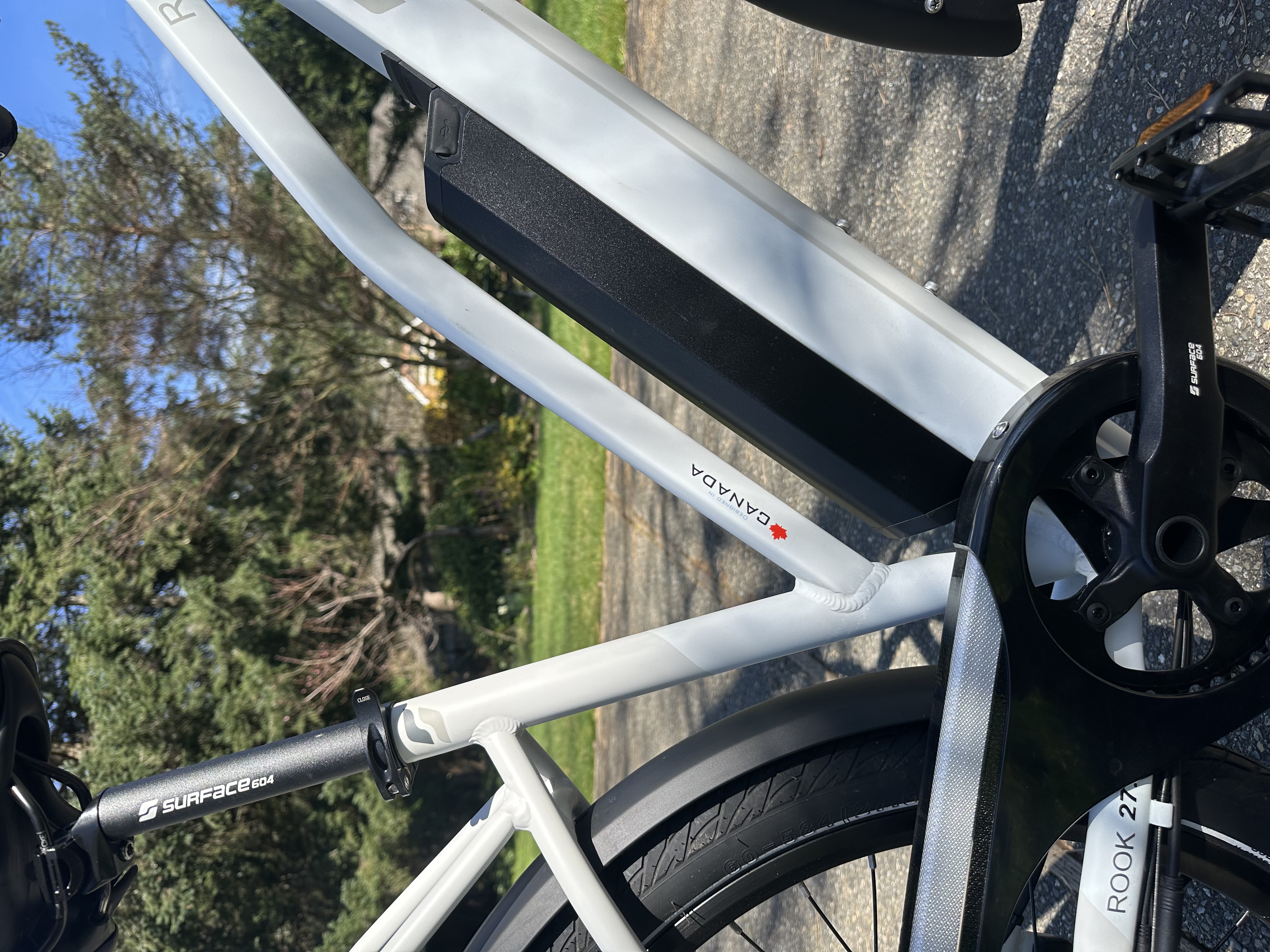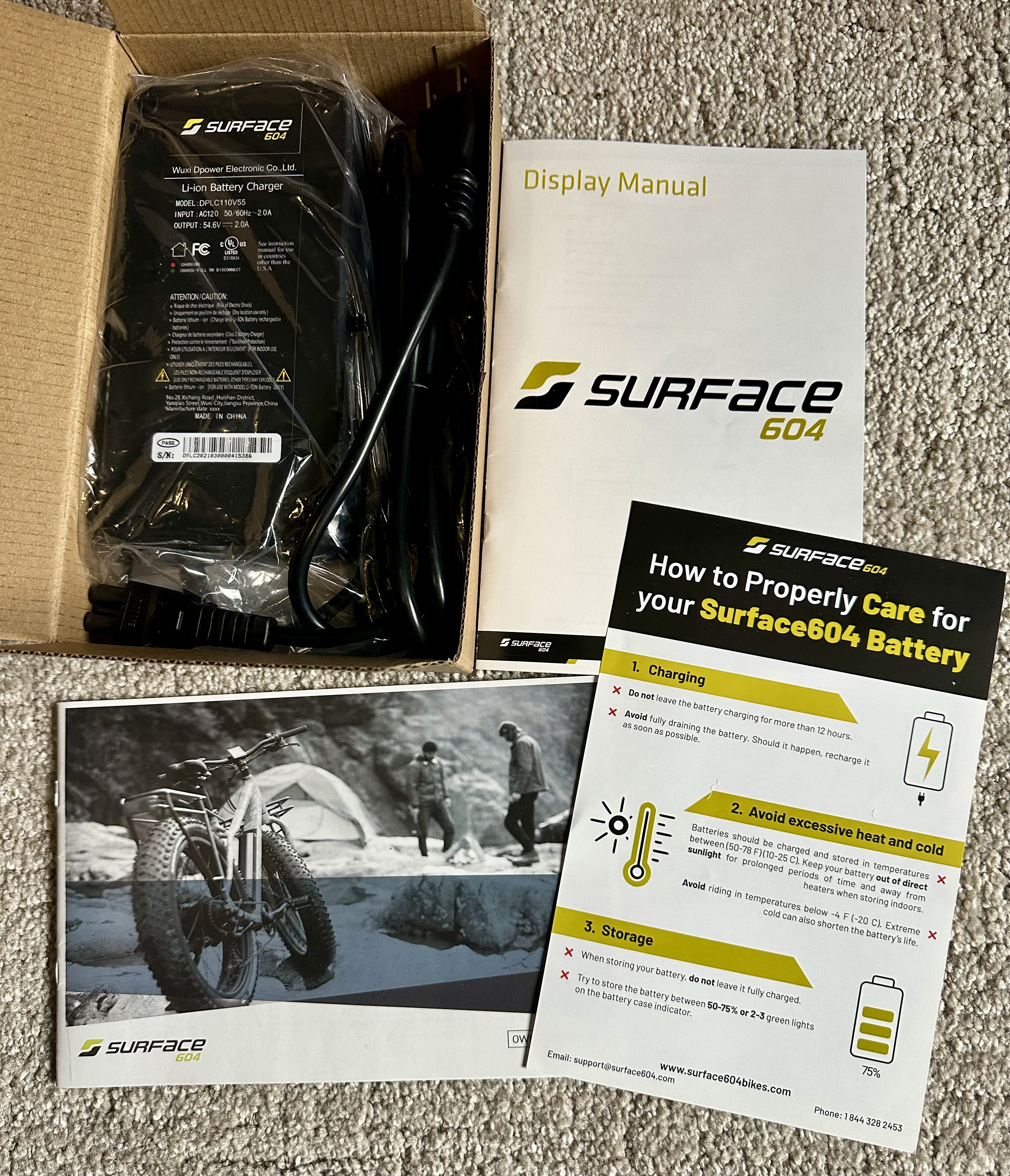 Only 29 miles on this bike! A Surface 604 Rook electric bicycle featuring a step-through aluminum frame finished in matte white with grey and black accents. The frame is marked with Surface 604 and Rook branding, alongside a Canada maple leaf emblem. The head tube is stamped with the number 01V121023. The bicycle is equipped with an integrated digital color LCD display, a Satori adjustable stem, and Surface 604 branded black platform pedals. Functional accessories include a rear cargo rack and front and rear fenders. The item is accompanied by its original documentation, including an owner’s manual, display manual, and battery care guide. Also included is a Wuxi Dpower Li-ion battery charger, model DPLC110V55, serial number DPLC2021030000415356. The digital display indicates a battery charge level of 53 percent. The odometer reading is only 29 miles;