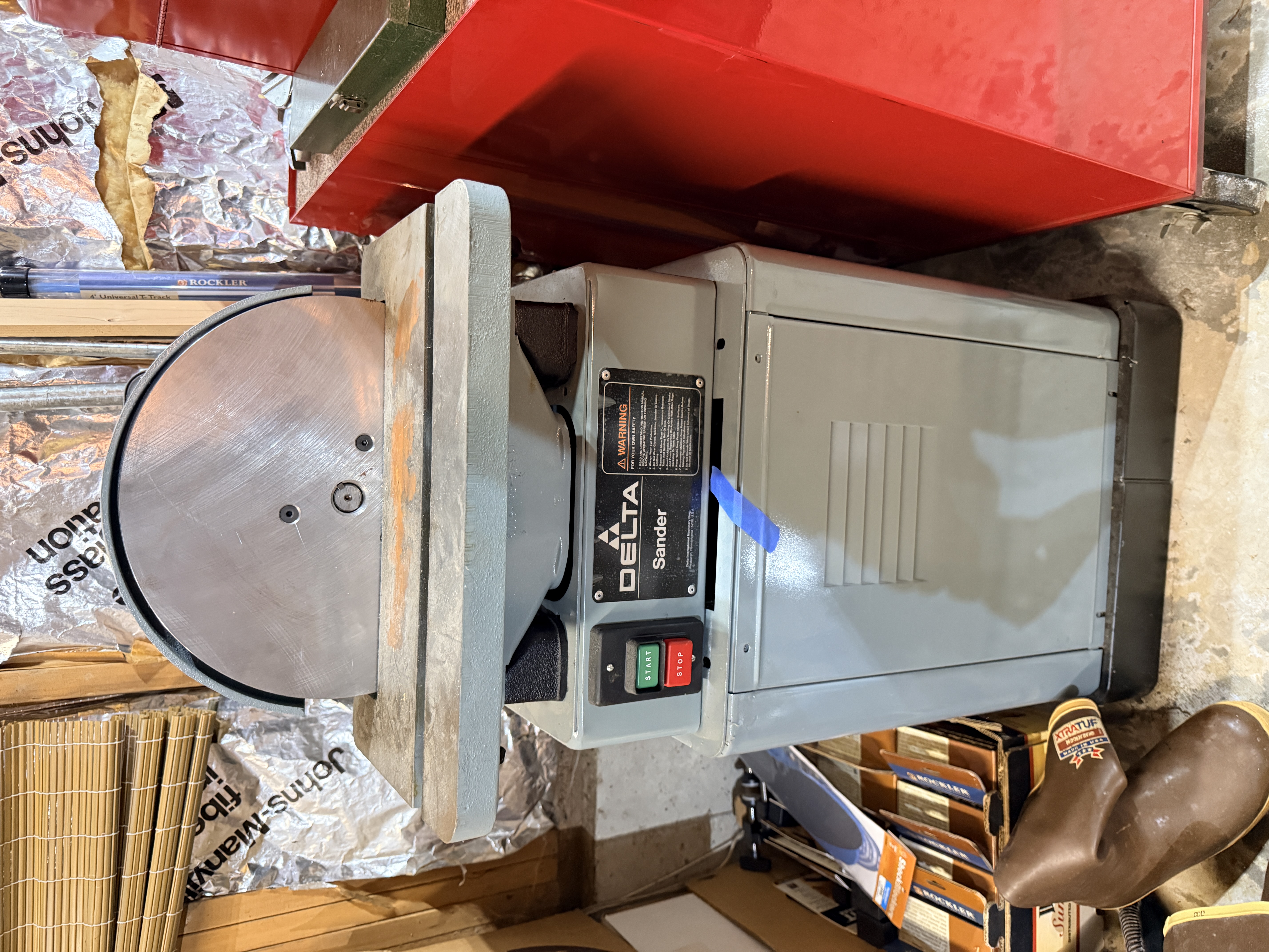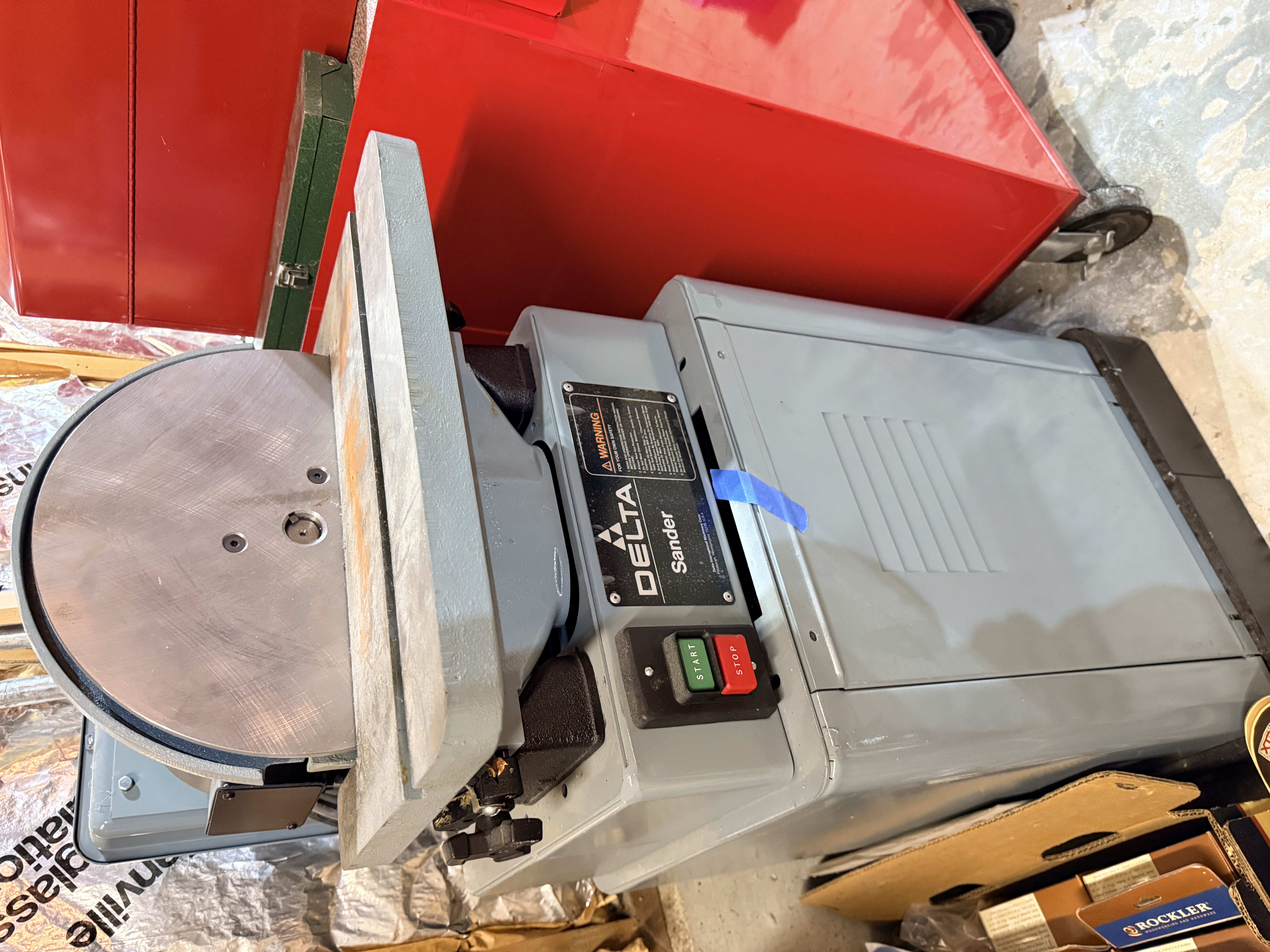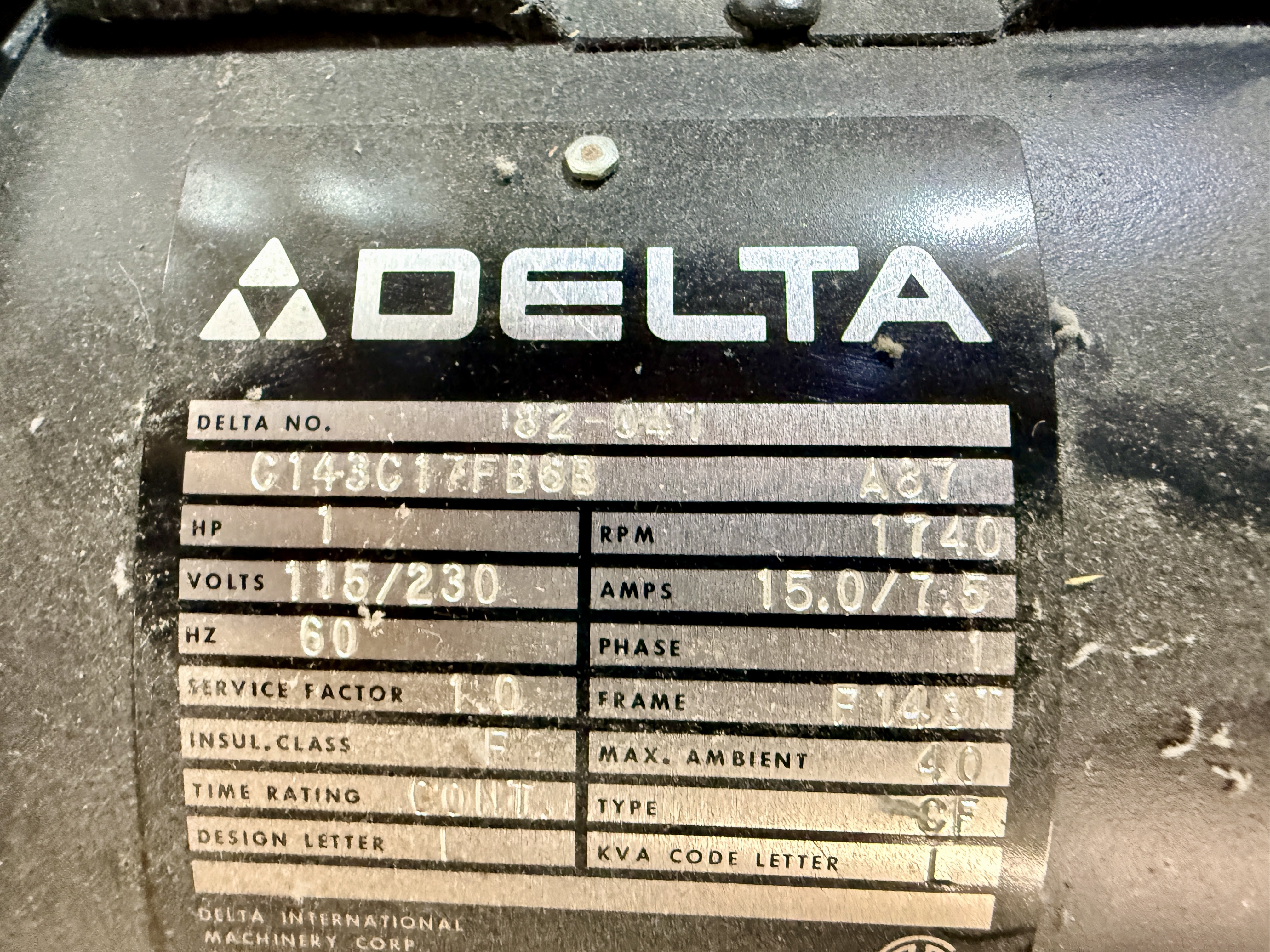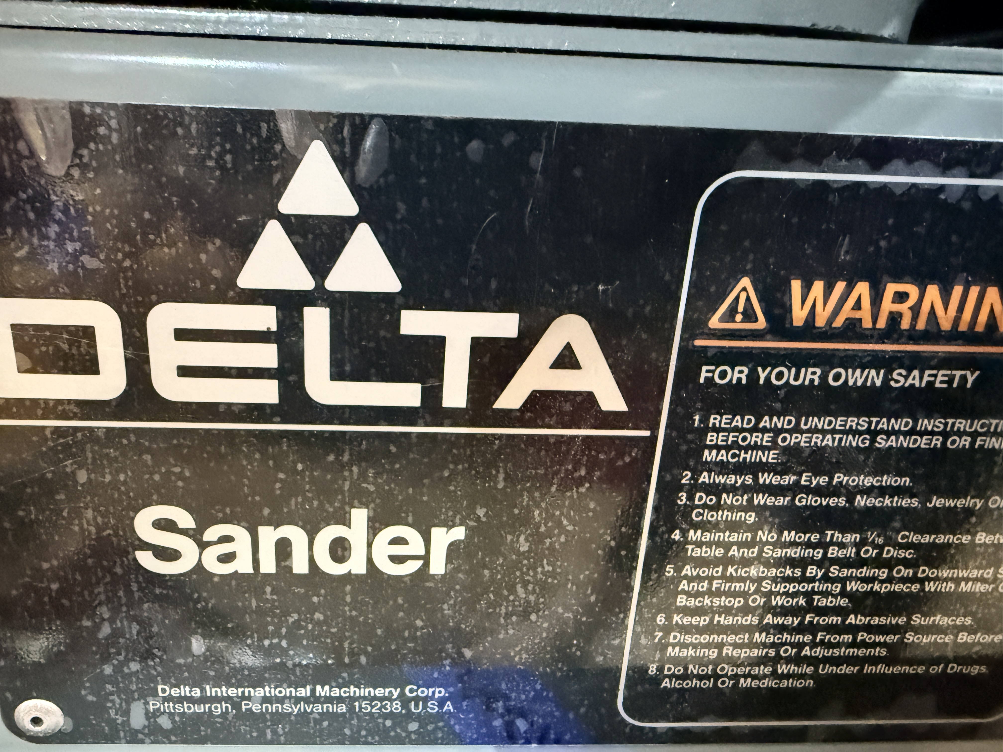 This is a professional-grade stationary disc sander manufactured by Delta International Machinery Corp. of Pittsburgh, Pennsylvania. The machine features a large diameter sanding disc and a tilting cast iron work table designed for angled sanding applications. The unit is mounted on a heavy-gauge steel cabinet housing and is powered by a 1 HP heavy-duty motor manufactured by Leeson Electric Corporation in the U.S.A. The motor is a single-phase, dual-voltage unit currently configured for 115V or 230V operation at 1740 RPM. The sander is equipped with an industrial-style magnetic starter switch with dedicated green Start and red Stop buttons. Markings on the main body plate include Delta, Sander, and Delta International Machinery Corp. The motor plate is stamped with Delta No. 182-041 and Frame F143T. The lot includes the complete sander unit, motor, cabinet base, and four unused adhesive-backed replacement sanding discs.