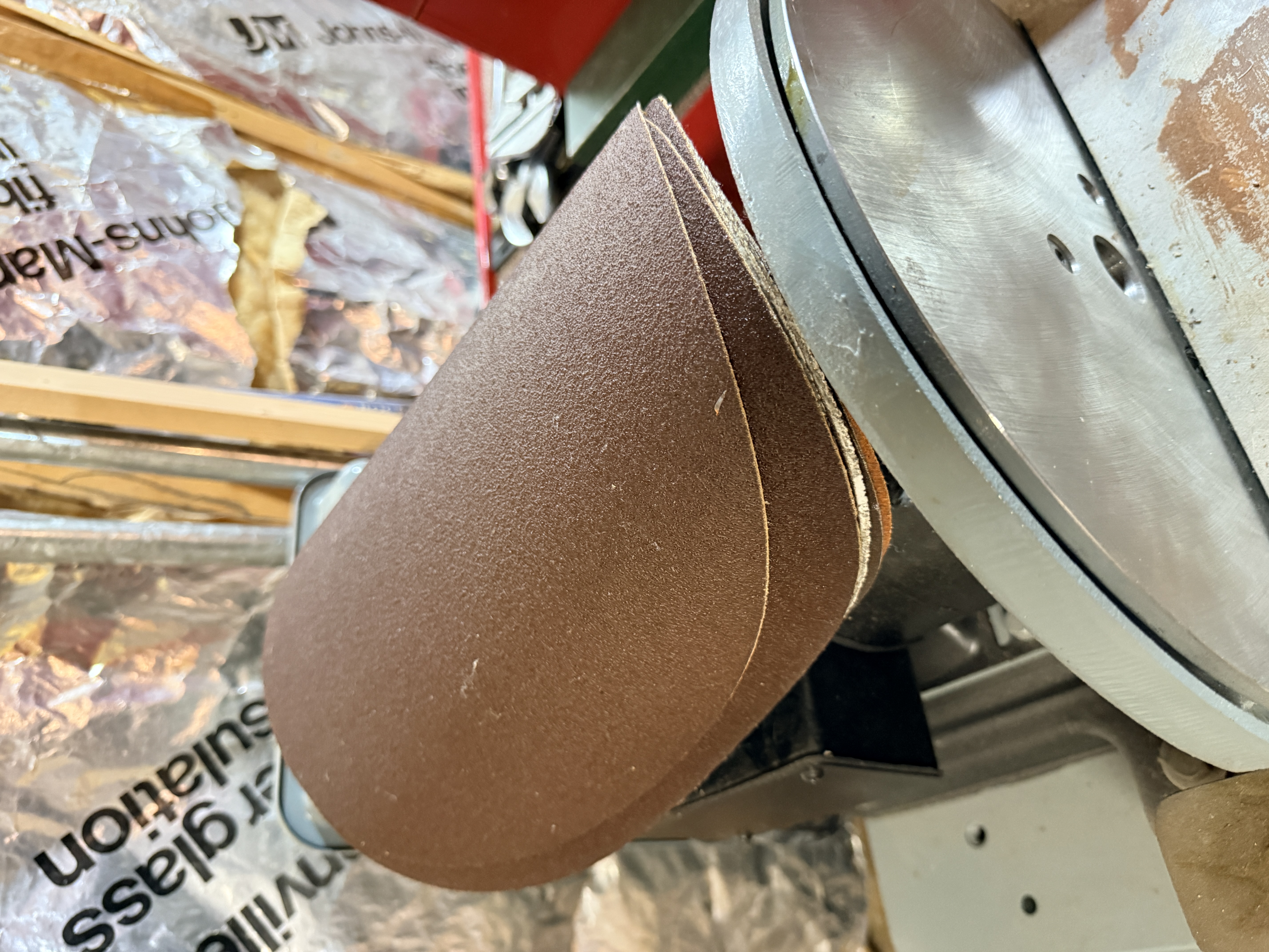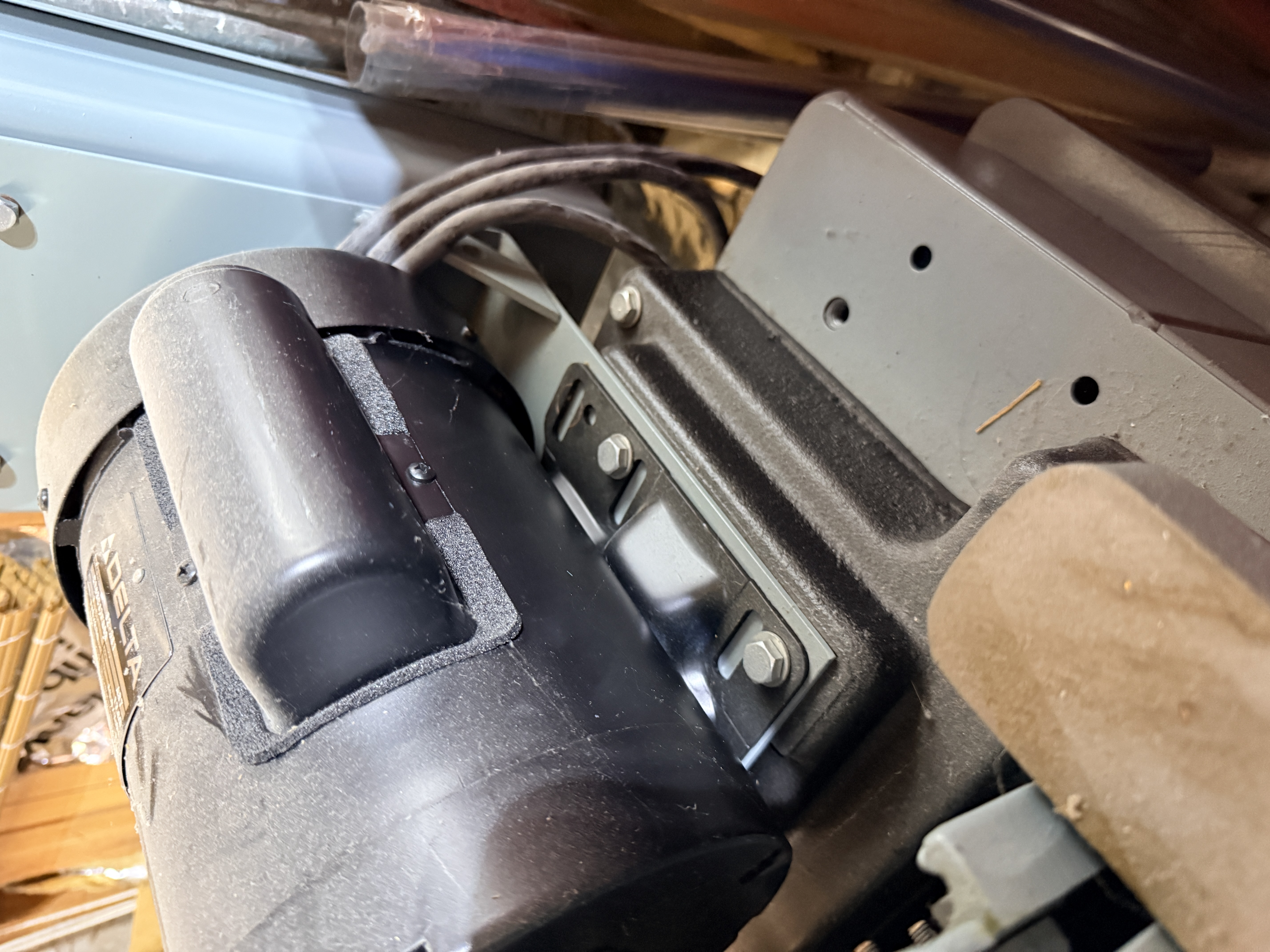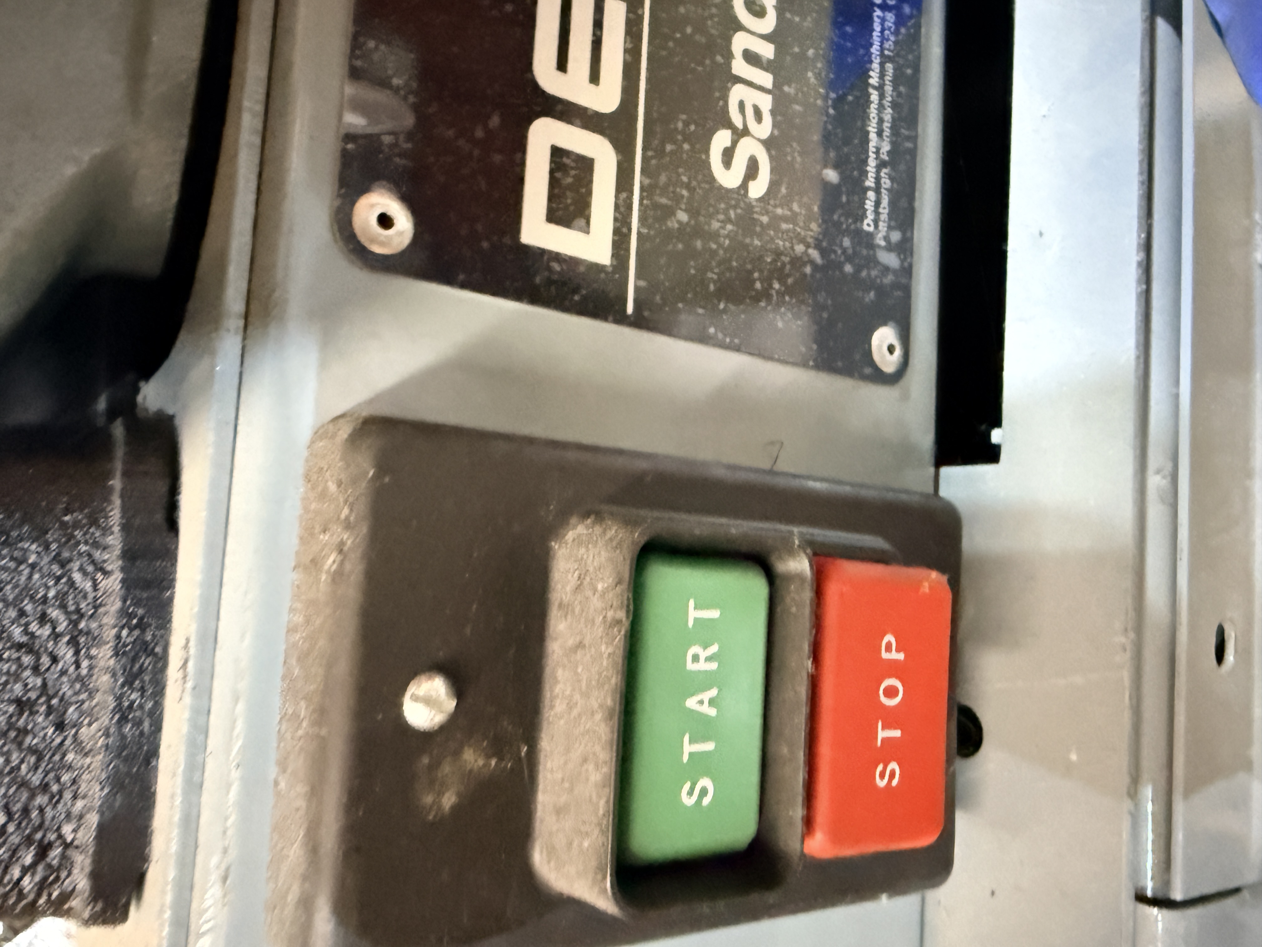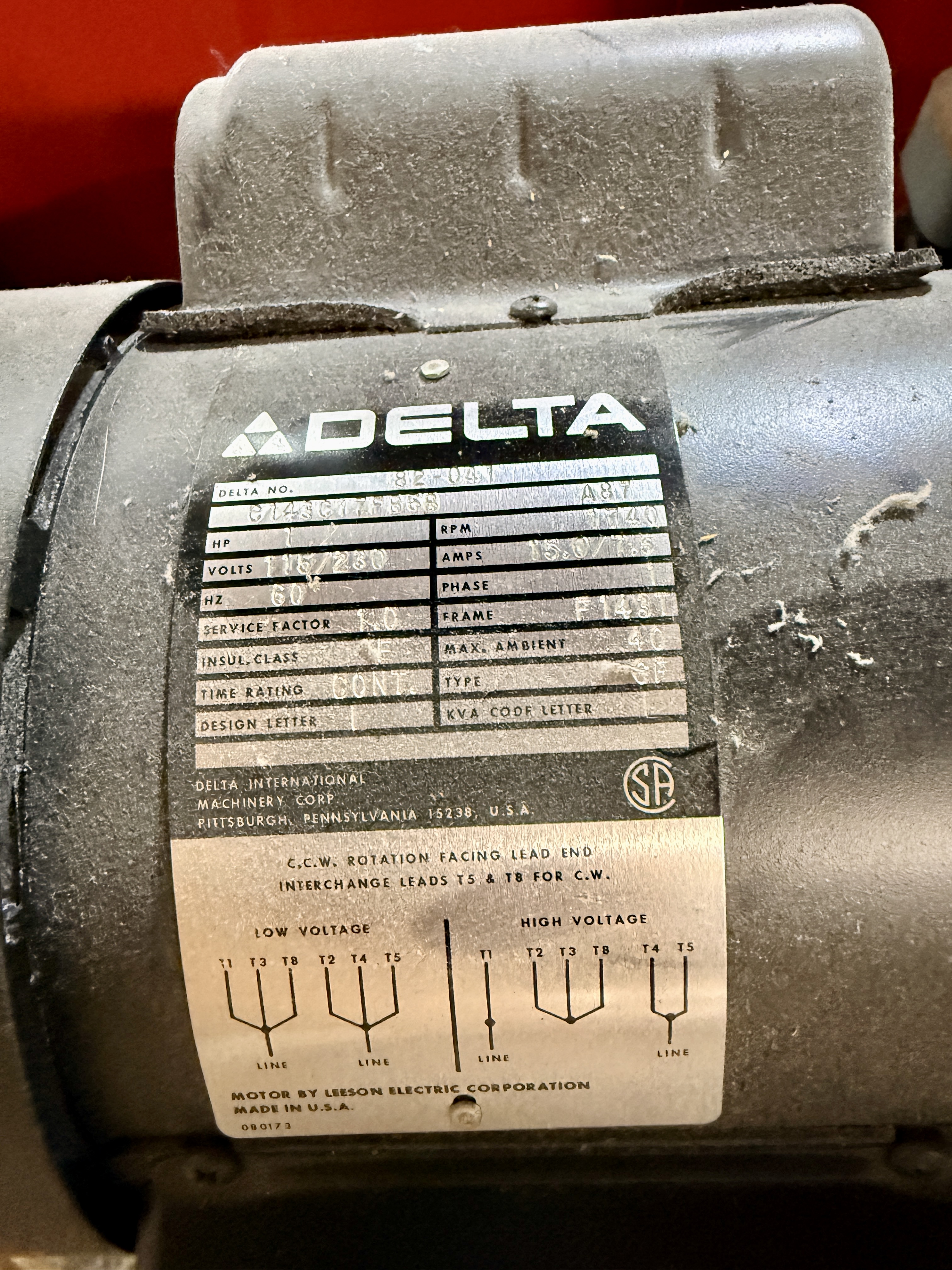 The unit appears to be in good, used professional condition. The cast iron work table shows light surface oxidation and typical shop dust consistent with age and use in a workshop environment. The steel cabinet and motor housing show minor cosmetic wear. The mechanical and electrical working status of the unit is untested.