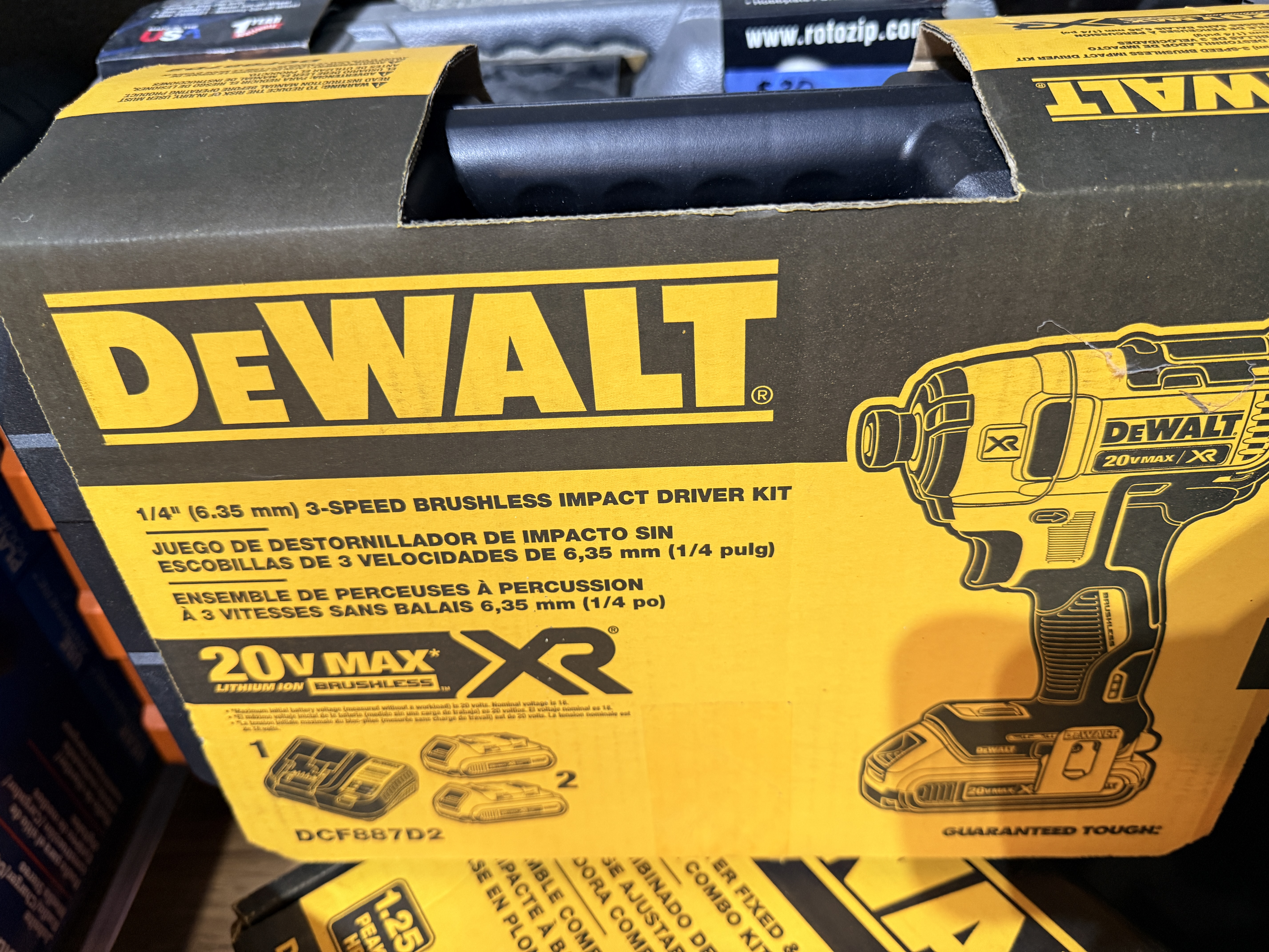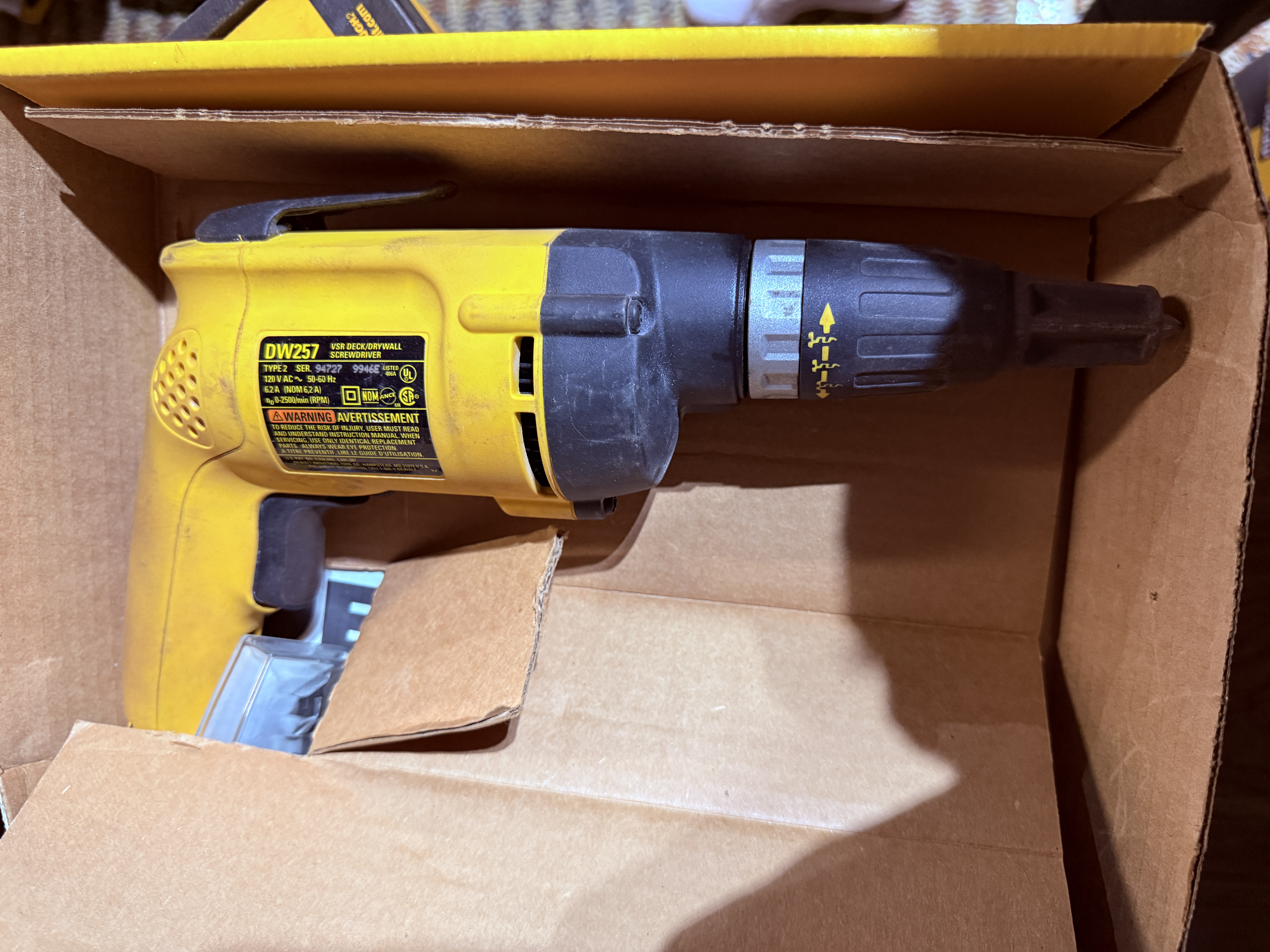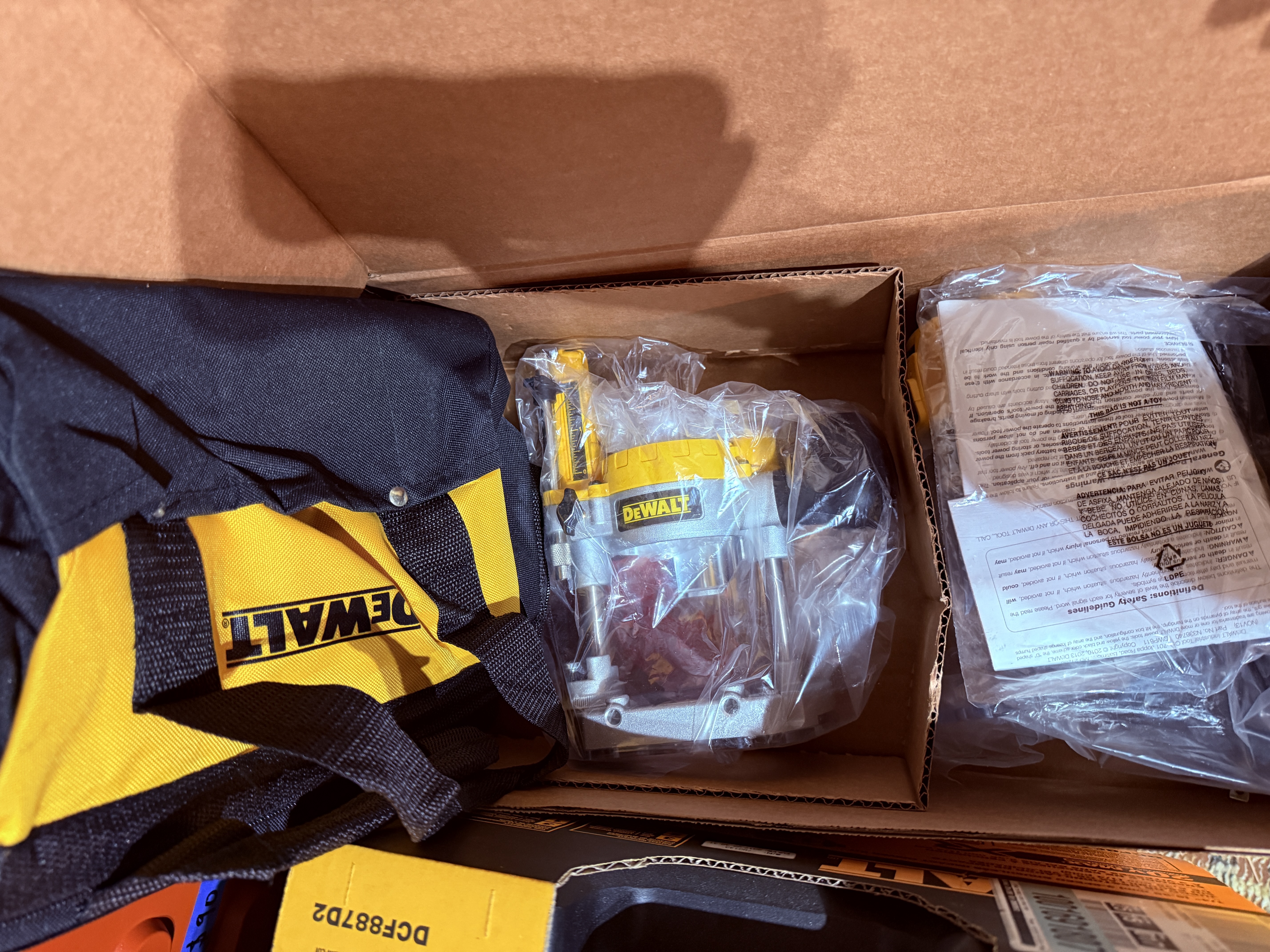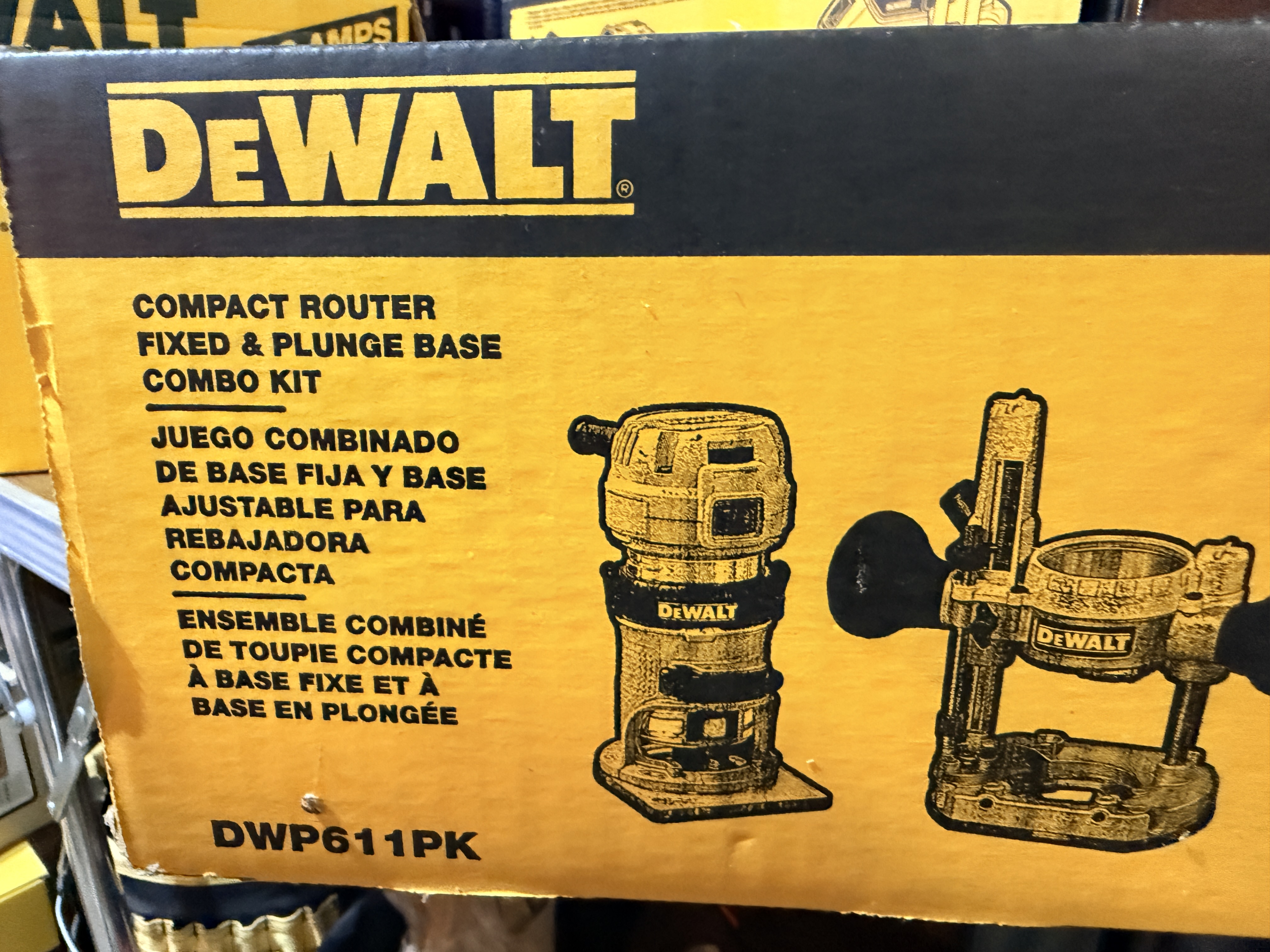 Mixed Condition. The DW257 screwdriver shows visible surface dust and minor scuffing, indicating it is a lightly used unit. The DCF887D2 impact driver kit packaging exhibits shelf wear. The DWP611PK router kit appears to be in open-box condition with unused internal components. *As with many items in this estate this appears new and unused in the original box. No smoking home, just a bit dusty.