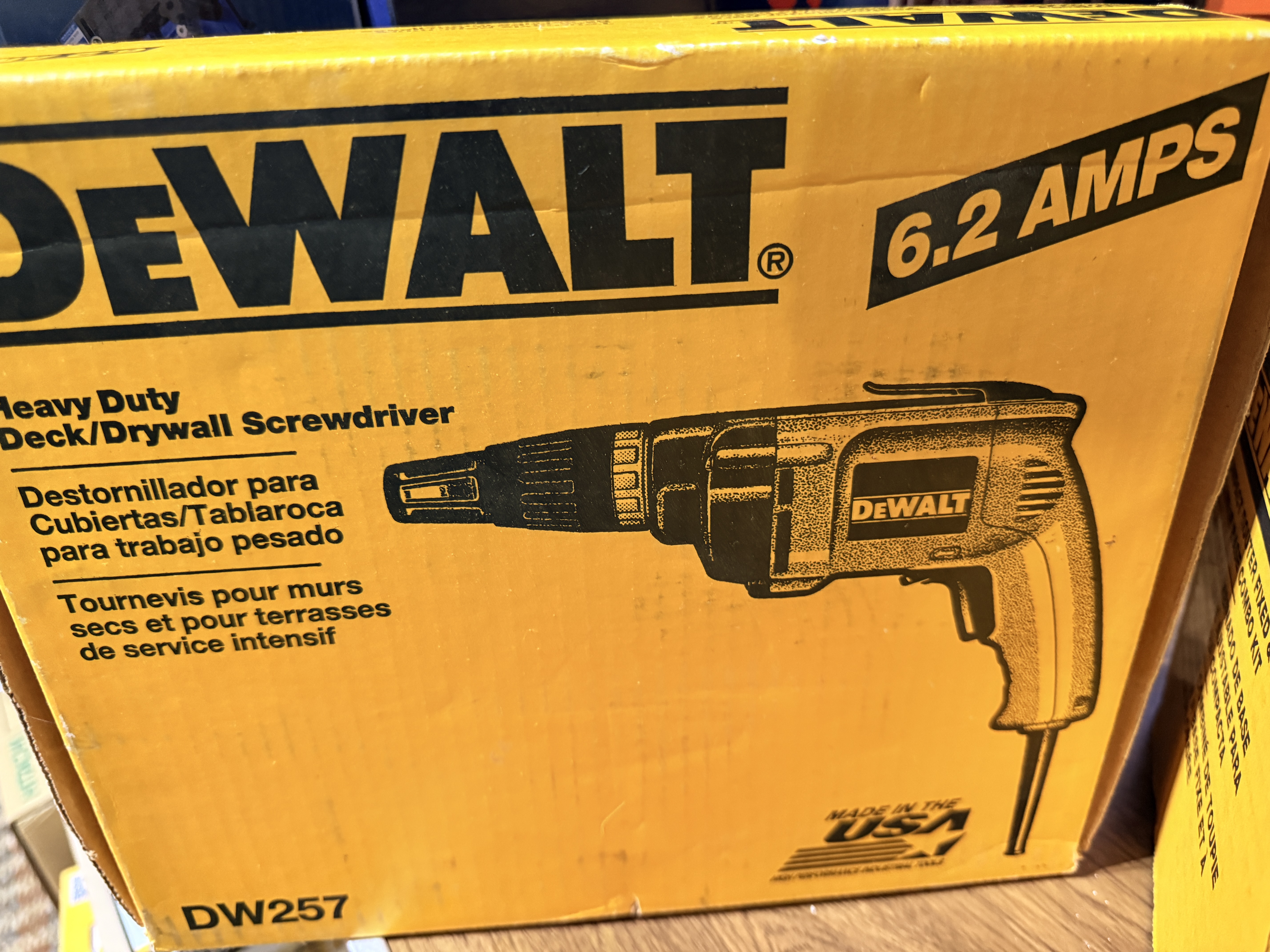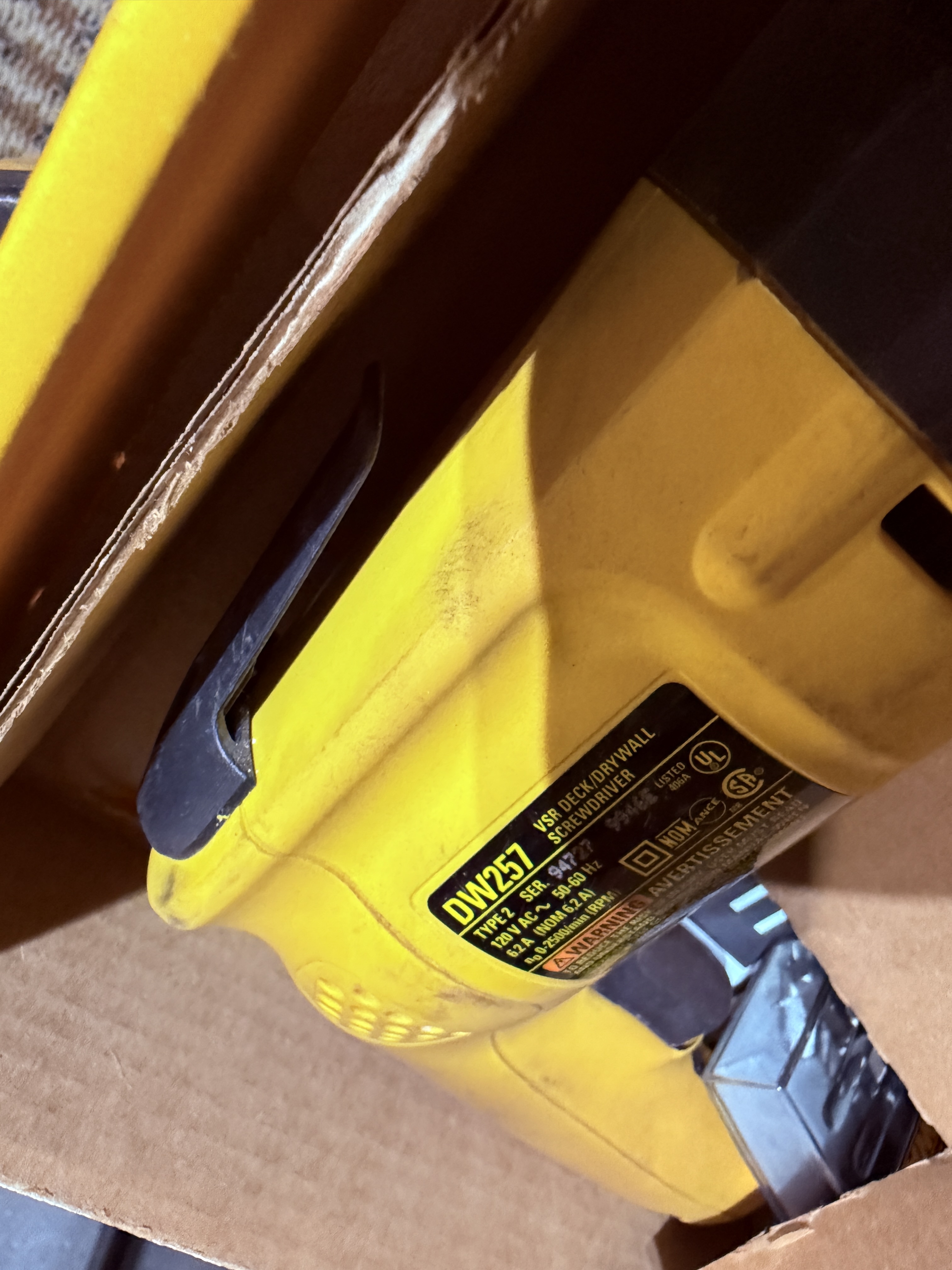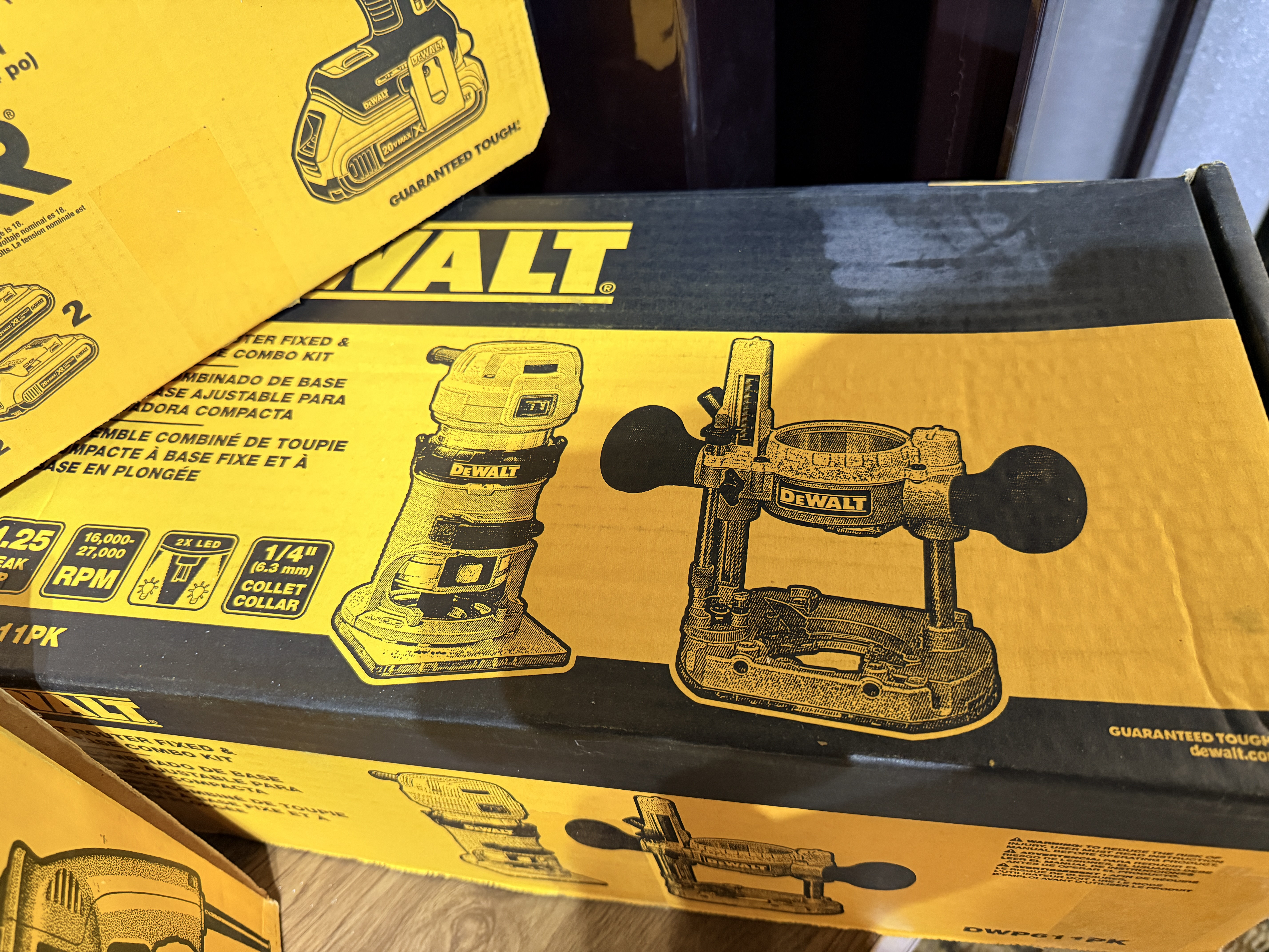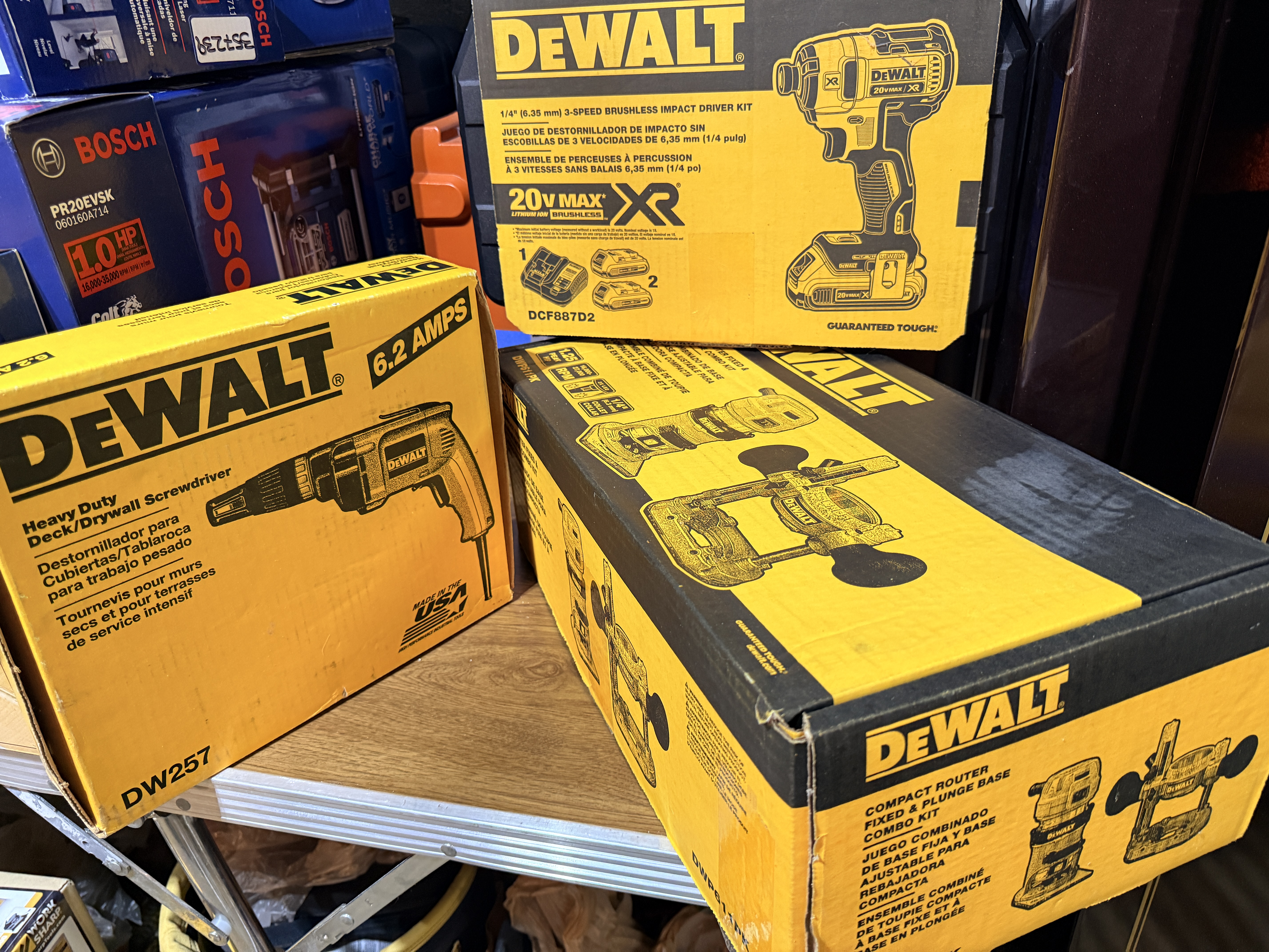 Mixed Condition. The DW257 screwdriver shows visible surface dust and minor scuffing, indicating it is a lightly used unit. The DCF887D2 impact driver kit packaging exhibits shelf wear. The DWP611PK router kit appears to be in open-box condition with unused internal components. *As with many items in this estate this appears new and unused in the original box. No smoking home, just a bit dusty.