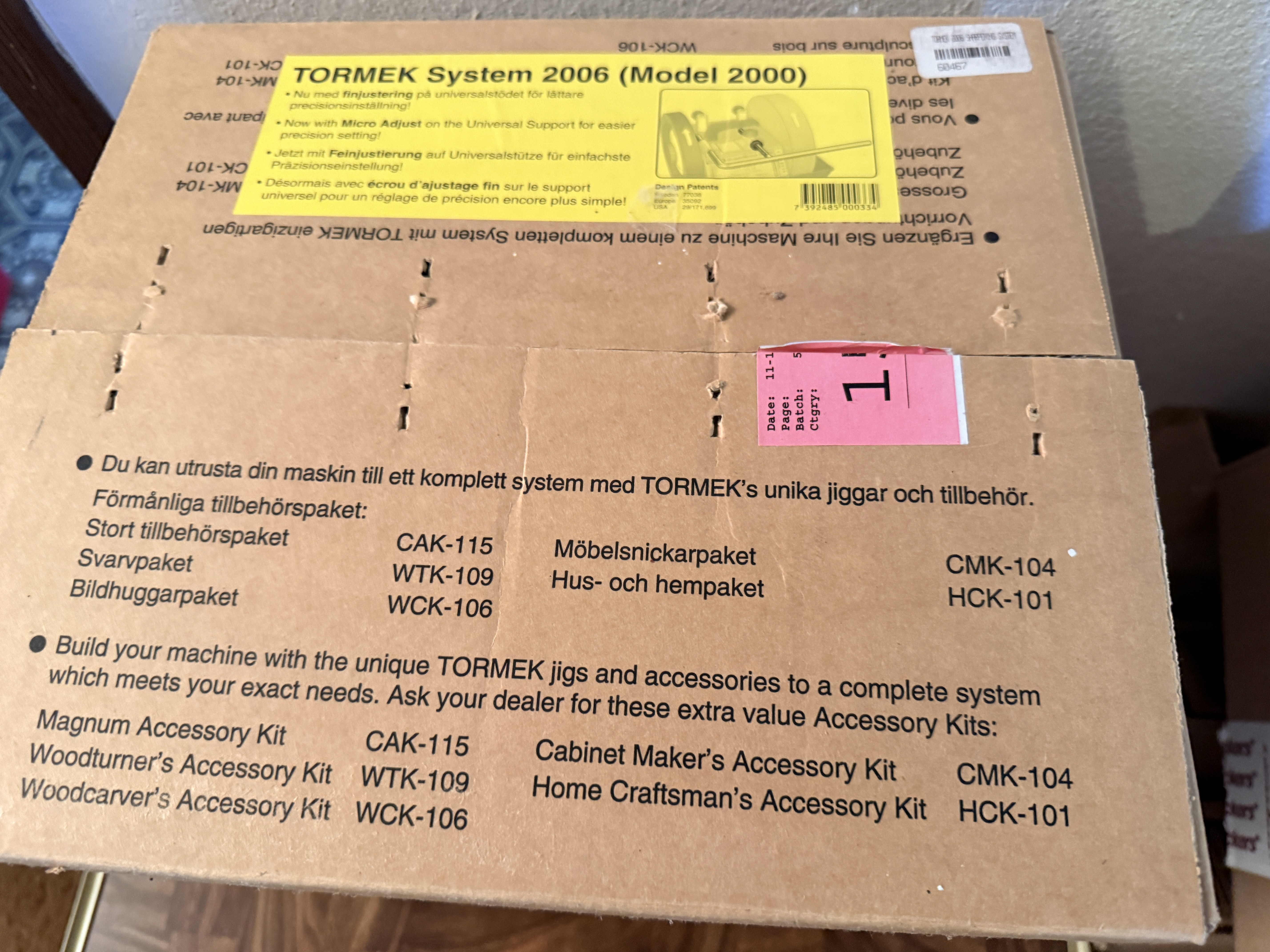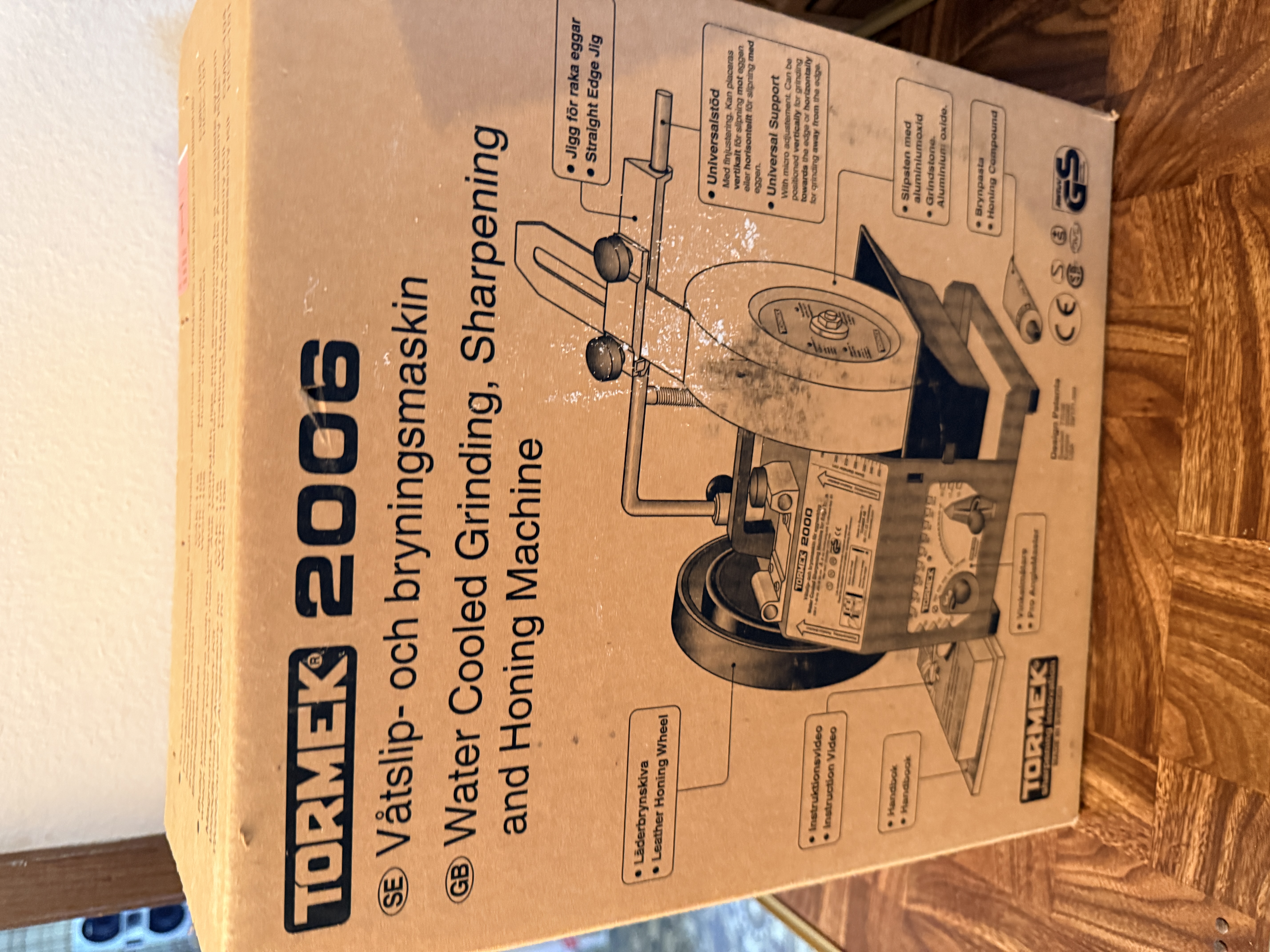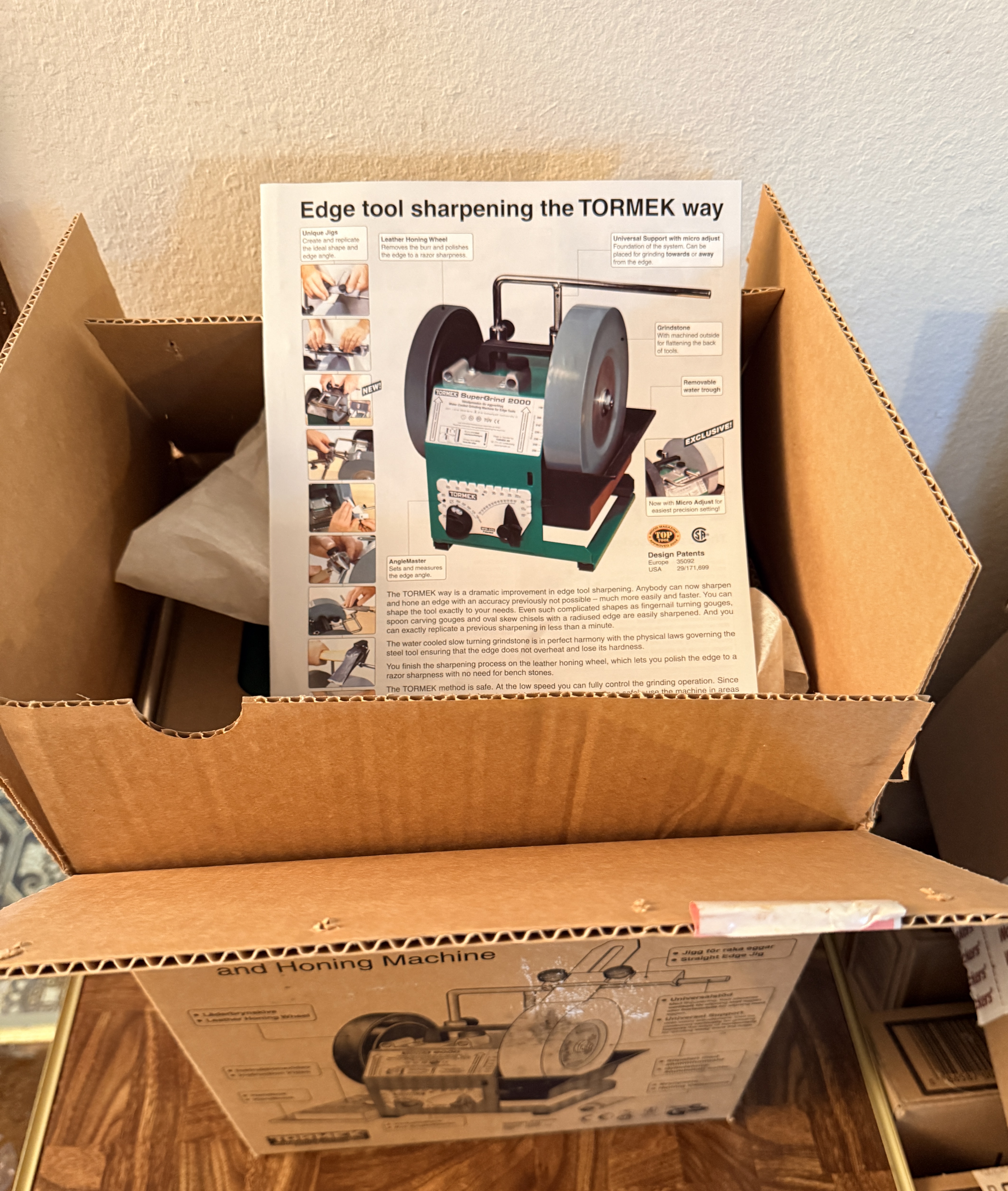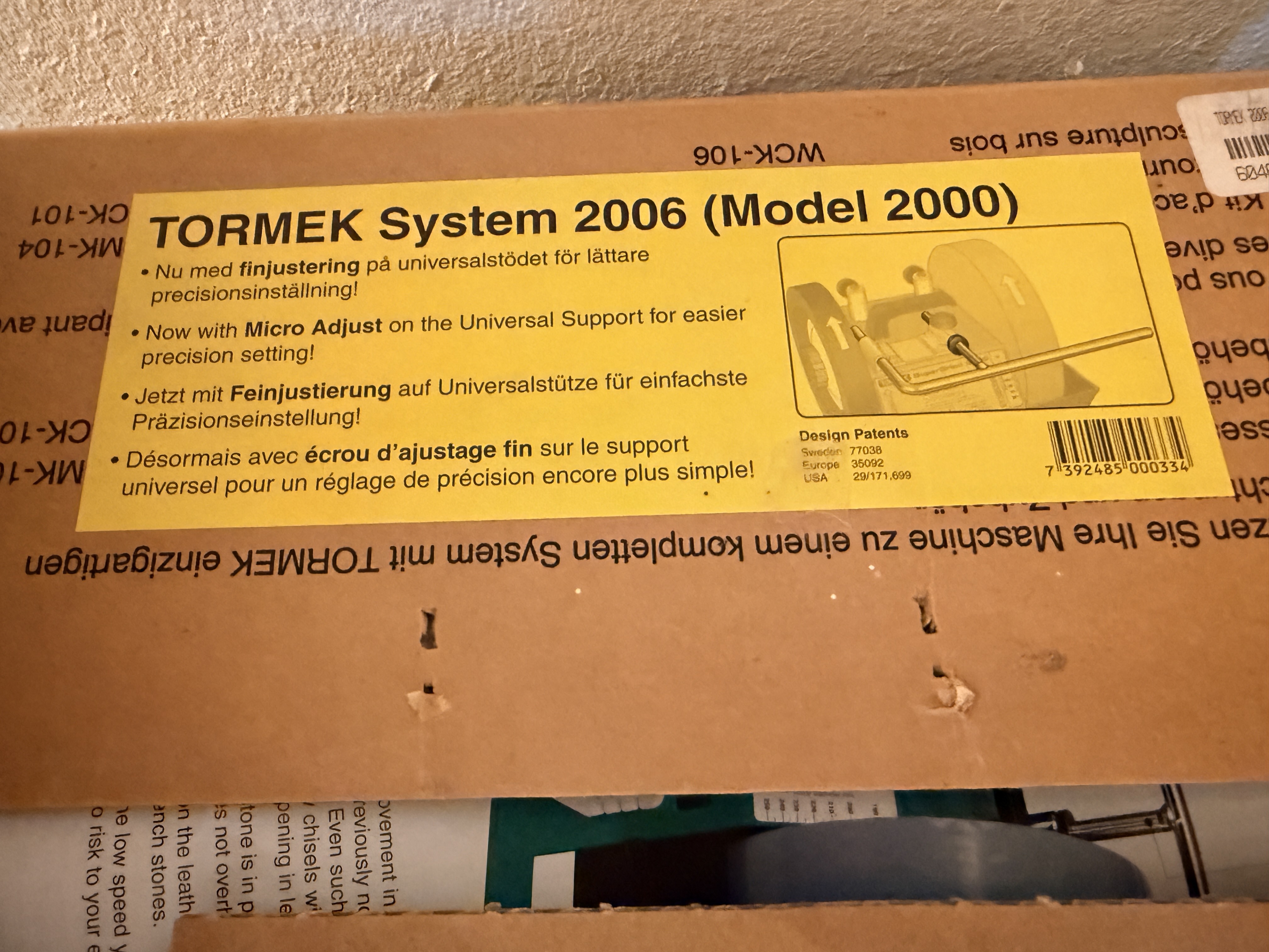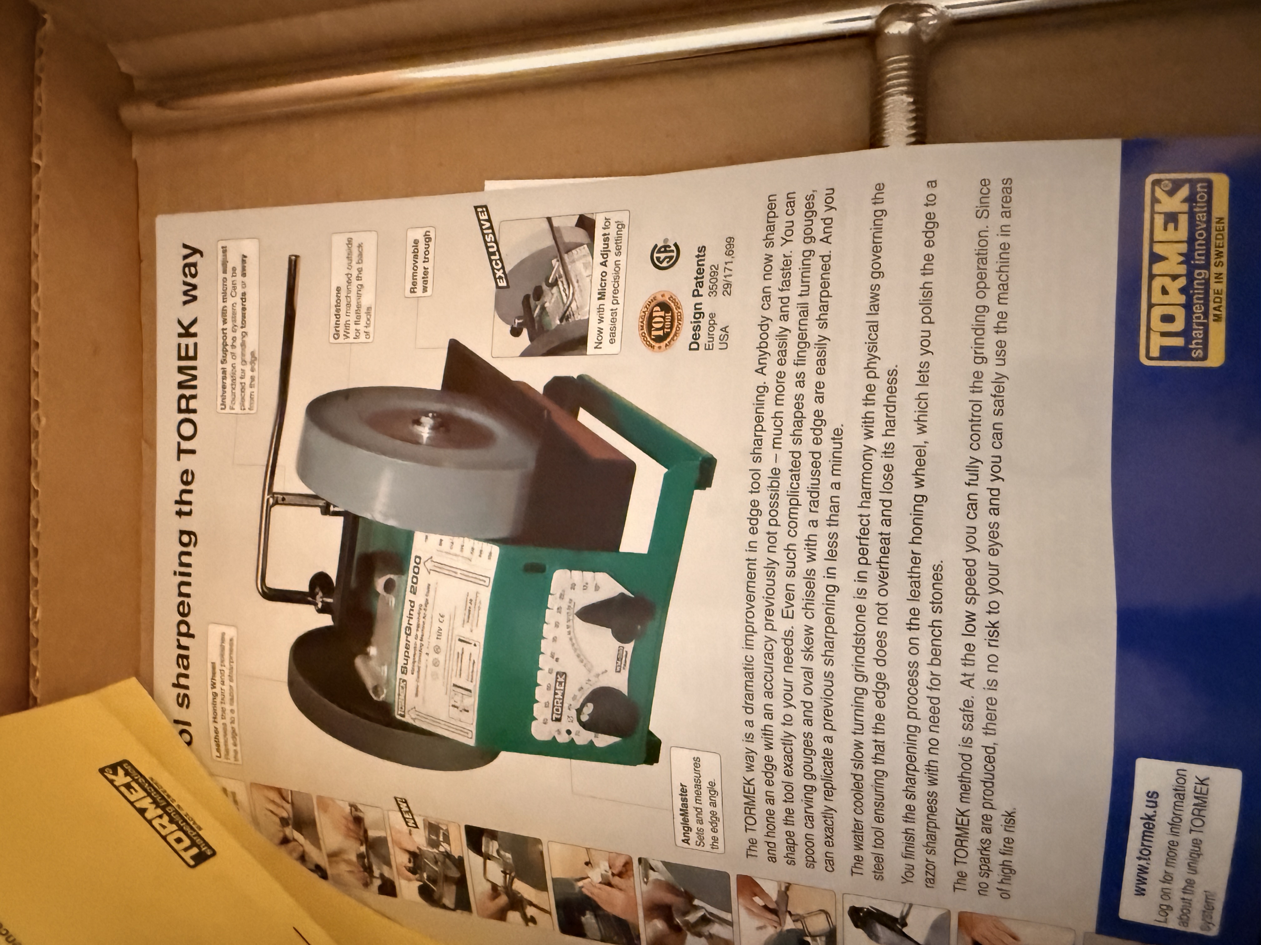 This Tormek System 2006 is a professional-grade water-cooled grinding, sharpening, and honing machine, based on the Model 2000 (SuperGrind 2000) platform. Manufactured in Sweden, the unit features a green-coated metal housing and is designed for precision edge tool maintenance. The system is equipped with a large-diameter aluminum oxide grindstone and a secondary leather honing wheel for final polishing. It includes a universal support bar with a micro-adjuster for precise angle settings. The item is presented in its original retail packaging and includes the instruction manual titled Edge tool sharpening the TORMEK way. Visible markings include the Tormek logo, Model 2000 designation, and Swedish and US design patents including USA 29/171,699.