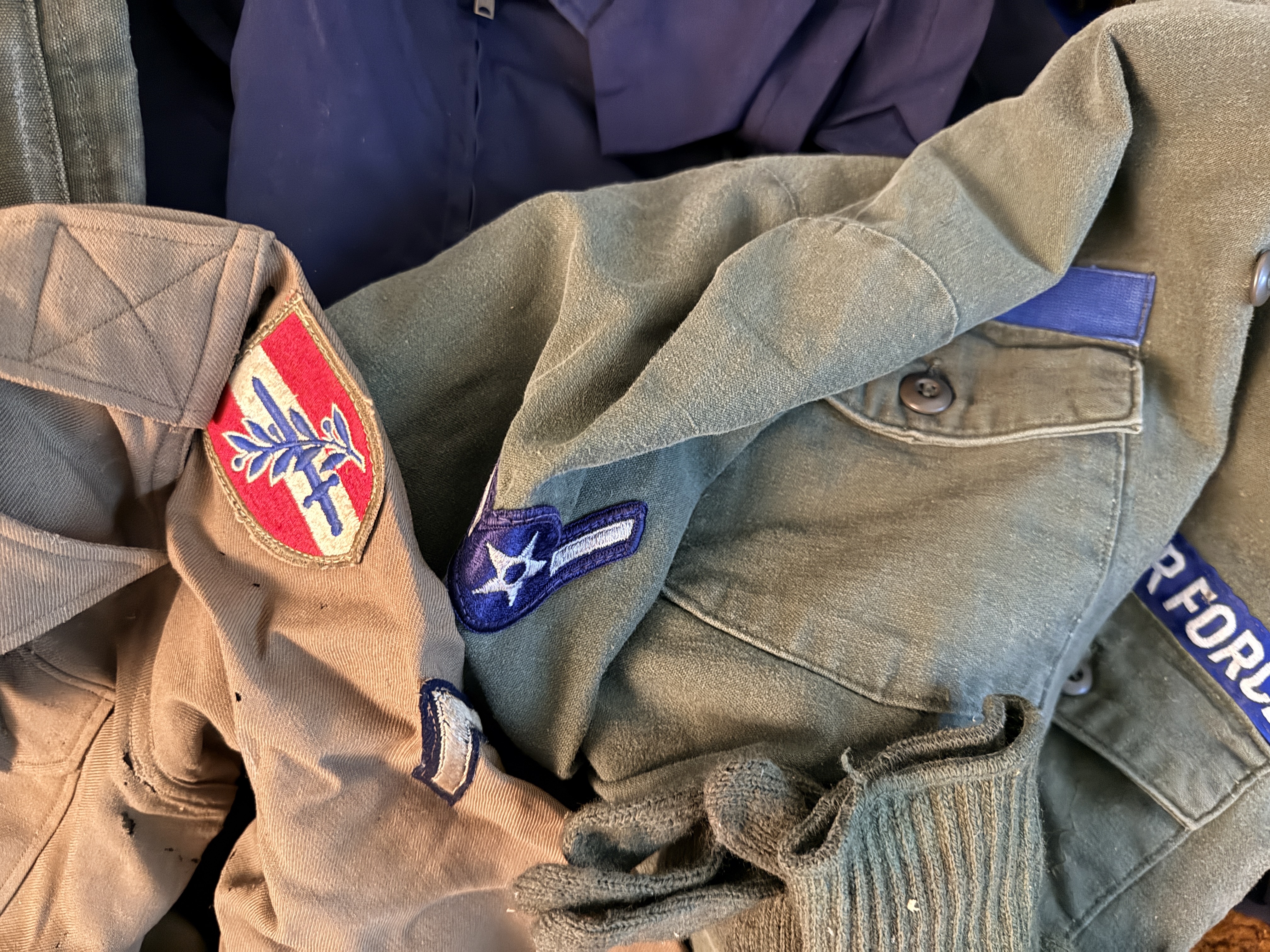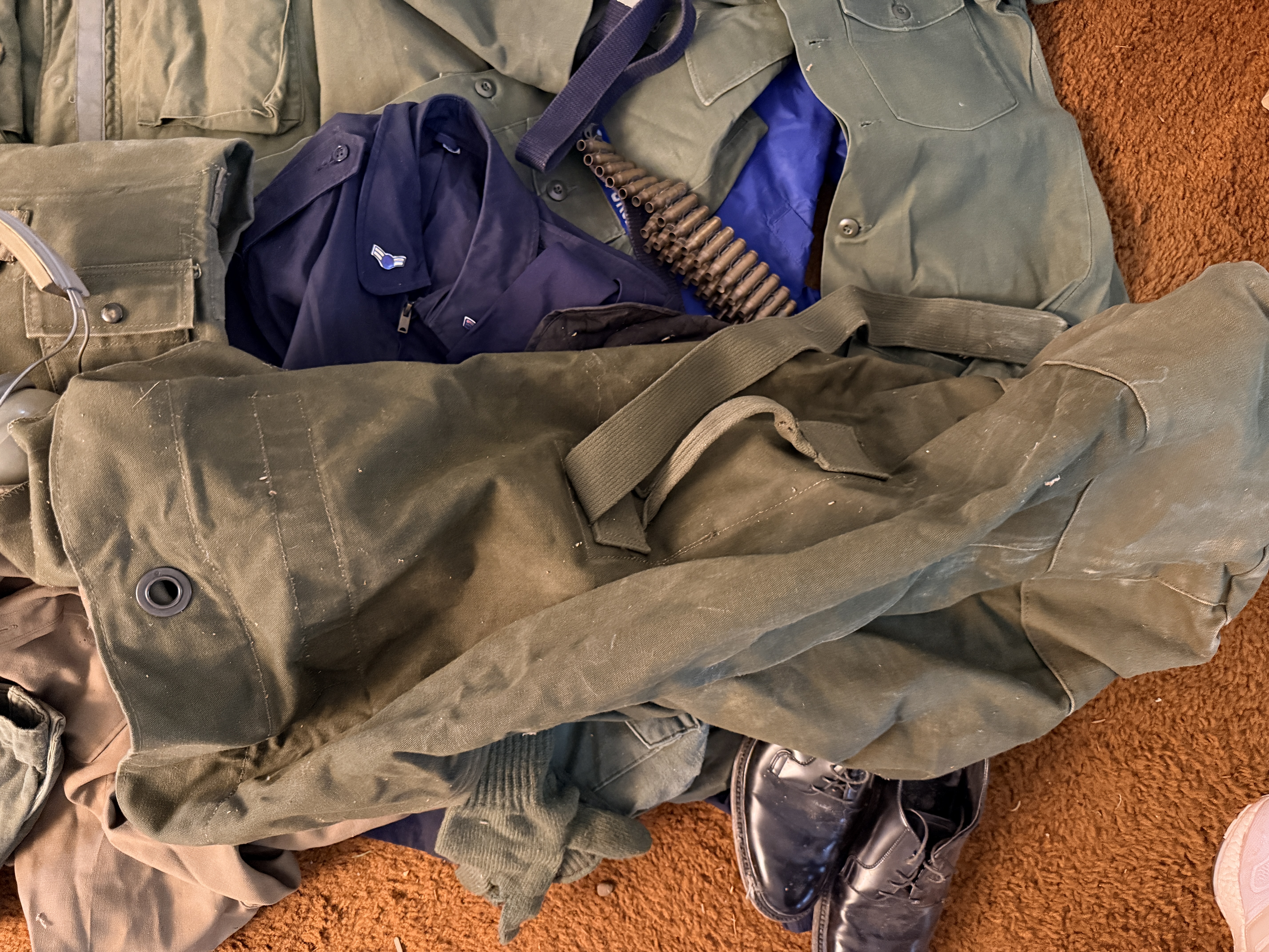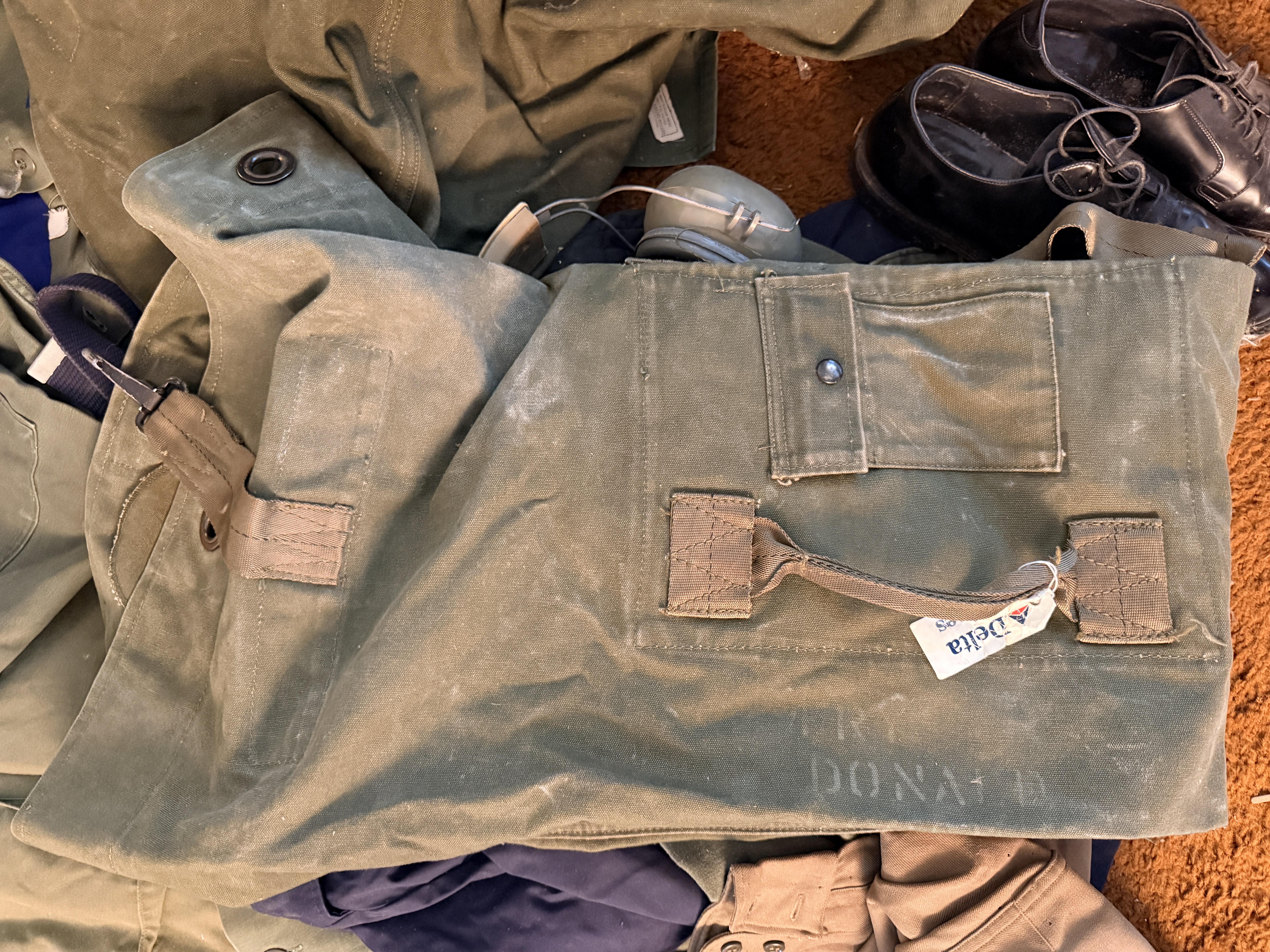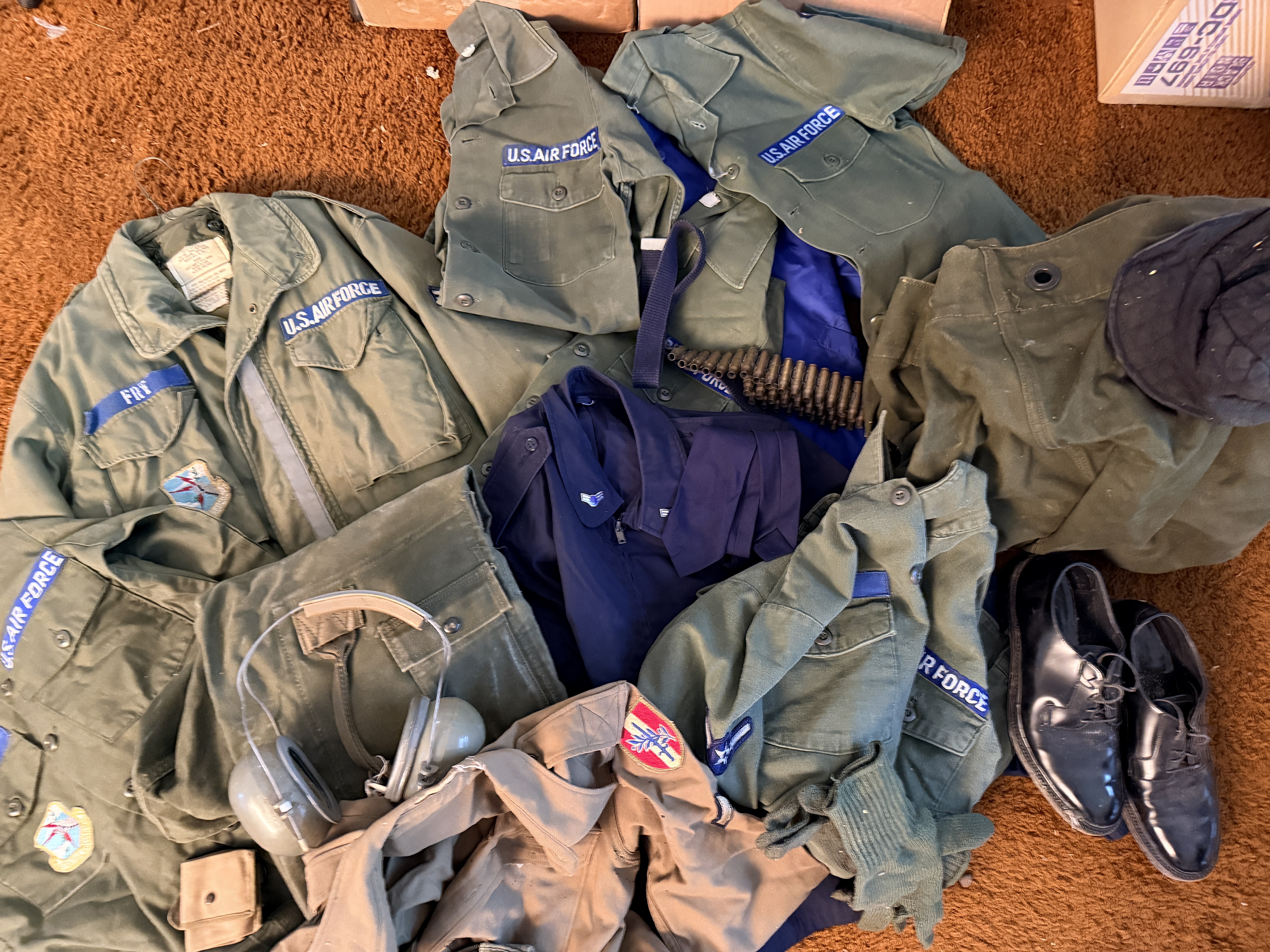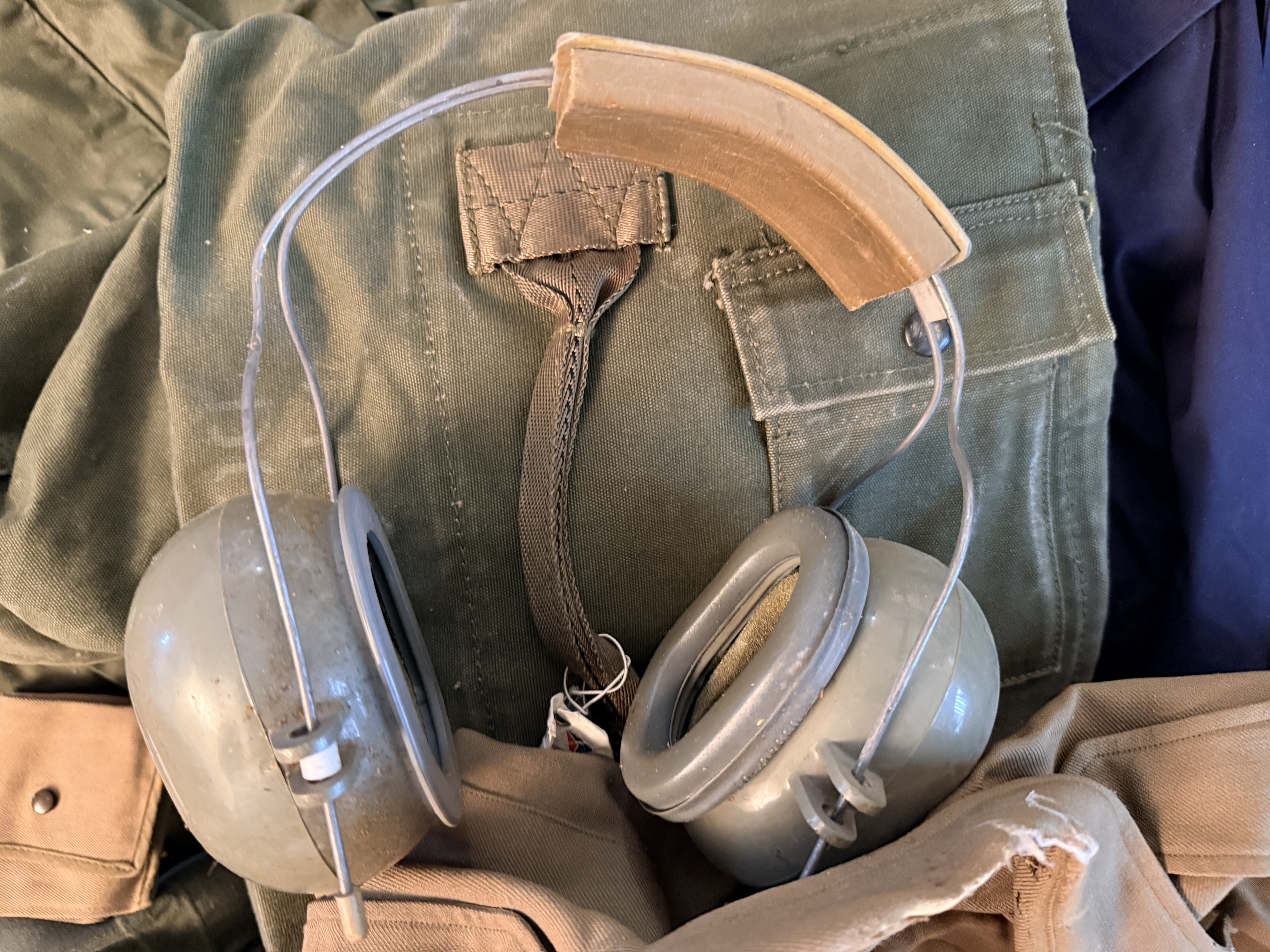 The items are in good vintage condition, exhibiting signs of authentic service wear. Textiles show typical fading, creasing from storage, and minor fraying at the edges of patches and collars. The leather footwear shows moderate scuffing and wear to the soles. The hearing protectors show age-related degradation to the foam and plastic components. All items appear structurally sound and representative of the period.