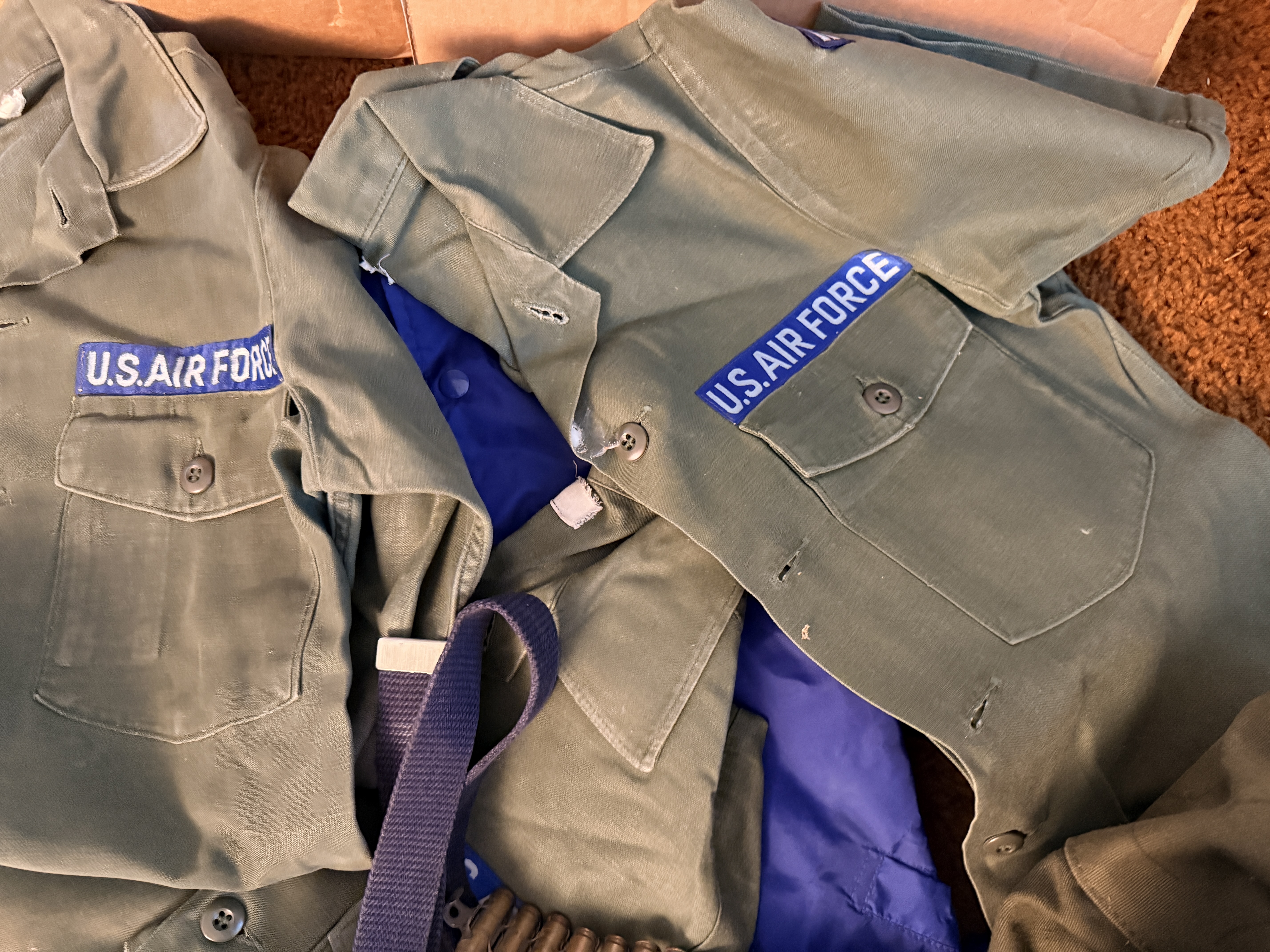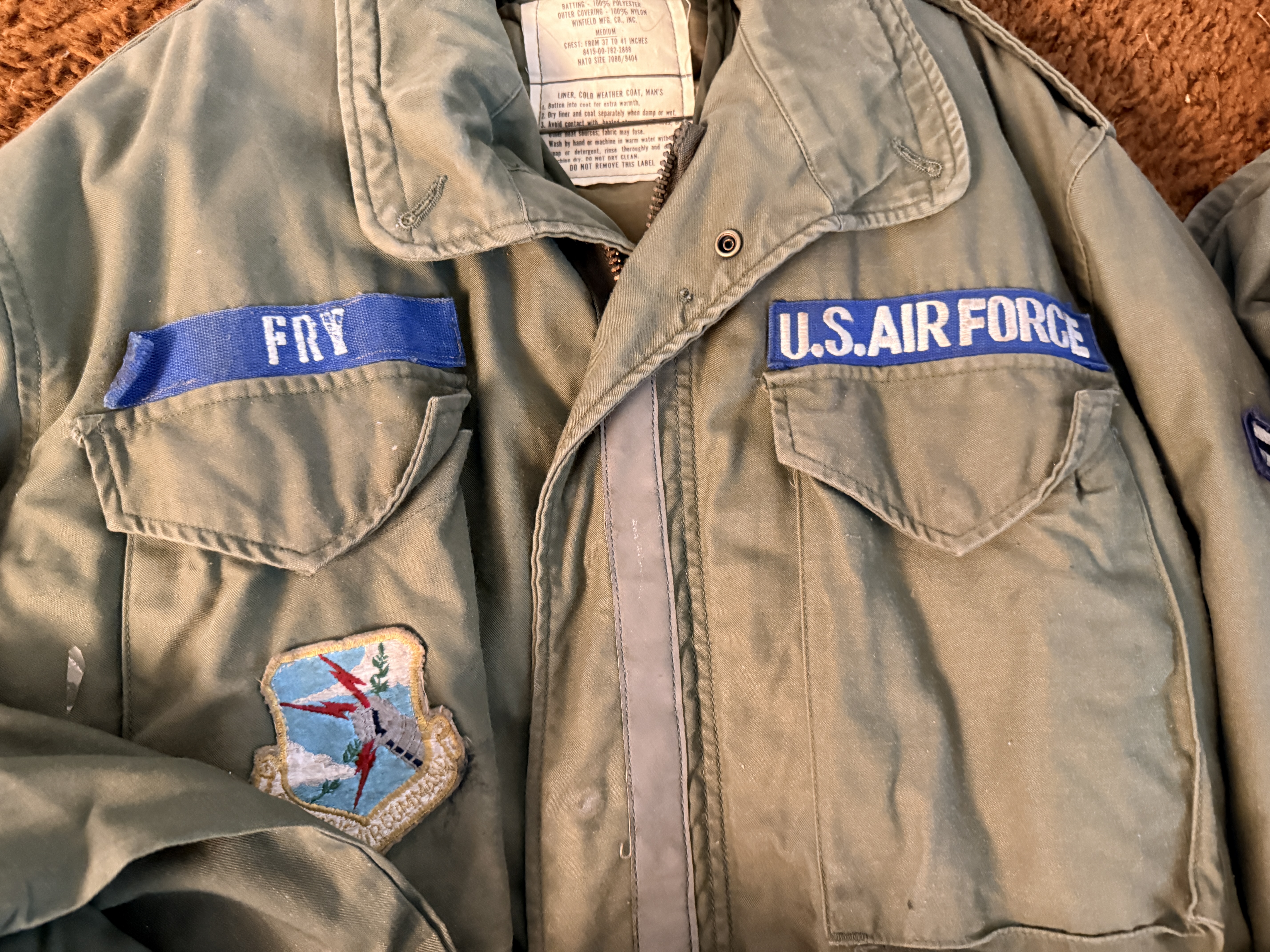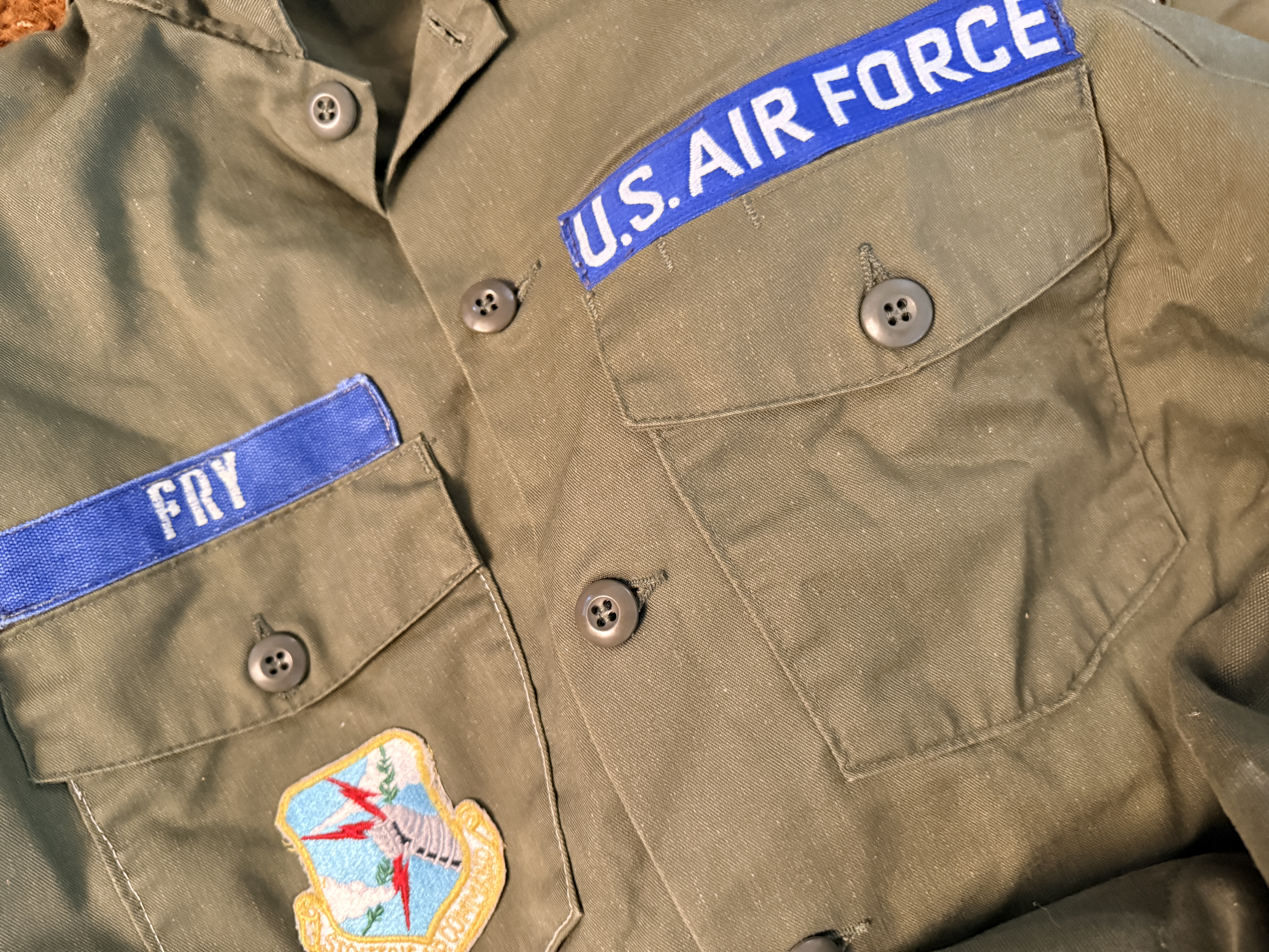 This collection of United States Air Force (USAF) apparel and field gear dates from the Vietnam War through the mid-1970s, primarily attributed to a service member named Fry. The grouping includes an OG-107 M-1965 field jacket featuring a button-in cold weather liner with a visible label from Winfield Mfg. Co., Inc., size Medium (8415-00-782-2889). The jacket is adorned with blue and white embroidered U.S. Air Force and Fry name tapes, alongside a Strategic Air Command (SAC) pocket patch. Multiple OG-107 cotton sateen utility shirts are included, featuring First Lieutenant rank insignia and additional SAC patches. The collection further contains a khaki short-sleeve shirt with a Supreme Headquarters Allied Powers Europe (SHAPE) patch, a dark blue utility shirt with enlisted rank insignia, and a pair of black leather dress oxfords. Supplemental equipment consists of an olive drab canvas duffel bag (2 of these) stenciled with the name Donald, a pair of flight line hearing protectors with a padded headband, a blue web belt with a silver-tone buckle, a small khaki canvas pouch, and a belt of inert brass shell casings joined by metal links.